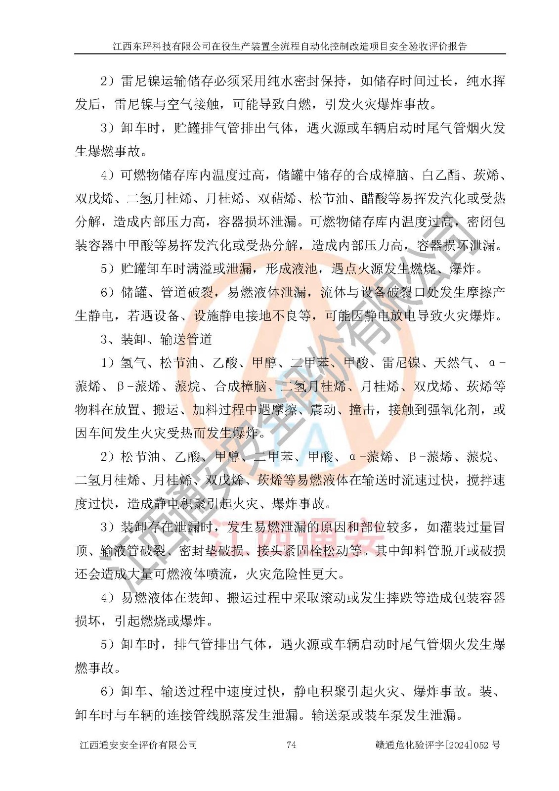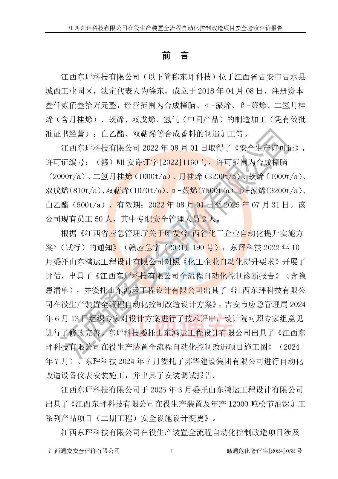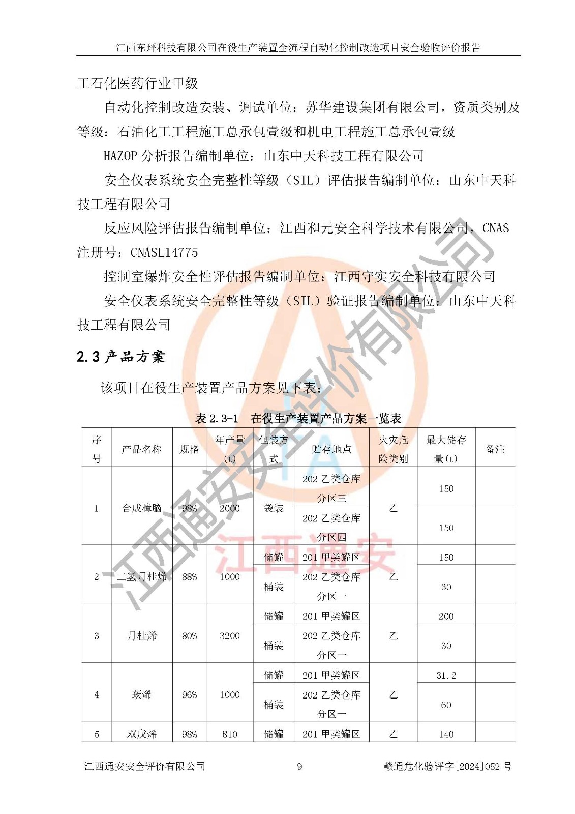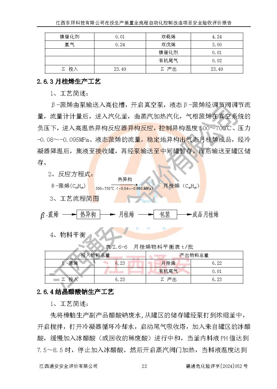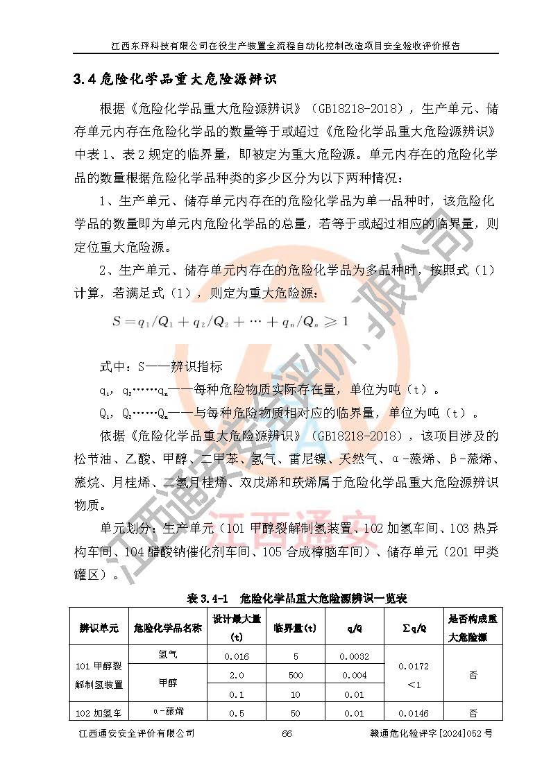 項目簡介 | 江西東玶科技有限公司(以下簡稱東玶科技)位于江西省吉安市吉水縣城西工業(yè)園區(qū),法定**人為徐東,成立于2018年04月08日,注冊資本叁仟貳佰叁拾萬元整,經(jīng)營范圍為合成樟腦、α-蒎烯、β-蒎烯、二氫月桂烯(含月桂烯)、莰烯、雙戊烯、氫氣(中間產(chǎn)品)的制造加工(憑**批準證書經(jīng)營);白乙酯、雙萜烯等合成香料的制造加工等。 江西東玶科技有限公司2022年08月01日取得了《安全生產(chǎn)許可證》,許可證編號:(贛)WH安許證字[2022]1160號,許可范圍為合成樟腦(2000t/a)、二氫月桂烯(1000t/a)、月桂烯(3200t/a)、莰烯(1000t/a)、雙戊烯(810t/a)、雙萜烯(1070t/a)、α-蒎烯(7500t/a)、β-蒎烯(3200t/a)、白乙酯(500t/a),**期:2022年08月01日至2025年07月31日。該公司現(xiàn)有員工50人,其中專職安全管理人員2人。 根據(jù)《江西省應急管理廳關于印發(fā)<江西省化工企業(yè)自動化提升實施方案>(試行)的通知》(贛應急字〔2021〕190號),東玶科技2022年10月委托山東鴻運工程設計有限公司對照《化工企業(yè)自動化提升要求》開展了評估,出具了《江西東玶科技有限公司全流程自動化控制診斷報告》(含隱患清單),并委托山東鴻運工程設計有限公司出具了《江西東玶科技有限公司在役生產(chǎn)裝置全流程自動化控制改造設計方案》,吉安市應急管理局2024年6月13日組織專家對設計方案進行了技術評審,設計院對照專家組意見進行了修改完善。東玶科技委托山東鴻運工程設計有限公司出具了《江西東玶科技有限公司在役生產(chǎn)裝置全流程自動化控制改造項目施工圖》(2024年7月)。東玶科技2024年7月委托了蘇華建設集團有限公司進行自動化改造設備儀表安裝施工,并出具了安裝調(diào)試報告。 江西東玶科技有限公司于2025年3月委托山東鴻運工程設計有限公司出具了《江西東玶科技有限公司在役生產(chǎn)裝置及年產(chǎn)12000噸松節(jié)油深加工系列產(chǎn)品項目(二期工程)安全設施設計變更》。 江西東玶科技有限公司在役生產(chǎn)裝置全流程自動化控制改造項目涉及的松節(jié)油、乙酸、液堿、甲醇、二甲苯、甲酸、氫氣、雷尼鎳、天然氣,中間產(chǎn)品α-蒎烯、β-蒎烯和產(chǎn)品中雙戊烯、莰烯屬于危險化學品。經(jīng)辨識,甲醇、氫氣和天然氣(燃料)屬于重點監(jiān)管的危險化學品,甲醇屬于特別管控危險化學品,不涉及監(jiān)控化學品、易制毒化學品、易制爆危險化學品、劇毒化學品和高毒物品,生產(chǎn)、儲存單元不構成危險化學品重大危險源,不涉及重點監(jiān)管的危險化工工藝。 | ||||||