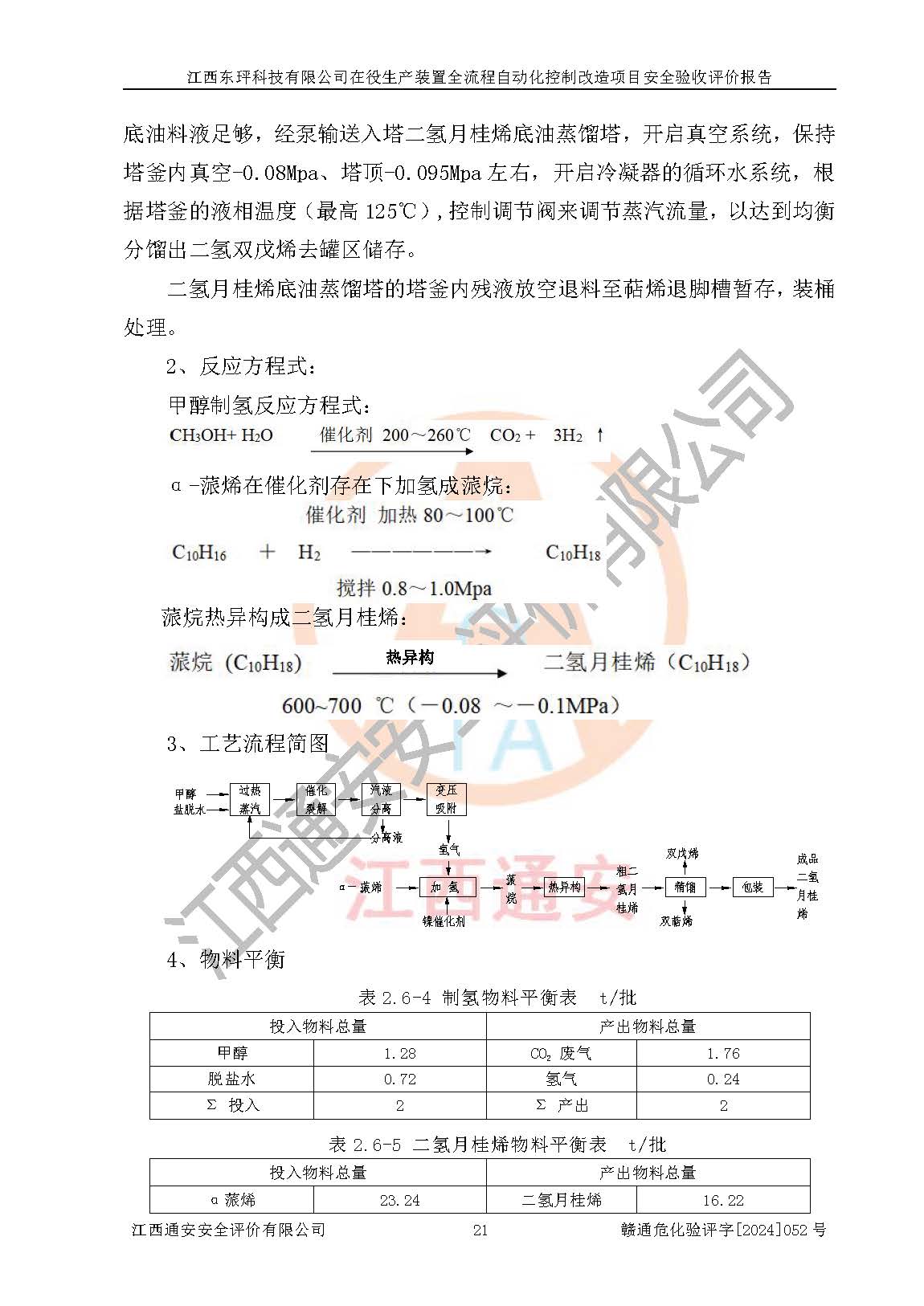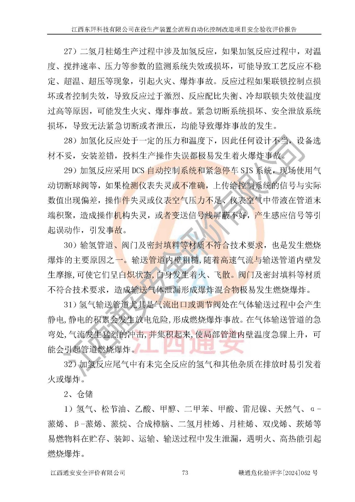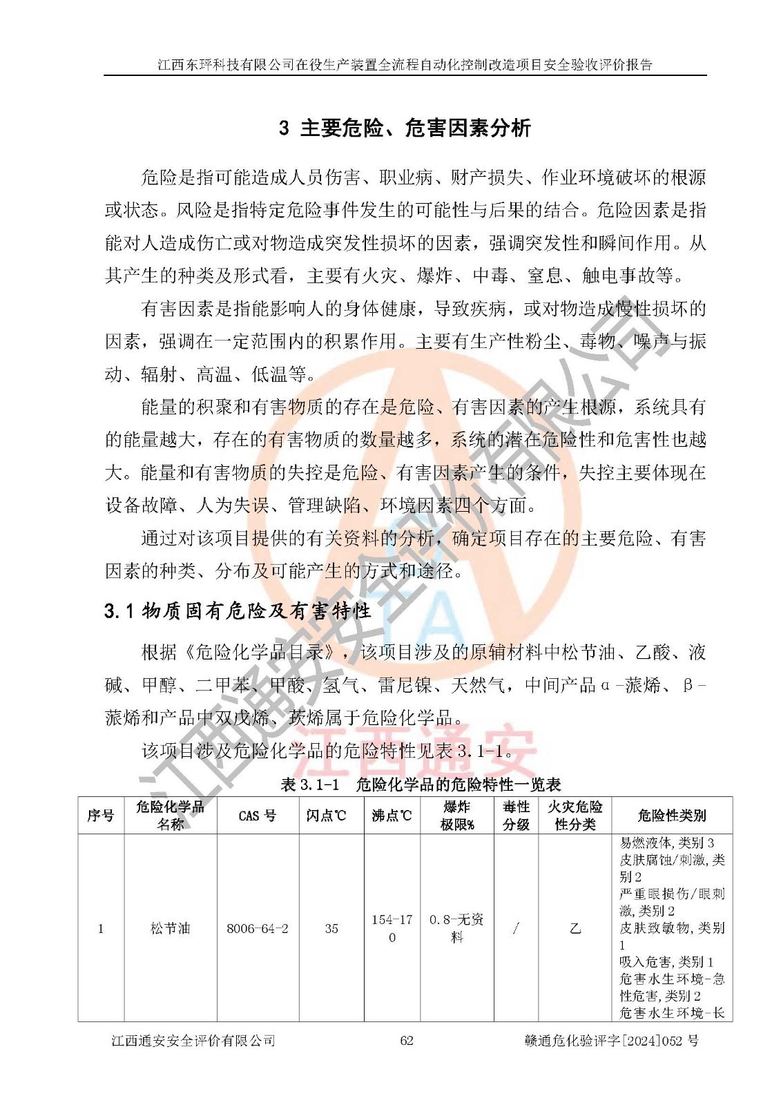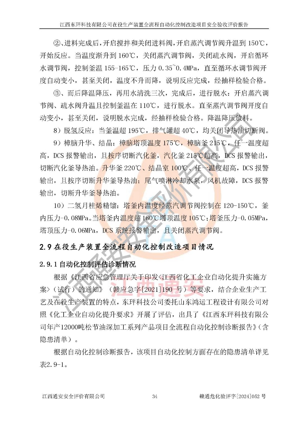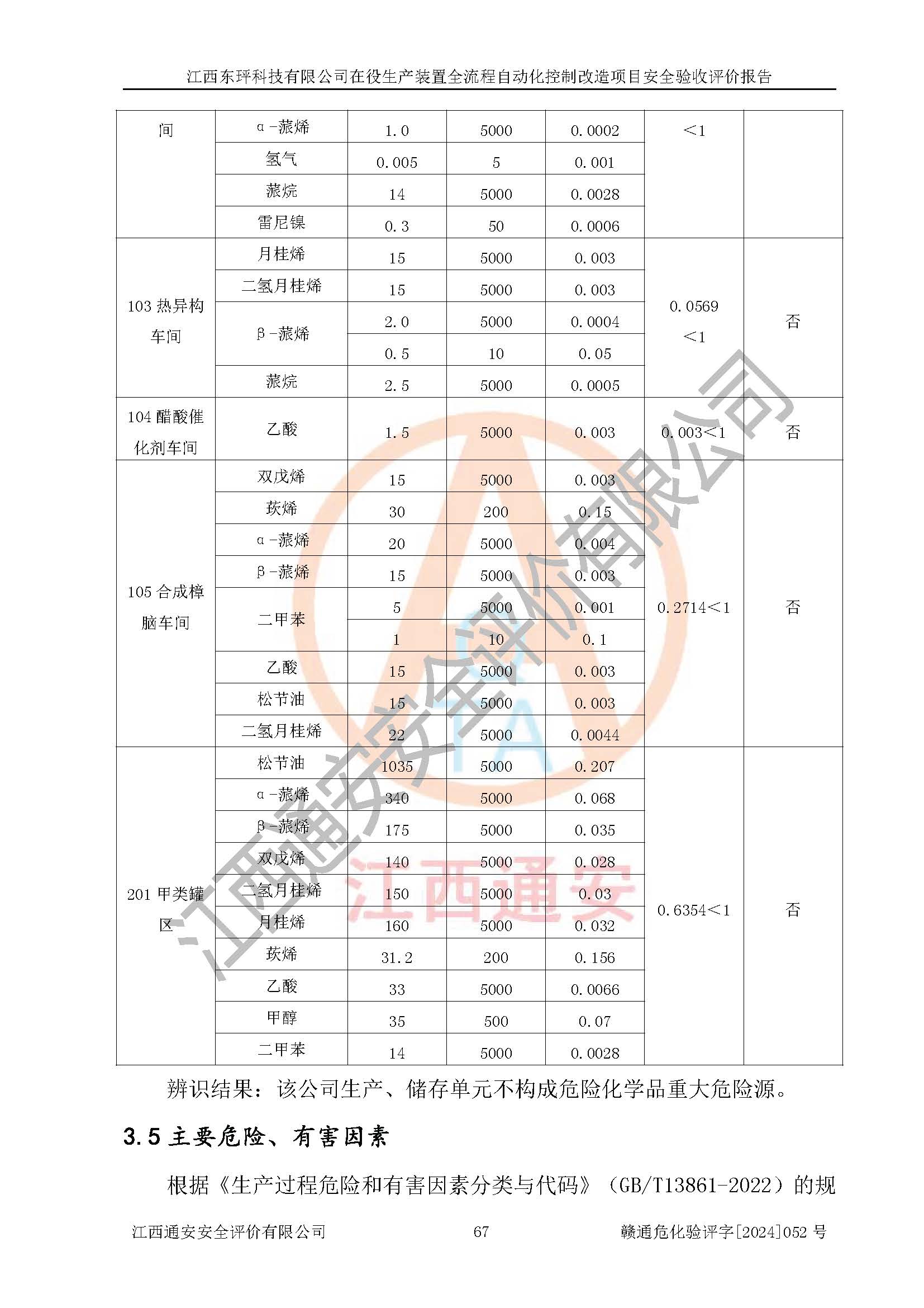 項目簡介 | 江西東玶科技有限公司(以下簡稱東玶科技)位于江西省吉安市吉水縣城西工業(yè)園區(qū),法定**人為徐東,成立于2018年04月08日,注冊資本叁仟貳佰叁拾萬元整,經(jīng)營范圍為合成樟腦、α-蒎烯、β-蒎烯、二氫月桂烯(含月桂烯)、莰烯、雙戊烯、氫氣(中間產(chǎn)品)的制造加工(憑**批準證書經(jīng)營);白乙酯、雙萜烯等合成香料的制造加工等。 江西東玶科技有限公司2022年08月01日取得了《安全生產(chǎn)許可證》,許可證編號:(贛)WH安許證字[2022]1160號,許可范圍為合成樟腦(2000t/a)、二氫月桂烯(1000t/a)、月桂烯(3200t/a)、莰烯(1000t/a)、雙戊烯(810t/a)、雙萜烯(1070t/a)、α-蒎烯(7500t/a)、β-蒎烯(3200t/a)、白乙酯(500t/a),**期:2022年08月01日至2025年07月31日。該公司現(xiàn)有員工50人,其中專職安全管理人員2人。 根據(jù)《江西省應急管理廳關于印發(fā)<江西省化工企業(yè)自動化提升實施方案>(試行)的通知》(贛應急字〔2021〕190號),東玶科技2022年10月委托山東鴻運工程設計有限公司對照《化工企業(yè)自動化提升要求》開展了評估,出具了《江西東玶科技有限公司全流程自動化控制診斷報告》(含隱患清單),并委托山東鴻運工程設計有限公司出具了《江西東玶科技有限公司在役生產(chǎn)裝置全流程自動化控制改造設計方案》,吉安市應急管理局2024年6月13日組織專家對設計方案進行了技術評審,設計院對照專家組意見進行了修改完善。東玶科技委托山東鴻運工程設計有限公司出具了《江西東玶科技有限公司在役生產(chǎn)裝置全流程自動化控制改造項目施工圖》(2024年7月)。東玶科技2024年7月委托了蘇華建設集團有限公司進行自動化改造設備儀表安裝施工,并出具了安裝調(diào)試報告。 江西東玶科技有限公司于2025年3月委托山東鴻運工程設計有限公司出具了《江西東玶科技有限公司在役生產(chǎn)裝置及年產(chǎn)12000噸松節(jié)油深加工系列產(chǎn)品項目(二期工程)安全設施設計變更》。 江西東玶科技有限公司在役生產(chǎn)裝置全流程自動化控制改造項目涉及的松節(jié)油、乙酸、液堿、甲醇、二甲苯、甲酸、氫氣、雷尼鎳、天然氣,中間產(chǎn)品α-蒎烯、β-蒎烯和產(chǎn)品中雙戊烯、莰烯屬于危險化學品。經(jīng)辨識,甲醇、氫氣和天然氣(燃料)屬于重點監(jiān)管的危險化學品,甲醇屬于特別管控危險化學品,不涉及監(jiān)控化學品、易制毒化學品、易制爆危險化學品、劇毒化學品和高毒物品,生產(chǎn)、儲存單元不構成危險化學品重大危險源,不涉及重點監(jiān)管的危險化工工藝。 | ||||||