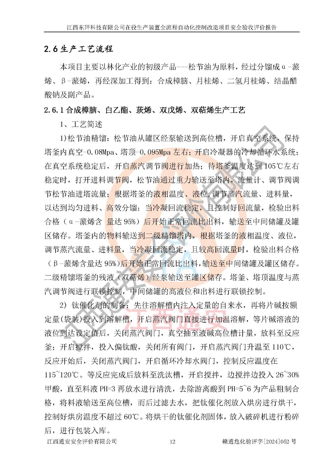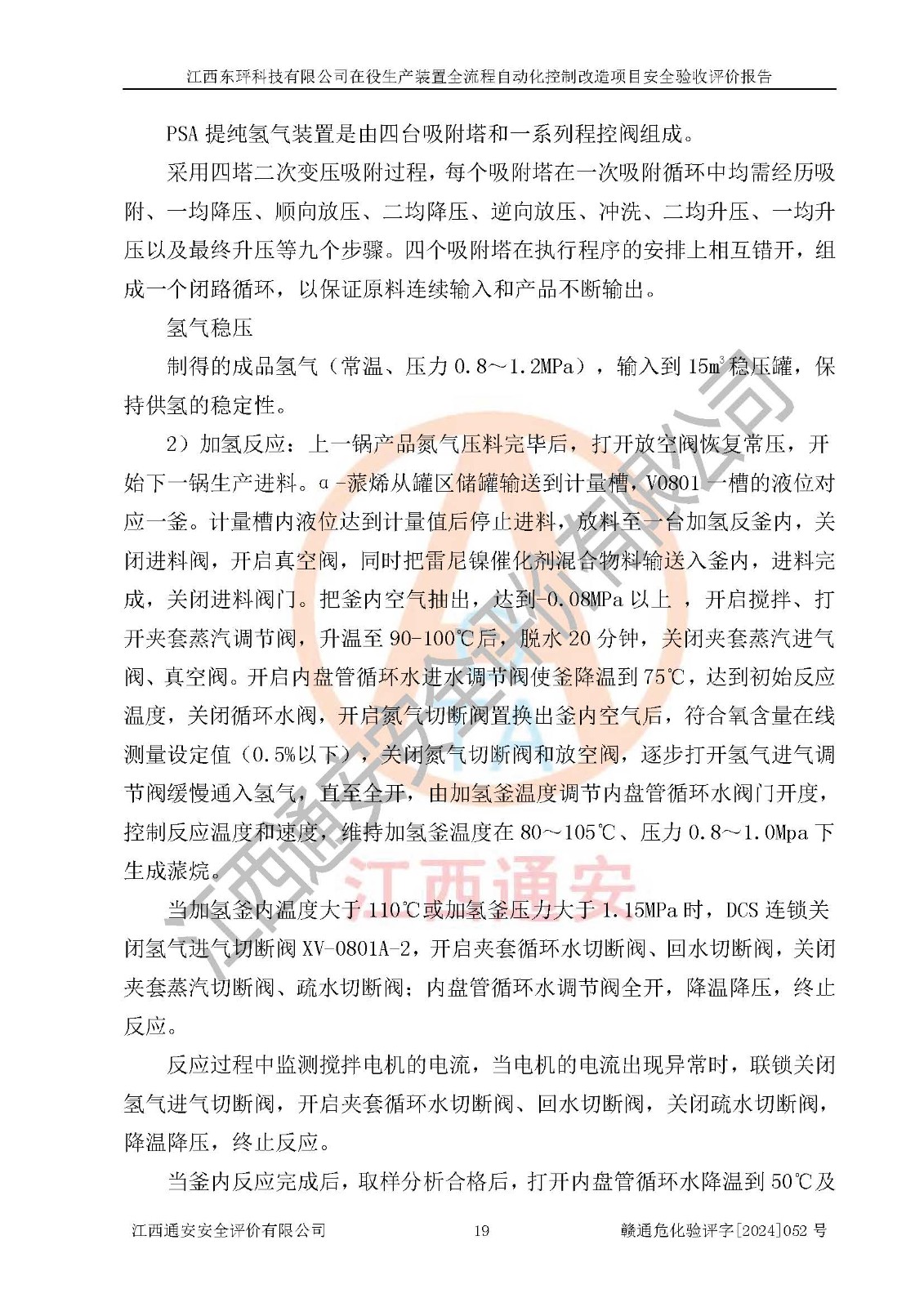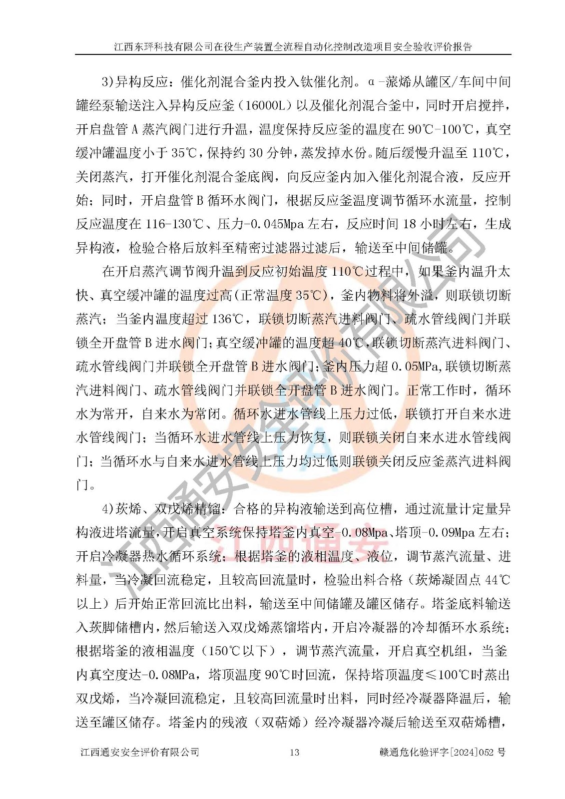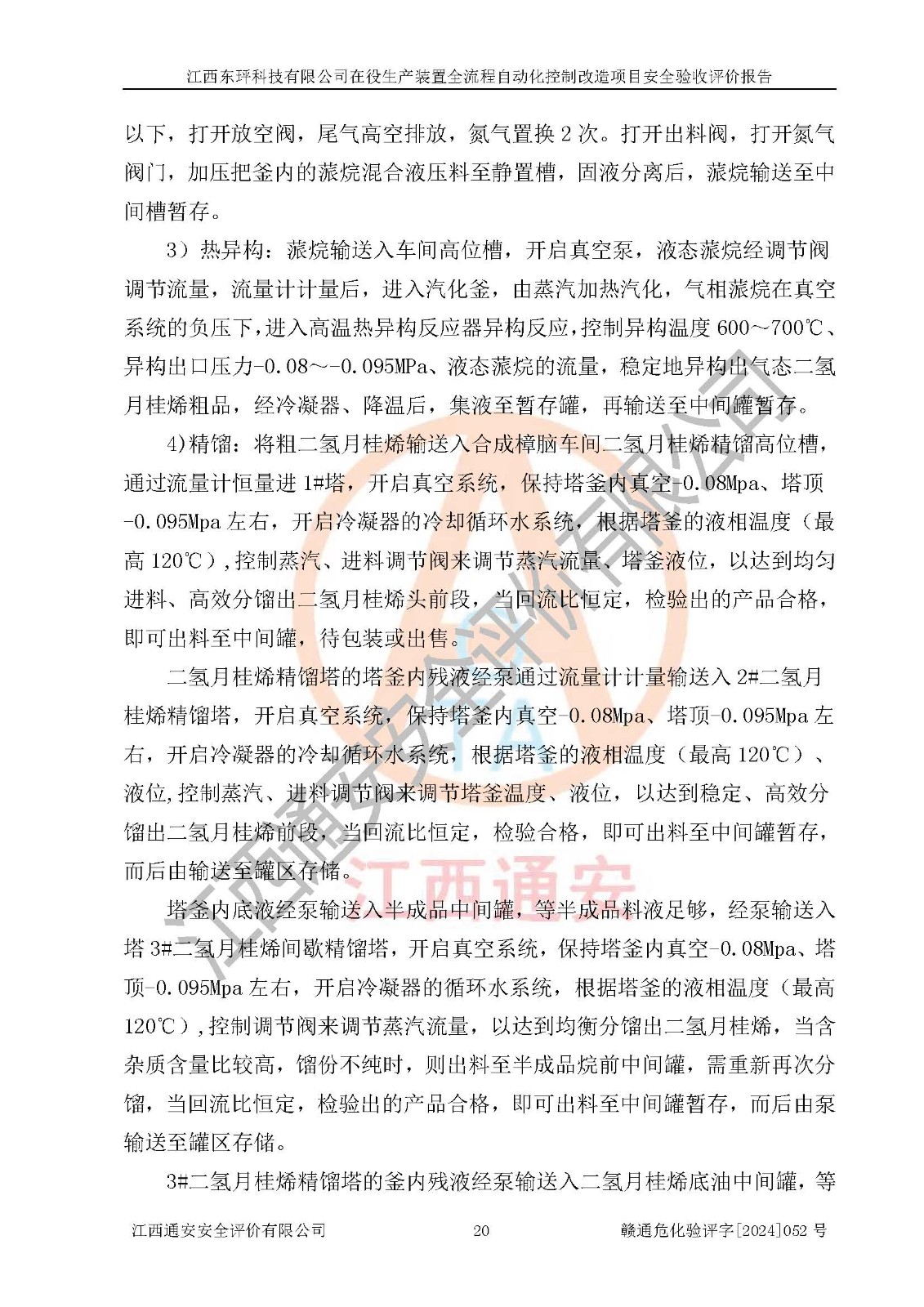 項目簡介 | 江西東玶科技有限公司(以下簡稱東玶科技)位于江西省吉安市吉水縣城西工業(yè)園區(qū),法定**人為徐東,成立于2018年04月08日,注冊資本叁仟貳佰叁拾萬元整,經(jīng)營范圍為合成樟腦、α-蒎烯、β-蒎烯、二氫月桂烯(含月桂烯)、莰烯、雙戊烯、氫氣(中間產(chǎn)品)的制造加工(憑**批準證書經(jīng)營);白乙酯、雙萜烯等合成香料的制造加工等。 江西東玶科技有限公司2022年08月01日取得了《安全生產(chǎn)許可證》,許可證編號:(贛)WH安許證字[2022]1160號,許可范圍為合成樟腦(2000t/a)、二氫月桂烯(1000t/a)、月桂烯(3200t/a)、莰烯(1000t/a)、雙戊烯(810t/a)、雙萜烯(1070t/a)、α-蒎烯(7500t/a)、β-蒎烯(3200t/a)、白乙酯(500t/a),**期:2022年08月01日至2025年07月31日。該公司現(xiàn)有員工50人,其中專職安全管理人員2人。 根據(jù)《江西省應急管理廳關于印發(fā)<江西省化工企業(yè)自動化提升實施方案>(試行)的通知》(贛應急字〔2021〕190號),東玶科技2022年10月委托山東鴻運工程設計有限公司對照《化工企業(yè)自動化提升要求》開展了評估,出具了《江西東玶科技有限公司全流程自動化控制診斷報告》(含隱患清單),并委托山東鴻運工程設計有限公司出具了《江西東玶科技有限公司在役生產(chǎn)裝置全流程自動化控制改造設計方案》,吉安市應急管理局2024年6月13日組織專家對設計方案進行了技術評審,設計院對照專家組意見進行了修改完善。東玶科技委托山東鴻運工程設計有限公司出具了《江西東玶科技有限公司在役生產(chǎn)裝置全流程自動化控制改造項目施工圖》(2024年7月)。東玶科技2024年7月委托了蘇華建設集團有限公司進行自動化改造設備儀表安裝施工,并出具了安裝調(diào)試報告。 江西東玶科技有限公司于2025年3月委托山東鴻運工程設計有限公司出具了《江西東玶科技有限公司在役生產(chǎn)裝置及年產(chǎn)12000噸松節(jié)油深加工系列產(chǎn)品項目(二期工程)安全設施設計變更》。 江西東玶科技有限公司在役生產(chǎn)裝置全流程自動化控制改造項目涉及的松節(jié)油、乙酸、液堿、甲醇、二甲苯、甲酸、氫氣、雷尼鎳、天然氣,中間產(chǎn)品α-蒎烯、β-蒎烯和產(chǎn)品中雙戊烯、莰烯屬于危險化學品。經(jīng)辨識,甲醇、氫氣和天然氣(燃料)屬于重點監(jiān)管的危險化學品,甲醇屬于特別管控危險化學品,不涉及監(jiān)控化學品、易制毒化學品、易制爆危險化學品、劇毒化學品和高毒物品,生產(chǎn)、儲存單元不構成危險化學品重大危險源,不涉及重點監(jiān)管的危險化工工藝。 | ||||||