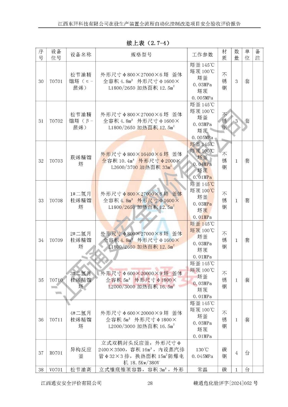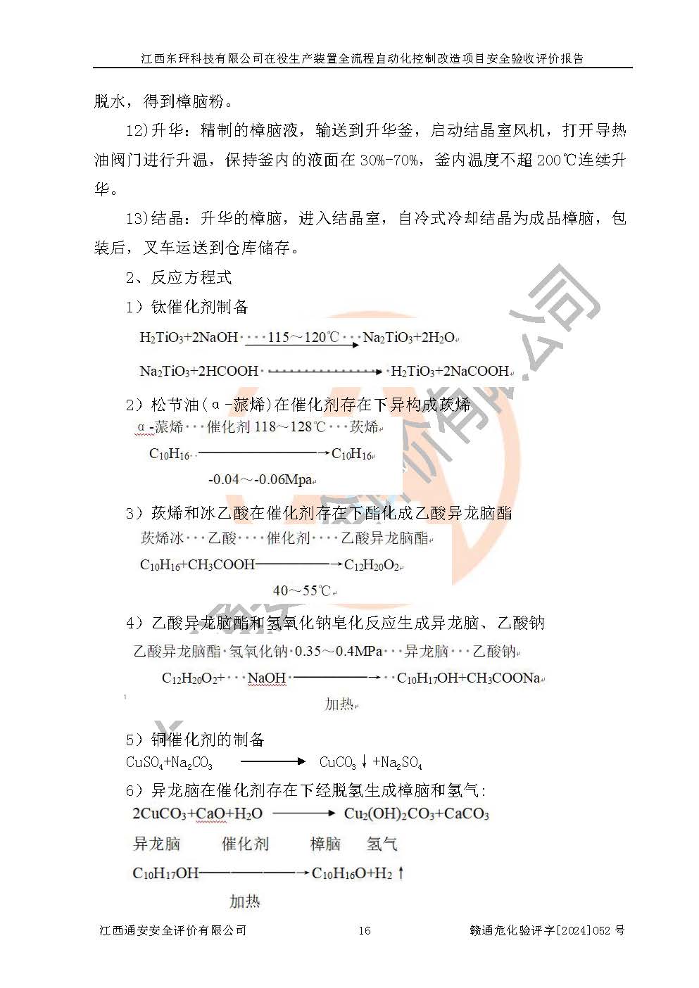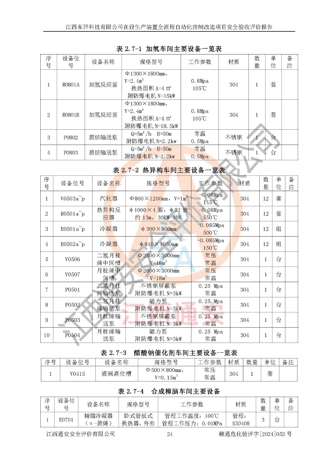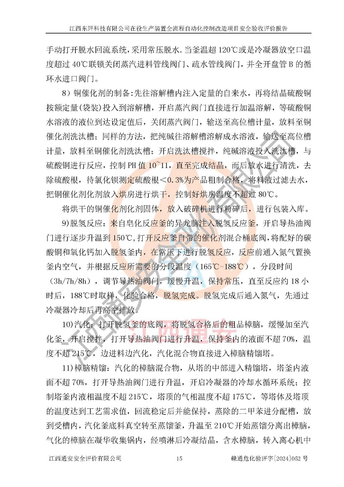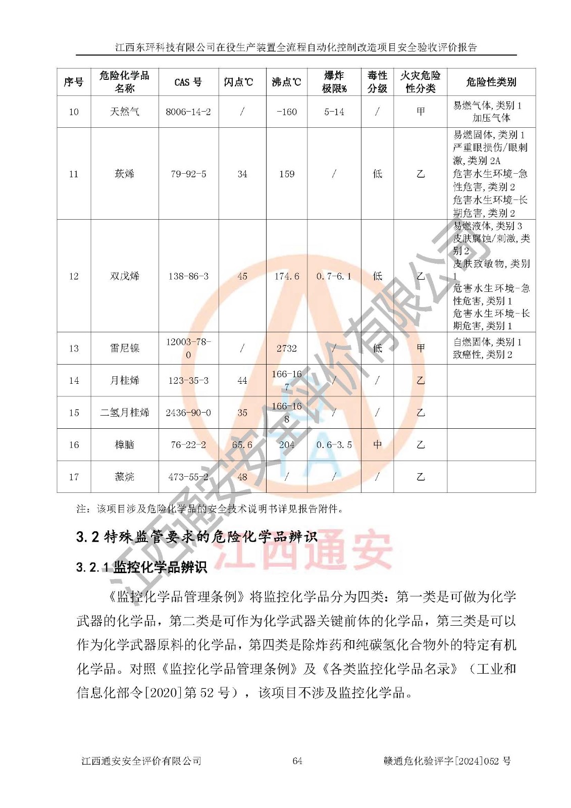 項目簡介 | 江西東玶科技有限公司(以下簡稱東玶科技)位于江西省吉安市吉水縣城西工業(yè)園區(qū),法定**人為徐東,成立于2018年04月08日,注冊資本叁仟貳佰叁拾萬元整,經(jīng)營范圍為合成樟腦、α-蒎烯、β-蒎烯、二氫月桂烯(含月桂烯)、莰烯、雙戊烯、氫氣(中間產(chǎn)品)的制造加工(憑**批準證書經(jīng)營);白乙酯、雙萜烯等合成香料的制造加工等。 江西東玶科技有限公司2022年08月01日取得了《安全生產(chǎn)許可證》,許可證編號:(贛)WH安許證字[2022]1160號,許可范圍為合成樟腦(2000t/a)、二氫月桂烯(1000t/a)、月桂烯(3200t/a)、莰烯(1000t/a)、雙戊烯(810t/a)、雙萜烯(1070t/a)、α-蒎烯(7500t/a)、β-蒎烯(3200t/a)、白乙酯(500t/a),**期:2022年08月01日至2025年07月31日。該公司現(xiàn)有員工50人,其中專職安全管理人員2人。 根據(jù)《江西省應急管理廳關于印發(fā)<江西省化工企業(yè)自動化提升實施方案>(試行)的通知》(贛應急字〔2021〕190號),東玶科技2022年10月委托山東鴻運工程設計有限公司對照《化工企業(yè)自動化提升要求》開展了評估,出具了《江西東玶科技有限公司全流程自動化控制診斷報告》(含隱患清單),并委托山東鴻運工程設計有限公司出具了《江西東玶科技有限公司在役生產(chǎn)裝置全流程自動化控制改造設計方案》,吉安市應急管理局2024年6月13日組織專家對設計方案進行了技術評審,設計院對照專家組意見進行了修改完善。東玶科技委托山東鴻運工程設計有限公司出具了《江西東玶科技有限公司在役生產(chǎn)裝置全流程自動化控制改造項目施工圖》(2024年7月)。東玶科技2024年7月委托了蘇華建設集團有限公司進行自動化改造設備儀表安裝施工,并出具了安裝調(diào)試報告。 江西東玶科技有限公司于2025年3月委托山東鴻運工程設計有限公司出具了《江西東玶科技有限公司在役生產(chǎn)裝置及年產(chǎn)12000噸松節(jié)油深加工系列產(chǎn)品項目(二期工程)安全設施設計變更》。 江西東玶科技有限公司在役生產(chǎn)裝置全流程自動化控制改造項目涉及的松節(jié)油、乙酸、液堿、甲醇、二甲苯、甲酸、氫氣、雷尼鎳、天然氣,中間產(chǎn)品α-蒎烯、β-蒎烯和產(chǎn)品中雙戊烯、莰烯屬于危險化學品。經(jīng)辨識,甲醇、氫氣和天然氣(燃料)屬于重點監(jiān)管的危險化學品,甲醇屬于特別管控危險化學品,不涉及監(jiān)控化學品、易制毒化學品、易制爆危險化學品、劇毒化學品和高毒物品,生產(chǎn)、儲存單元不構成危險化學品重大危險源,不涉及重點監(jiān)管的危險化工工藝。 | ||||||