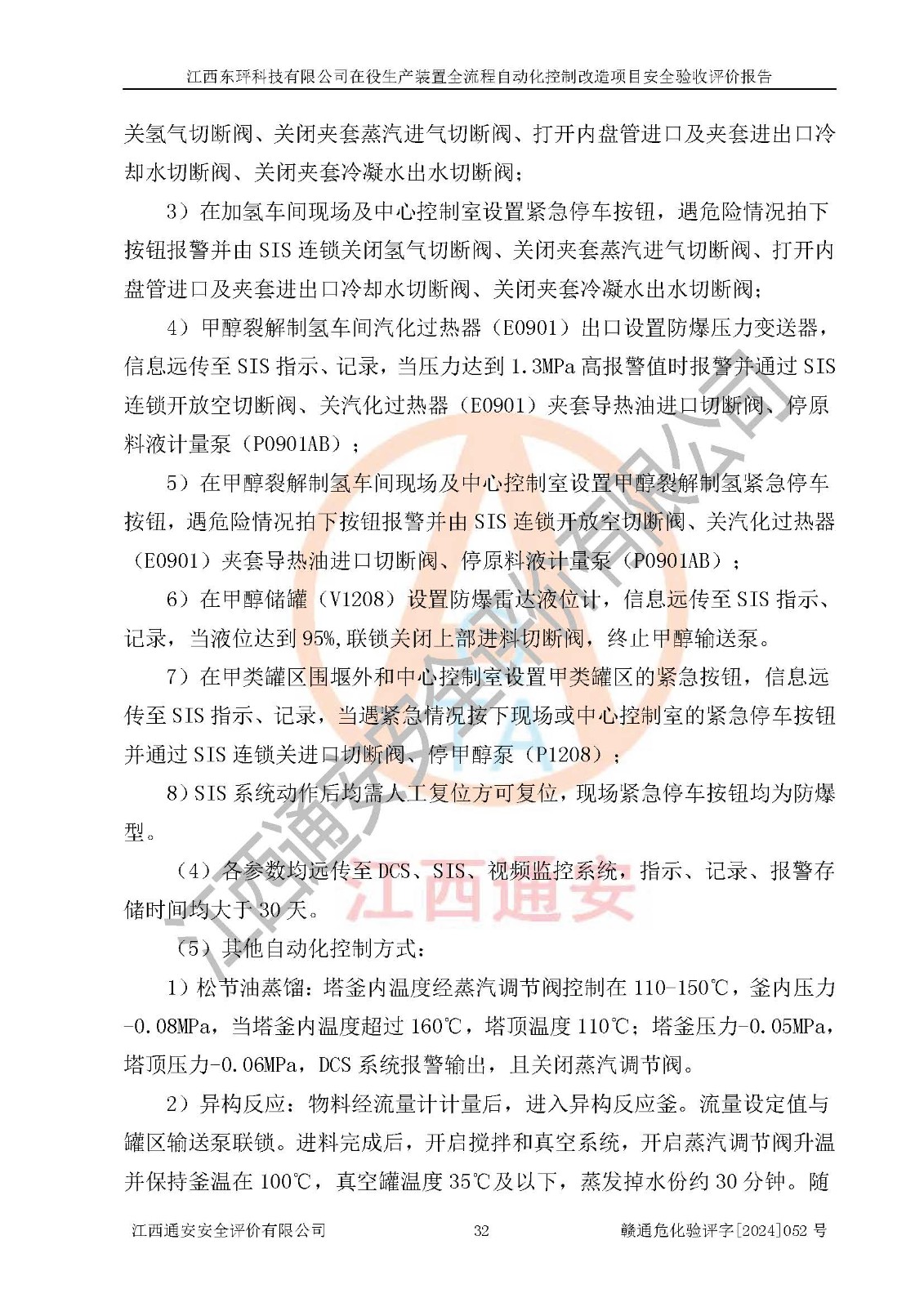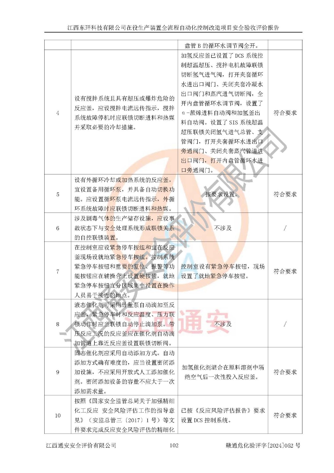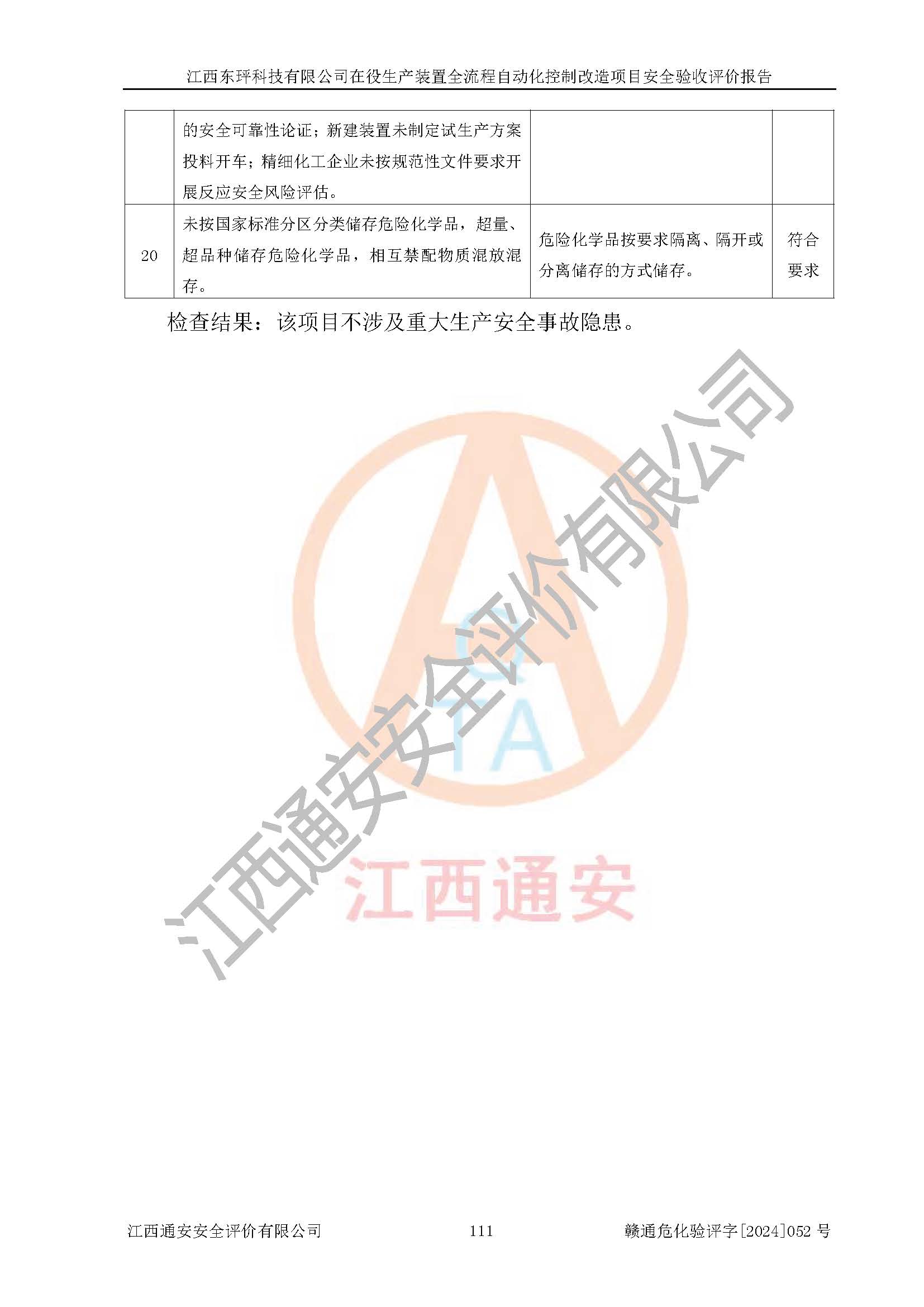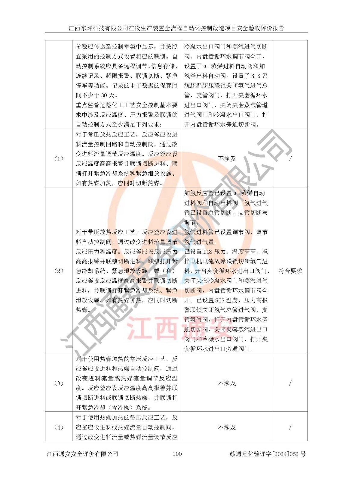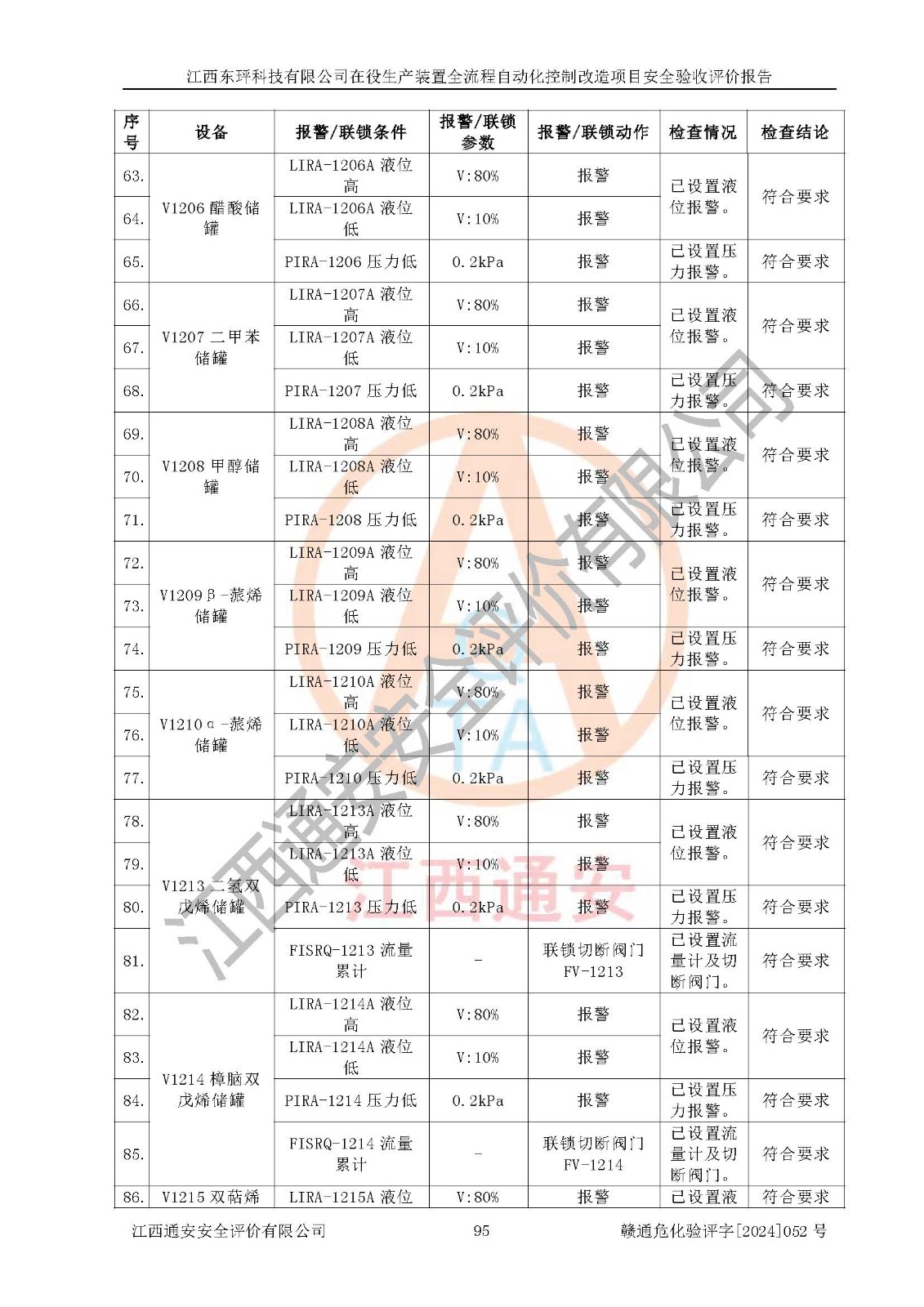 評價結論 | 江西睿達新能源科技有限公司在役生產(chǎn)裝置自動化控制改造設計方案中提出的控制措施已得到落實,自動化控制系統(tǒng)設置情況與設計方案一致,滿足《江西省應急管理廳關于印發(fā)<江西省化工企業(yè)自動化提升實施方案>(試行)的通知》(贛應急字〔2021〕190號)的要求,具備自動化控制改造工程竣工驗收條件。 | ||||||