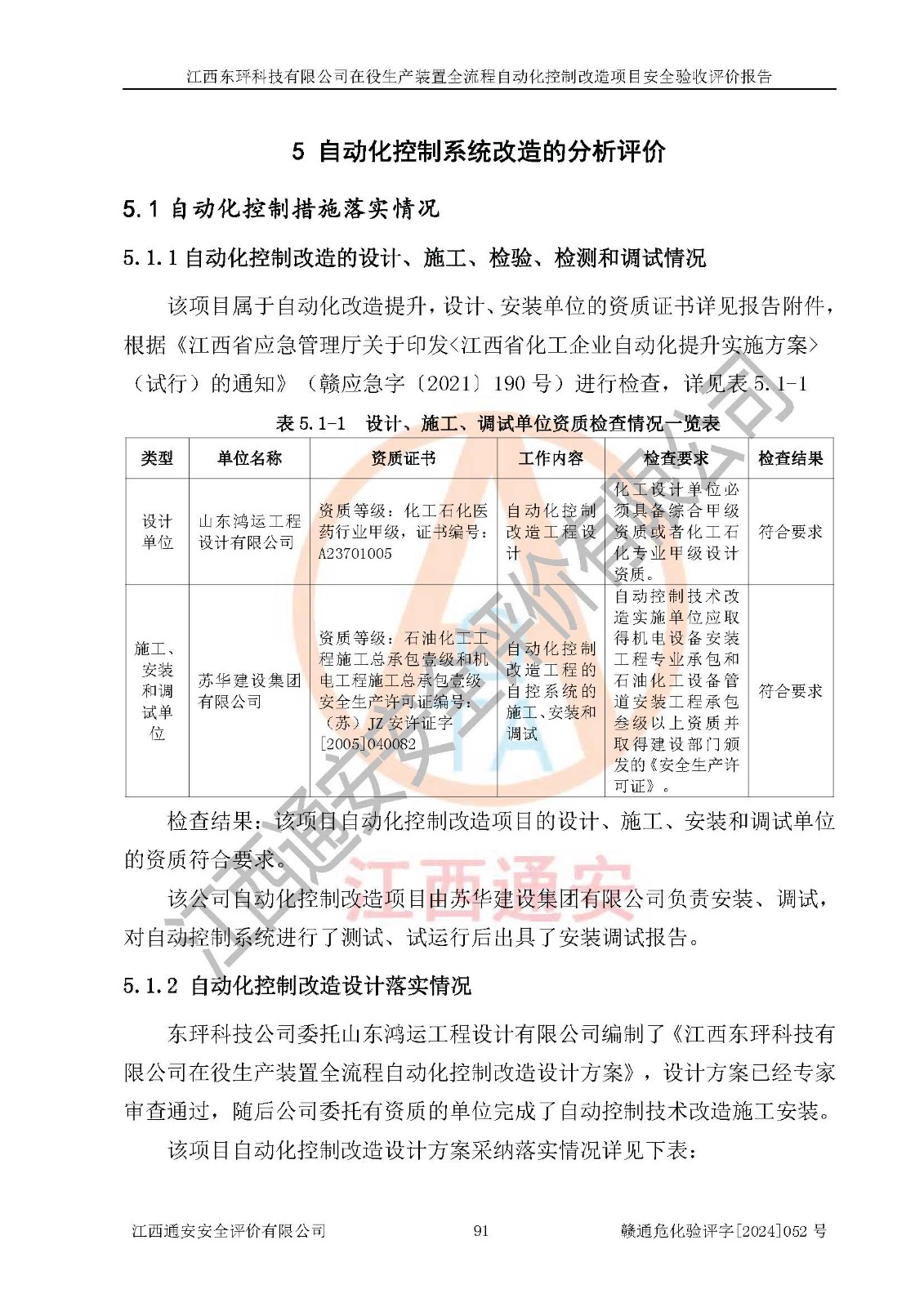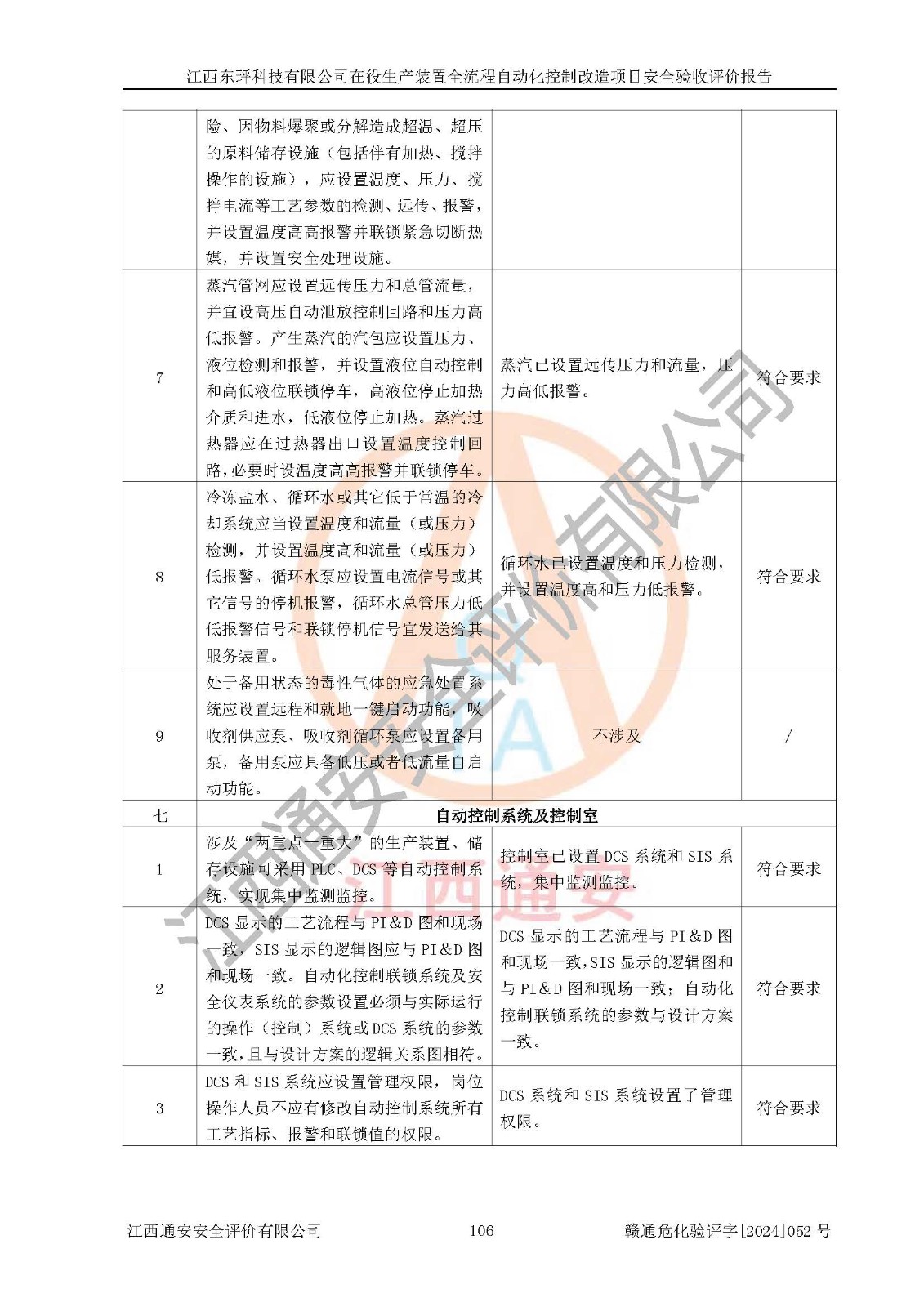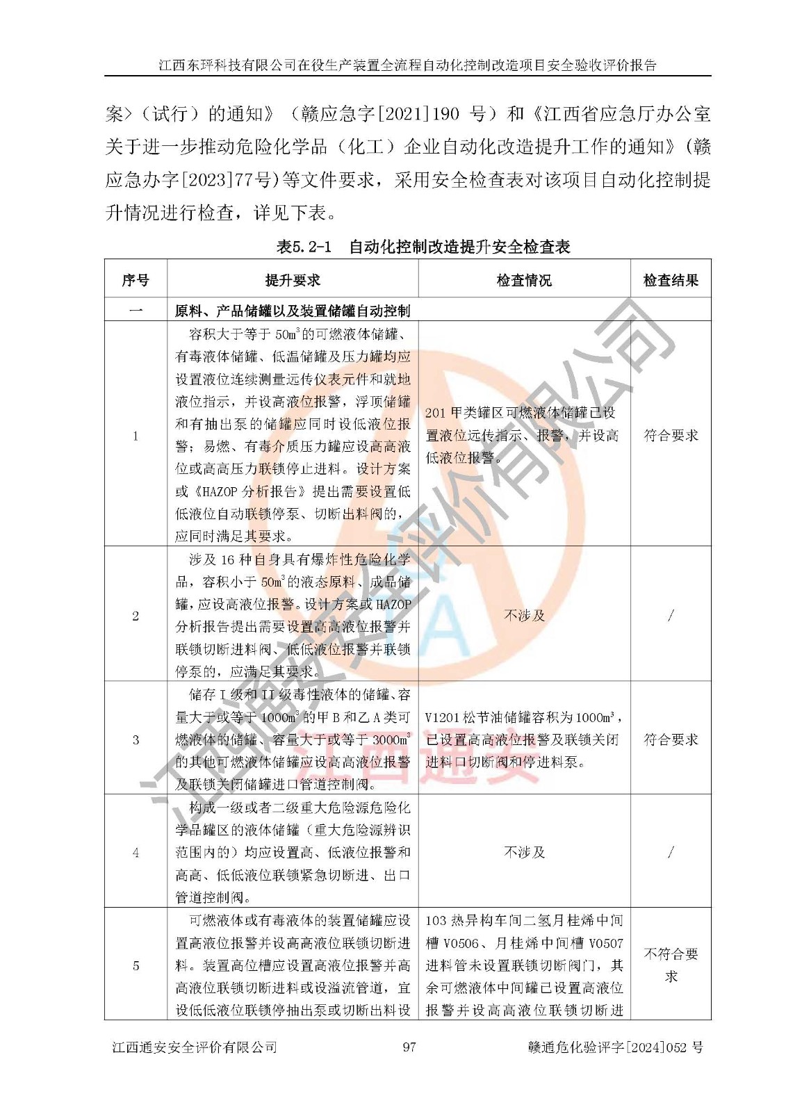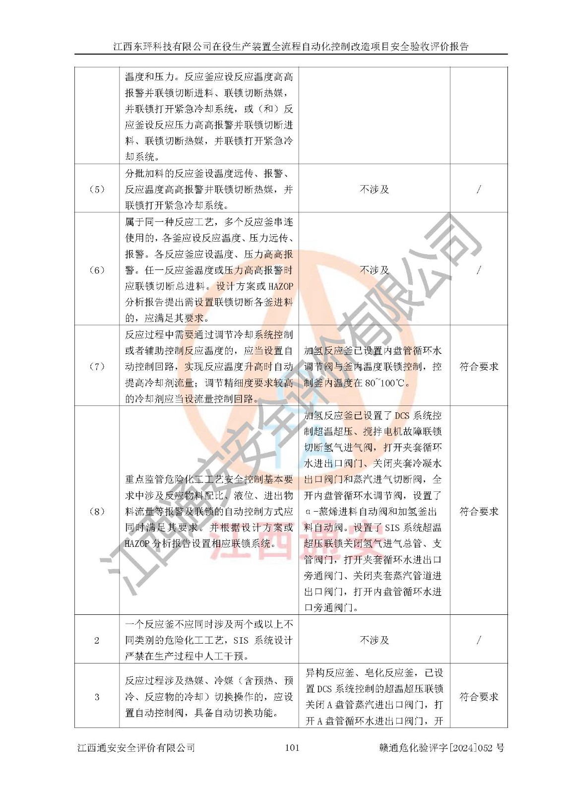 評價結論 | 江西睿達新能源科技有限公司在役生產(chǎn)裝置自動化控制改造設計方案中提出的控制措施已得到落實,自動化控制系統(tǒng)設置情況與設計方案一致,滿足《江西省應急管理廳關于印發(fā)<江西省化工企業(yè)自動化提升實施方案>(試行)的通知》(贛應急字〔2021〕190號)的要求,具備自動化控制改造工程竣工驗收條件。 | ||||||