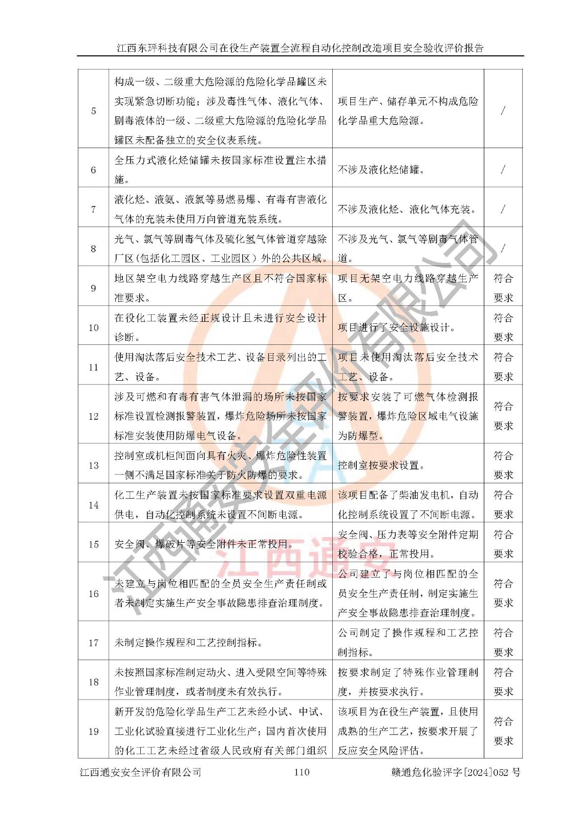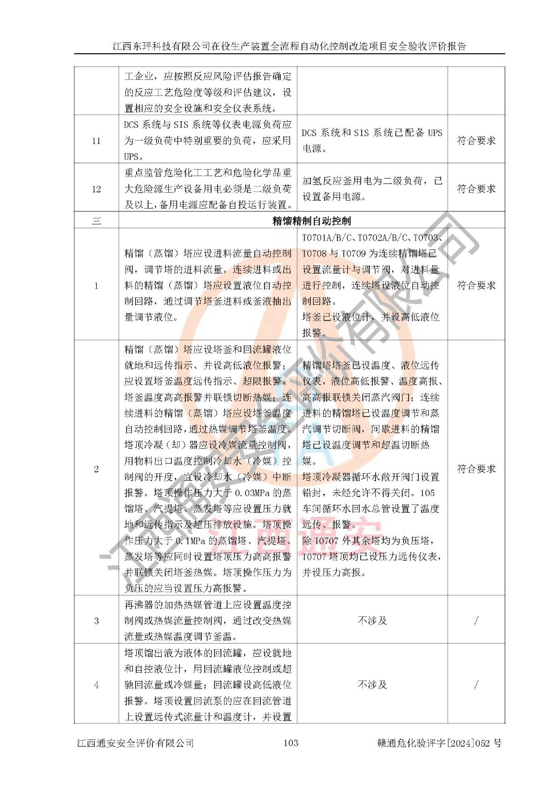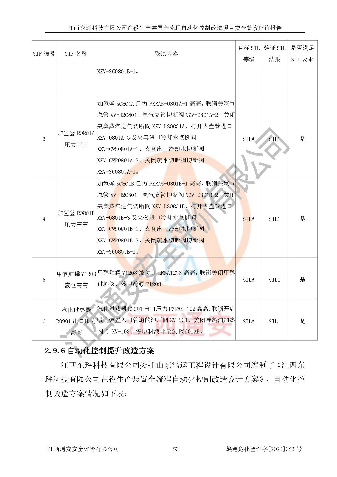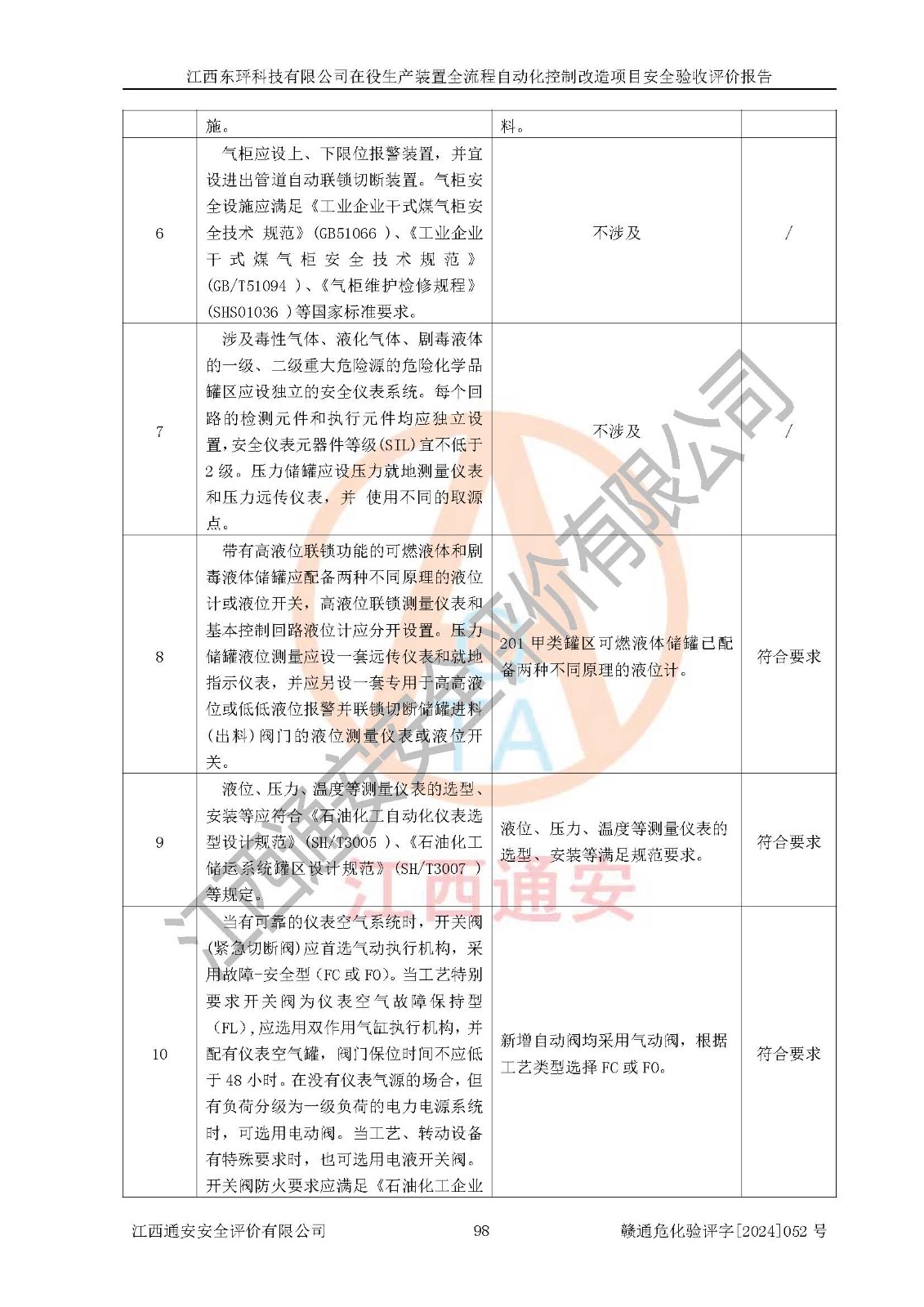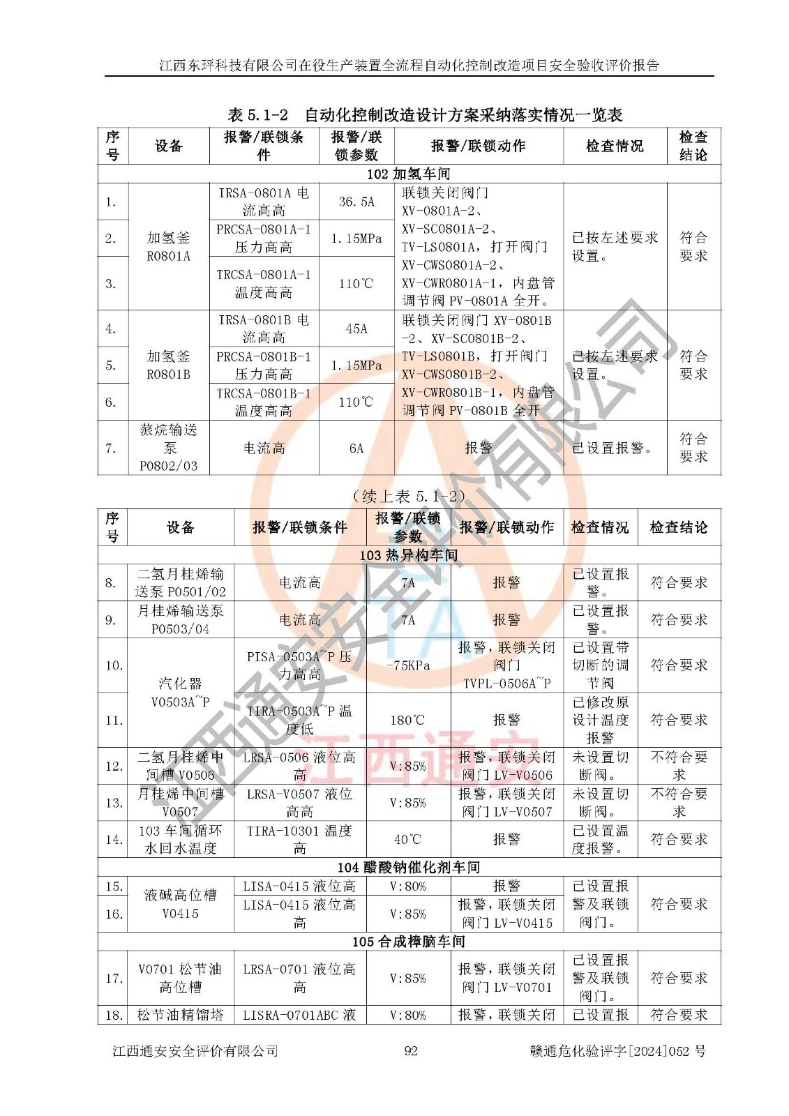 評價結論 | 江西睿達新能源科技有限公司在役生產(chǎn)裝置自動化控制改造設計方案中提出的控制措施已得到落實,自動化控制系統(tǒng)設置情況與設計方案一致,滿足《江西省應急管理廳關于印發(fā)<江西省化工企業(yè)自動化提升實施方案>(試行)的通知》(贛應急字〔2021〕190號)的要求,具備自動化控制改造工程竣工驗收條件。 | ||||||
