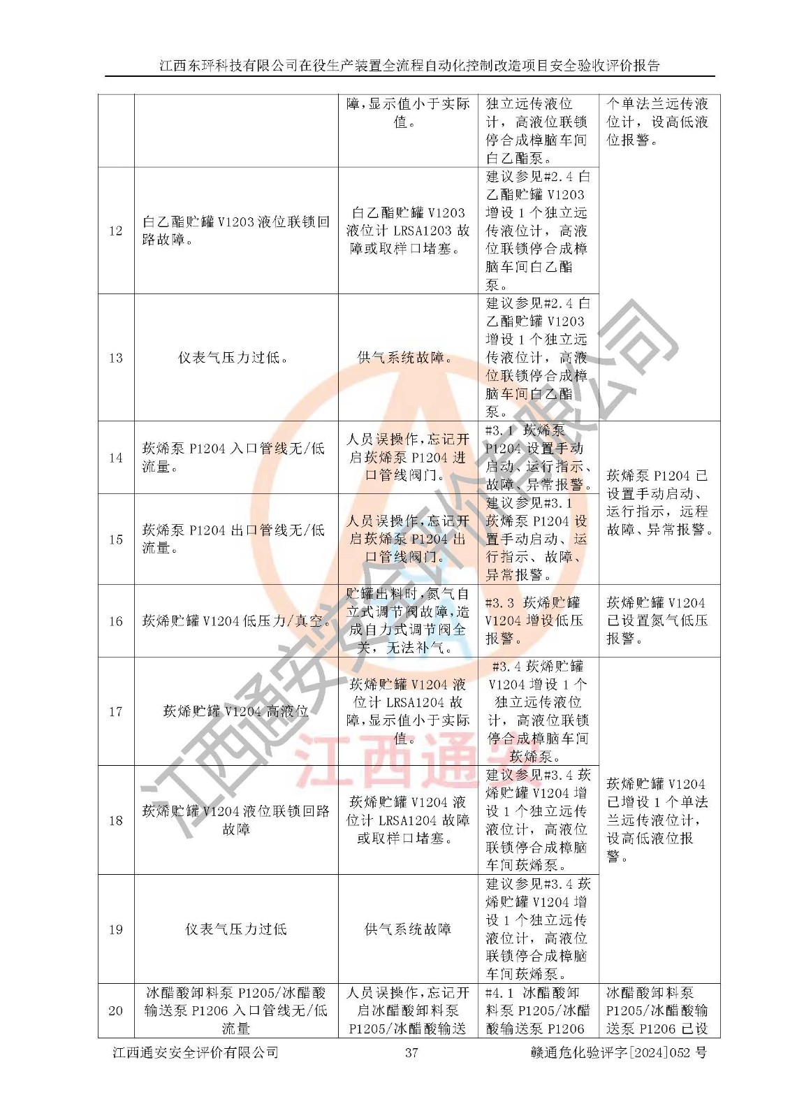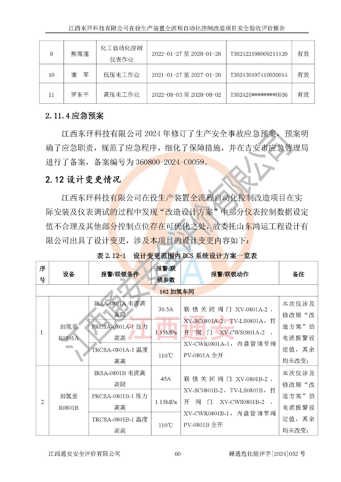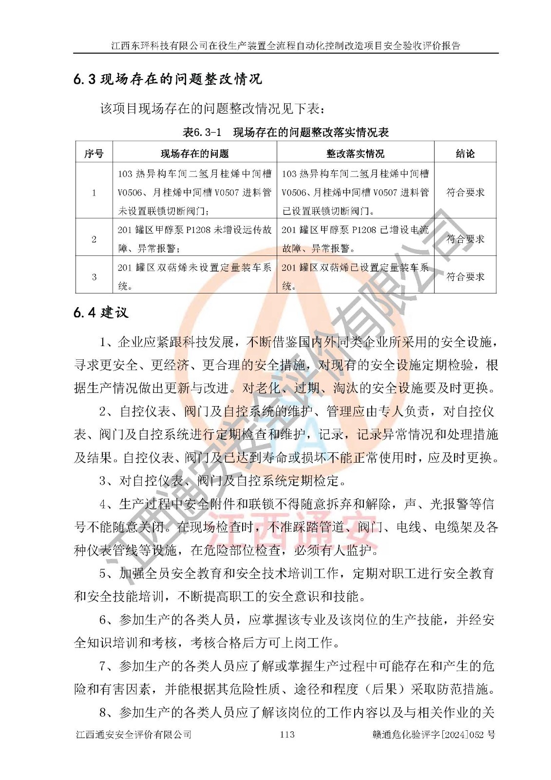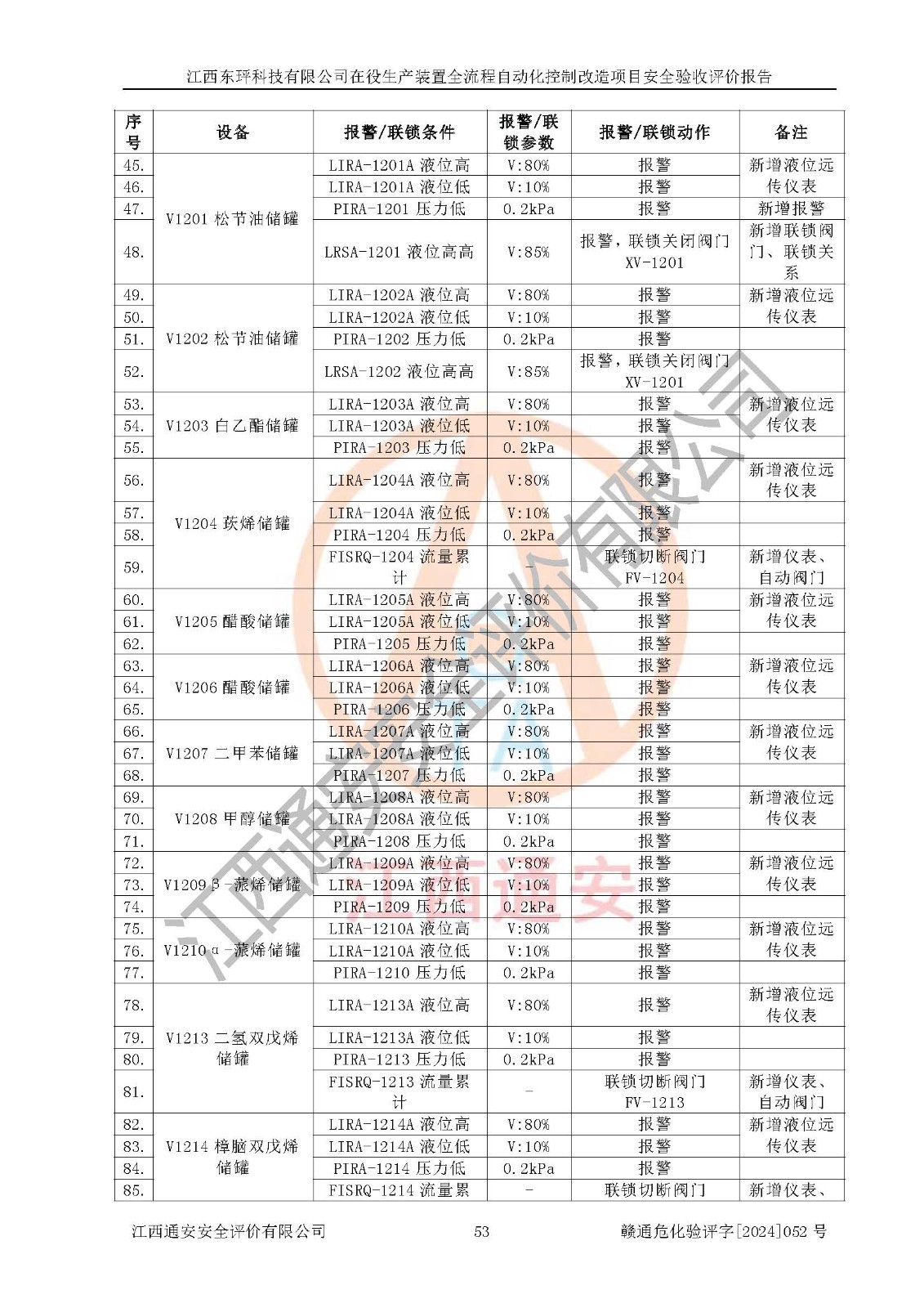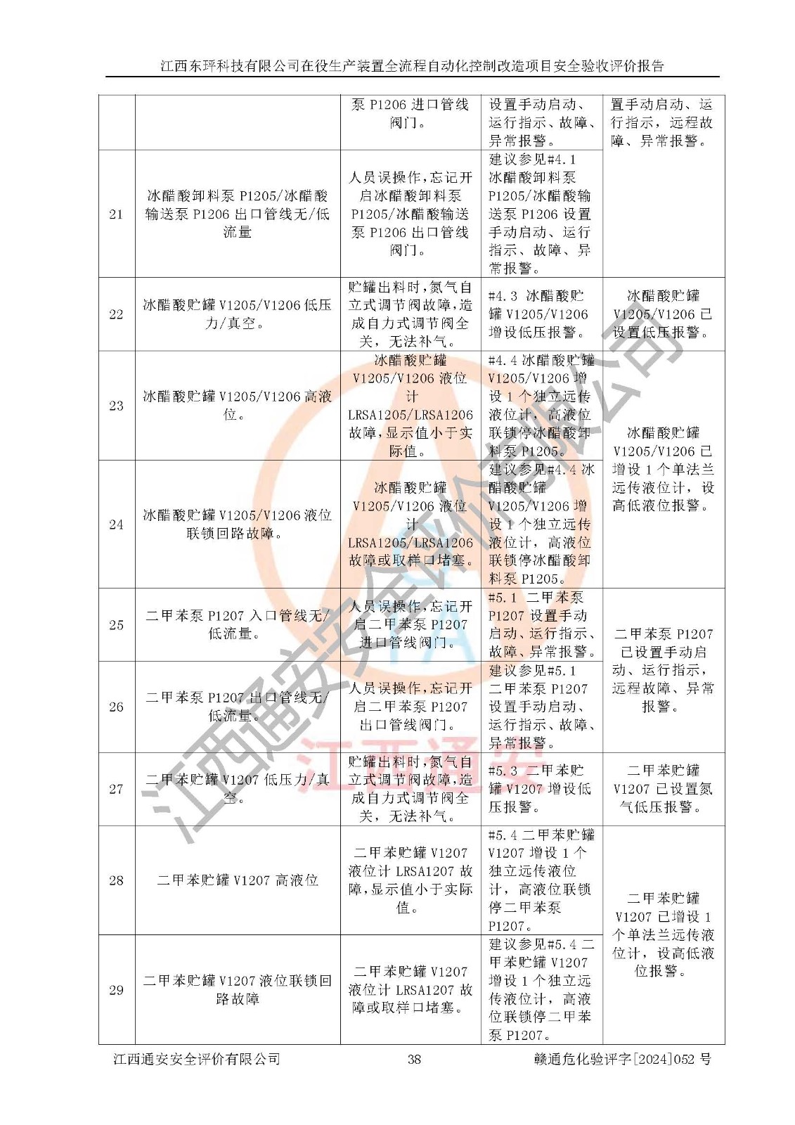 評價結論 | 江西睿達新能源科技有限公司在役生產(chǎn)裝置自動化控制改造設計方案中提出的控制措施已得到落實,自動化控制系統(tǒng)設置情況與設計方案一致,滿足《江西省應急管理廳關于印發(fā)<江西省化工企業(yè)自動化提升實施方案>(試行)的通知》(贛應急字〔2021〕190號)的要求,具備自動化控制改造工程竣工驗收條件。 | ||||||