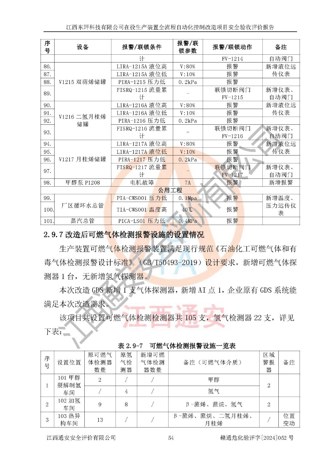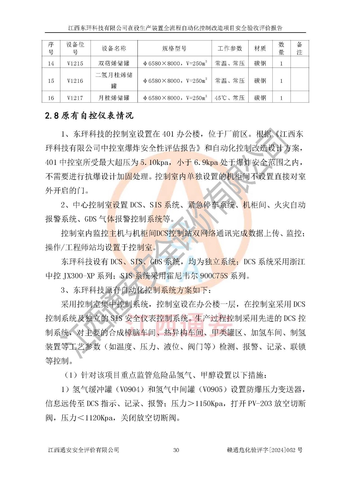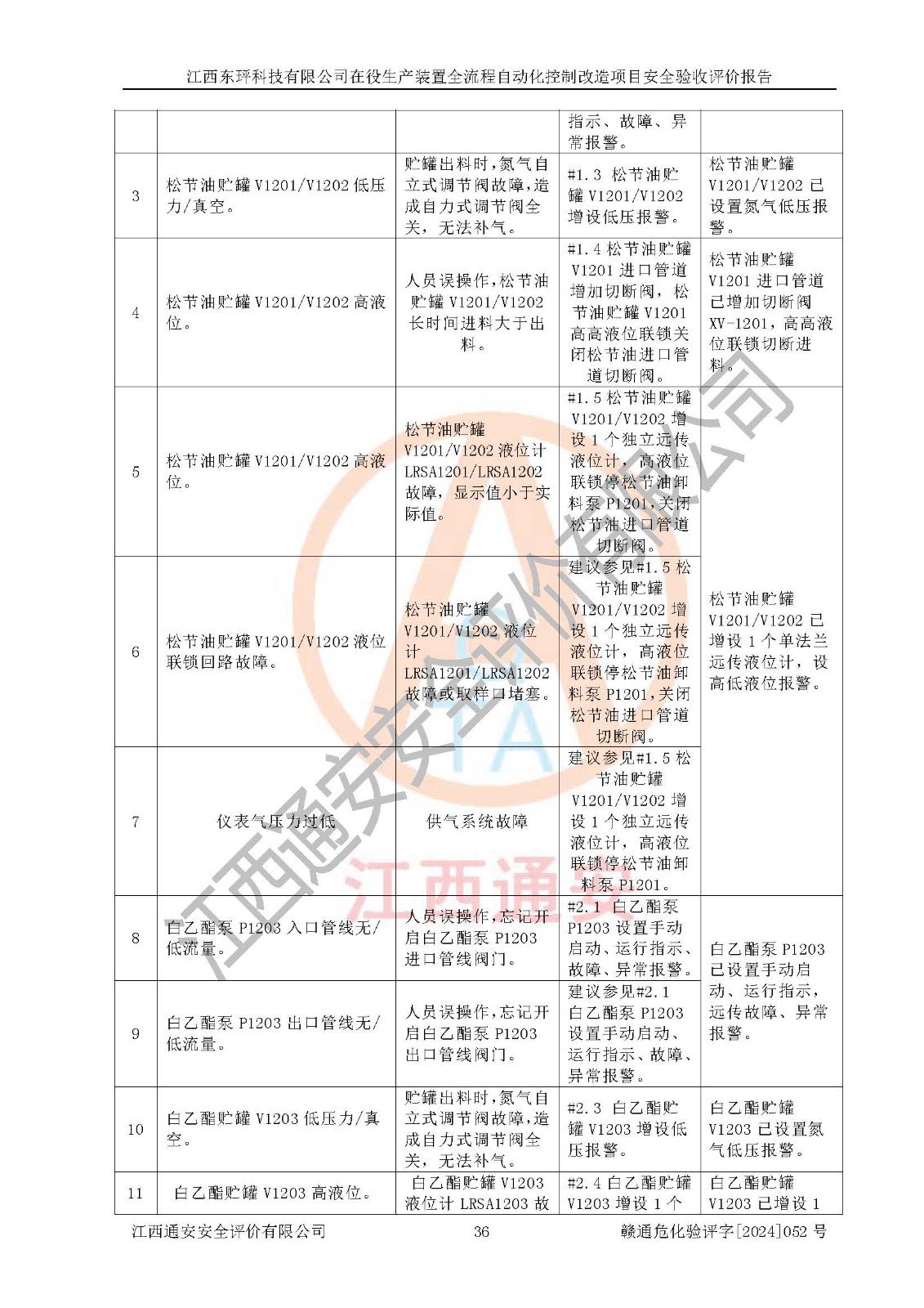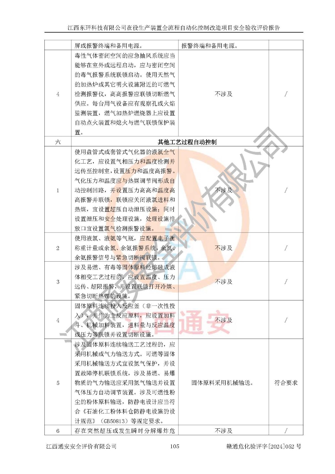 評價結論 | 江西睿達新能源科技有限公司在役生產(chǎn)裝置自動化控制改造設計方案中提出的控制措施已得到落實,自動化控制系統(tǒng)設置情況與設計方案一致,滿足《江西省應急管理廳關于印發(fā)<江西省化工企業(yè)自動化提升實施方案>(試行)的通知》(贛應急字〔2021〕190號)的要求,具備自動化控制改造工程竣工驗收條件。 | ||||||