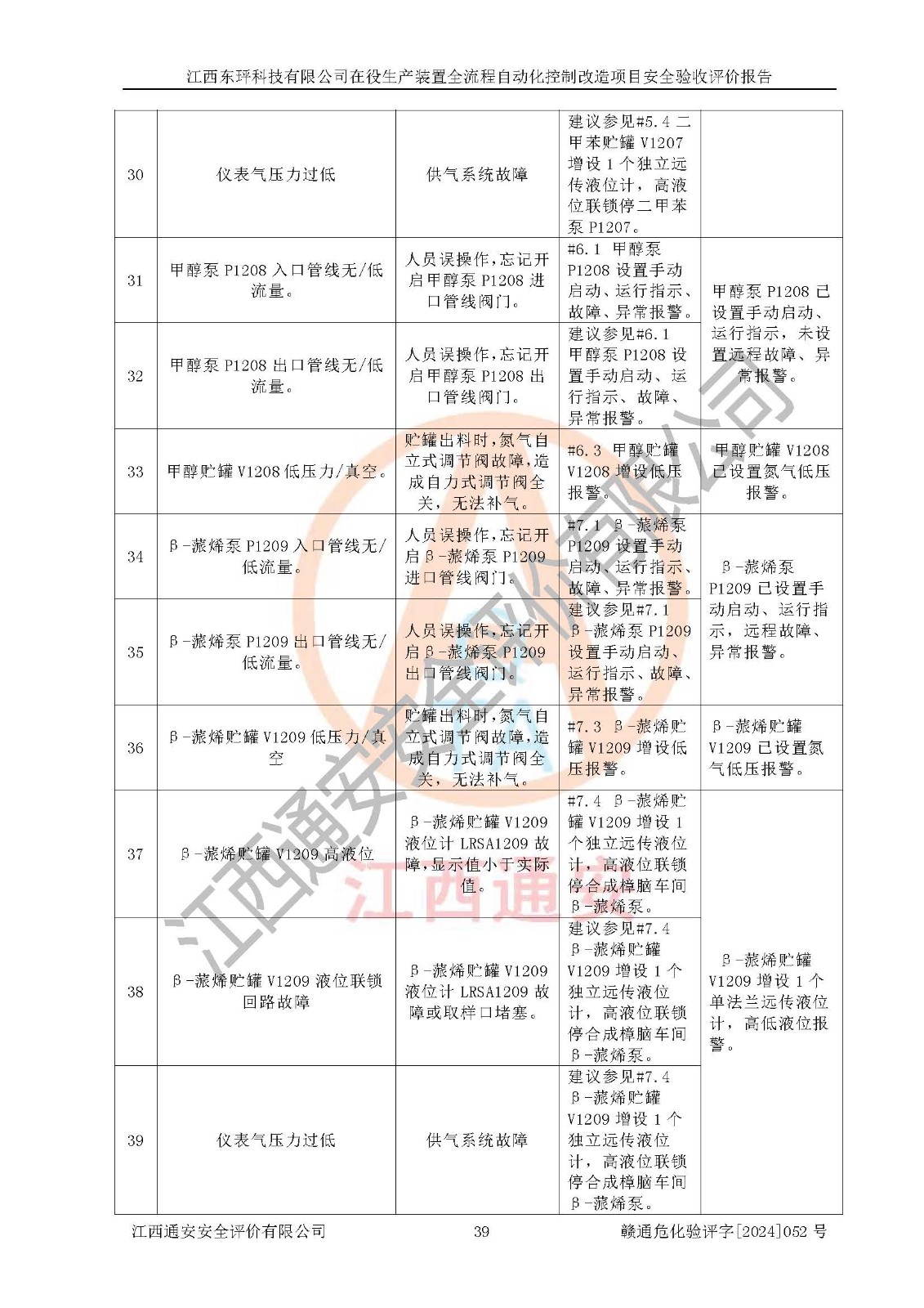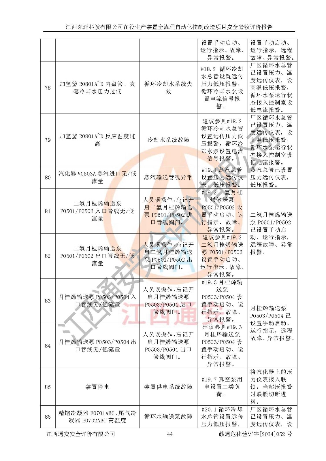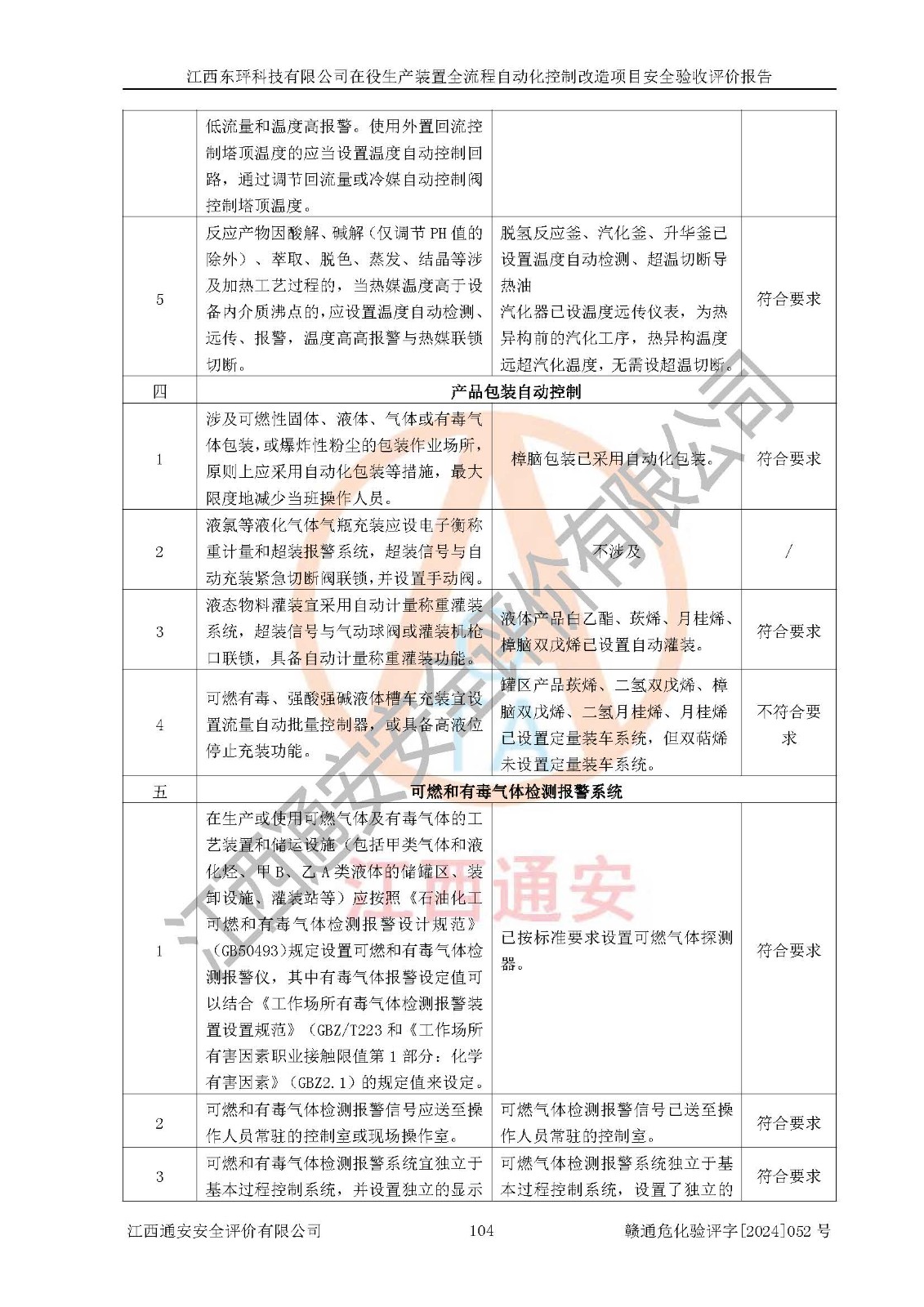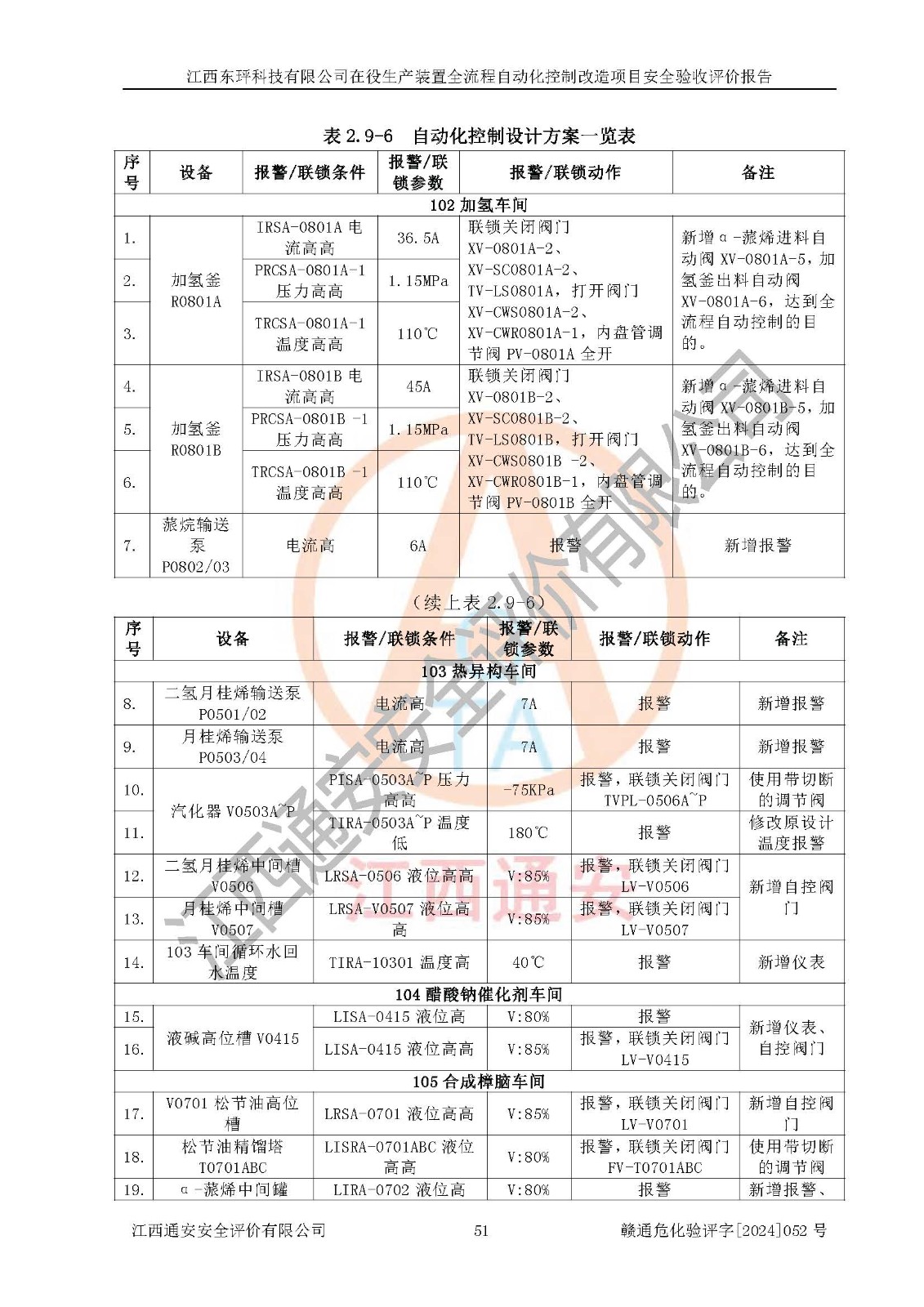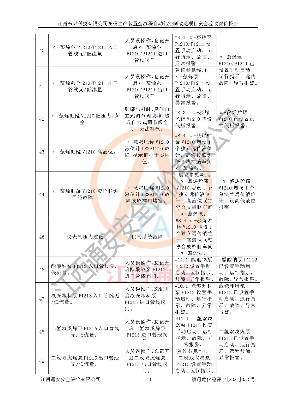評價結論 | 江西睿達新能源科技有限公司在役生產(chǎn)裝置自動化控制改造設計方案中提出的控制措施已得到落實,自動化控制系統(tǒng)設置情況與設計方案一致,滿足《江西省應急管理廳關于印發(fā)<江西省化工企業(yè)自動化提升實施方案>(試行)的通知》(贛應急字〔2021〕190號)的要求,具備自動化控制改造工程竣工驗收條件。 | ||||||