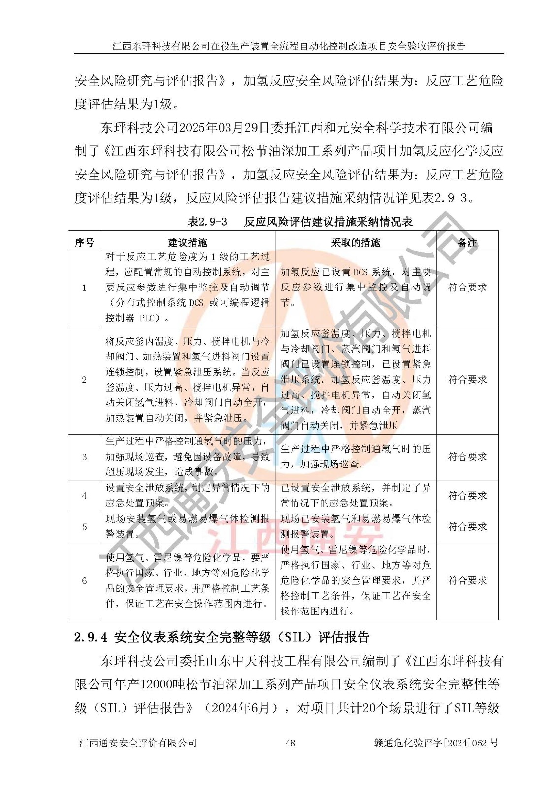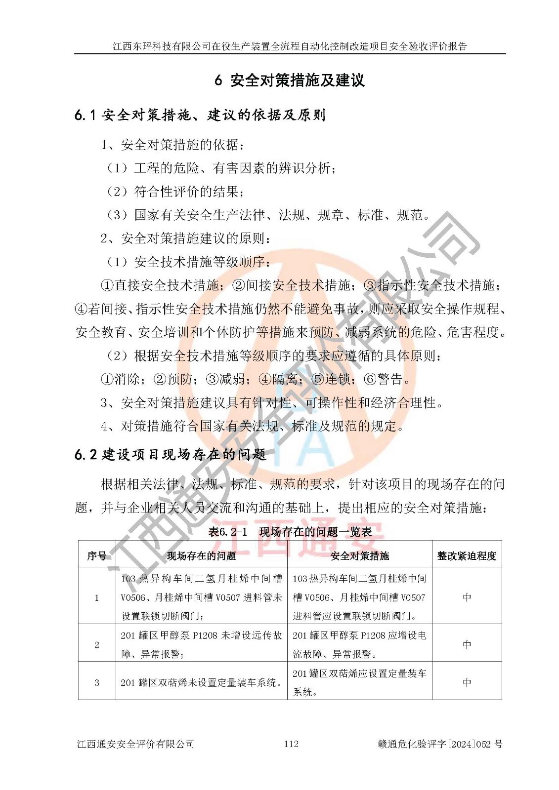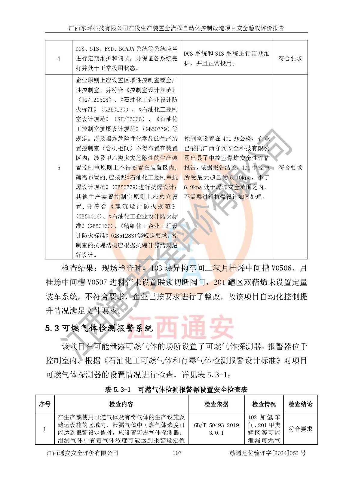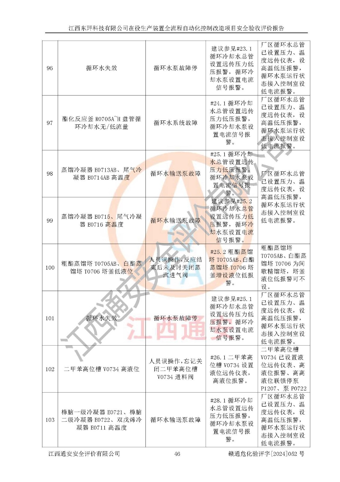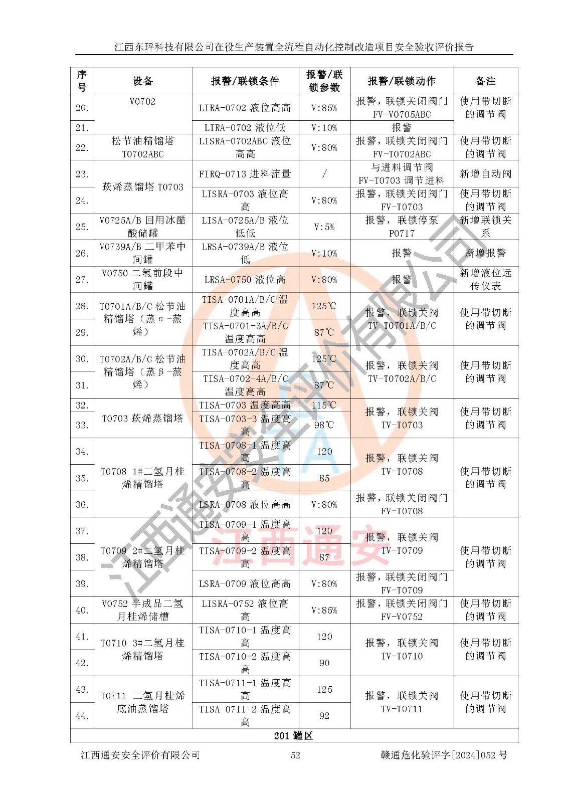 評價結論 | 江西睿達新能源科技有限公司在役生產(chǎn)裝置自動化控制改造設計方案中提出的控制措施已得到落實,自動化控制系統(tǒng)設置情況與設計方案一致,滿足《江西省應急管理廳關于印發(fā)<江西省化工企業(yè)自動化提升實施方案>(試行)的通知》(贛應急字〔2021〕190號)的要求,具備自動化控制改造工程竣工驗收條件。 | ||||||