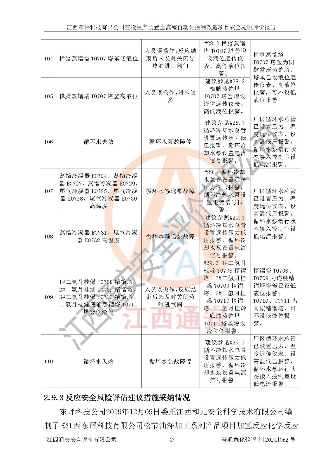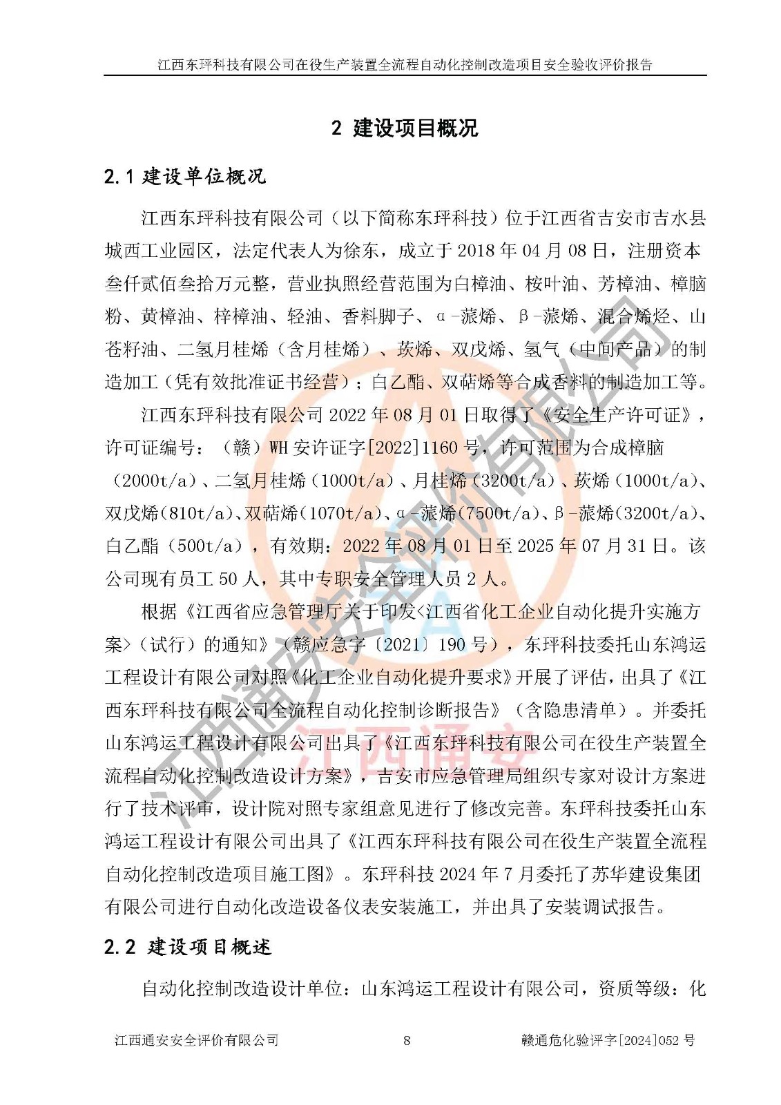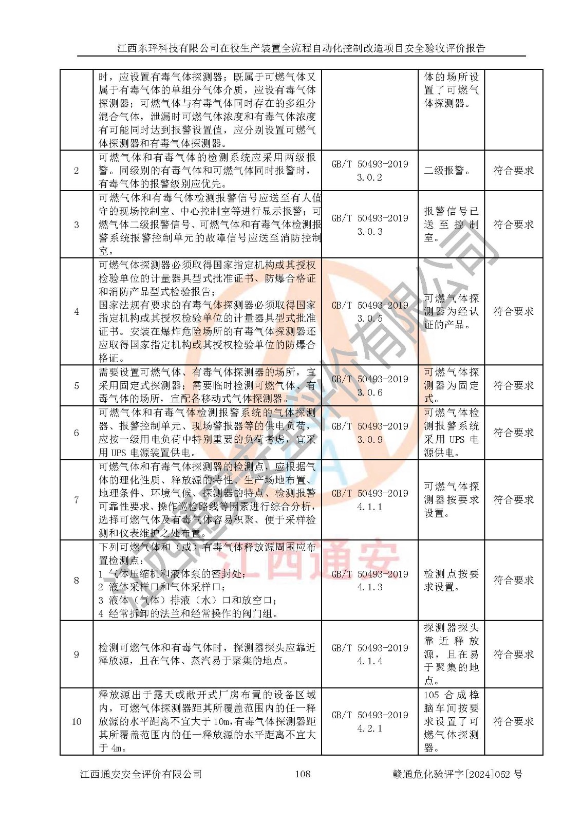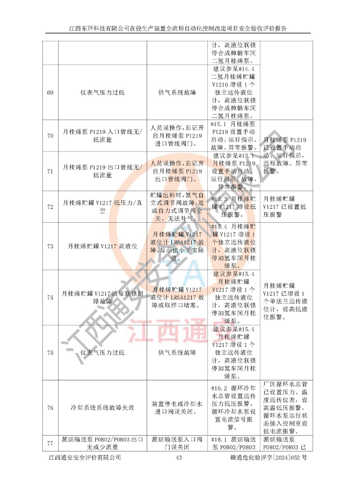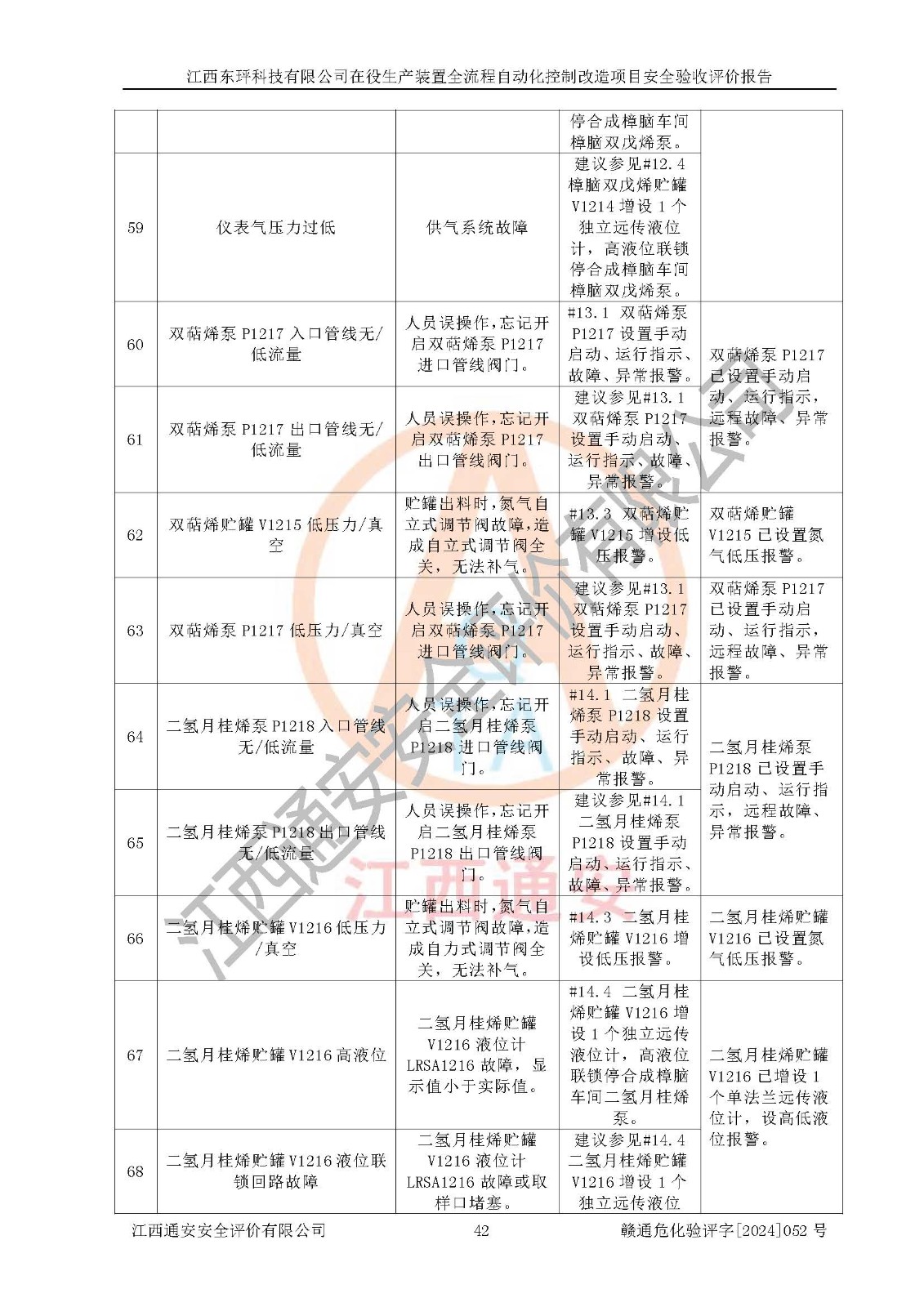 評價結論 | 江西睿達新能源科技有限公司在役生產(chǎn)裝置自動化控制改造設計方案中提出的控制措施已得到落實,自動化控制系統(tǒng)設置情況與設計方案一致,滿足《江西省應急管理廳關于印發(fā)<江西省化工企業(yè)自動化提升實施方案>(試行)的通知》(贛應急字〔2021〕190號)的要求,具備自動化控制改造工程竣工驗收條件。 | ||||||