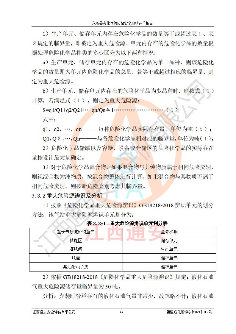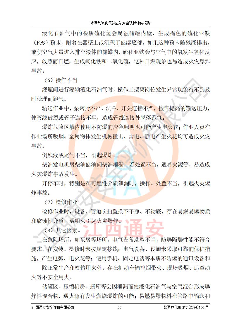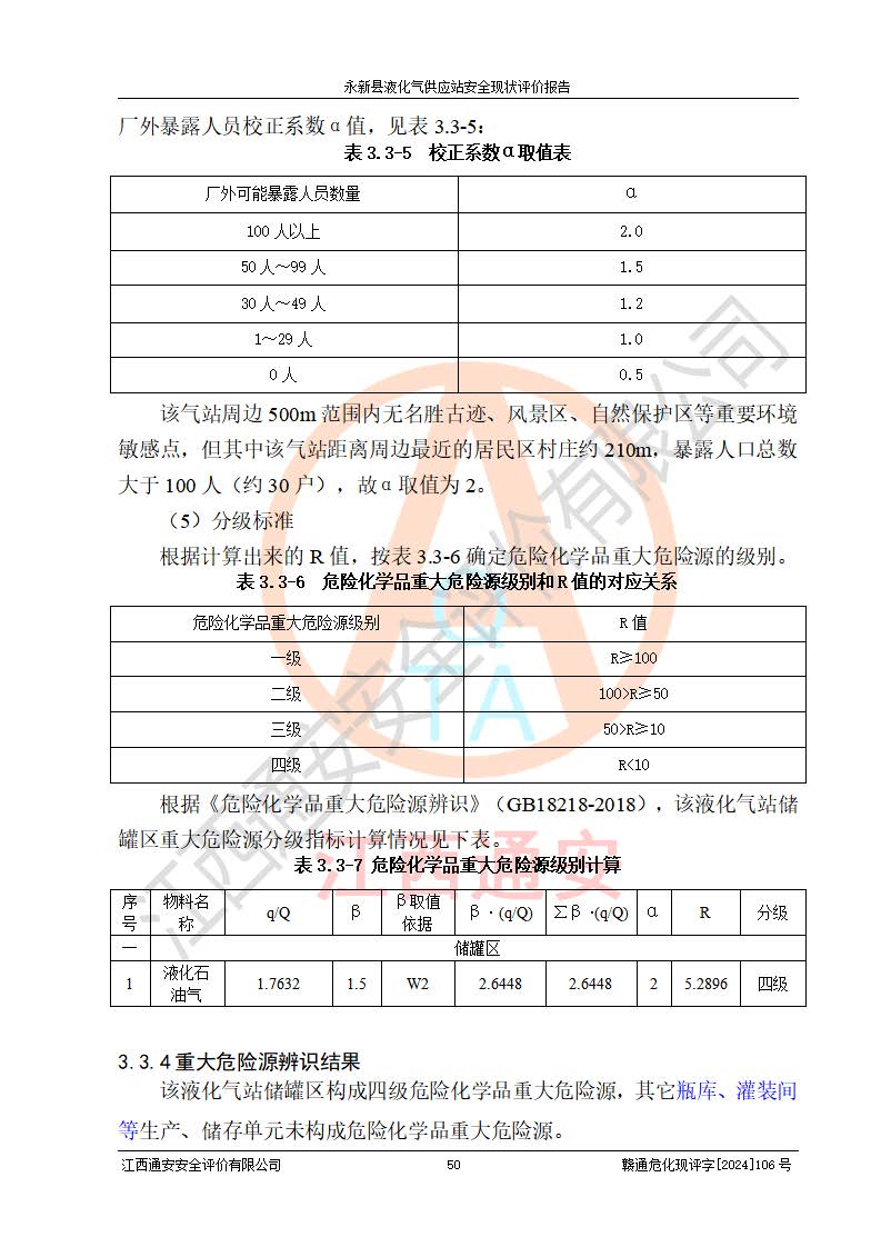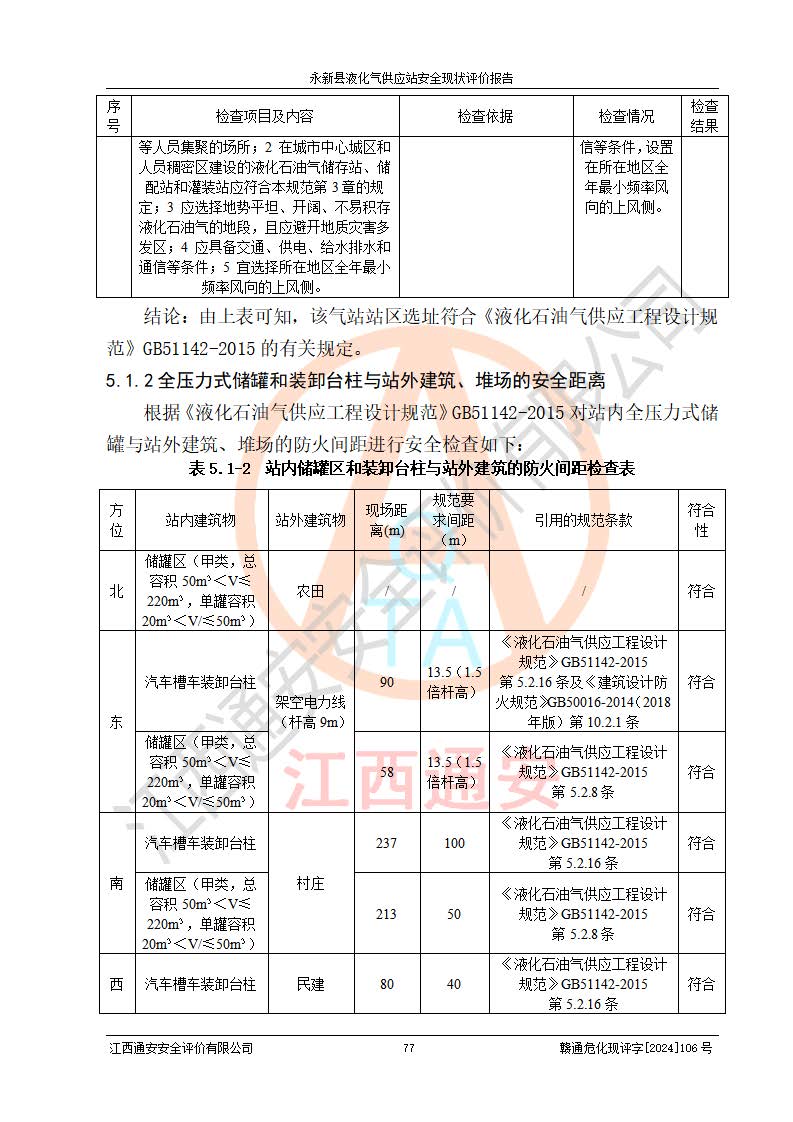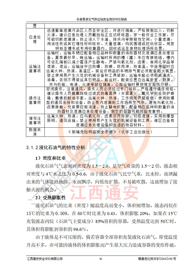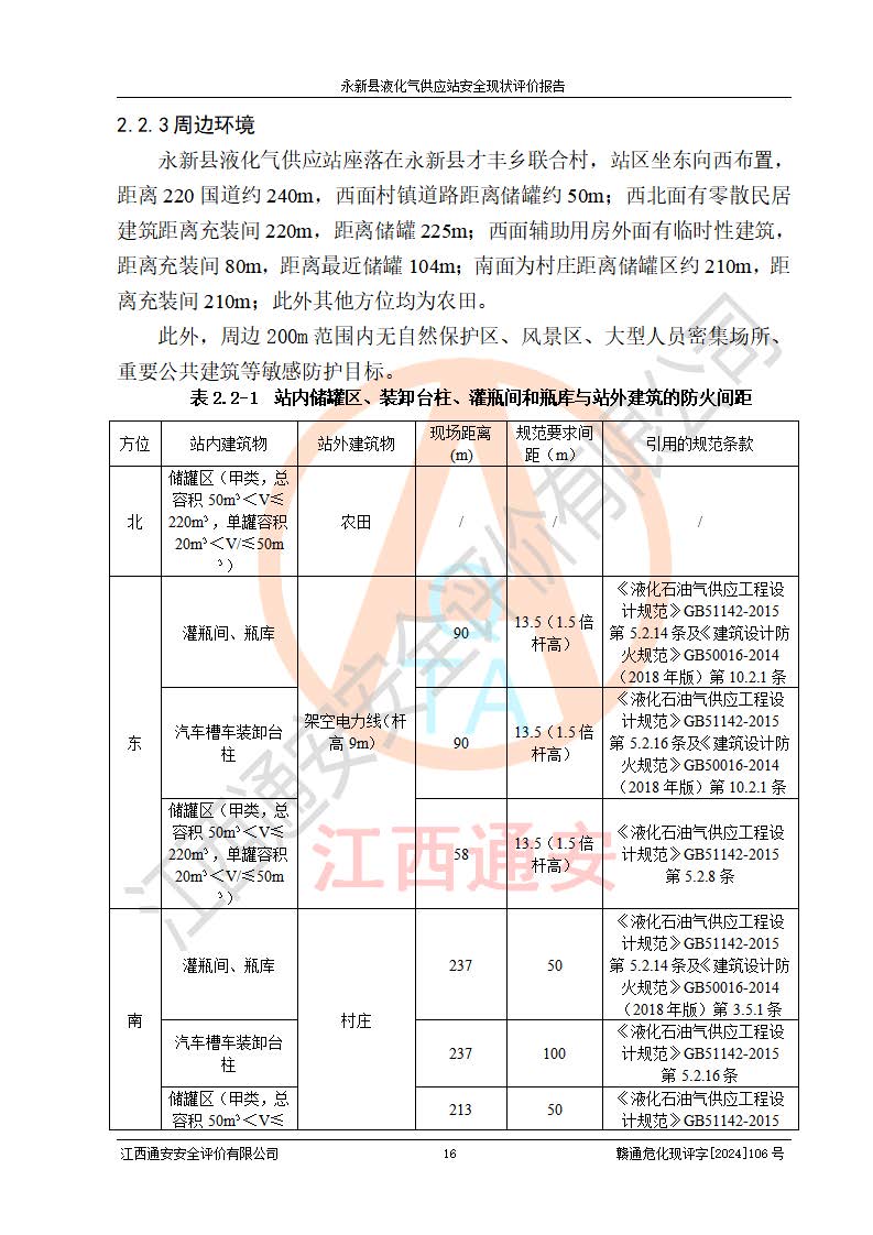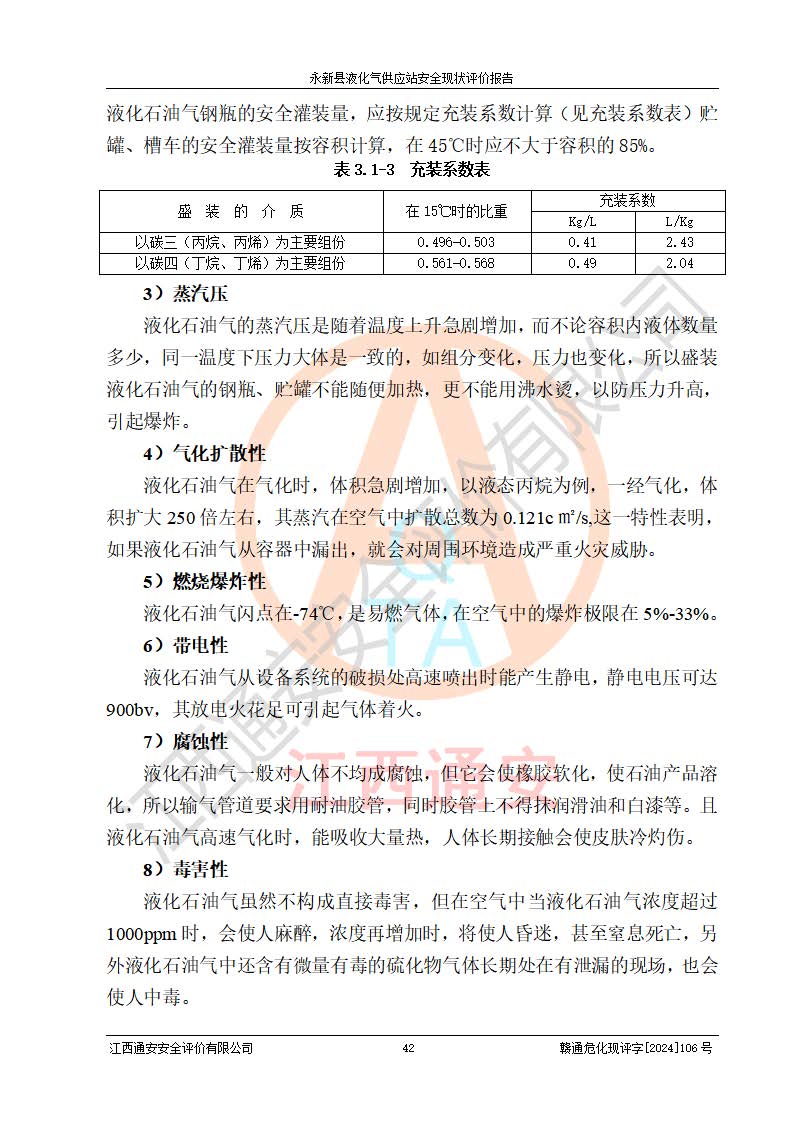 項目簡介 | 永新縣液化氣供應站(以下簡稱“氣站”)位于江西省吉安市永新縣才豐鄉(xiāng)聯(lián)合村,是一家從事液化石油氣儲存、經(jīng)營的企業(yè),成立于1995年11月1日,法人**:吳吟軒,企業(yè)類型:集體所有制。 該站2022年3月26日換得永新縣住房和城鄉(xiāng)建設(shè)局頒發(fā)的燃氣經(jīng)營許可證,許可證編號:贛201307110003P,**期至2025年3月26日,經(jīng)營類別:瓶裝燃氣。 該站2021年5月23日換得吉安市市場監(jiān)督管理局頒發(fā)的氣瓶充裝許可證,編號:TS4236D77-2025,獲準從事液化石油汽氣瓶充裝,**期至2025年5月22日。 該氣站設(shè)有容積為50m3的地上臥式液化石油氣儲罐3臺、容積為30m3的地上臥式液化石油氣儲罐1臺和容積為10m3的地上臥式液化石油氣殘液罐1臺。根據(jù)《液化石油氣供應工程設(shè)計規(guī)范》GB51142-2015對液化石油氣供應站等級劃分,該站屬于六級液化石油氣供應站。 經(jīng)辨識,該氣站涉及的液化石油氣、柴油屬于危險化學品。項目涉及的液化石油氣屬于重點監(jiān)管危險化學品。氣站涉及的液化石油氣屬于特別管控危險化學品。永新縣液化氣供應站儲罐區(qū)構(gòu)成四級危險化學品重大危險源,其它生產(chǎn)、儲存單元未構(gòu)成危險化學品重大危險源。 經(jīng)辨識,該項目不涉及重點監(jiān)管的危險化工工藝。 經(jīng)辨識,該在役生產(chǎn)裝置各生產(chǎn)、儲存單元均未構(gòu)成危險化學品重大危險源。 | |||