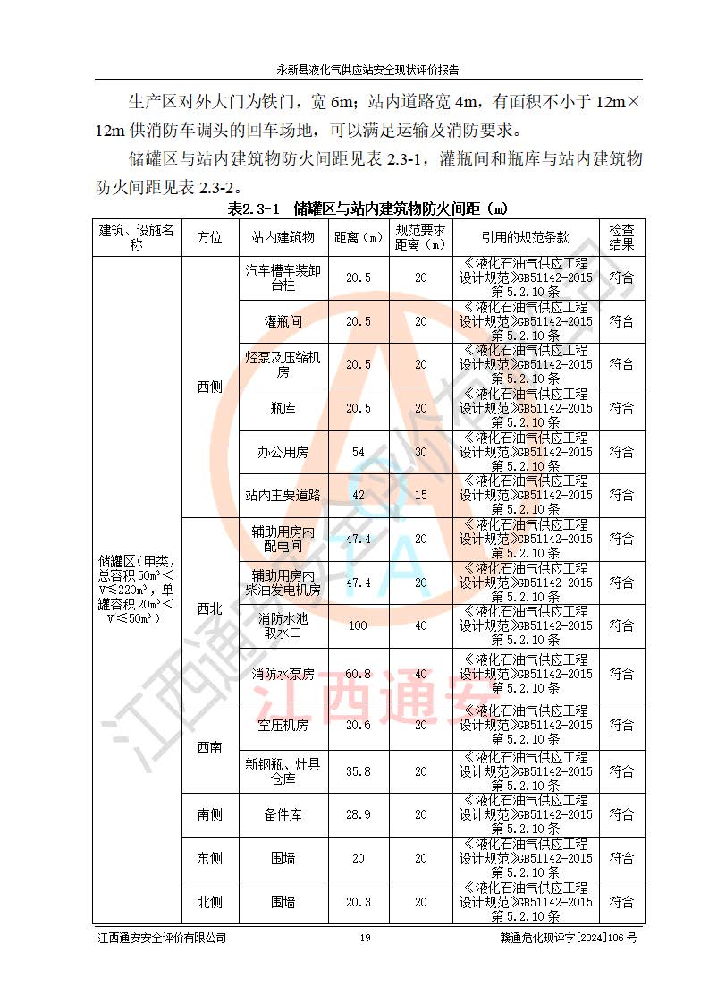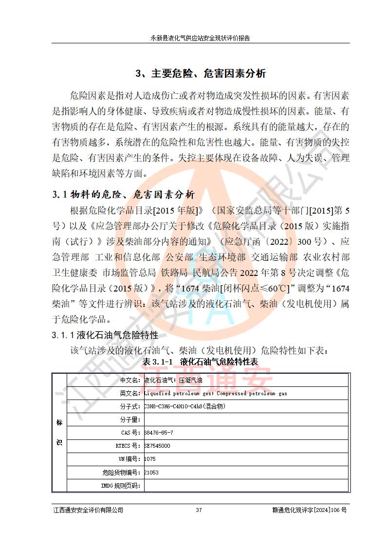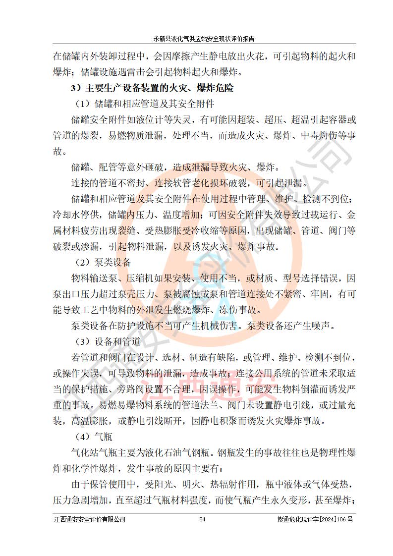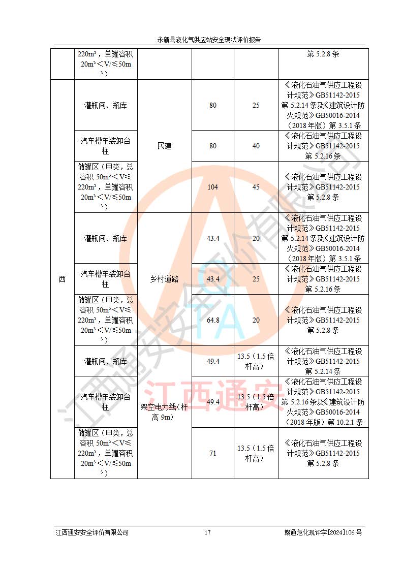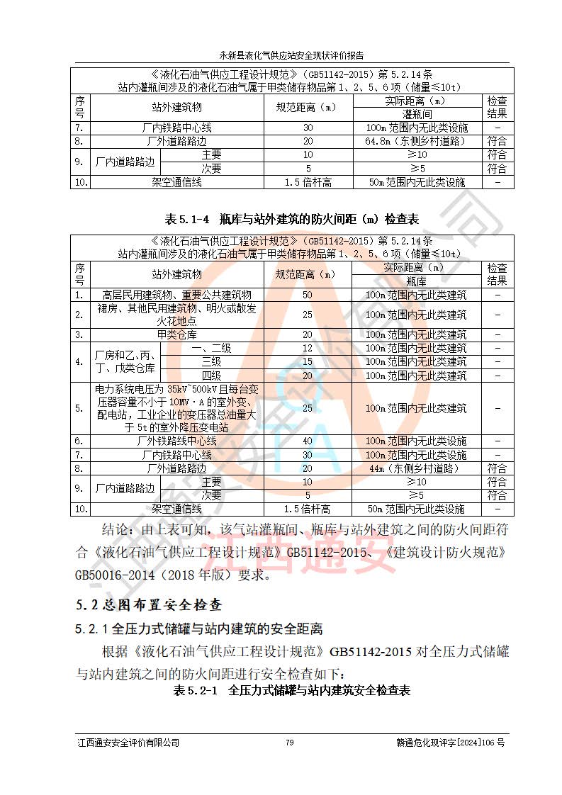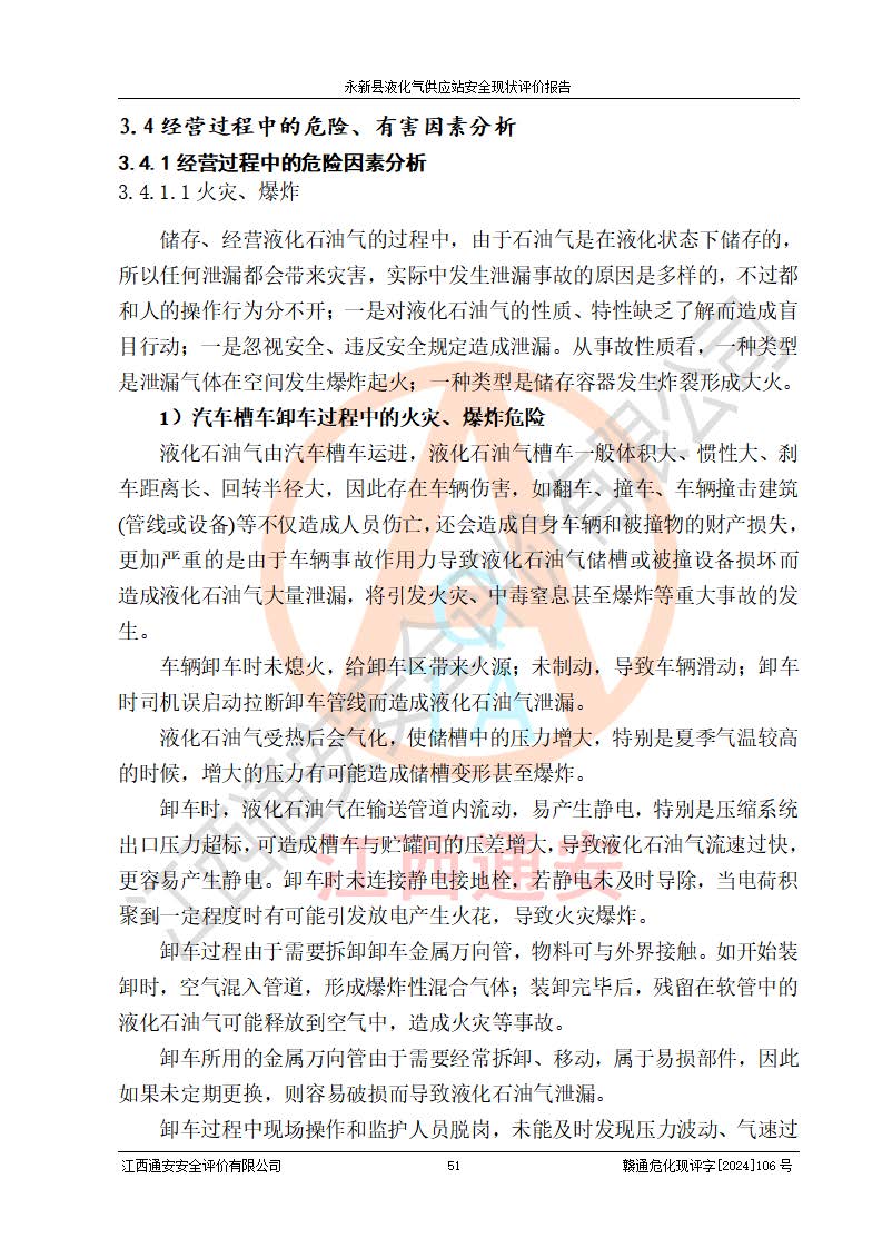 項目簡介 | 永新縣液化氣供應站(以下簡稱“氣站”)位于江西省吉安市永新縣才豐鄉(xiāng)聯(lián)合村,是一家從事液化石油氣儲存、經(jīng)營的企業(yè),成立于1995年11月1日,法人**:吳吟軒,企業(yè)類型:集體所有制。 該站2022年3月26日換得永新縣住房和城鄉(xiāng)建設(shè)局頒發(fā)的燃氣經(jīng)營許可證,許可證編號:贛201307110003P,**期至2025年3月26日,經(jīng)營類別:瓶裝燃氣。 該站2021年5月23日換得吉安市市場監(jiān)督管理局頒發(fā)的氣瓶充裝許可證,編號:TS4236D77-2025,獲準從事液化石油汽氣瓶充裝,**期至2025年5月22日。 該氣站設(shè)有容積為50m3的地上臥式液化石油氣儲罐3臺、容積為30m3的地上臥式液化石油氣儲罐1臺和容積為10m3的地上臥式液化石油氣殘液罐1臺。根據(jù)《液化石油氣供應工程設(shè)計規(guī)范》GB51142-2015對液化石油氣供應站等級劃分,該站屬于六級液化石油氣供應站。 經(jīng)辨識,該氣站涉及的液化石油氣、柴油屬于危險化學品。項目涉及的液化石油氣屬于重點監(jiān)管危險化學品。氣站涉及的液化石油氣屬于特別管控危險化學品。永新縣液化氣供應站儲罐區(qū)構(gòu)成四級危險化學品重大危險源,其它生產(chǎn)、儲存單元未構(gòu)成危險化學品重大危險源。 經(jīng)辨識,該項目不涉及重點監(jiān)管的危險化工工藝。 經(jīng)辨識,該在役生產(chǎn)裝置各生產(chǎn)、儲存單元均未構(gòu)成危險化學品重大危險源。 | |||