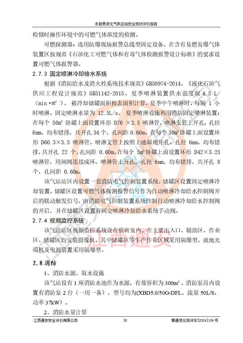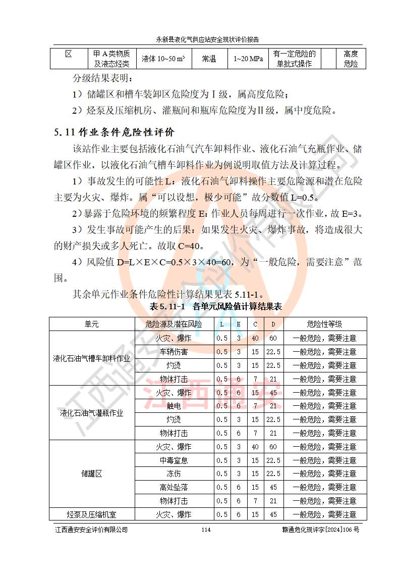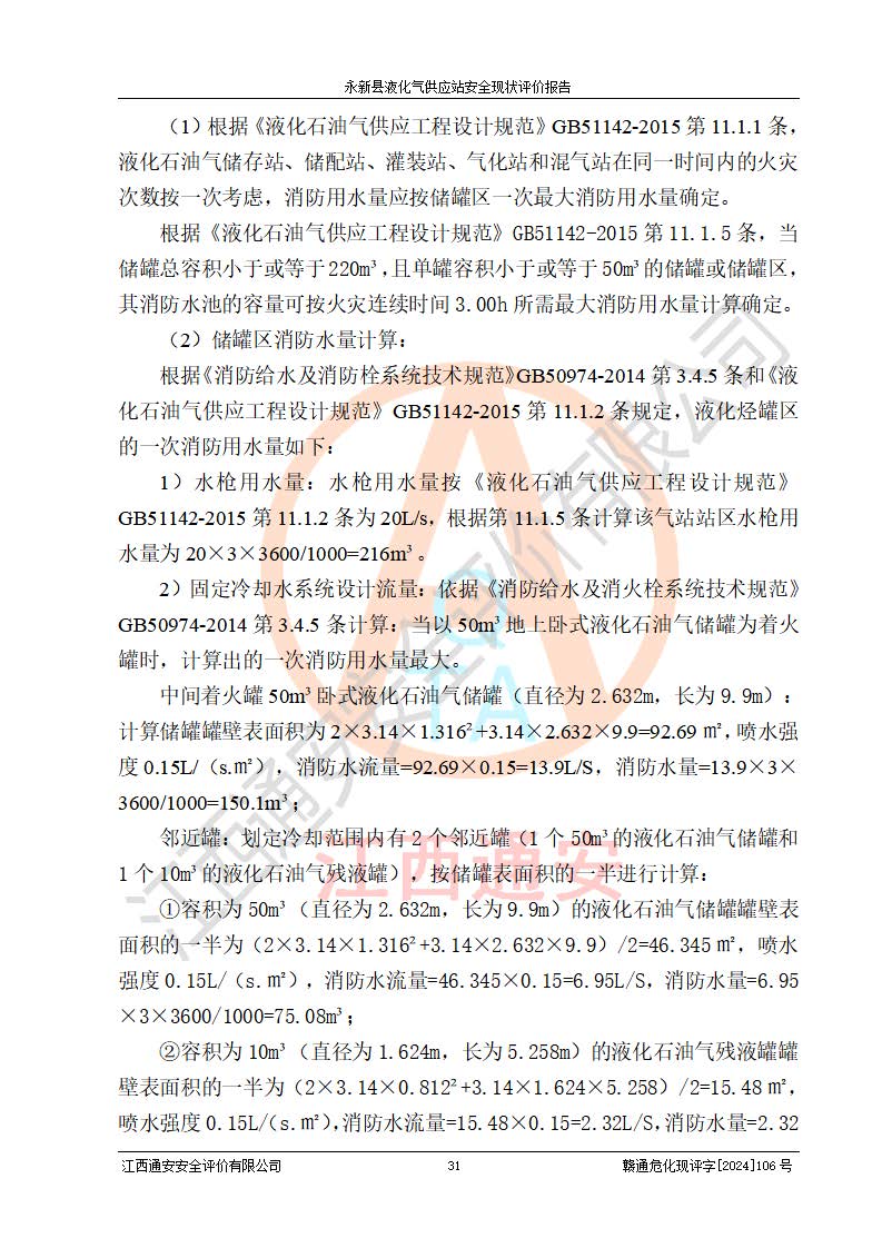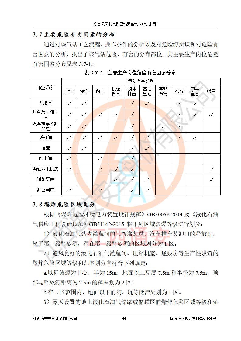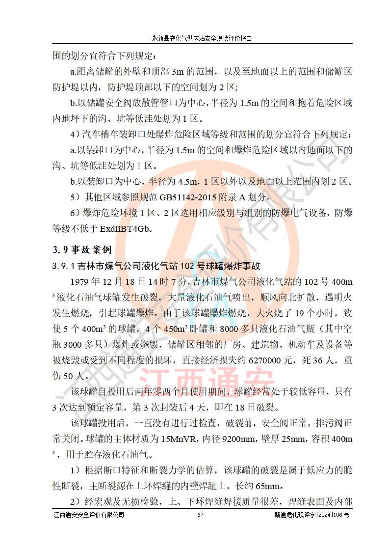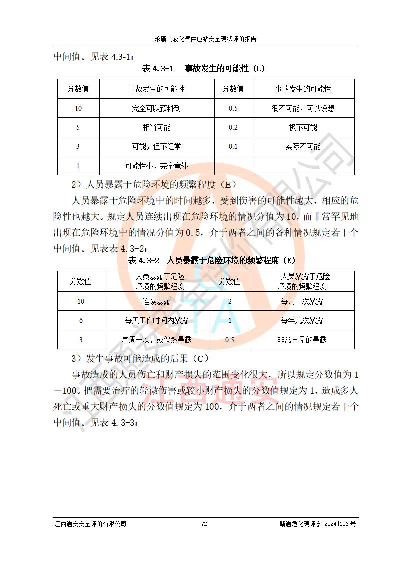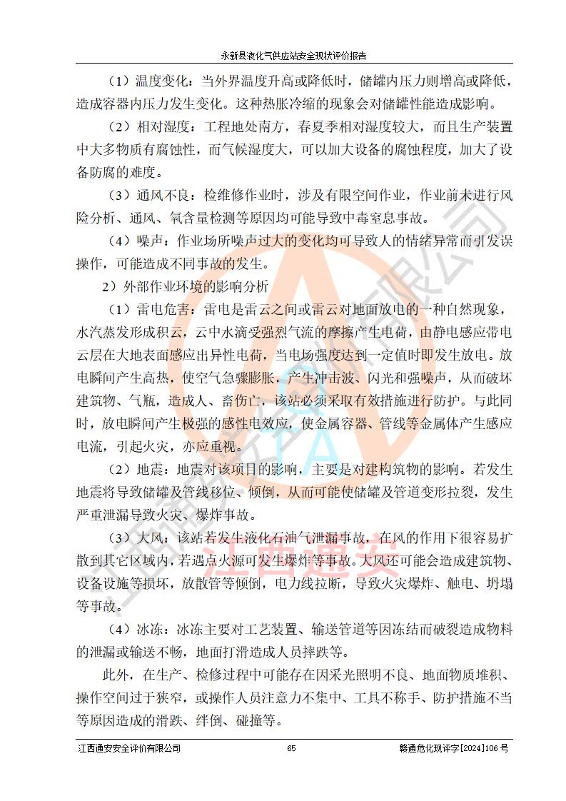 項目簡介 | 永新縣液化氣供應站(以下簡稱“氣站”)位于江西省吉安市永新縣才豐鄉(xiāng)聯(lián)合村,是一家從事液化石油氣儲存、經(jīng)營的企業(yè),成立于1995年11月1日,法人**:吳吟軒,企業(yè)類型:集體所有制。 該站2022年3月26日換得永新縣住房和城鄉(xiāng)建設(shè)局頒發(fā)的燃氣經(jīng)營許可證,許可證編號:贛201307110003P,**期至2025年3月26日,經(jīng)營類別:瓶裝燃氣。 該站2021年5月23日換得吉安市市場監(jiān)督管理局頒發(fā)的氣瓶充裝許可證,編號:TS4236D77-2025,獲準從事液化石油汽氣瓶充裝,**期至2025年5月22日。 該氣站設(shè)有容積為50m3的地上臥式液化石油氣儲罐3臺、容積為30m3的地上臥式液化石油氣儲罐1臺和容積為10m3的地上臥式液化石油氣殘液罐1臺。根據(jù)《液化石油氣供應工程設(shè)計規(guī)范》GB51142-2015對液化石油氣供應站等級劃分,該站屬于六級液化石油氣供應站。 經(jīng)辨識,該氣站涉及的液化石油氣、柴油屬于危險化學品。項目涉及的液化石油氣屬于重點監(jiān)管危險化學品。氣站涉及的液化石油氣屬于特別管控危險化學品。永新縣液化氣供應站儲罐區(qū)構(gòu)成四級危險化學品重大危險源,其它生產(chǎn)、儲存單元未構(gòu)成危險化學品重大危險源。 經(jīng)辨識,該項目不涉及重點監(jiān)管的危險化工工藝。 經(jīng)辨識,該在役生產(chǎn)裝置各生產(chǎn)、儲存單元均未構(gòu)成危險化學品重大危險源。 | |||