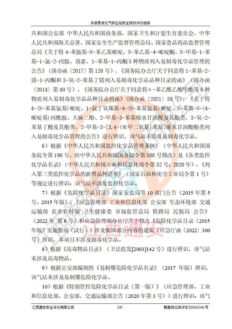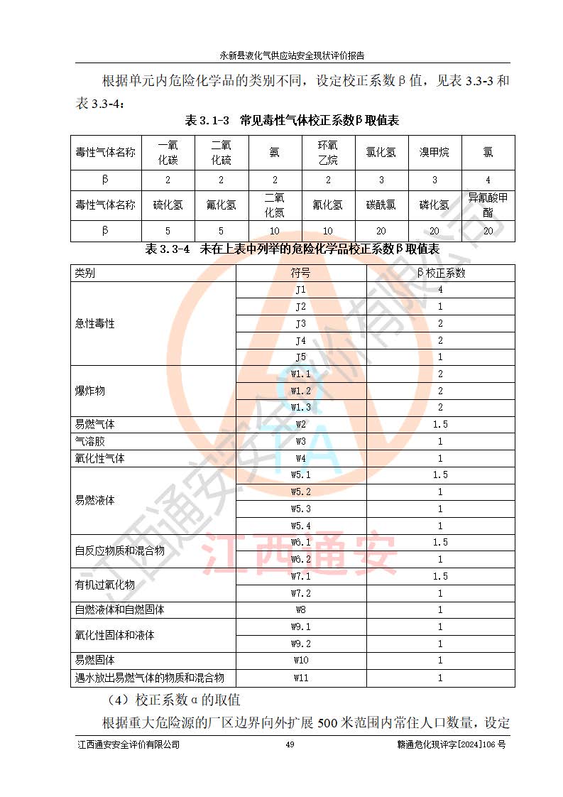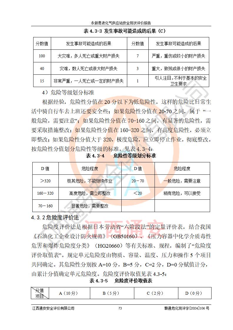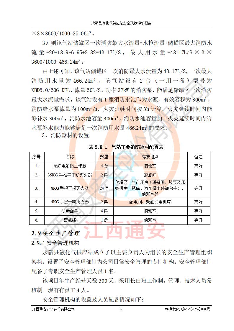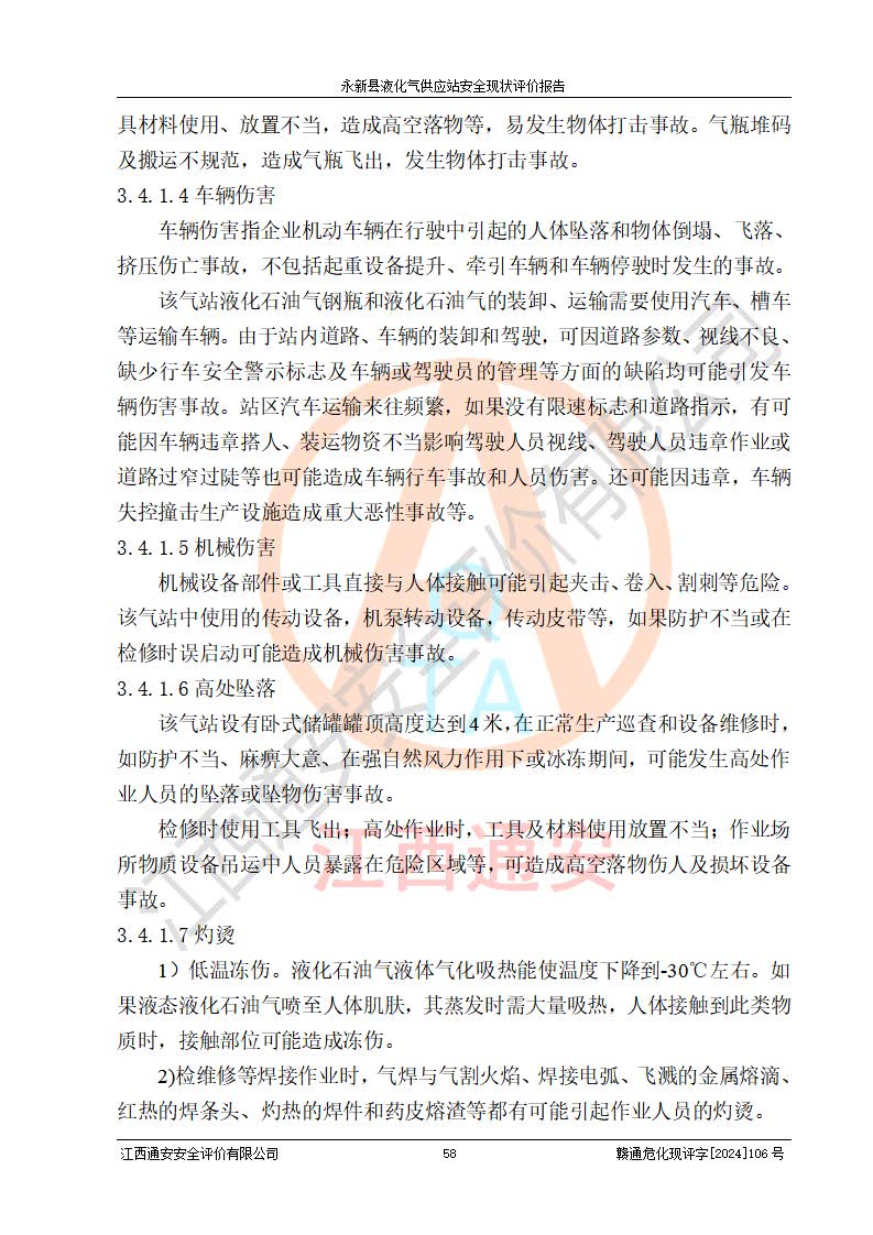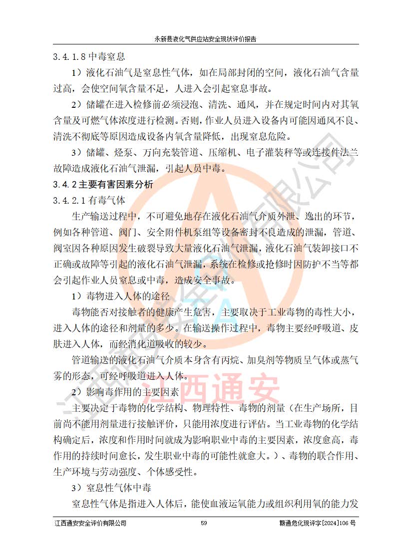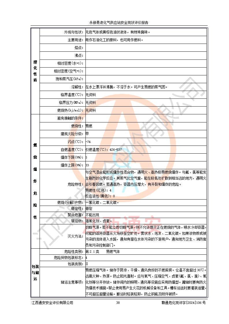 項目簡介 | 永新縣液化氣供應站(以下簡稱“氣站”)位于江西省吉安市永新縣才豐鄉(xiāng)聯(lián)合村,是一家從事液化石油氣儲存、經(jīng)營的企業(yè),成立于1995年11月1日,法人**:吳吟軒,企業(yè)類型:集體所有制。 該站2022年3月26日換得永新縣住房和城鄉(xiāng)建設(shè)局頒發(fā)的燃氣經(jīng)營許可證,許可證編號:贛201307110003P,**期至2025年3月26日,經(jīng)營類別:瓶裝燃氣。 該站2021年5月23日換得吉安市市場監(jiān)督管理局頒發(fā)的氣瓶充裝許可證,編號:TS4236D77-2025,獲準從事液化石油汽氣瓶充裝,**期至2025年5月22日。 該氣站設(shè)有容積為50m3的地上臥式液化石油氣儲罐3臺、容積為30m3的地上臥式液化石油氣儲罐1臺和容積為10m3的地上臥式液化石油氣殘液罐1臺。根據(jù)《液化石油氣供應工程設(shè)計規(guī)范》GB51142-2015對液化石油氣供應站等級劃分,該站屬于六級液化石油氣供應站。 經(jīng)辨識,該氣站涉及的液化石油氣、柴油屬于危險化學品。項目涉及的液化石油氣屬于重點監(jiān)管危險化學品。氣站涉及的液化石油氣屬于特別管控危險化學品。永新縣液化氣供應站儲罐區(qū)構(gòu)成四級危險化學品重大危險源,其它生產(chǎn)、儲存單元未構(gòu)成危險化學品重大危險源。 經(jīng)辨識,該項目不涉及重點監(jiān)管的危險化工工藝。 經(jīng)辨識,該在役生產(chǎn)裝置各生產(chǎn)、儲存單元均未構(gòu)成危險化學品重大危險源。 | |||