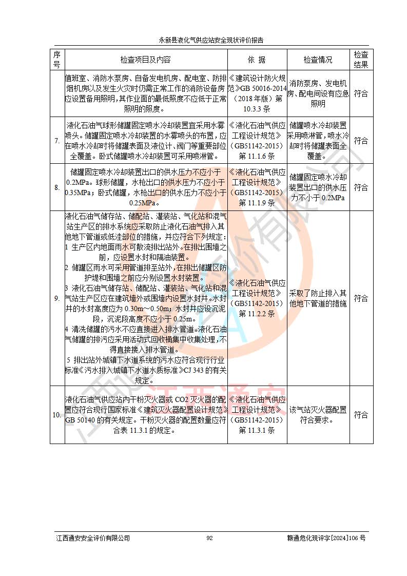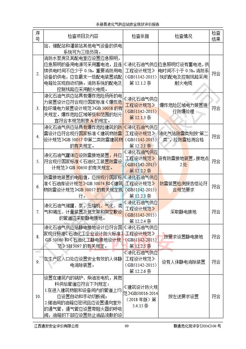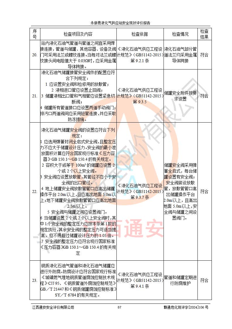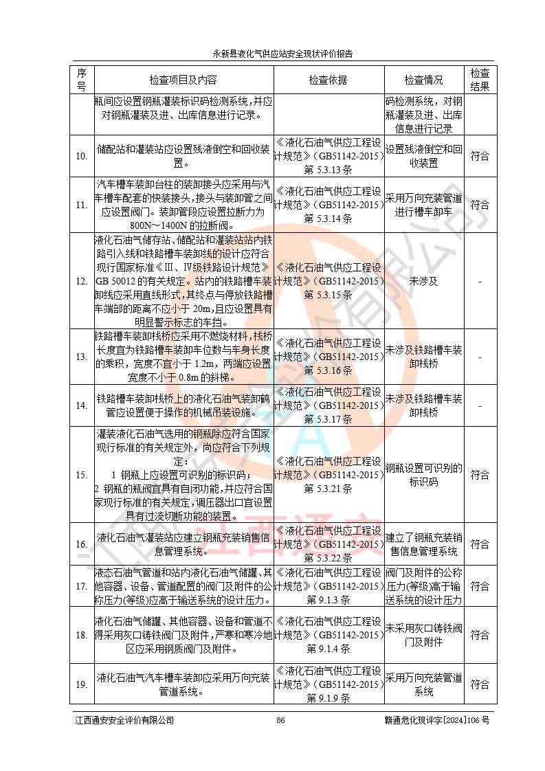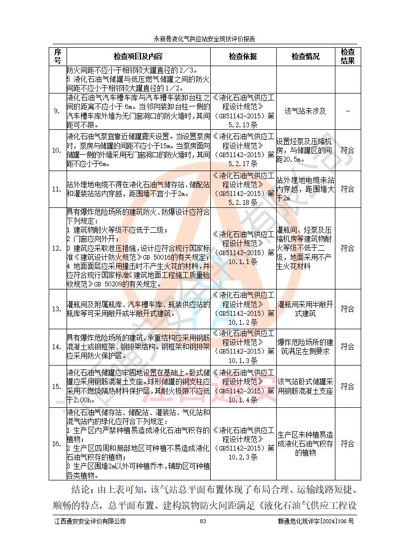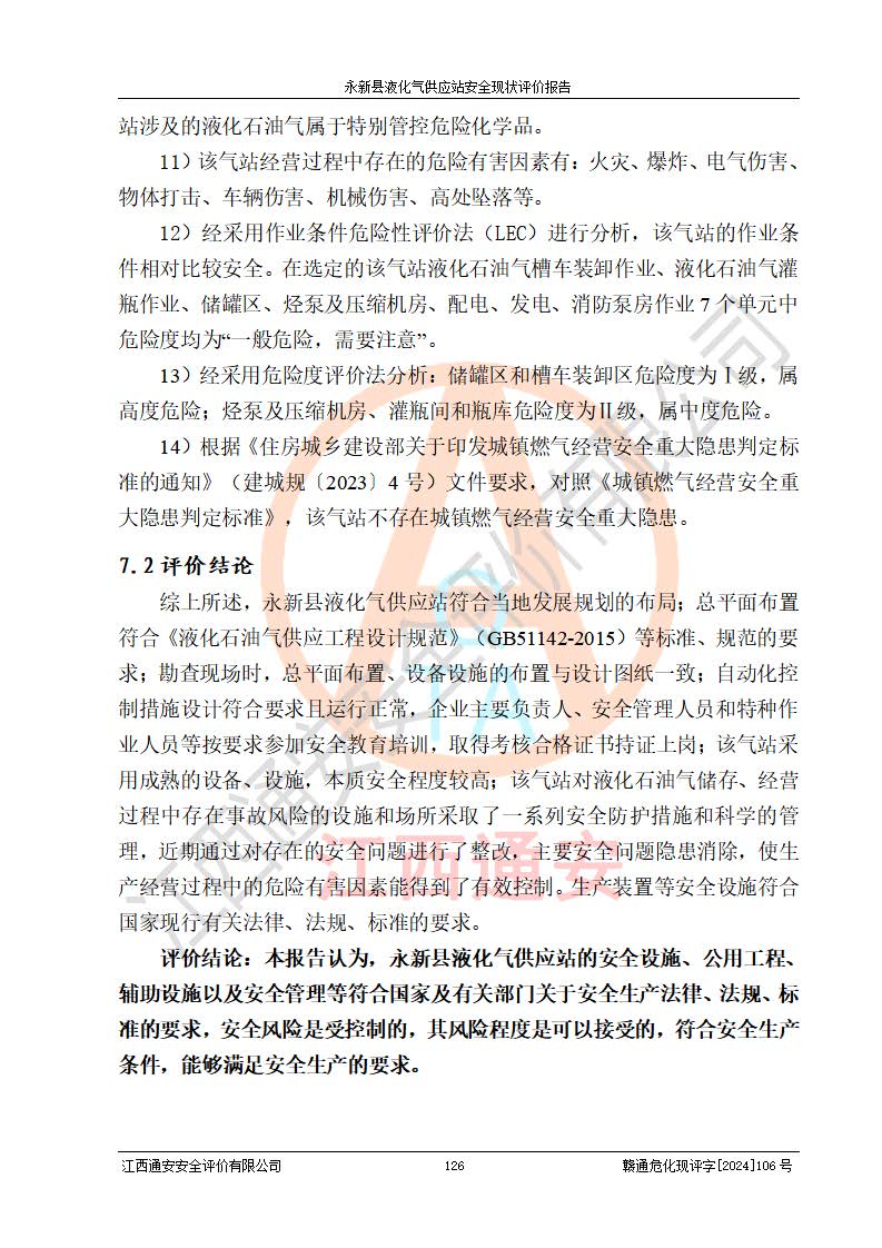 評價結(jié)論 | 本報告認為,永新縣液化氣供應站的安全設(shè)施、公用工程、輔助設(shè)施以及安全管理等符合**及有關(guān)部門關(guān)于安全生產(chǎn)法律、法規(guī)、標準的要求,安全風險是受控制的,其風險程度是可以接受的,符合安全生產(chǎn)條件,能夠滿足安全生產(chǎn)的要求。 | |||