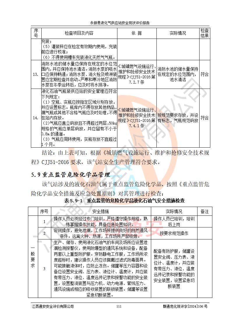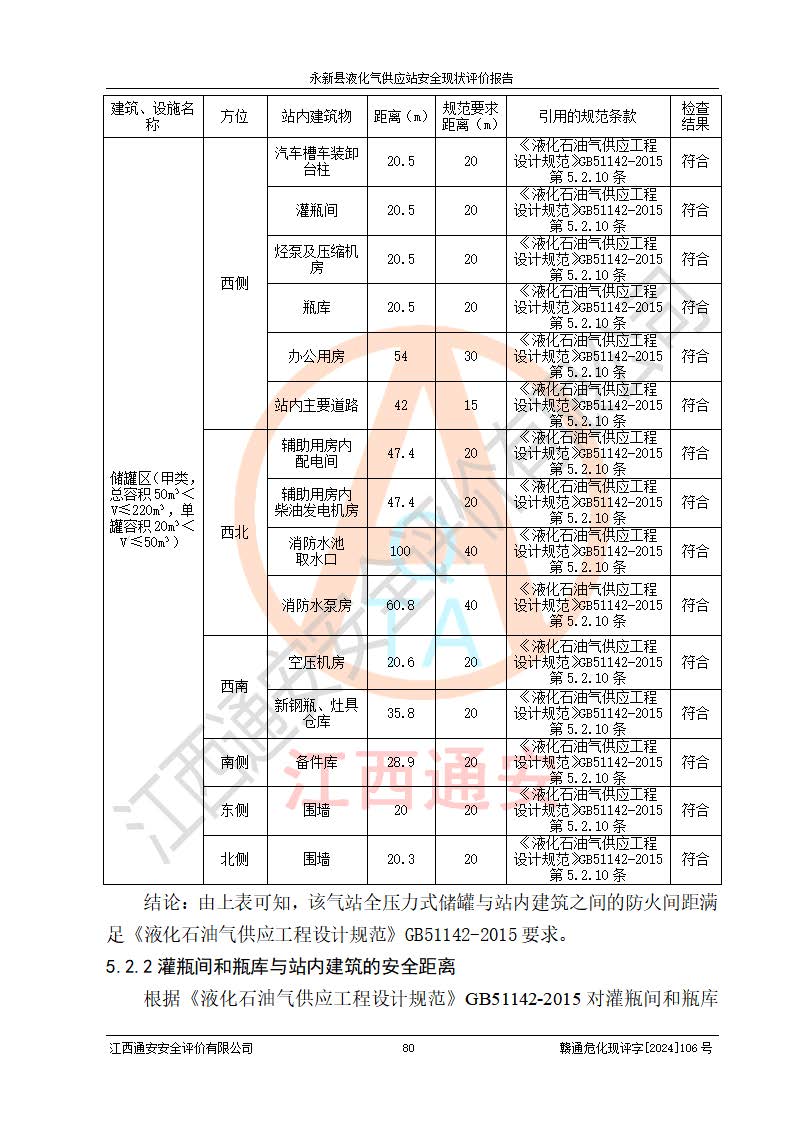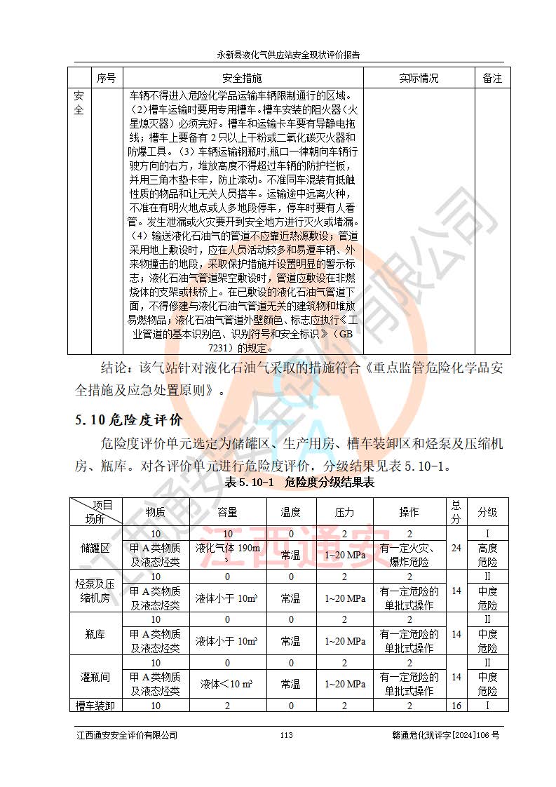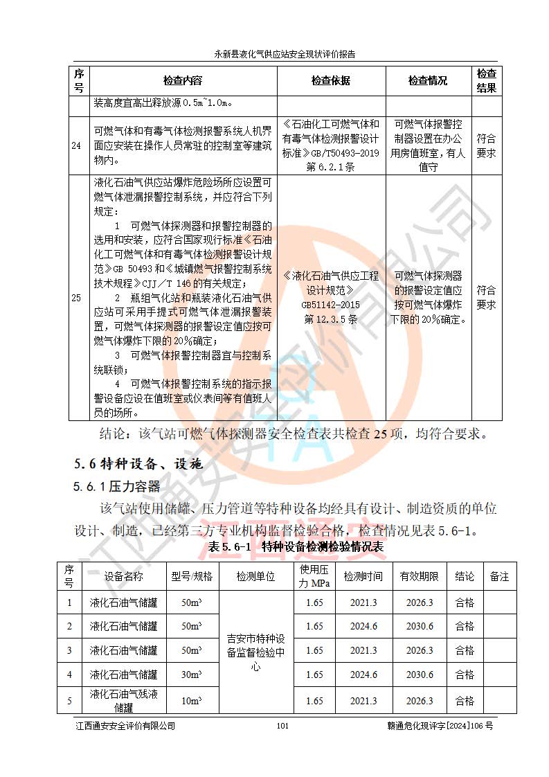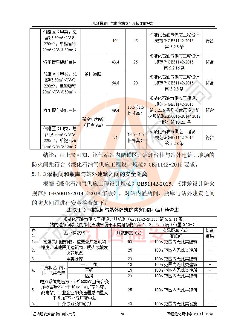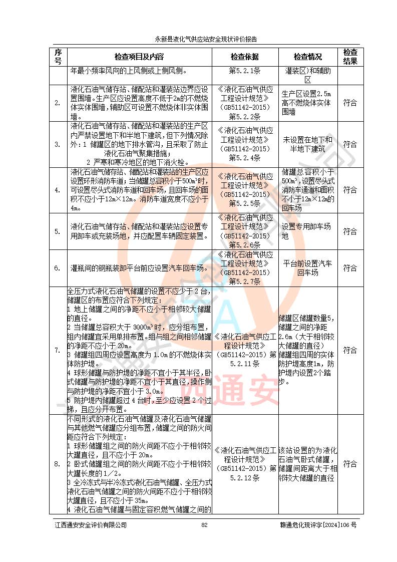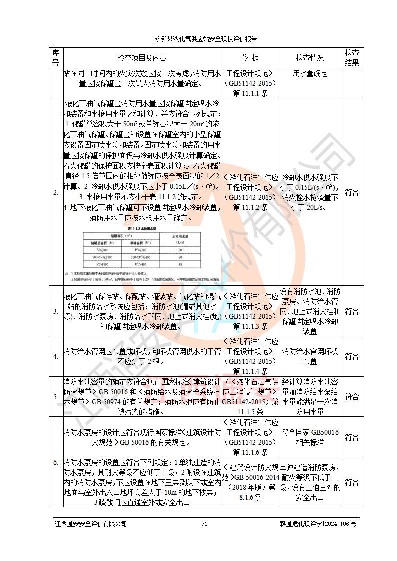 評價結(jié)論 | 本報告認為,永新縣液化氣供應站的安全設(shè)施、公用工程、輔助設(shè)施以及安全管理等符合**及有關(guān)部門關(guān)于安全生產(chǎn)法律、法規(guī)、標準的要求,安全風險是受控制的,其風險程度是可以接受的,符合安全生產(chǎn)條件,能夠滿足安全生產(chǎn)的要求。 | |||