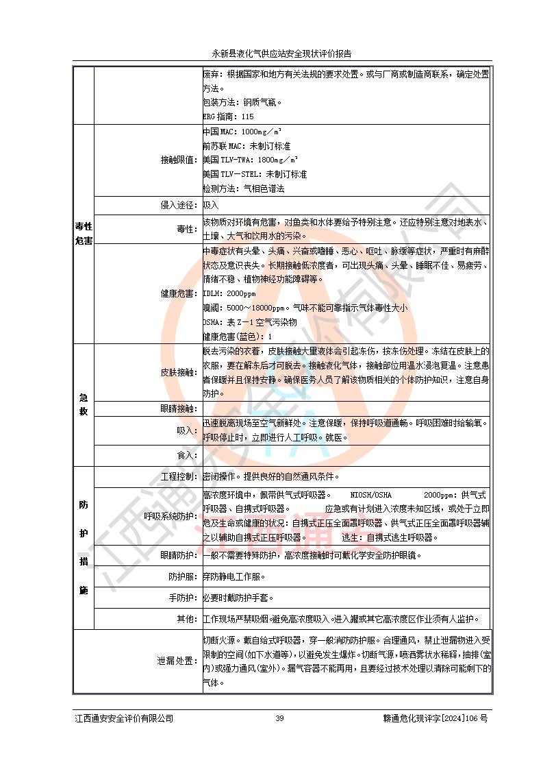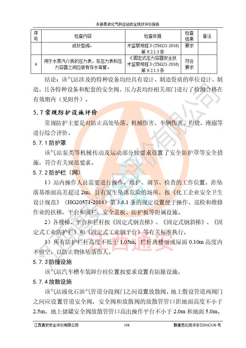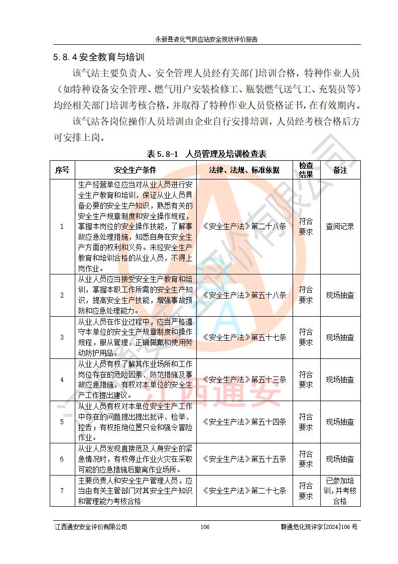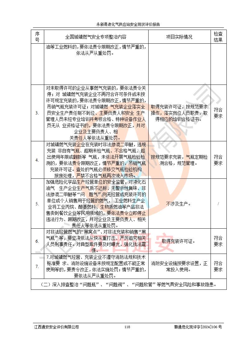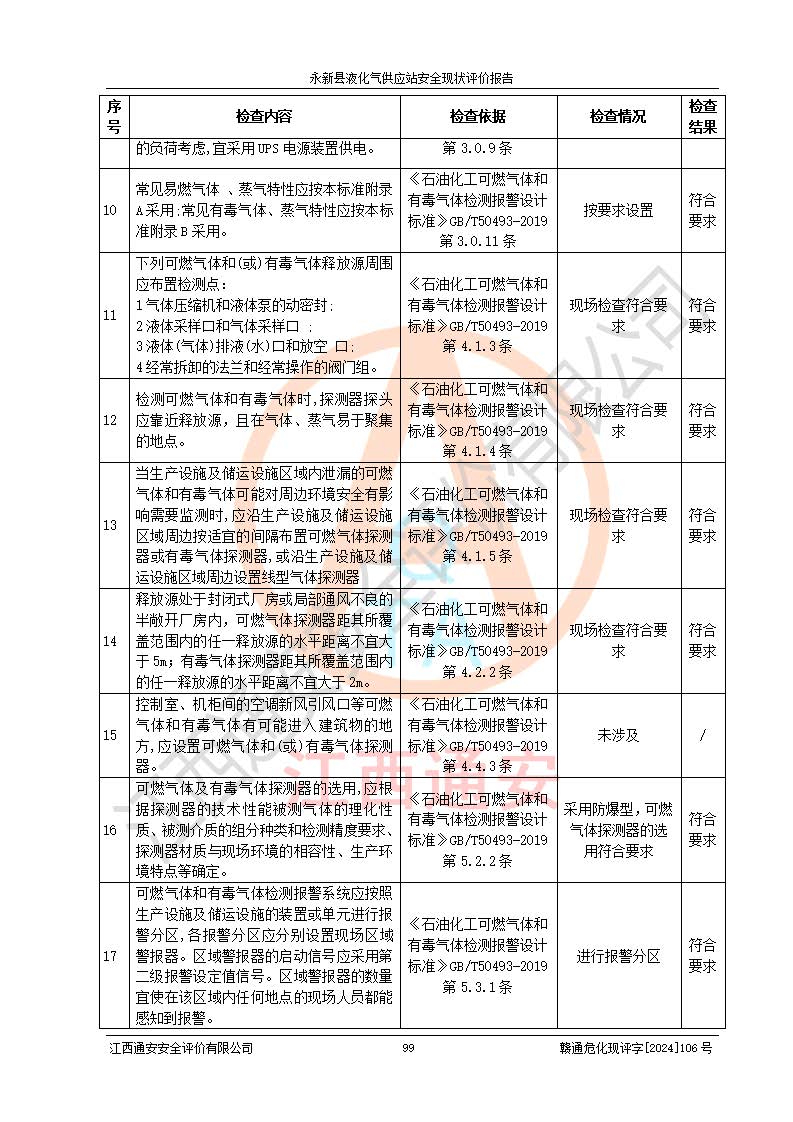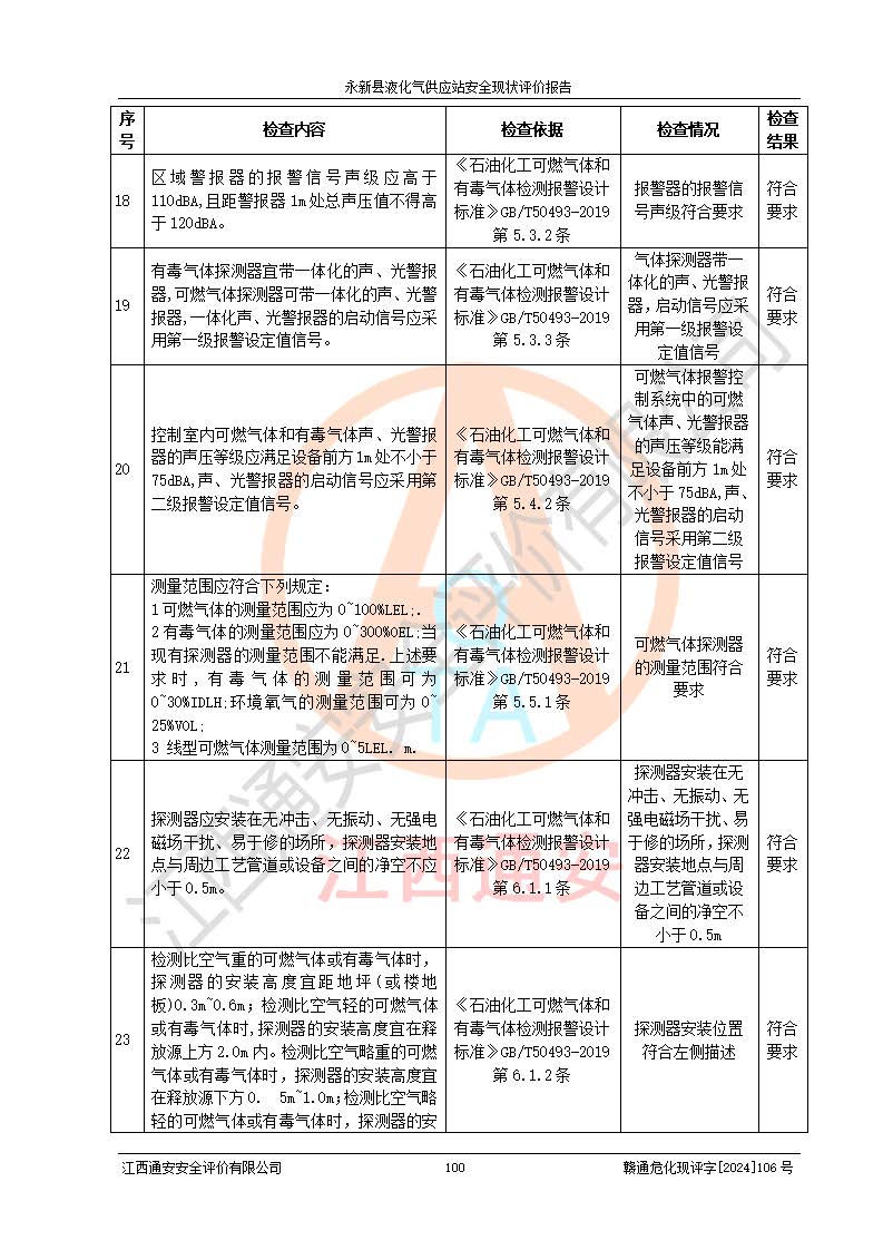 評價結(jié)論 | 本報告認為,永新縣液化氣供應站的安全設(shè)施、公用工程、輔助設(shè)施以及安全管理等符合**及有關(guān)部門關(guān)于安全生產(chǎn)法律、法規(guī)、標準的要求,安全風險是受控制的,其風險程度是可以接受的,符合安全生產(chǎn)條件,能夠滿足安全生產(chǎn)的要求。 | |||