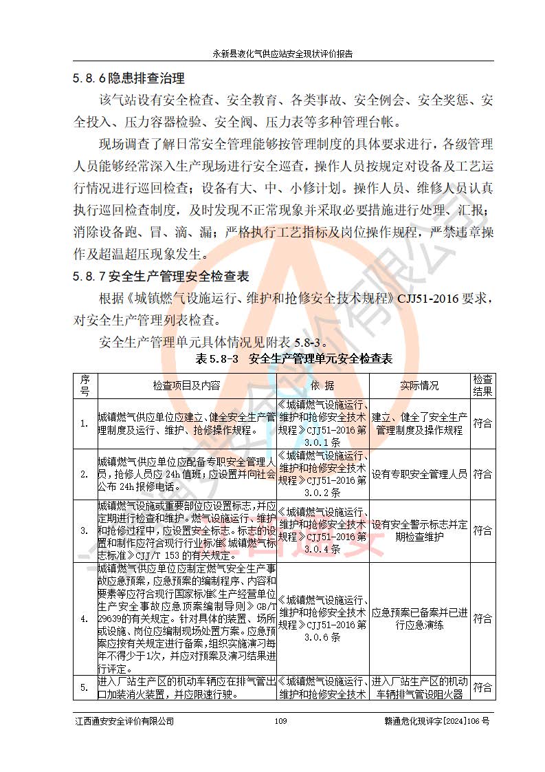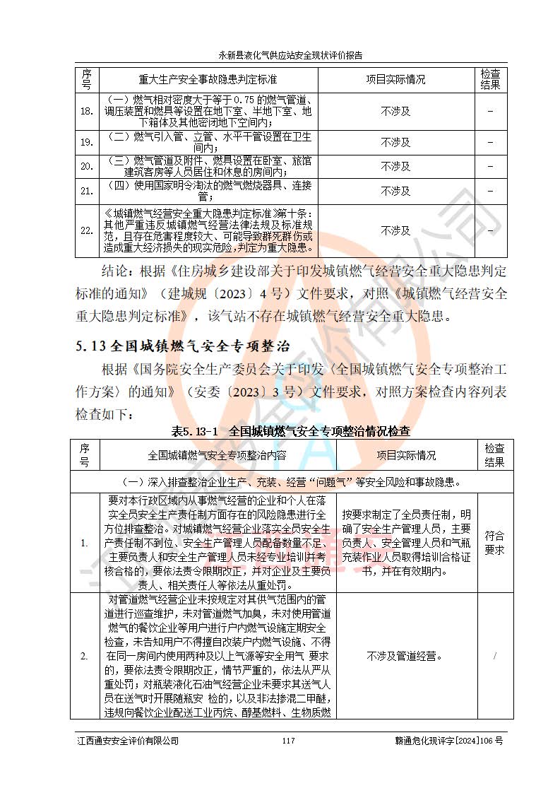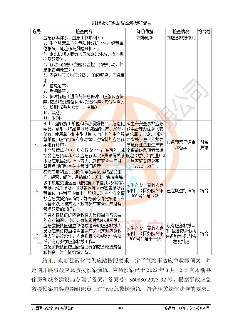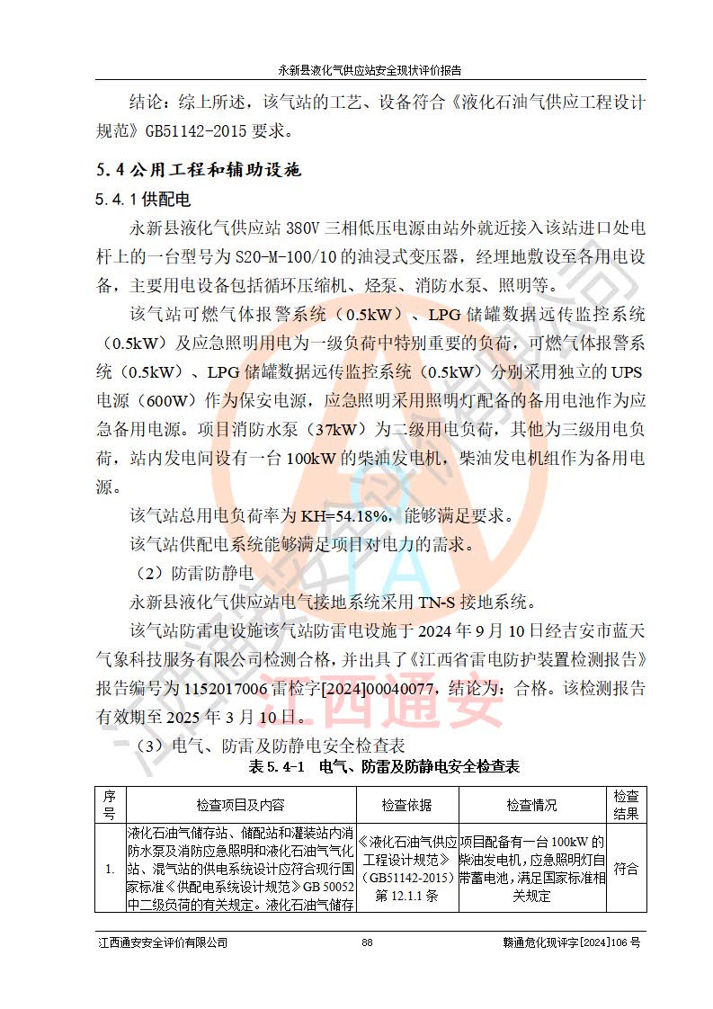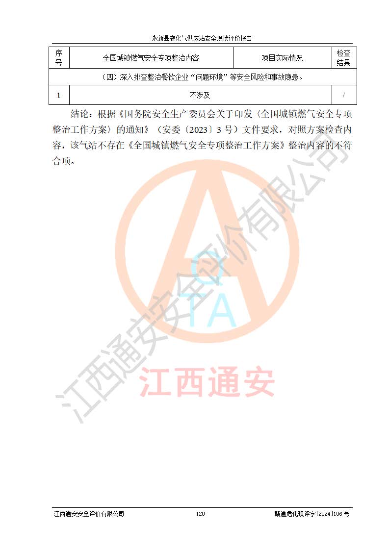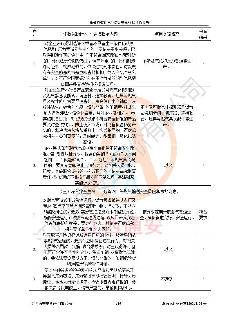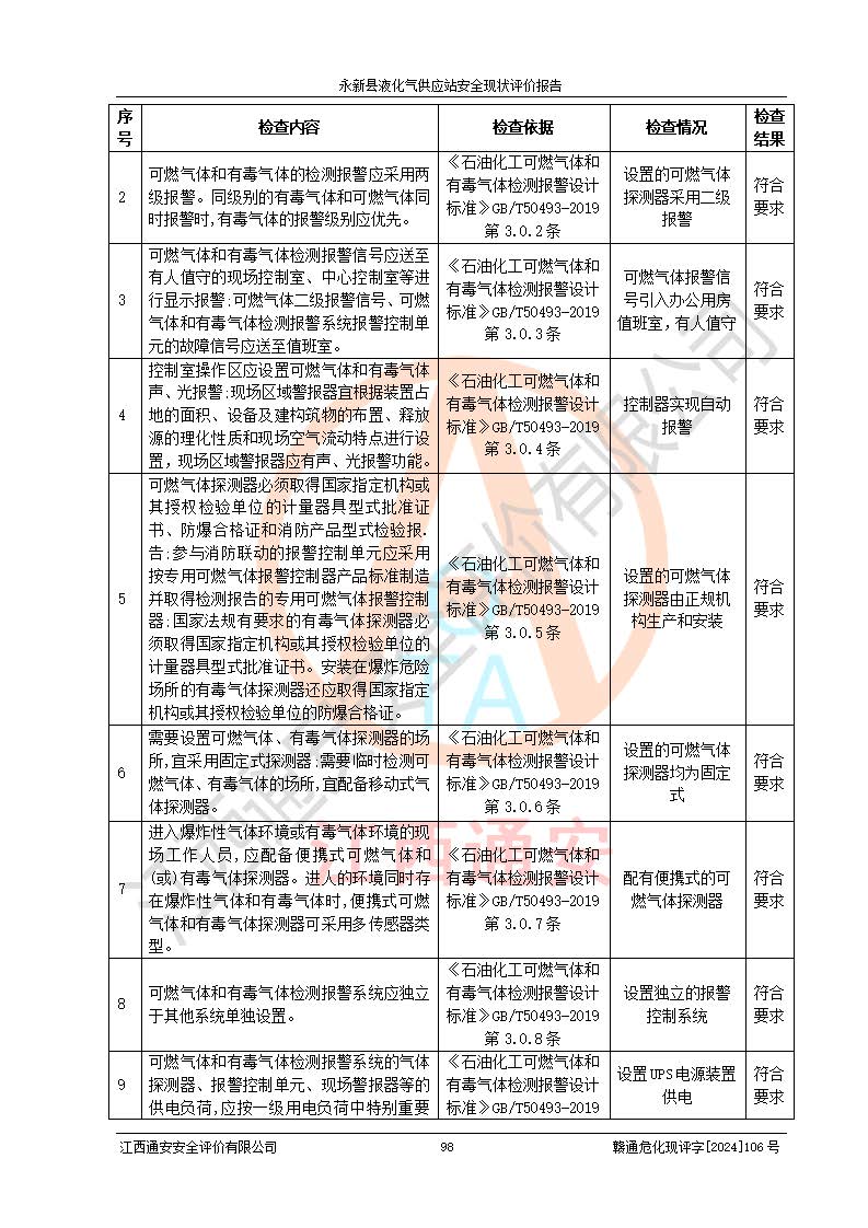 評價結(jié)論 | 本報告認為,永新縣液化氣供應站的安全設(shè)施、公用工程、輔助設(shè)施以及安全管理等符合**及有關(guān)部門關(guān)于安全生產(chǎn)法律、法規(guī)、標準的要求,安全風險是受控制的,其風險程度是可以接受的,符合安全生產(chǎn)條件,能夠滿足安全生產(chǎn)的要求。 | |||