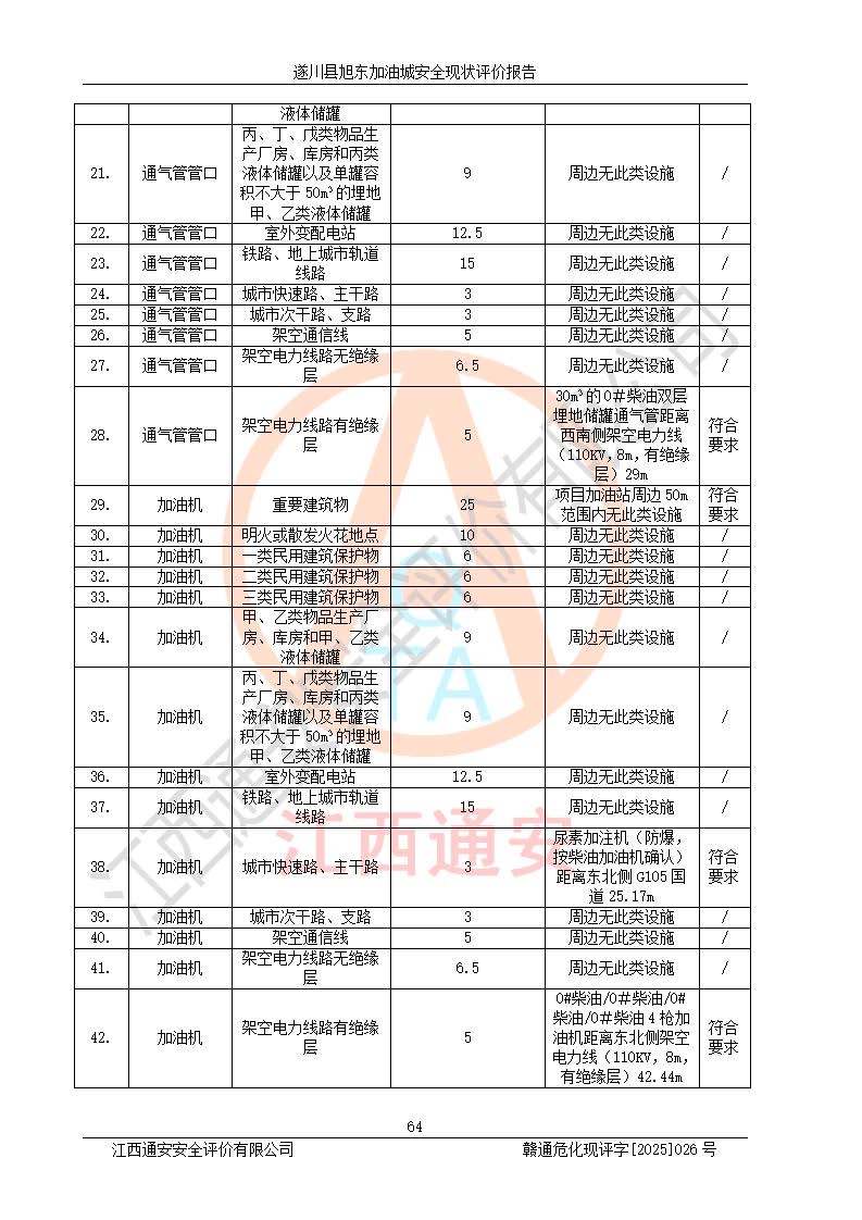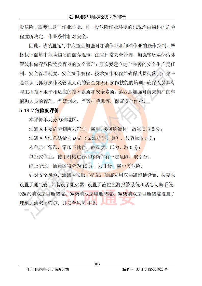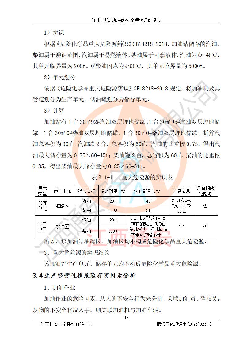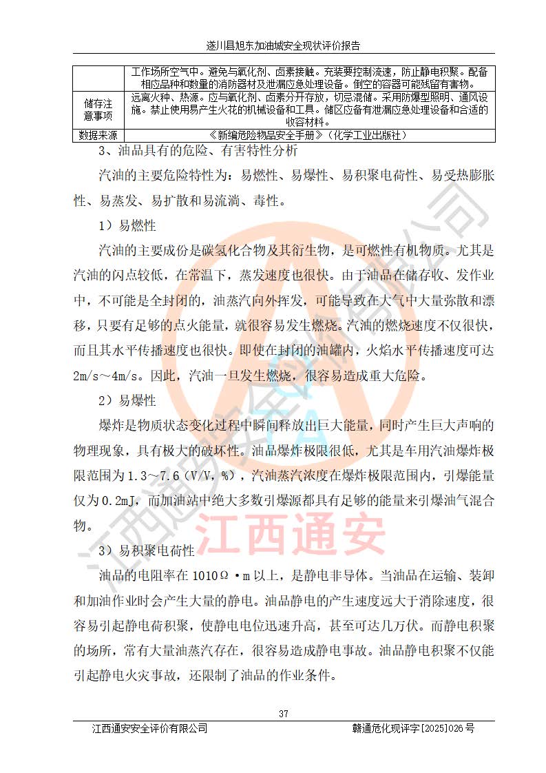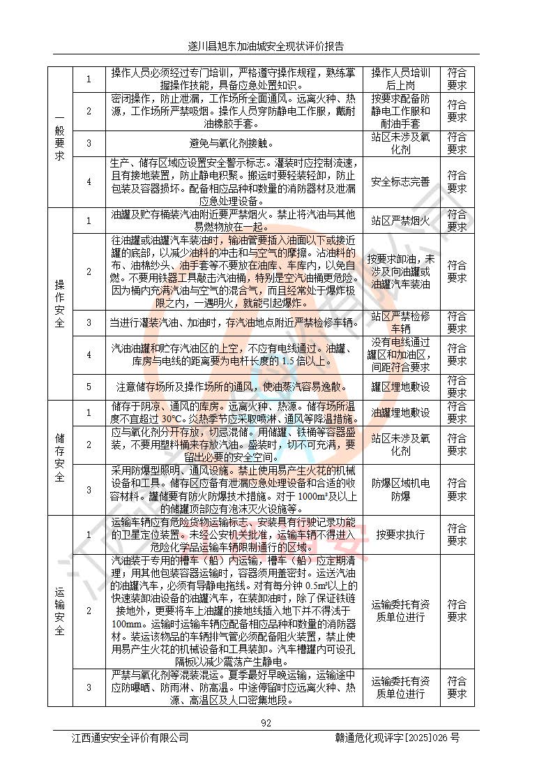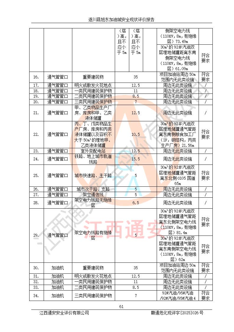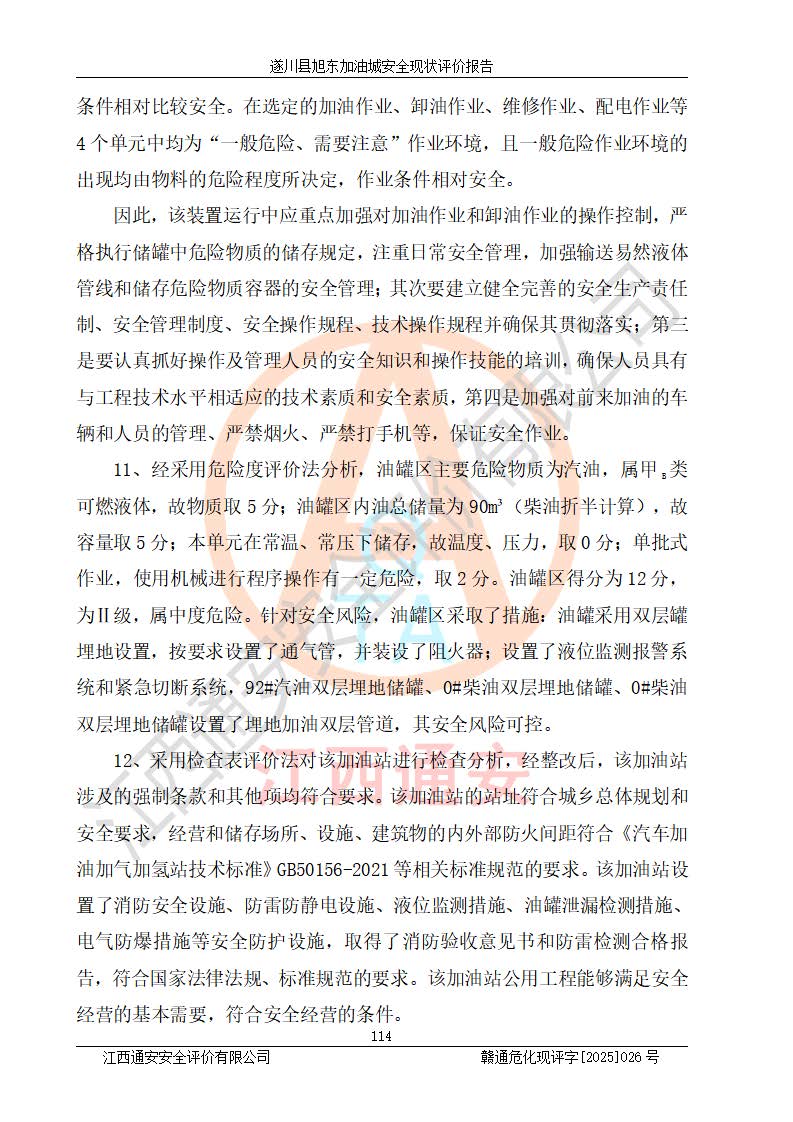 其它 | 在對(duì)該項(xiàng)目危險(xiǎn)、有害因素辨識(shí)分析的基礎(chǔ)上,運(yùn)用安全檢查表、預(yù)作業(yè)條件危險(xiǎn)性分析法、危險(xiǎn)度評(píng)價(jià)、重大事故后果分析結(jié)果等評(píng)價(jià)方法對(duì)該項(xiàng)目進(jìn)行了分析評(píng)價(jià),評(píng)價(jià)結(jié)果如下: 1、該項(xiàng)目位于江西省吉安市遂川縣于田鎮(zhèn)石下村云南坑,符合當(dāng)?shù)匾?guī)劃,與周邊環(huán)境的距離符合有關(guān)標(biāo)準(zhǔn)、規(guī)范的要求。 2、總圖布置分區(qū)明確,布局合理,各建構(gòu)筑物的防火間距滿足規(guī)范要求。 3、該項(xiàng)目無**明令淘汰的工藝,設(shè)備、設(shè)施與工藝條件、內(nèi)部介質(zhì)相適應(yīng),特種設(shè)備及設(shè)施較齊全,按規(guī)定設(shè)置防雷、防靜電接地,爆炸危險(xiǎn)環(huán)境加油機(jī)按要求采用防爆型,符合相關(guān)標(biāo)準(zhǔn)規(guī)范要求。 5、企業(yè)設(shè)置了安全生產(chǎn)管理機(jī)構(gòu),配備了專職安全生產(chǎn)管理人員,建立了安全生產(chǎn)責(zé)任制和安全生產(chǎn)管理制度,編制了崗位操作規(guī)程,編制了生產(chǎn)安全事故應(yīng)急預(yù)案,人員經(jīng)過相應(yīng)的培訓(xùn),企業(yè)的安全生產(chǎn)管理正常。 6、作業(yè)條件危險(xiǎn)性評(píng)價(jià)結(jié)果:在選定的評(píng)價(jià)單元中,作業(yè)危險(xiǎn)程度均為“一般危險(xiǎn),需要注意”,作業(yè)條件相對(duì)安全。 7、危險(xiǎn)度評(píng)價(jià)結(jié)果:汽油儲(chǔ)罐的危險(xiǎn)程度為中度危險(xiǎn)。油罐采用雙層罐埋地設(shè)置,按要求設(shè)置了通氣管,并裝設(shè)了阻火器;設(shè)置了液位監(jiān)測(cè)報(bào)警系統(tǒng)和緊急切斷系統(tǒng),92#汽油雙層埋地儲(chǔ)罐、0#柴油雙層埋地儲(chǔ)罐、0#柴油雙層埋地儲(chǔ)罐設(shè)置了埋地加油雙層管道,可以滿足安全生產(chǎn)條件要求。 評(píng)價(jià)結(jié)論: 遂川縣旭東加油城符合《汽車加油加氣加氫站技術(shù)標(biāo)準(zhǔn)》GB50156-2021等標(biāo)準(zhǔn)規(guī)范的要求,安全風(fēng)險(xiǎn)可控,滿足危險(xiǎn)化學(xué)品經(jīng)營(yíng)的安全條件。 | ||||