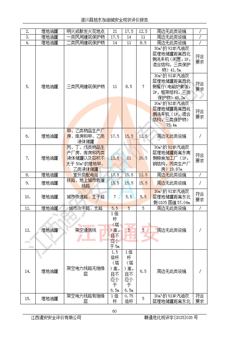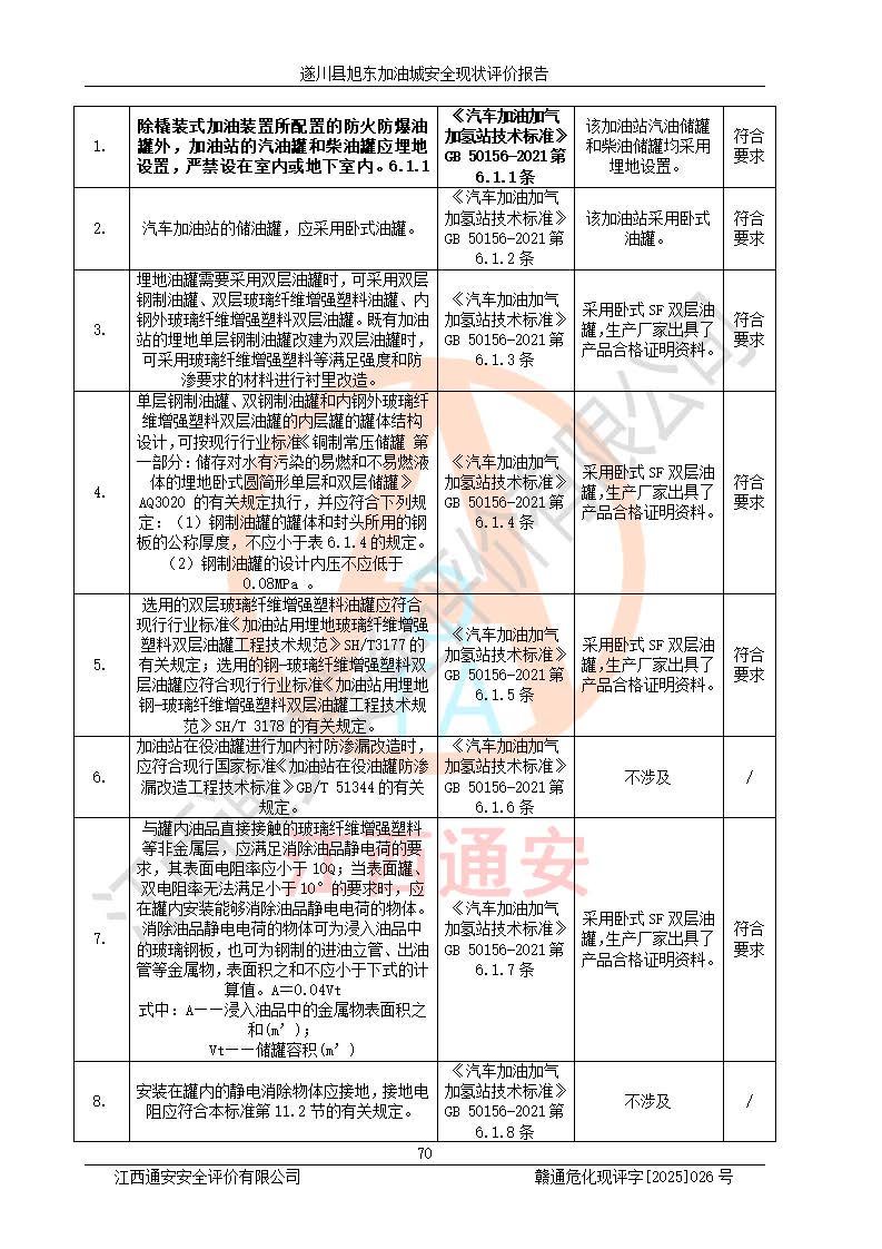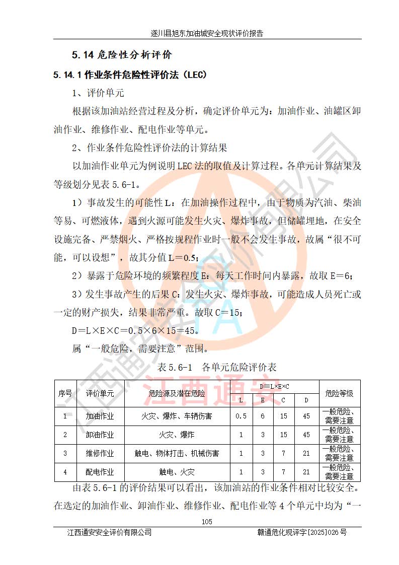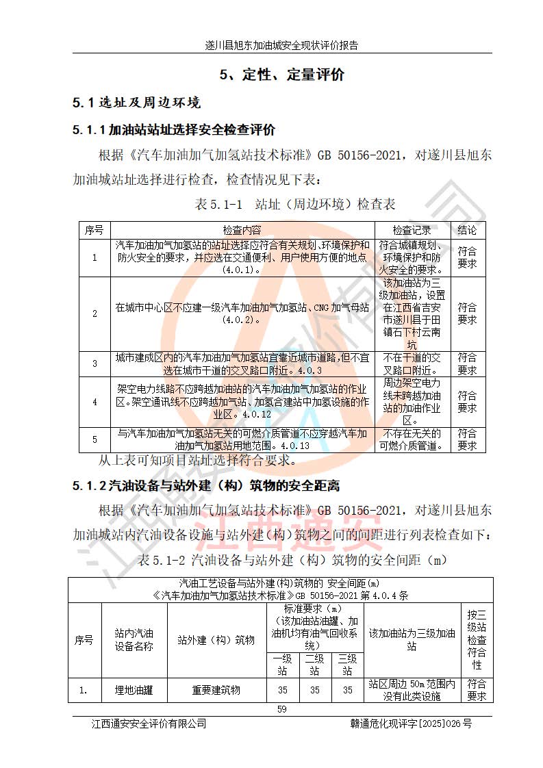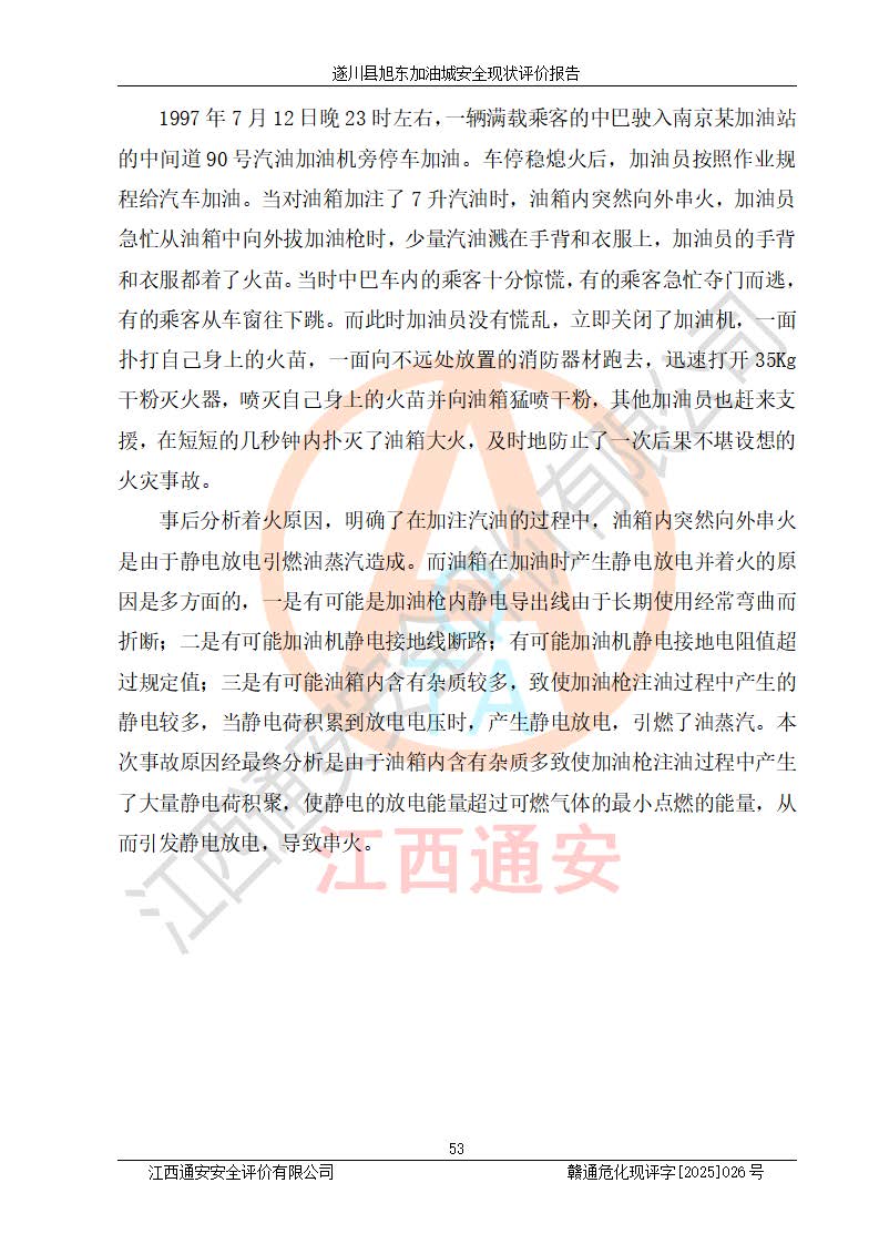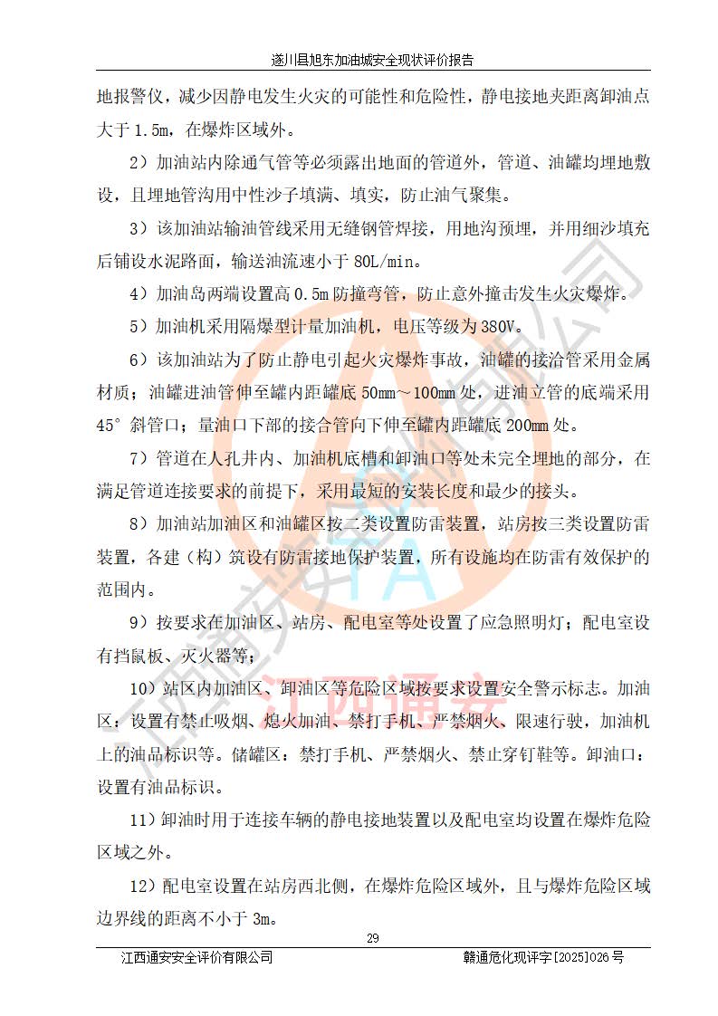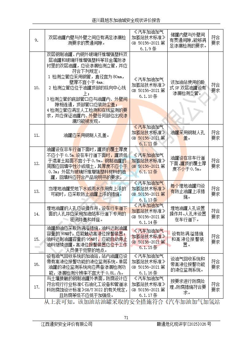 其它 | 在對(duì)該項(xiàng)目危險(xiǎn)、有害因素辨識(shí)分析的基礎(chǔ)上,運(yùn)用安全檢查表、預(yù)作業(yè)條件危險(xiǎn)性分析法、危險(xiǎn)度評(píng)價(jià)、重大事故后果分析結(jié)果等評(píng)價(jià)方法對(duì)該項(xiàng)目進(jìn)行了分析評(píng)價(jià),評(píng)價(jià)結(jié)果如下: 1、該項(xiàng)目位于江西省吉安市遂川縣于田鎮(zhèn)石下村云南坑,符合當(dāng)?shù)匾?guī)劃,與周邊環(huán)境的距離符合有關(guān)標(biāo)準(zhǔn)、規(guī)范的要求。 2、總圖布置分區(qū)明確,布局合理,各建構(gòu)筑物的防火間距滿足規(guī)范要求。 3、該項(xiàng)目無**明令淘汰的工藝,設(shè)備、設(shè)施與工藝條件、內(nèi)部介質(zhì)相適應(yīng),特種設(shè)備及設(shè)施較齊全,按規(guī)定設(shè)置防雷、防靜電接地,爆炸危險(xiǎn)環(huán)境加油機(jī)按要求采用防爆型,符合相關(guān)標(biāo)準(zhǔn)規(guī)范要求。 5、企業(yè)設(shè)置了安全生產(chǎn)管理機(jī)構(gòu),配備了專職安全生產(chǎn)管理人員,建立了安全生產(chǎn)責(zé)任制和安全生產(chǎn)管理制度,編制了崗位操作規(guī)程,編制了生產(chǎn)安全事故應(yīng)急預(yù)案,人員經(jīng)過相應(yīng)的培訓(xùn),企業(yè)的安全生產(chǎn)管理正常。 6、作業(yè)條件危險(xiǎn)性評(píng)價(jià)結(jié)果:在選定的評(píng)價(jià)單元中,作業(yè)危險(xiǎn)程度均為“一般危險(xiǎn),需要注意”,作業(yè)條件相對(duì)安全。 7、危險(xiǎn)度評(píng)價(jià)結(jié)果:汽油儲(chǔ)罐的危險(xiǎn)程度為中度危險(xiǎn)。油罐采用雙層罐埋地設(shè)置,按要求設(shè)置了通氣管,并裝設(shè)了阻火器;設(shè)置了液位監(jiān)測(cè)報(bào)警系統(tǒng)和緊急切斷系統(tǒng),92#汽油雙層埋地儲(chǔ)罐、0#柴油雙層埋地儲(chǔ)罐、0#柴油雙層埋地儲(chǔ)罐設(shè)置了埋地加油雙層管道,可以滿足安全生產(chǎn)條件要求。 評(píng)價(jià)結(jié)論: 遂川縣旭東加油城符合《汽車加油加氣加氫站技術(shù)標(biāo)準(zhǔn)》GB50156-2021等標(biāo)準(zhǔn)規(guī)范的要求,安全風(fēng)險(xiǎn)可控,滿足危險(xiǎn)化學(xué)品經(jīng)營(yíng)的安全條件。 | ||||