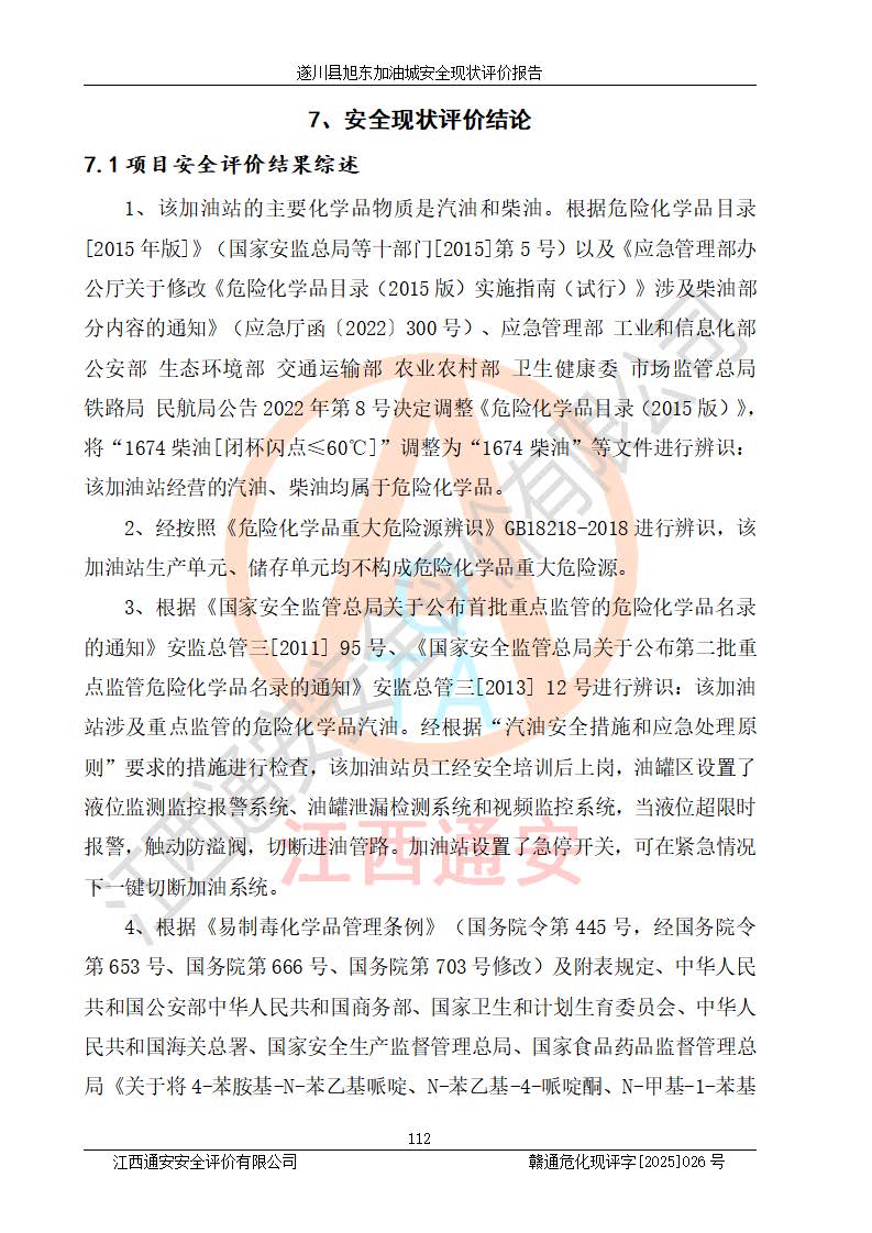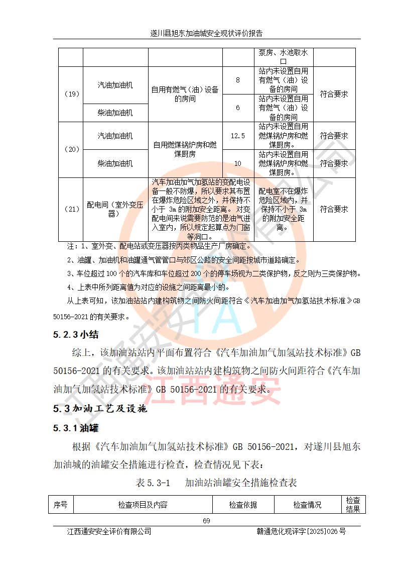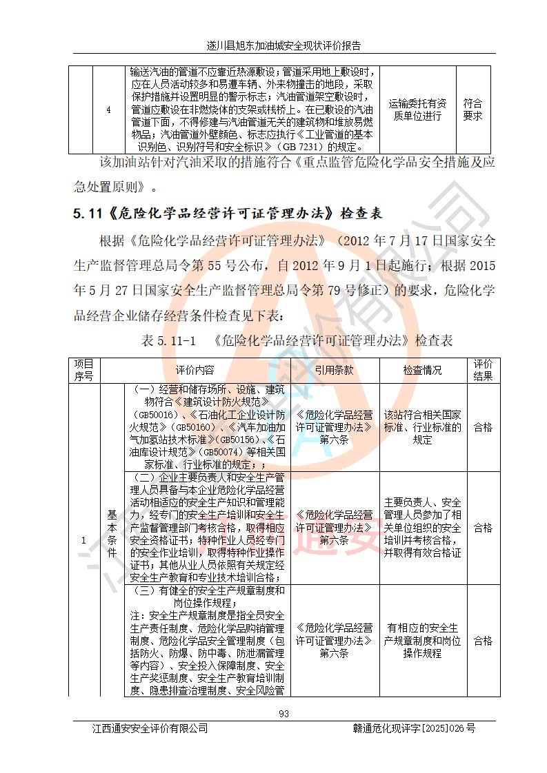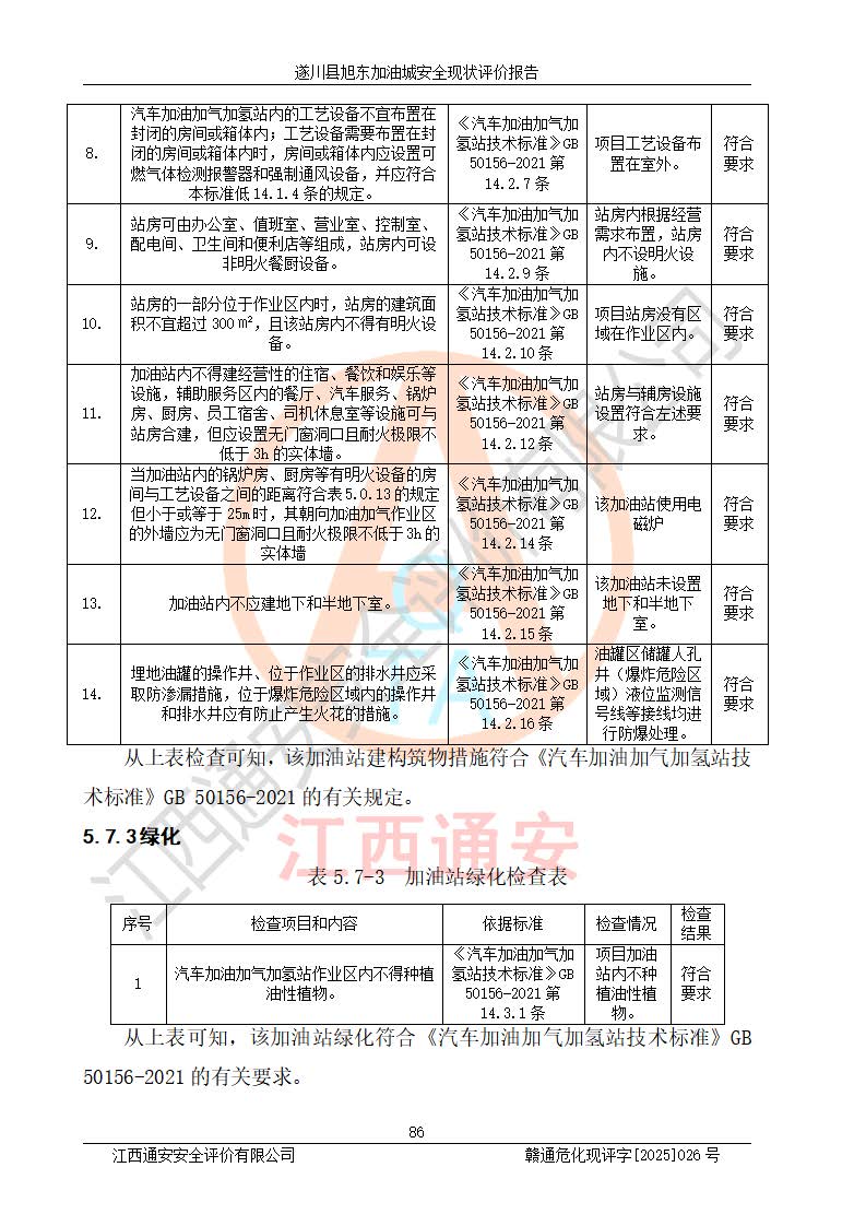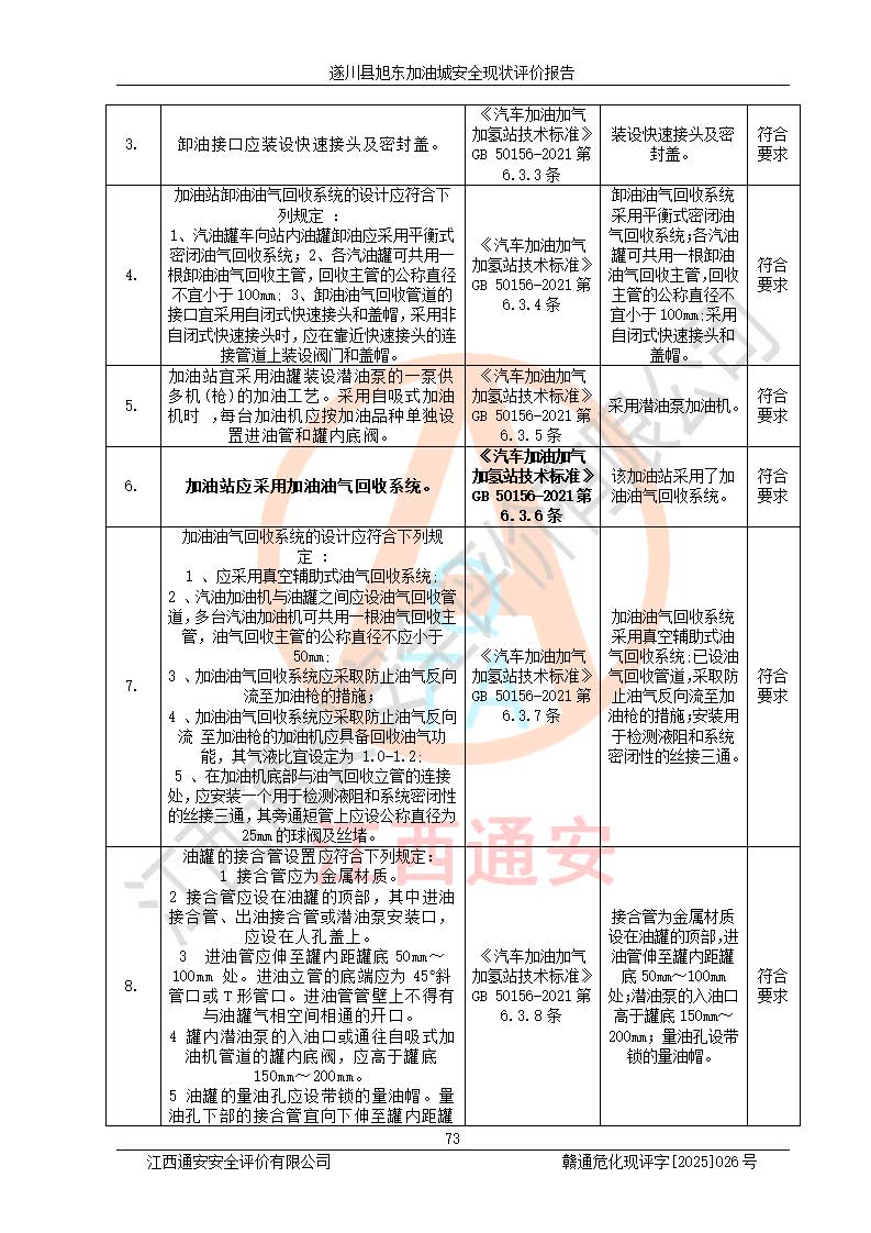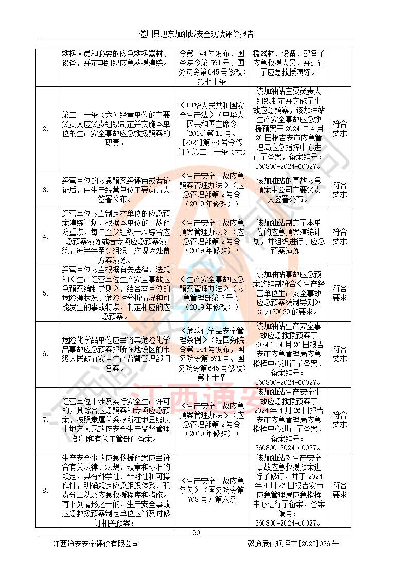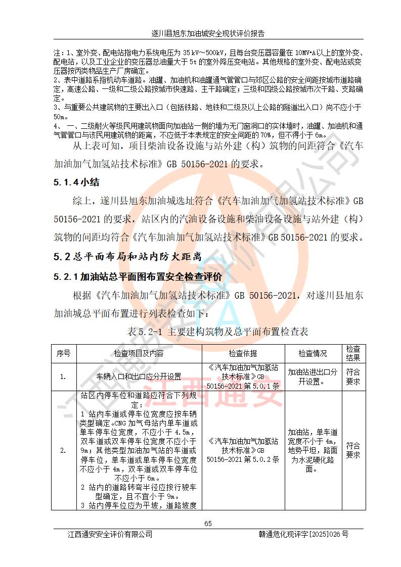 其它 | 在對(duì)該項(xiàng)目危險(xiǎn)、有害因素辨識(shí)分析的基礎(chǔ)上,運(yùn)用安全檢查表、預(yù)作業(yè)條件危險(xiǎn)性分析法、危險(xiǎn)度評(píng)價(jià)、重大事故后果分析結(jié)果等評(píng)價(jià)方法對(duì)該項(xiàng)目進(jìn)行了分析評(píng)價(jià),評(píng)價(jià)結(jié)果如下: 1、該項(xiàng)目位于江西省吉安市遂川縣于田鎮(zhèn)石下村云南坑,符合當(dāng)?shù)匾?guī)劃,與周邊環(huán)境的距離符合有關(guān)標(biāo)準(zhǔn)、規(guī)范的要求。 2、總圖布置分區(qū)明確,布局合理,各建構(gòu)筑物的防火間距滿足規(guī)范要求。 3、該項(xiàng)目無**明令淘汰的工藝,設(shè)備、設(shè)施與工藝條件、內(nèi)部介質(zhì)相適應(yīng),特種設(shè)備及設(shè)施較齊全,按規(guī)定設(shè)置防雷、防靜電接地,爆炸危險(xiǎn)環(huán)境加油機(jī)按要求采用防爆型,符合相關(guān)標(biāo)準(zhǔn)規(guī)范要求。 5、企業(yè)設(shè)置了安全生產(chǎn)管理機(jī)構(gòu),配備了專職安全生產(chǎn)管理人員,建立了安全生產(chǎn)責(zé)任制和安全生產(chǎn)管理制度,編制了崗位操作規(guī)程,編制了生產(chǎn)安全事故應(yīng)急預(yù)案,人員經(jīng)過相應(yīng)的培訓(xùn),企業(yè)的安全生產(chǎn)管理正常。 6、作業(yè)條件危險(xiǎn)性評(píng)價(jià)結(jié)果:在選定的評(píng)價(jià)單元中,作業(yè)危險(xiǎn)程度均為“一般危險(xiǎn),需要注意”,作業(yè)條件相對(duì)安全。 7、危險(xiǎn)度評(píng)價(jià)結(jié)果:汽油儲(chǔ)罐的危險(xiǎn)程度為中度危險(xiǎn)。油罐采用雙層罐埋地設(shè)置,按要求設(shè)置了通氣管,并裝設(shè)了阻火器;設(shè)置了液位監(jiān)測(cè)報(bào)警系統(tǒng)和緊急切斷系統(tǒng),92#汽油雙層埋地儲(chǔ)罐、0#柴油雙層埋地儲(chǔ)罐、0#柴油雙層埋地儲(chǔ)罐設(shè)置了埋地加油雙層管道,可以滿足安全生產(chǎn)條件要求。 評(píng)價(jià)結(jié)論: 遂川縣旭東加油城符合《汽車加油加氣加氫站技術(shù)標(biāo)準(zhǔn)》GB50156-2021等標(biāo)準(zhǔn)規(guī)范的要求,安全風(fēng)險(xiǎn)可控,滿足危險(xiǎn)化學(xué)品經(jīng)營(yíng)的安全條件。 | ||||