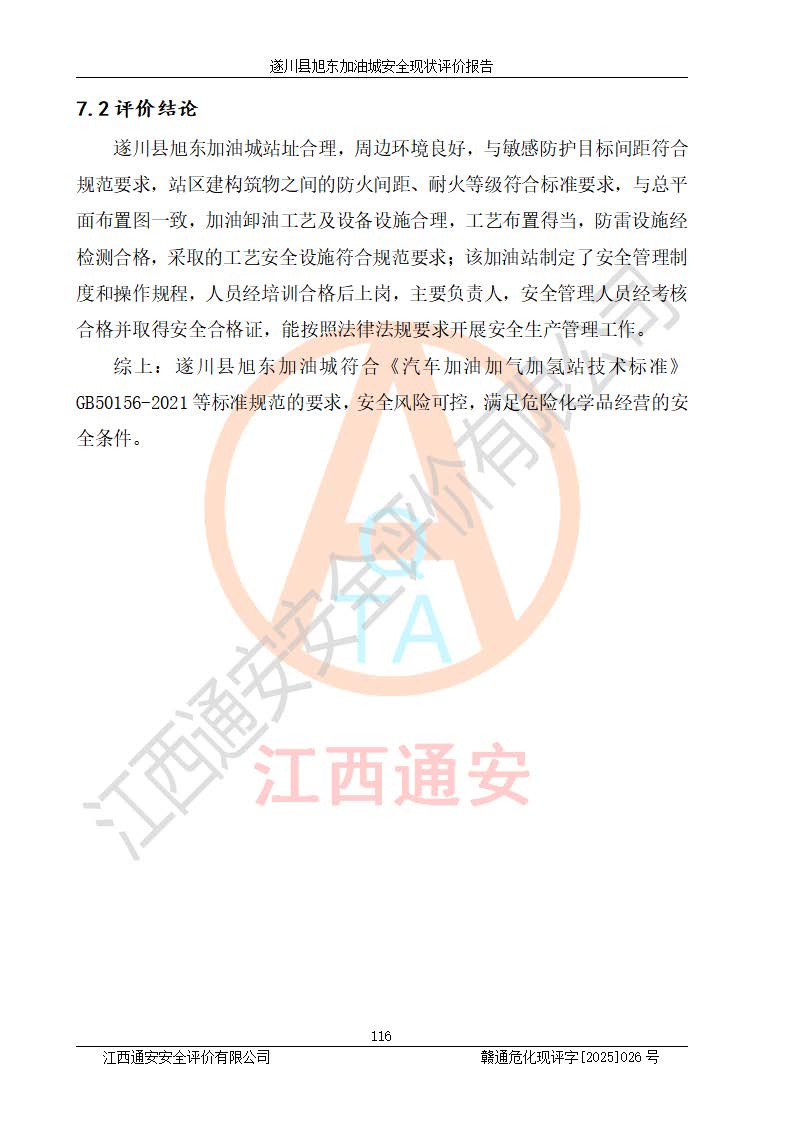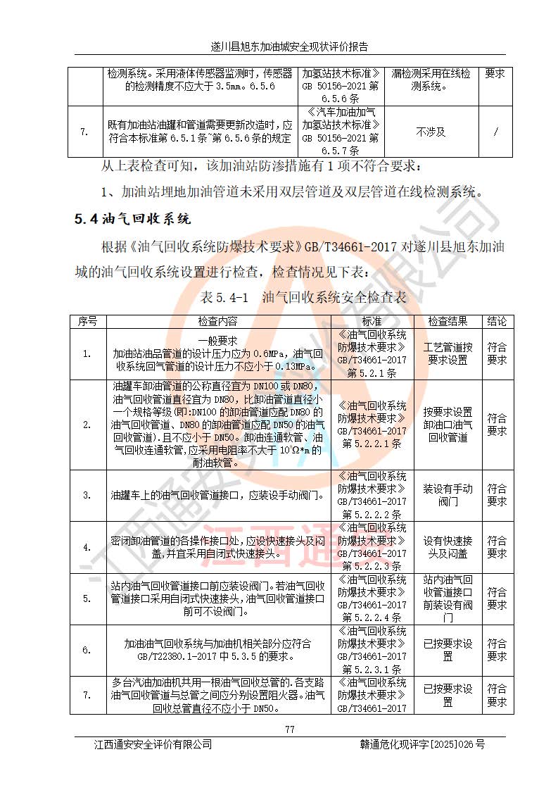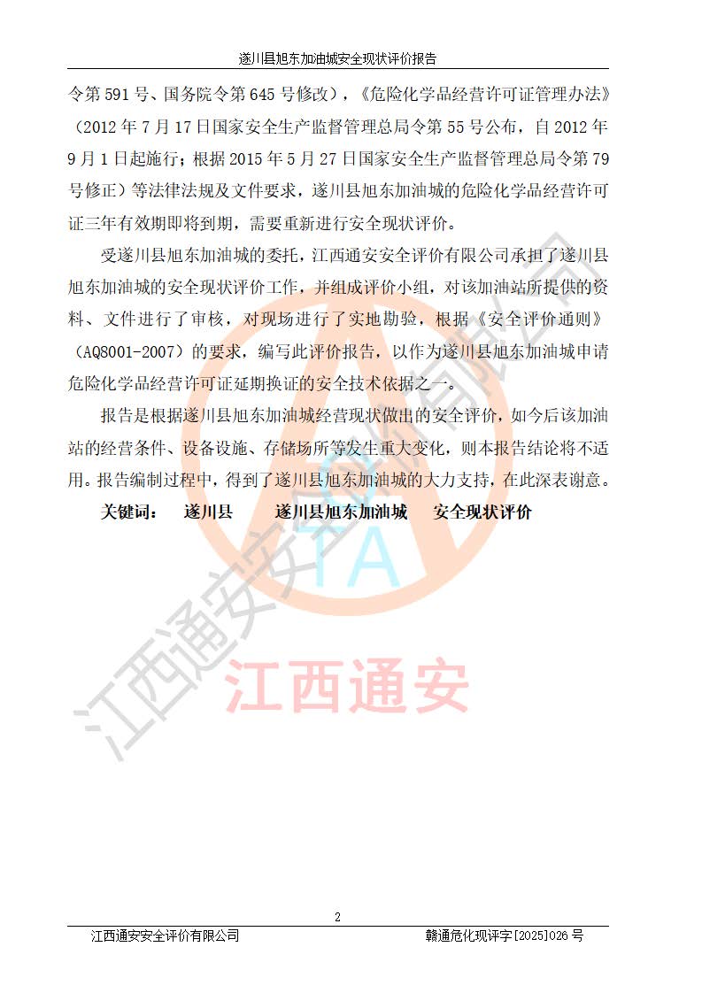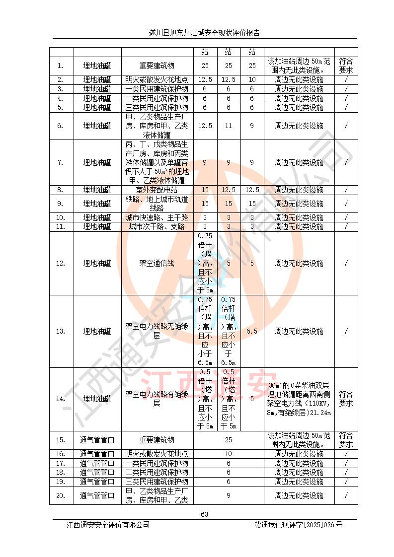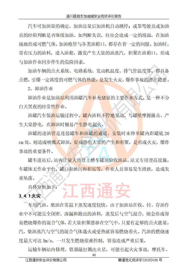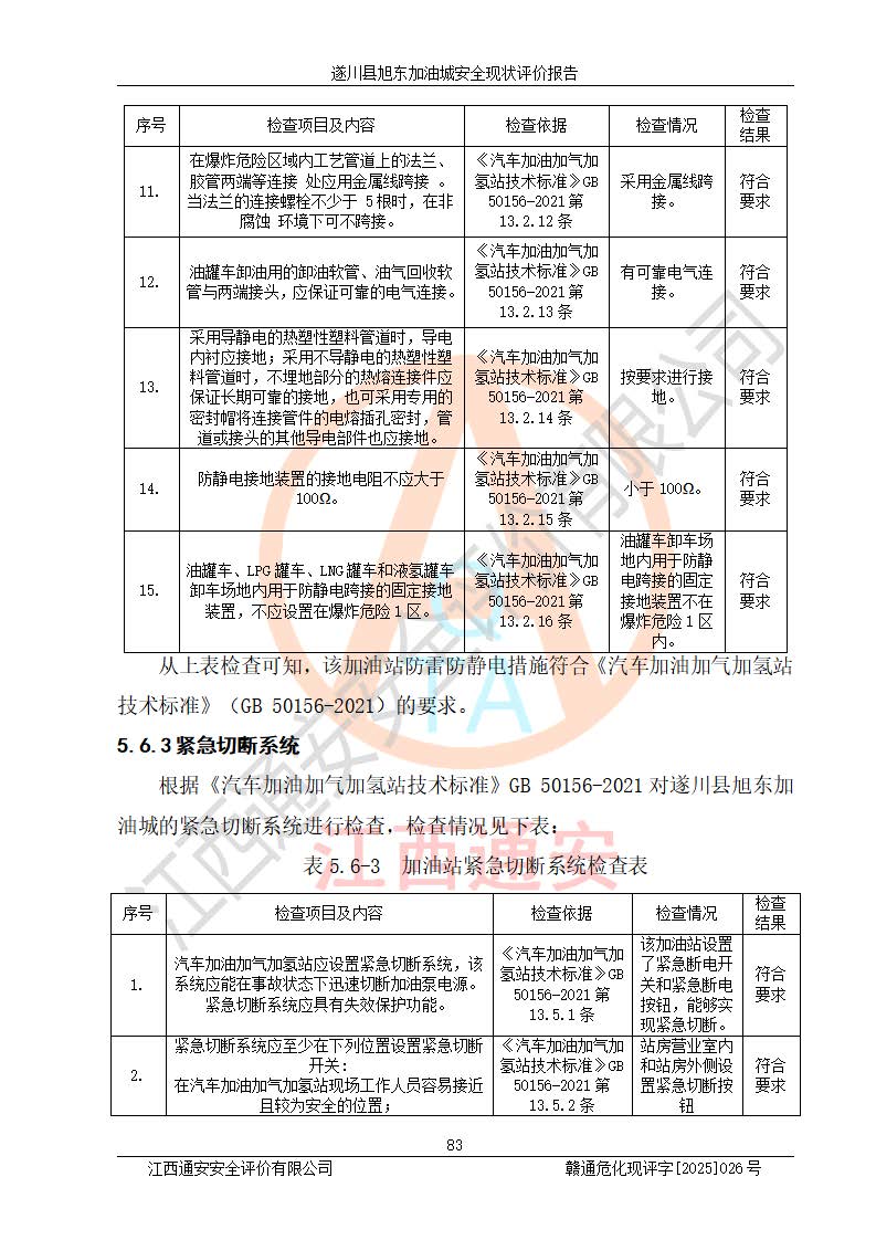 其它 | 在對(duì)該項(xiàng)目危險(xiǎn)、有害因素辨識(shí)分析的基礎(chǔ)上,運(yùn)用安全檢查表、預(yù)作業(yè)條件危險(xiǎn)性分析法、危險(xiǎn)度評(píng)價(jià)、重大事故后果分析結(jié)果等評(píng)價(jià)方法對(duì)該項(xiàng)目進(jìn)行了分析評(píng)價(jià),評(píng)價(jià)結(jié)果如下: 1、該項(xiàng)目位于江西省吉安市遂川縣于田鎮(zhèn)石下村云南坑,符合當(dāng)?shù)匾?guī)劃,與周邊環(huán)境的距離符合有關(guān)標(biāo)準(zhǔn)、規(guī)范的要求。 2、總圖布置分區(qū)明確,布局合理,各建構(gòu)筑物的防火間距滿足規(guī)范要求。 3、該項(xiàng)目無**明令淘汰的工藝,設(shè)備、設(shè)施與工藝條件、內(nèi)部介質(zhì)相適應(yīng),特種設(shè)備及設(shè)施較齊全,按規(guī)定設(shè)置防雷、防靜電接地,爆炸危險(xiǎn)環(huán)境加油機(jī)按要求采用防爆型,符合相關(guān)標(biāo)準(zhǔn)規(guī)范要求。 5、企業(yè)設(shè)置了安全生產(chǎn)管理機(jī)構(gòu),配備了專職安全生產(chǎn)管理人員,建立了安全生產(chǎn)責(zé)任制和安全生產(chǎn)管理制度,編制了崗位操作規(guī)程,編制了生產(chǎn)安全事故應(yīng)急預(yù)案,人員經(jīng)過相應(yīng)的培訓(xùn),企業(yè)的安全生產(chǎn)管理正常。 6、作業(yè)條件危險(xiǎn)性評(píng)價(jià)結(jié)果:在選定的評(píng)價(jià)單元中,作業(yè)危險(xiǎn)程度均為“一般危險(xiǎn),需要注意”,作業(yè)條件相對(duì)安全。 7、危險(xiǎn)度評(píng)價(jià)結(jié)果:汽油儲(chǔ)罐的危險(xiǎn)程度為中度危險(xiǎn)。油罐采用雙層罐埋地設(shè)置,按要求設(shè)置了通氣管,并裝設(shè)了阻火器;設(shè)置了液位監(jiān)測(cè)報(bào)警系統(tǒng)和緊急切斷系統(tǒng),92#汽油雙層埋地儲(chǔ)罐、0#柴油雙層埋地儲(chǔ)罐、0#柴油雙層埋地儲(chǔ)罐設(shè)置了埋地加油雙層管道,可以滿足安全生產(chǎn)條件要求。 評(píng)價(jià)結(jié)論: 遂川縣旭東加油城符合《汽車加油加氣加氫站技術(shù)標(biāo)準(zhǔn)》GB50156-2021等標(biāo)準(zhǔn)規(guī)范的要求,安全風(fēng)險(xiǎn)可控,滿足危險(xiǎn)化學(xué)品經(jīng)營(yíng)的安全條件。 | ||||