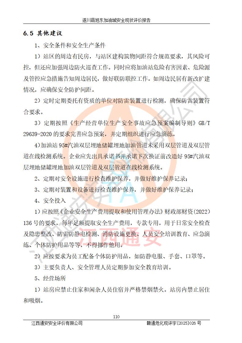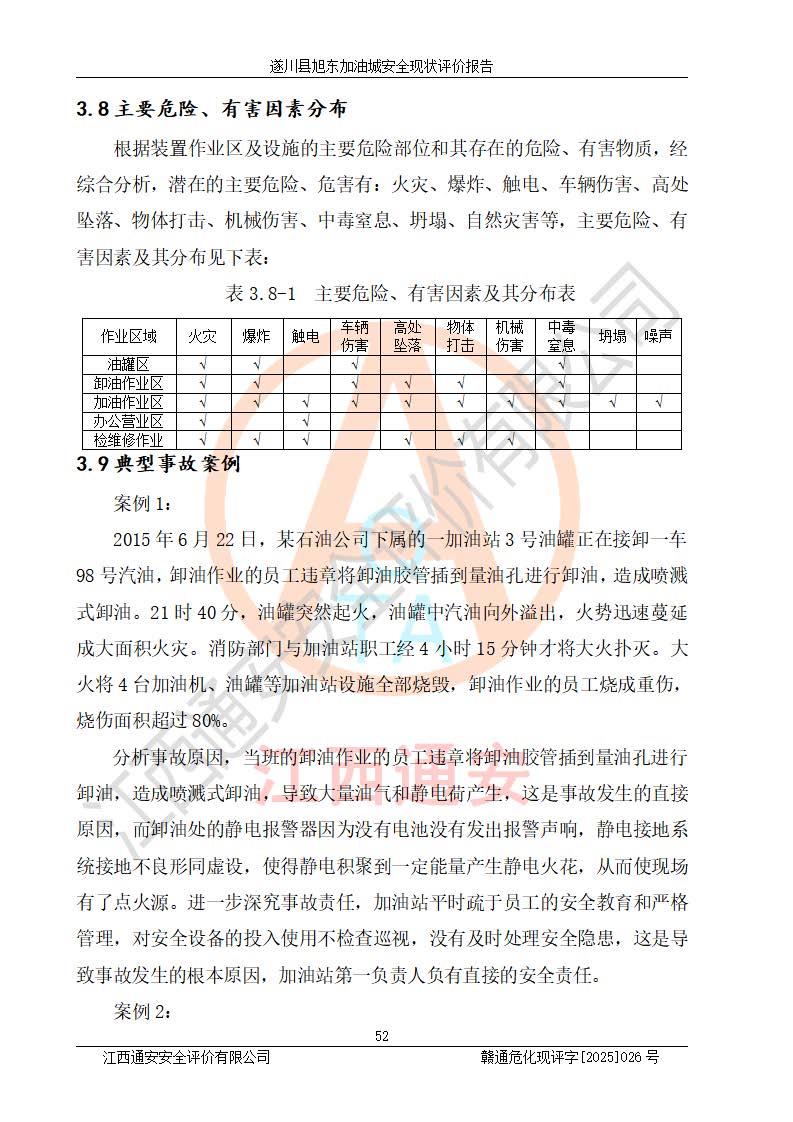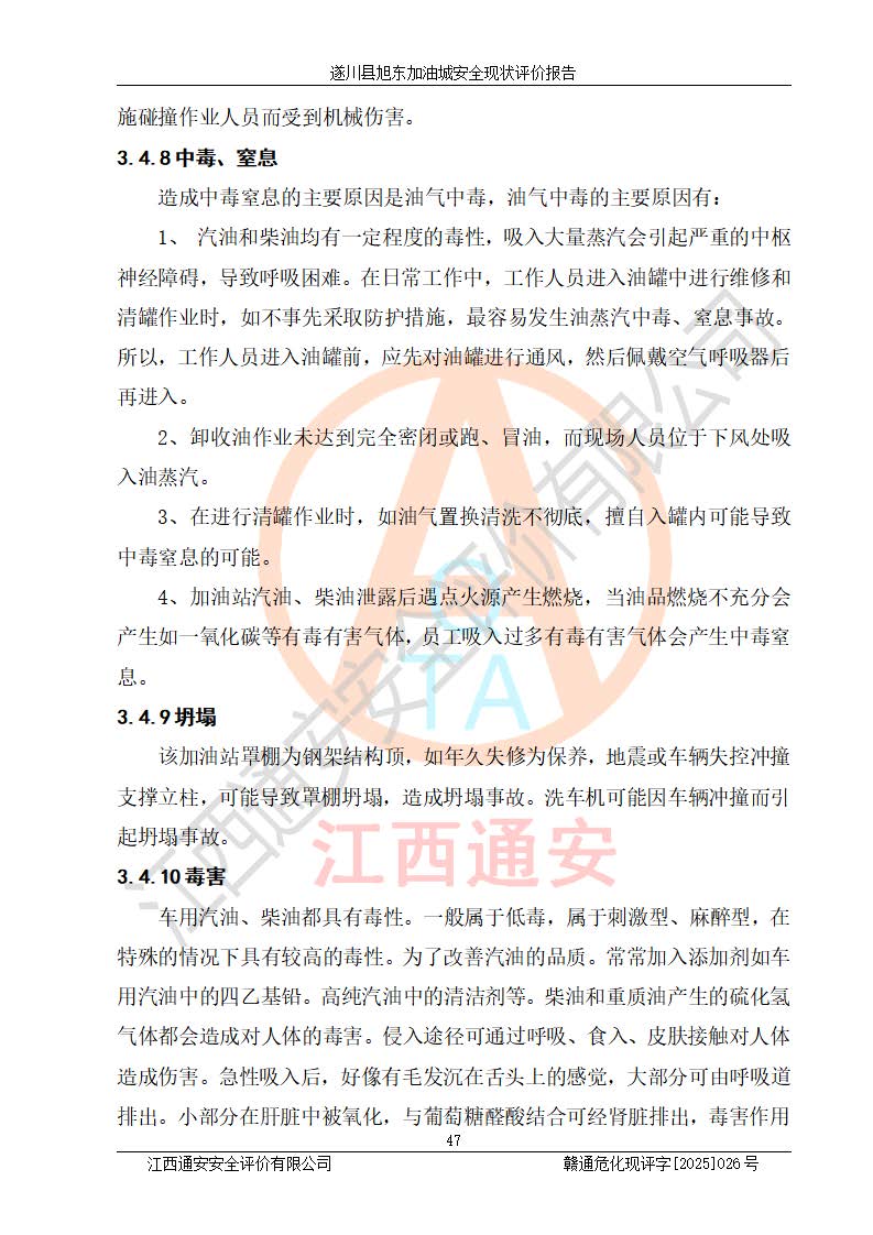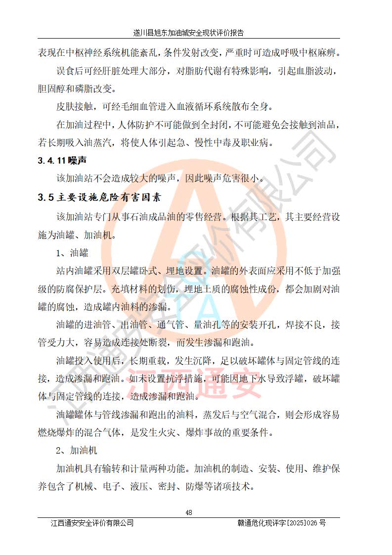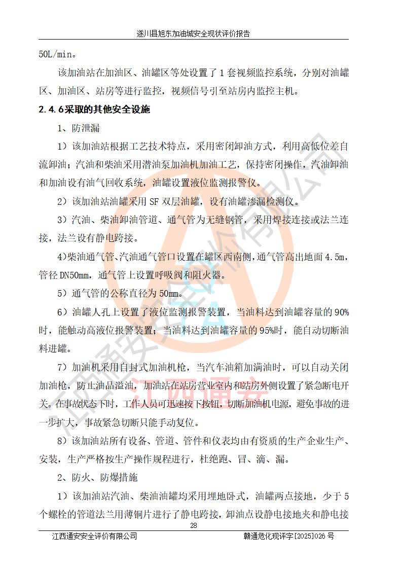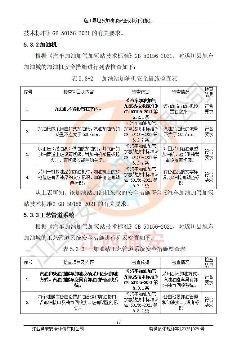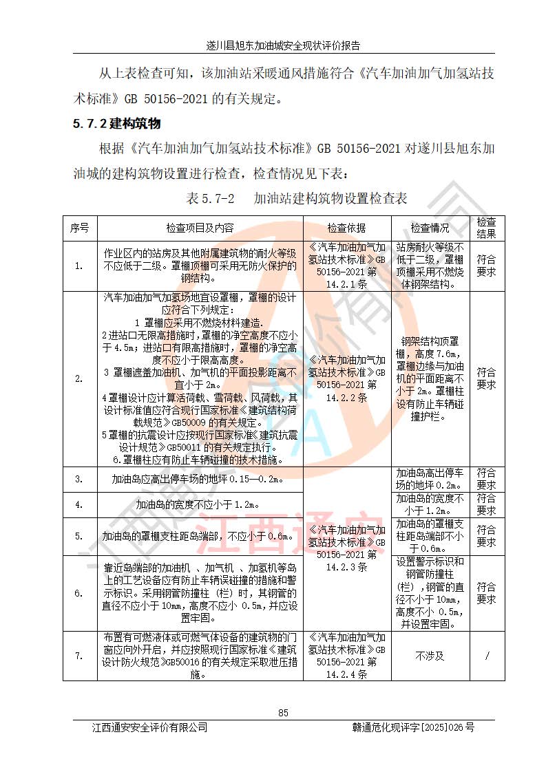 其它 | 在對(duì)該項(xiàng)目危險(xiǎn)、有害因素辨識(shí)分析的基礎(chǔ)上,運(yùn)用安全檢查表、預(yù)作業(yè)條件危險(xiǎn)性分析法、危險(xiǎn)度評(píng)價(jià)、重大事故后果分析結(jié)果等評(píng)價(jià)方法對(duì)該項(xiàng)目進(jìn)行了分析評(píng)價(jià),評(píng)價(jià)結(jié)果如下: 1、該項(xiàng)目位于江西省吉安市遂川縣于田鎮(zhèn)石下村云南坑,符合當(dāng)?shù)匾?guī)劃,與周邊環(huán)境的距離符合有關(guān)標(biāo)準(zhǔn)、規(guī)范的要求。 2、總圖布置分區(qū)明確,布局合理,各建構(gòu)筑物的防火間距滿足規(guī)范要求。 3、該項(xiàng)目無**明令淘汰的工藝,設(shè)備、設(shè)施與工藝條件、內(nèi)部介質(zhì)相適應(yīng),特種設(shè)備及設(shè)施較齊全,按規(guī)定設(shè)置防雷、防靜電接地,爆炸危險(xiǎn)環(huán)境加油機(jī)按要求采用防爆型,符合相關(guān)標(biāo)準(zhǔn)規(guī)范要求。 5、企業(yè)設(shè)置了安全生產(chǎn)管理機(jī)構(gòu),配備了專職安全生產(chǎn)管理人員,建立了安全生產(chǎn)責(zé)任制和安全生產(chǎn)管理制度,編制了崗位操作規(guī)程,編制了生產(chǎn)安全事故應(yīng)急預(yù)案,人員經(jīng)過相應(yīng)的培訓(xùn),企業(yè)的安全生產(chǎn)管理正常。 6、作業(yè)條件危險(xiǎn)性評(píng)價(jià)結(jié)果:在選定的評(píng)價(jià)單元中,作業(yè)危險(xiǎn)程度均為“一般危險(xiǎn),需要注意”,作業(yè)條件相對(duì)安全。 7、危險(xiǎn)度評(píng)價(jià)結(jié)果:汽油儲(chǔ)罐的危險(xiǎn)程度為中度危險(xiǎn)。油罐采用雙層罐埋地設(shè)置,按要求設(shè)置了通氣管,并裝設(shè)了阻火器;設(shè)置了液位監(jiān)測(cè)報(bào)警系統(tǒng)和緊急切斷系統(tǒng),92#汽油雙層埋地儲(chǔ)罐、0#柴油雙層埋地儲(chǔ)罐、0#柴油雙層埋地儲(chǔ)罐設(shè)置了埋地加油雙層管道,可以滿足安全生產(chǎn)條件要求。 評(píng)價(jià)結(jié)論: 遂川縣旭東加油城符合《汽車加油加氣加氫站技術(shù)標(biāo)準(zhǔn)》GB50156-2021等標(biāo)準(zhǔn)規(guī)范的要求,安全風(fēng)險(xiǎn)可控,滿足危險(xiǎn)化學(xué)品經(jīng)營(yíng)的安全條件。 | ||||