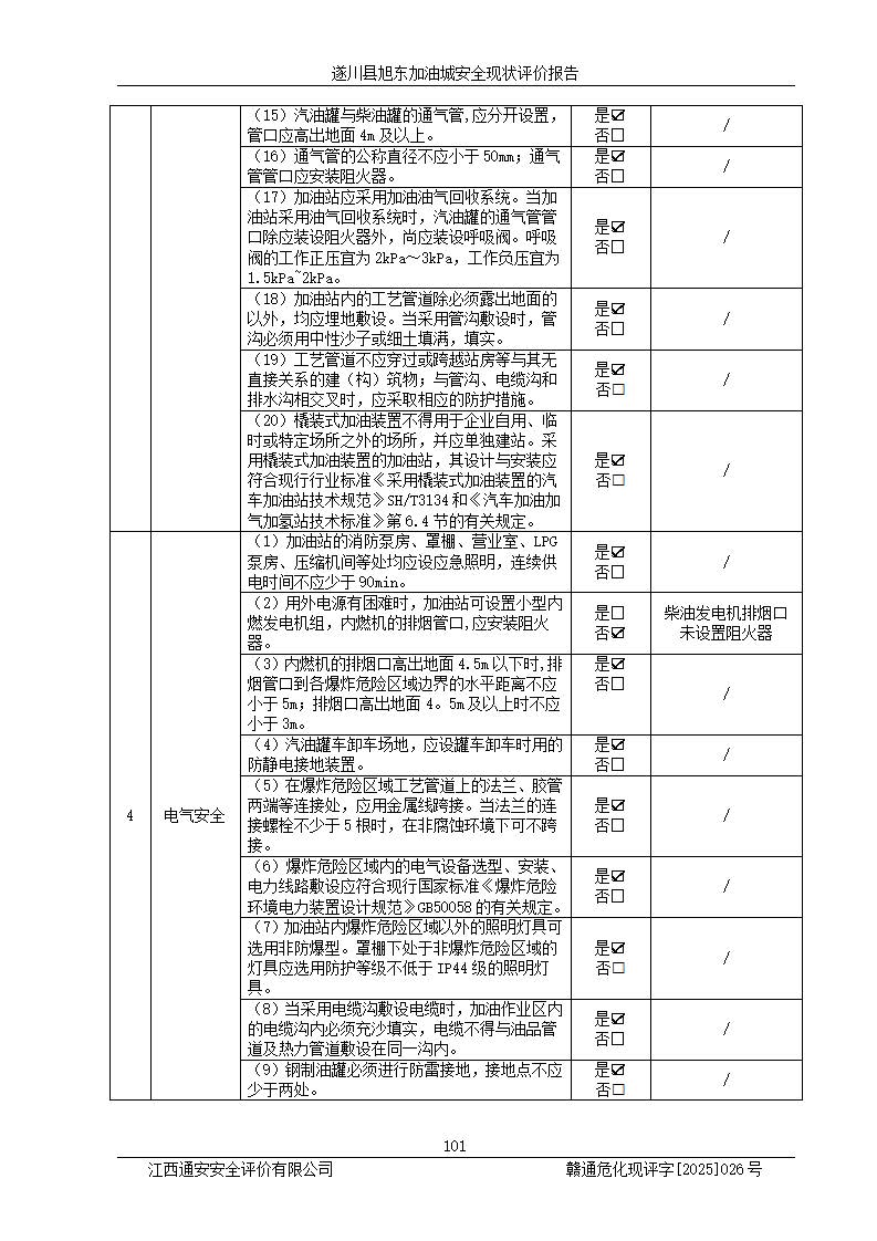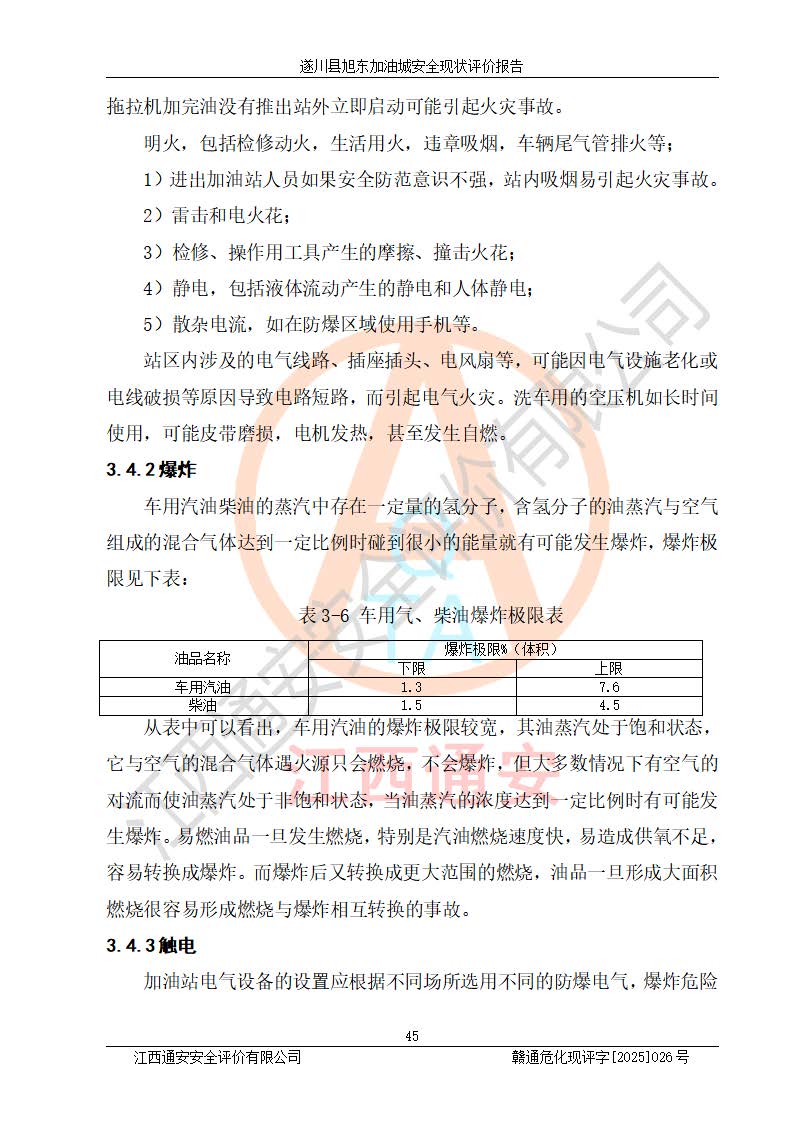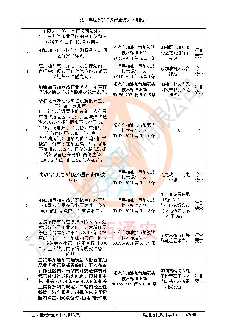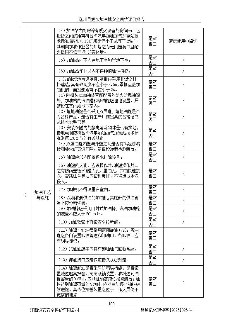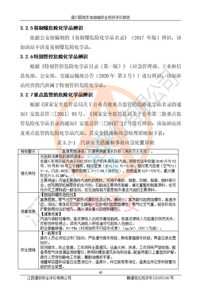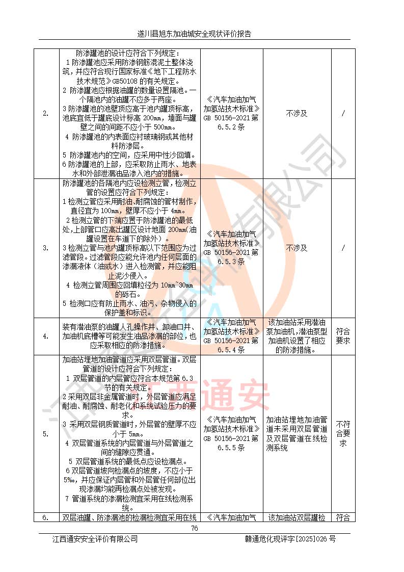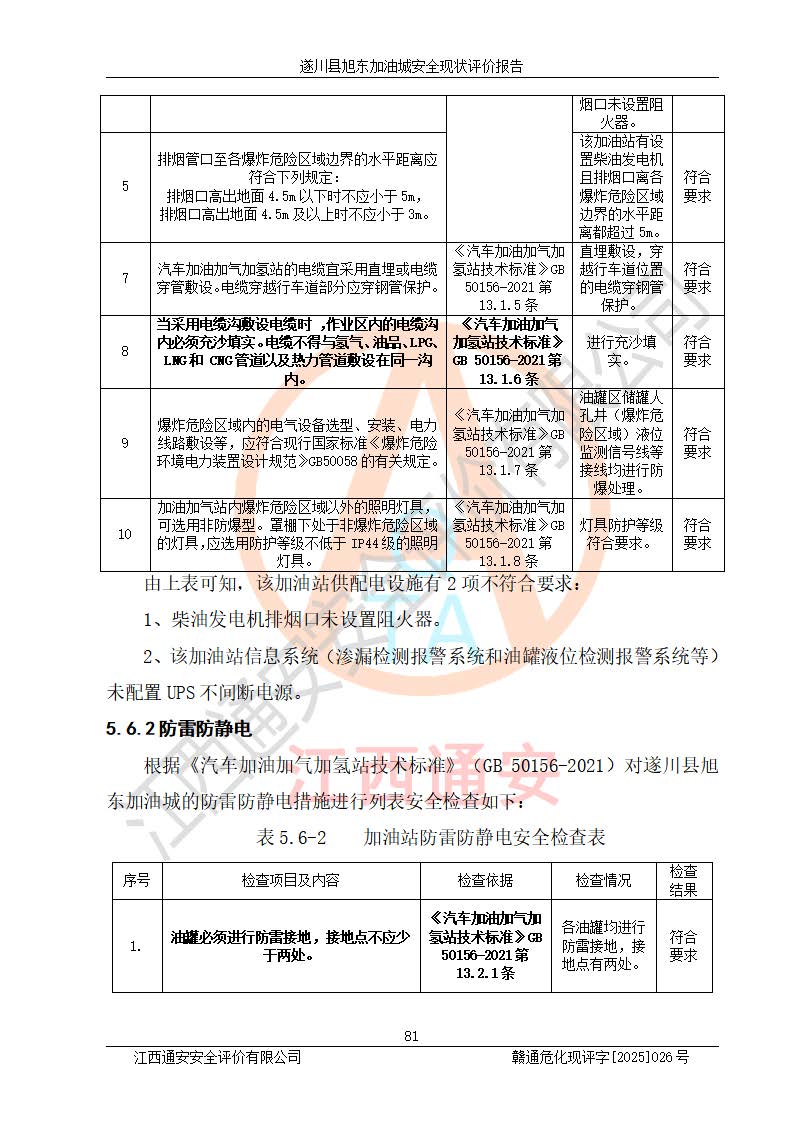 其它 | 在對(duì)該項(xiàng)目危險(xiǎn)、有害因素辨識(shí)分析的基礎(chǔ)上,運(yùn)用安全檢查表、預(yù)作業(yè)條件危險(xiǎn)性分析法、危險(xiǎn)度評(píng)價(jià)、重大事故后果分析結(jié)果等評(píng)價(jià)方法對(duì)該項(xiàng)目進(jìn)行了分析評(píng)價(jià),評(píng)價(jià)結(jié)果如下: 1、該項(xiàng)目位于江西省吉安市遂川縣于田鎮(zhèn)石下村云南坑,符合當(dāng)?shù)匾?guī)劃,與周邊環(huán)境的距離符合有關(guān)標(biāo)準(zhǔn)、規(guī)范的要求。 2、總圖布置分區(qū)明確,布局合理,各建構(gòu)筑物的防火間距滿足規(guī)范要求。 3、該項(xiàng)目無**明令淘汰的工藝,設(shè)備、設(shè)施與工藝條件、內(nèi)部介質(zhì)相適應(yīng),特種設(shè)備及設(shè)施較齊全,按規(guī)定設(shè)置防雷、防靜電接地,爆炸危險(xiǎn)環(huán)境加油機(jī)按要求采用防爆型,符合相關(guān)標(biāo)準(zhǔn)規(guī)范要求。 5、企業(yè)設(shè)置了安全生產(chǎn)管理機(jī)構(gòu),配備了專職安全生產(chǎn)管理人員,建立了安全生產(chǎn)責(zé)任制和安全生產(chǎn)管理制度,編制了崗位操作規(guī)程,編制了生產(chǎn)安全事故應(yīng)急預(yù)案,人員經(jīng)過相應(yīng)的培訓(xùn),企業(yè)的安全生產(chǎn)管理正常。 6、作業(yè)條件危險(xiǎn)性評(píng)價(jià)結(jié)果:在選定的評(píng)價(jià)單元中,作業(yè)危險(xiǎn)程度均為“一般危險(xiǎn),需要注意”,作業(yè)條件相對(duì)安全。 7、危險(xiǎn)度評(píng)價(jià)結(jié)果:汽油儲(chǔ)罐的危險(xiǎn)程度為中度危險(xiǎn)。油罐采用雙層罐埋地設(shè)置,按要求設(shè)置了通氣管,并裝設(shè)了阻火器;設(shè)置了液位監(jiān)測(cè)報(bào)警系統(tǒng)和緊急切斷系統(tǒng),92#汽油雙層埋地儲(chǔ)罐、0#柴油雙層埋地儲(chǔ)罐、0#柴油雙層埋地儲(chǔ)罐設(shè)置了埋地加油雙層管道,可以滿足安全生產(chǎn)條件要求。 評(píng)價(jià)結(jié)論: 遂川縣旭東加油城符合《汽車加油加氣加氫站技術(shù)標(biāo)準(zhǔn)》GB50156-2021等標(biāo)準(zhǔn)規(guī)范的要求,安全風(fēng)險(xiǎn)可控,滿足危險(xiǎn)化學(xué)品經(jīng)營(yíng)的安全條件。 | ||||