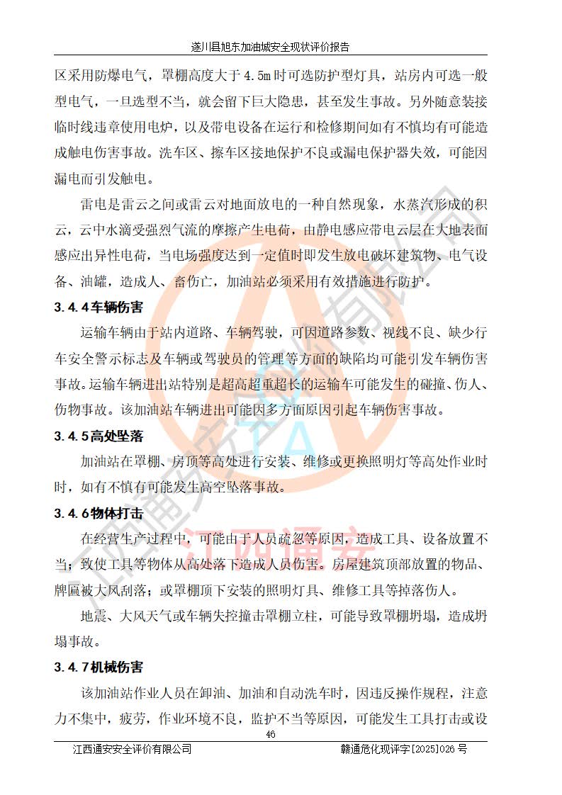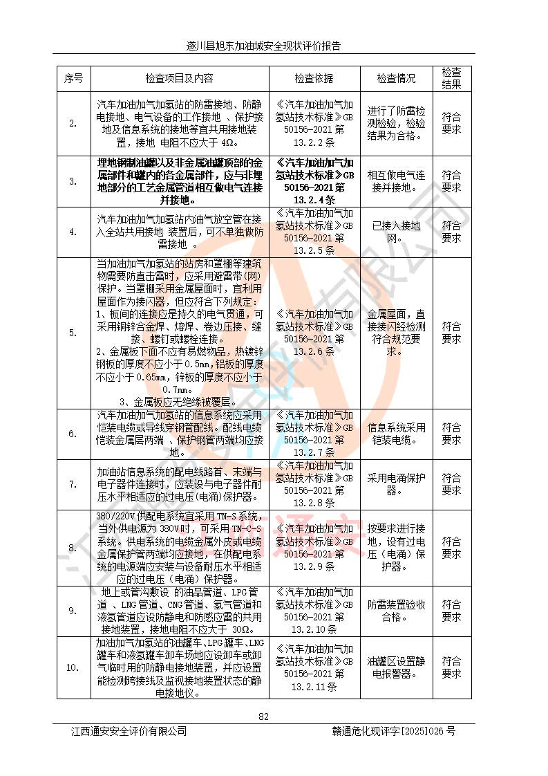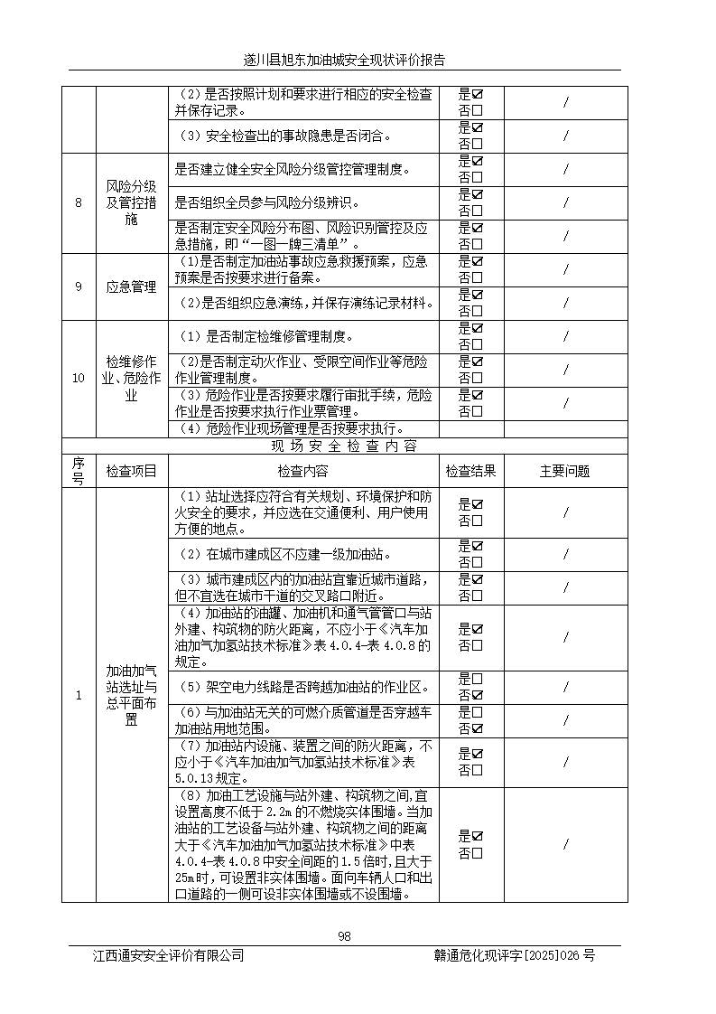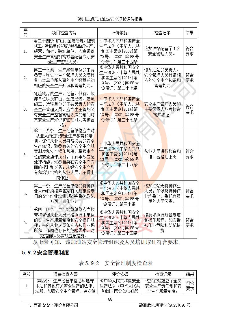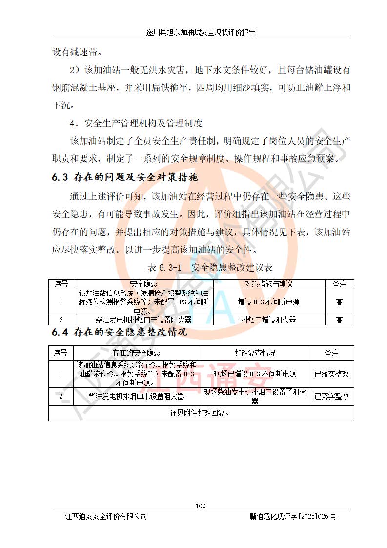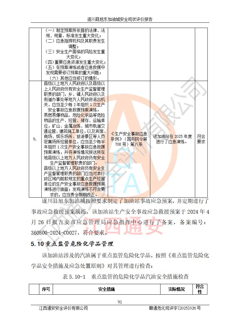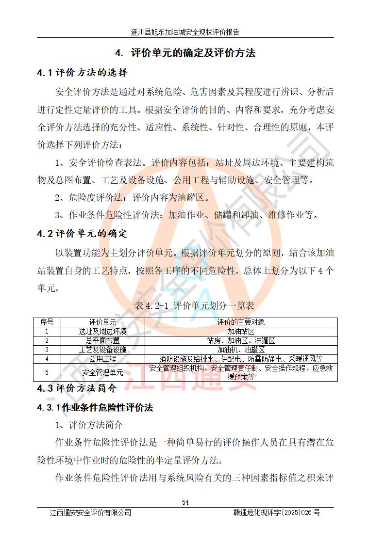 其它 | 在對(duì)該項(xiàng)目危險(xiǎn)、有害因素辨識(shí)分析的基礎(chǔ)上,運(yùn)用安全檢查表、預(yù)作業(yè)條件危險(xiǎn)性分析法、危險(xiǎn)度評(píng)價(jià)、重大事故后果分析結(jié)果等評(píng)價(jià)方法對(duì)該項(xiàng)目進(jìn)行了分析評(píng)價(jià),評(píng)價(jià)結(jié)果如下: 1、該項(xiàng)目位于江西省吉安市遂川縣于田鎮(zhèn)石下村云南坑,符合當(dāng)?shù)匾?guī)劃,與周邊環(huán)境的距離符合有關(guān)標(biāo)準(zhǔn)、規(guī)范的要求。 2、總圖布置分區(qū)明確,布局合理,各建構(gòu)筑物的防火間距滿足規(guī)范要求。 3、該項(xiàng)目無**明令淘汰的工藝,設(shè)備、設(shè)施與工藝條件、內(nèi)部介質(zhì)相適應(yīng),特種設(shè)備及設(shè)施較齊全,按規(guī)定設(shè)置防雷、防靜電接地,爆炸危險(xiǎn)環(huán)境加油機(jī)按要求采用防爆型,符合相關(guān)標(biāo)準(zhǔn)規(guī)范要求。 5、企業(yè)設(shè)置了安全生產(chǎn)管理機(jī)構(gòu),配備了專職安全生產(chǎn)管理人員,建立了安全生產(chǎn)責(zé)任制和安全生產(chǎn)管理制度,編制了崗位操作規(guī)程,編制了生產(chǎn)安全事故應(yīng)急預(yù)案,人員經(jīng)過相應(yīng)的培訓(xùn),企業(yè)的安全生產(chǎn)管理正常。 6、作業(yè)條件危險(xiǎn)性評(píng)價(jià)結(jié)果:在選定的評(píng)價(jià)單元中,作業(yè)危險(xiǎn)程度均為“一般危險(xiǎn),需要注意”,作業(yè)條件相對(duì)安全。 7、危險(xiǎn)度評(píng)價(jià)結(jié)果:汽油儲(chǔ)罐的危險(xiǎn)程度為中度危險(xiǎn)。油罐采用雙層罐埋地設(shè)置,按要求設(shè)置了通氣管,并裝設(shè)了阻火器;設(shè)置了液位監(jiān)測(cè)報(bào)警系統(tǒng)和緊急切斷系統(tǒng),92#汽油雙層埋地儲(chǔ)罐、0#柴油雙層埋地儲(chǔ)罐、0#柴油雙層埋地儲(chǔ)罐設(shè)置了埋地加油雙層管道,可以滿足安全生產(chǎn)條件要求。 評(píng)價(jià)結(jié)論: 遂川縣旭東加油城符合《汽車加油加氣加氫站技術(shù)標(biāo)準(zhǔn)》GB50156-2021等標(biāo)準(zhǔn)規(guī)范的要求,安全風(fēng)險(xiǎn)可控,滿足危險(xiǎn)化學(xué)品經(jīng)營(yíng)的安全條件。 | ||||