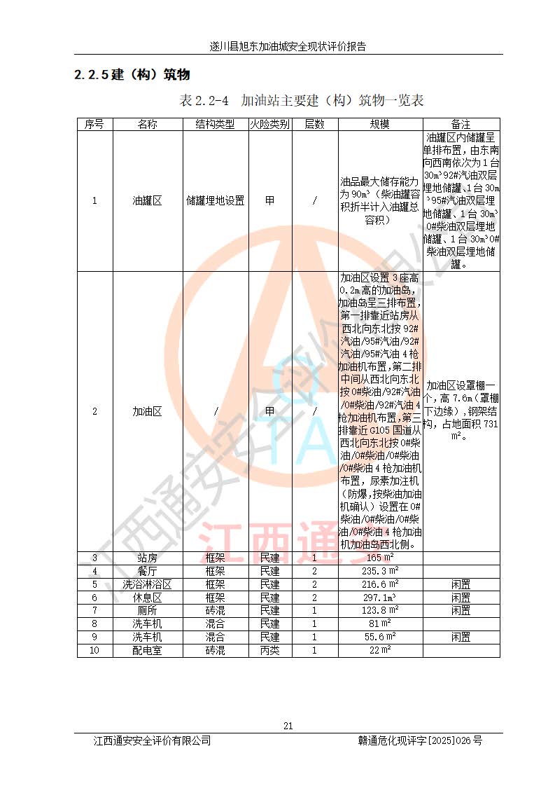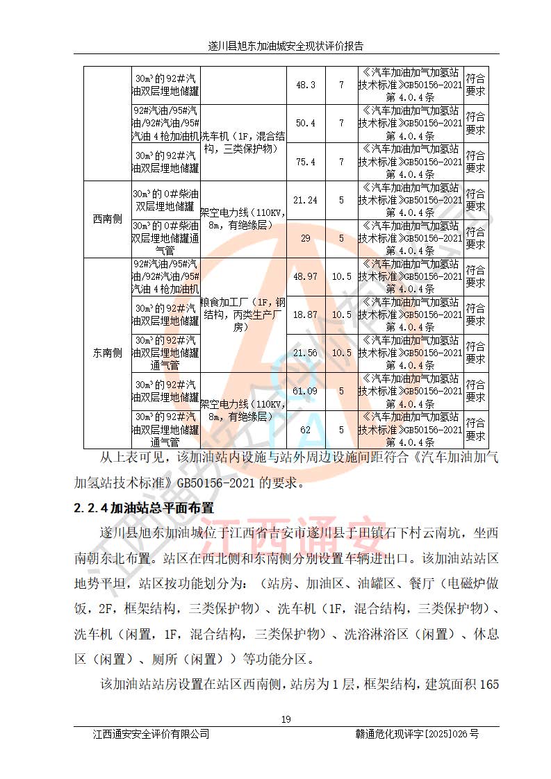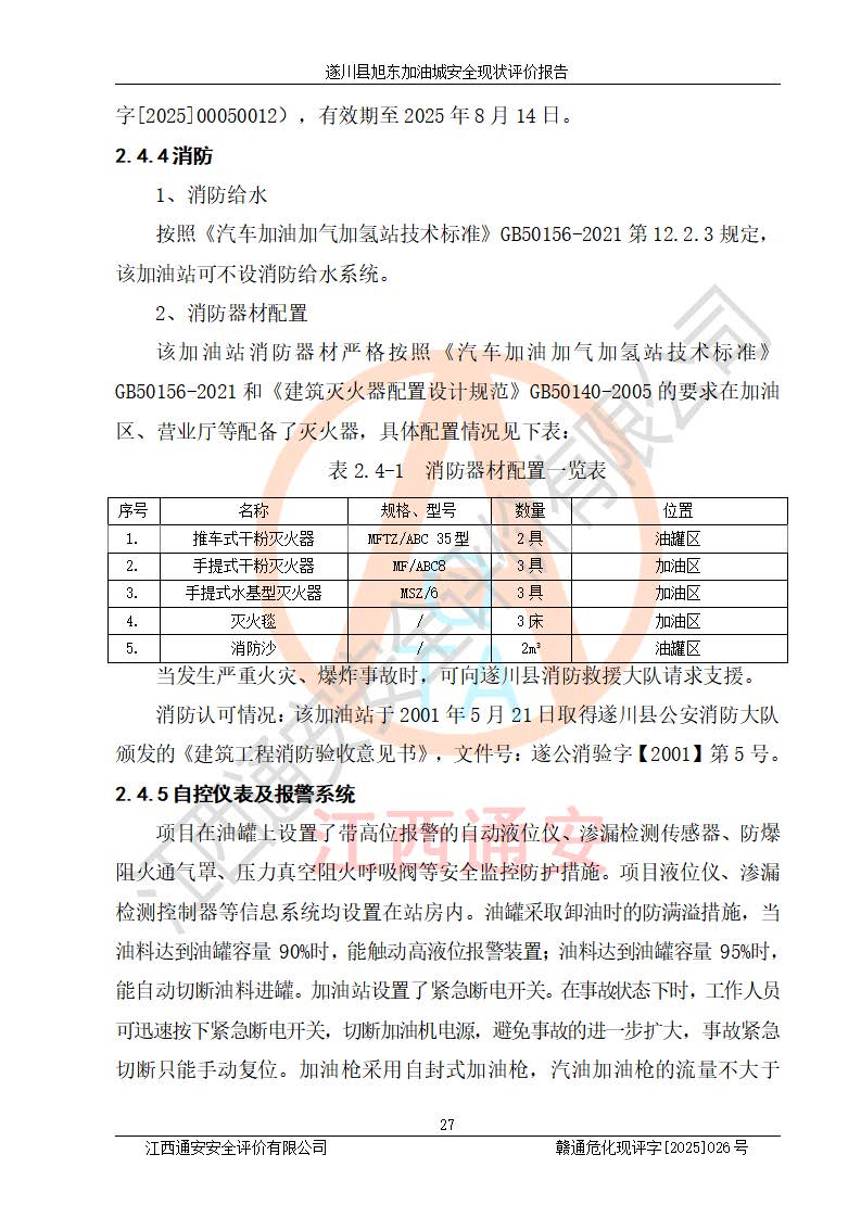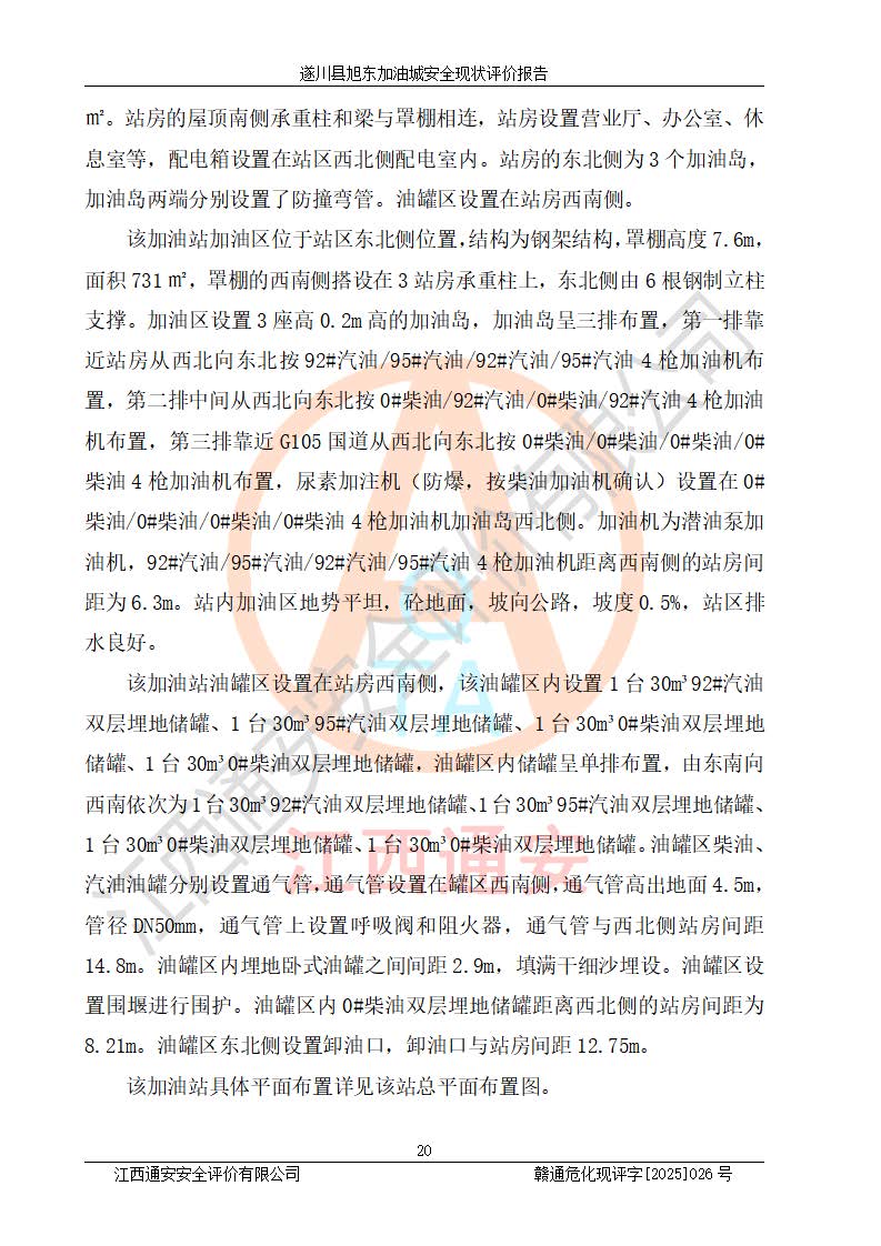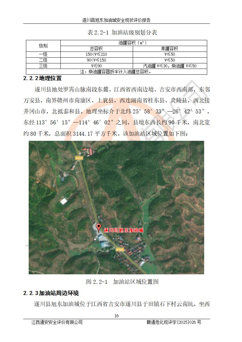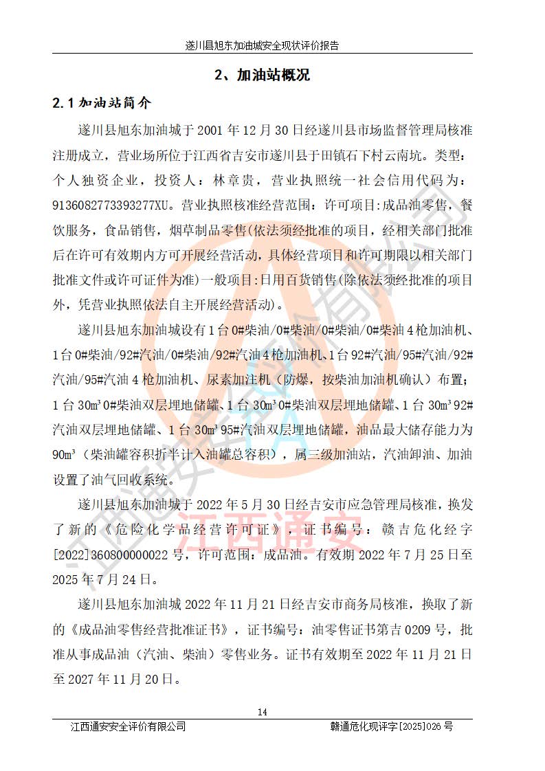 項(xiàng)目簡(jiǎn)介 | 遂川縣旭東加油城于2001年12月30日經(jīng)遂川縣市場(chǎng)監(jiān)督管理局核準(zhǔn)注冊(cè)成立,營(yíng)業(yè)場(chǎng)所位于江西省吉安市遂川縣于田鎮(zhèn)石下村云南坑。類型:個(gè)人獨(dú)資企業(yè),投資人:林章貴,營(yíng)業(yè)執(zhí)照統(tǒng)一社會(huì)信用代碼為:9136082773393277XU。營(yíng)業(yè)執(zhí)照核準(zhǔn)經(jīng)營(yíng)范圍:許可項(xiàng)目:成品油零售,餐飲服務(wù),食品銷售,煙草制品零售(依法須經(jīng)批準(zhǔn)的項(xiàng)目,經(jīng)相關(guān)部門批準(zhǔn)后在許可**期內(nèi)方可開展經(jīng)營(yíng)活動(dòng),具體經(jīng)營(yíng)項(xiàng)目和許可期限以相關(guān)部門批準(zhǔn)文件或許可證件為準(zhǔn))一般項(xiàng)目:日用百貨銷售(除依法須經(jīng)批準(zhǔn)的項(xiàng)目外,憑營(yíng)業(yè)執(zhí)照依法自主開展經(jīng)營(yíng)活動(dòng))。 遂川縣旭東加油城設(shè)有1臺(tái)0#柴油/0#柴油/0#柴油/0#柴油4槍加油機(jī)、1臺(tái)0#柴油/92#汽油/0#柴油/92#汽油4槍加油機(jī)、1臺(tái)92#汽油/95#汽油/92#汽油/95#汽油4槍加油機(jī)、尿素加注機(jī)(防爆,按柴油加油機(jī)確認(rèn))布置;1臺(tái)30m30#柴油雙層埋地儲(chǔ)罐、1臺(tái)30m30#柴油雙層埋地儲(chǔ)罐、1臺(tái)30m392#汽油雙層埋地儲(chǔ)罐、1臺(tái)30m395#汽油雙層埋地儲(chǔ)罐,油品*大儲(chǔ)存能力為90m3(柴油罐容積折半計(jì)入油罐總?cè)莘e),屬三級(jí)加油站,汽油卸油、加油設(shè)置了油氣回收系統(tǒng)。 遂川縣旭東加油城于2022年5月30日經(jīng)吉安市應(yīng)急管理局核準(zhǔn),換發(fā)了新的《危險(xiǎn)化學(xué)品經(jīng)營(yíng)許可證》,證書編號(hào):贛吉危化經(jīng)字[2022]360800000022號(hào),許可范圍:成品油。**期2022年7月25日至2025年7月24日。 遂川縣旭東加油城2022年11月21日經(jīng)吉安市商務(wù)局核準(zhǔn),換取了新的《成品油零售經(jīng)營(yíng)批準(zhǔn)證書》,證書編號(hào):油零售證書第吉0209號(hào),批準(zhǔn)從事成品油(汽油、柴油)零售業(yè)務(wù)。證書**期至2022年11月21日至2027年11月20日。 | ||||