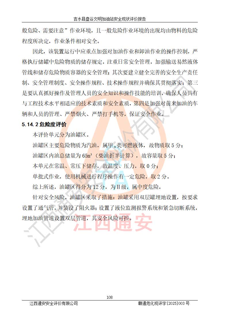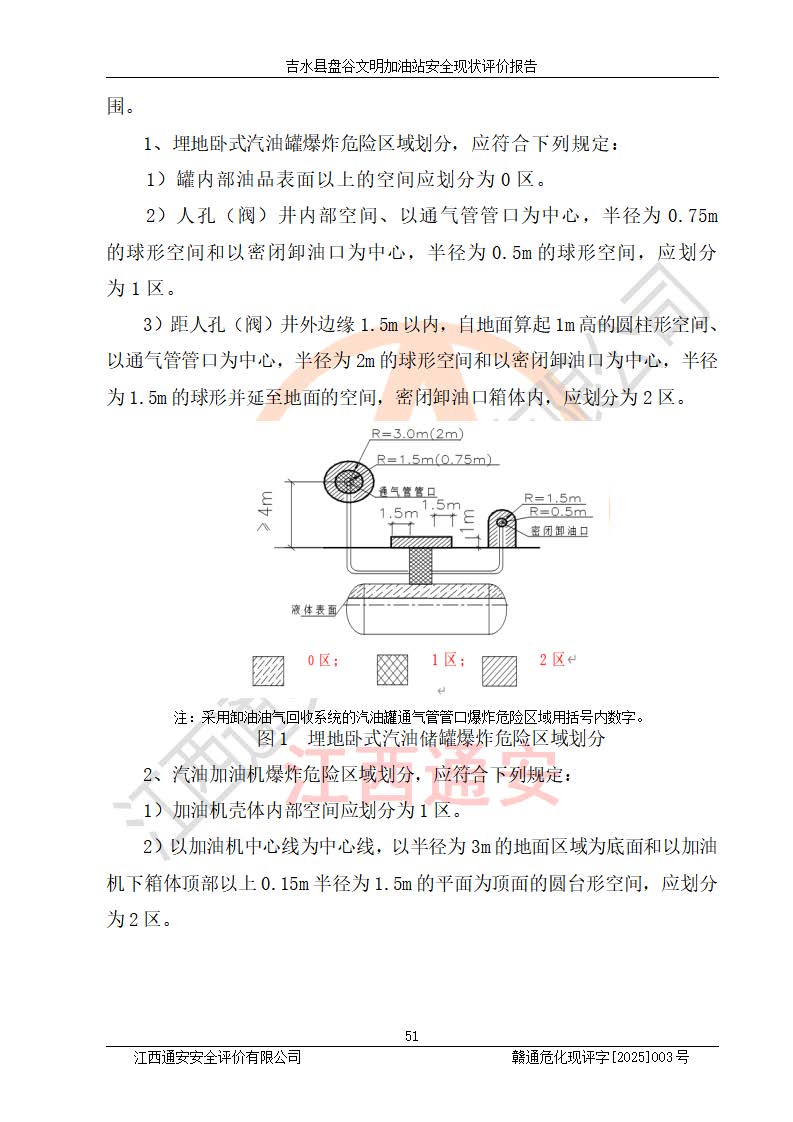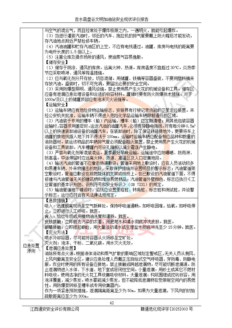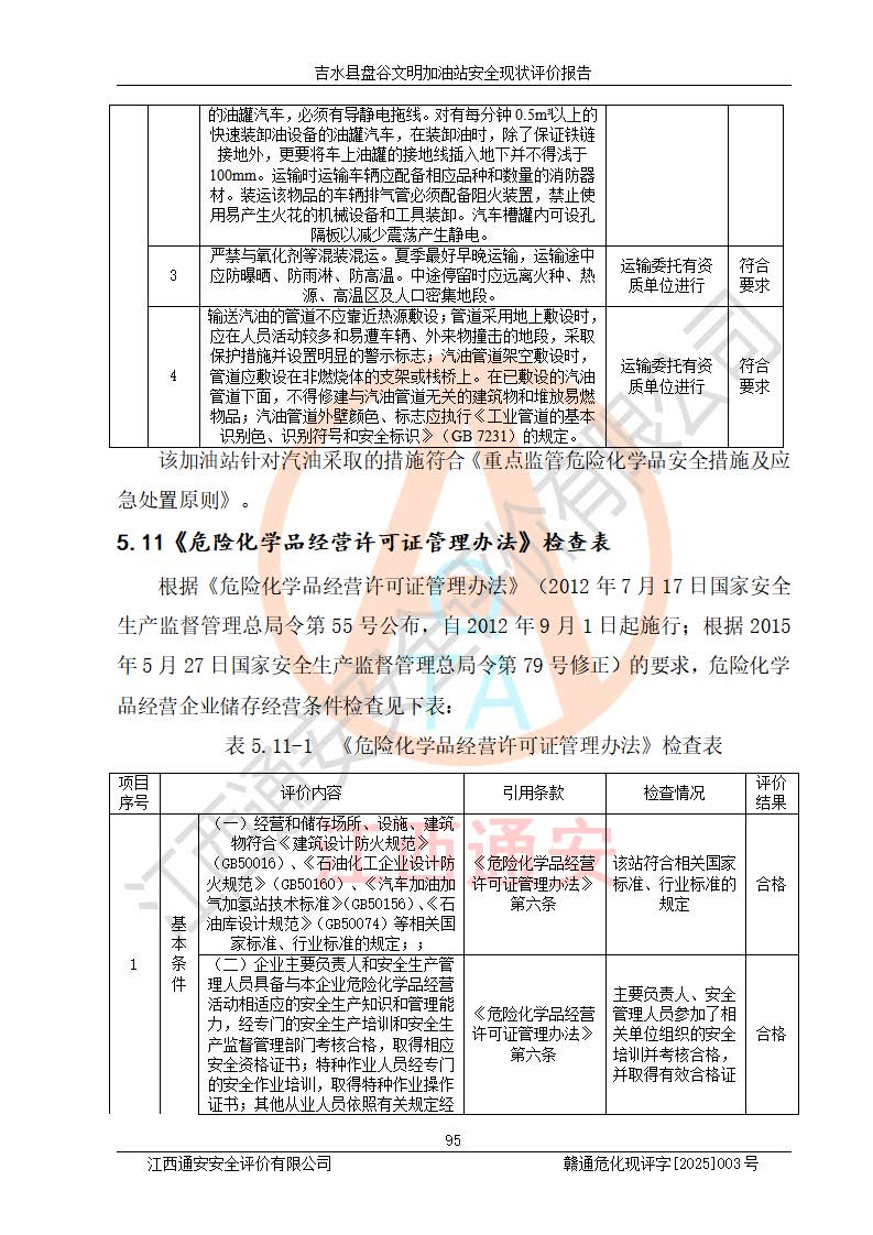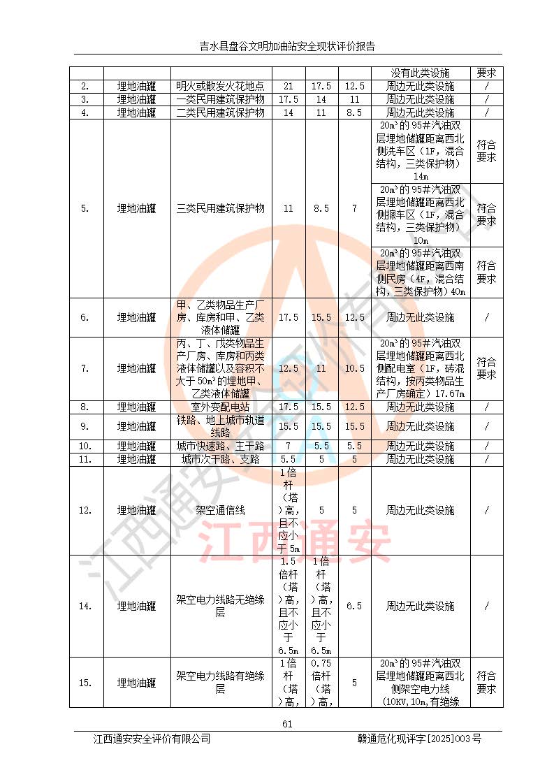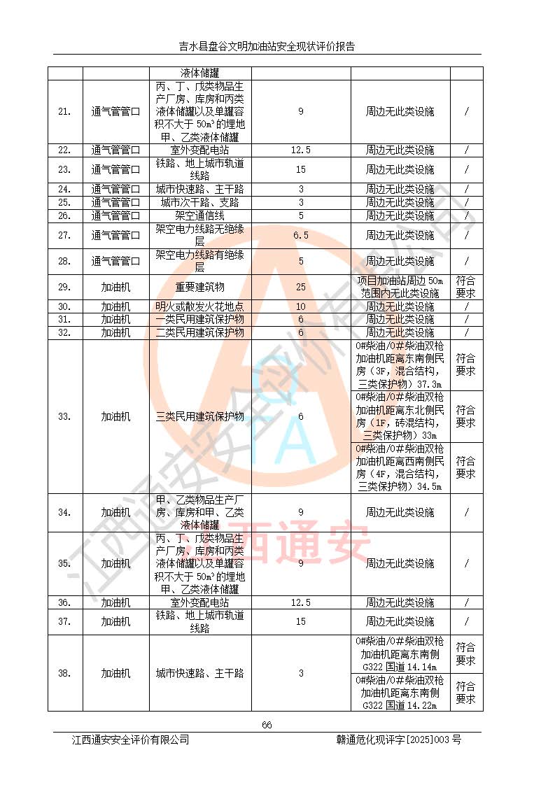 其它 | 在對該項(xiàng)目危險、有害因素辨識分析的基礎(chǔ)上,運(yùn)用安全檢查表、預(yù)作業(yè)條件危險性分析法、危險度評價、重大事故后果分析結(jié)果等評價方法對該項(xiàng)目進(jìn)行了分析評價,評價結(jié)果如下: 1、該項(xiàng)目位于江西省吉安市吉水縣盤谷鎮(zhèn)文明村,符合當(dāng)?shù)匾?guī)劃,與周邊環(huán)境的距離符合有關(guān)標(biāo)準(zhǔn)、規(guī)范的要求。 2、總圖布置分區(qū)明確,布局合理,各建構(gòu)筑物的防火間距滿足規(guī)范要求。 3、該項(xiàng)目無**明令淘汰的工藝,設(shè)備、設(shè)施與工藝條件、內(nèi)部介質(zhì)相適應(yīng),特種設(shè)備及設(shè)施較齊全,按規(guī)定設(shè)置防雷、防靜電接地,爆炸危險環(huán)境加油機(jī)按要求采用防爆型,符合相關(guān)標(biāo)準(zhǔn)規(guī)范要求。 5、企業(yè)設(shè)置了安全生產(chǎn)管理機(jī)構(gòu),配備了專職安全生產(chǎn)管理人員,建立了安全生產(chǎn)責(zé)任制和安全生產(chǎn)管理制度,編制了崗位操作規(guī)程,編制了生產(chǎn)安全事故應(yīng)急預(yù)案,人員經(jīng)過相應(yīng)的培訓(xùn),企業(yè)的安全生產(chǎn)管理正常。 6、作業(yè)條件危險性評價結(jié)果:在選定的評價單元中,作業(yè)危險程度均為“一般危險,需要注意”,作業(yè)條件相對安全。 7、危險度評價結(jié)果:汽油儲罐的危險程度為中度危險。油罐采用雙層罐埋地設(shè)置,按要求設(shè)置了通氣管,并裝設(shè)了阻火器;設(shè)置了液位監(jiān)測報警系統(tǒng)和緊急切斷系統(tǒng),埋地加油管道設(shè)置雙層管道,可以滿足安全生產(chǎn)條件要求。 評價結(jié)論: 吉水縣盤谷文明加油站符合《汽車加油加氣加氫站技術(shù)標(biāo)準(zhǔn)》GB50156-2021等標(biāo)準(zhǔn)規(guī)范的要求,安全風(fēng)險可控,滿足危險化學(xué)品經(jīng)營的安全條件。 | ||||