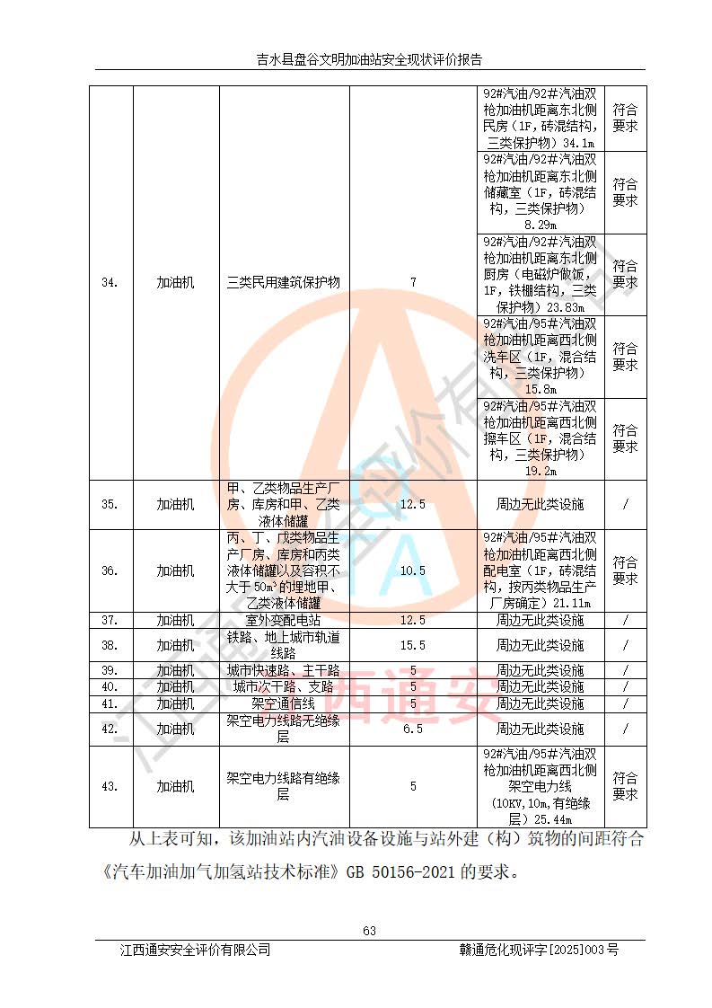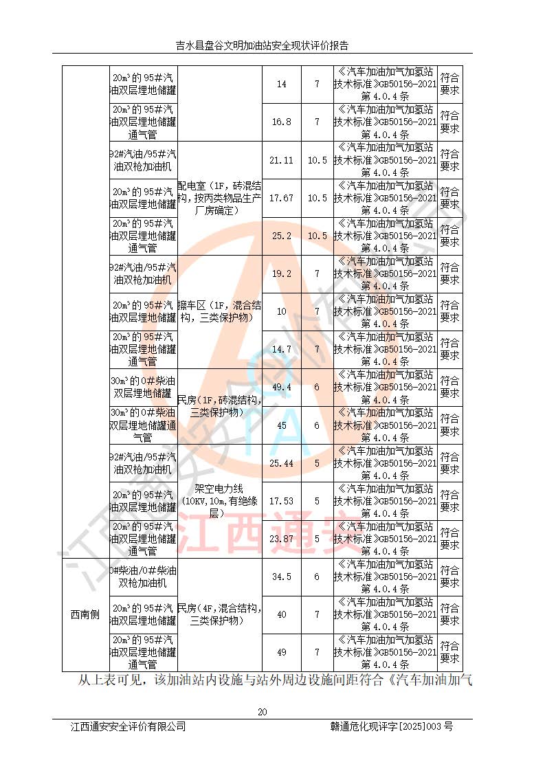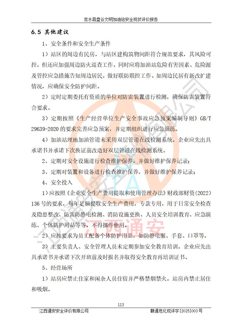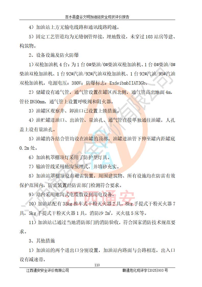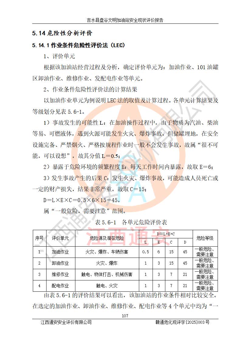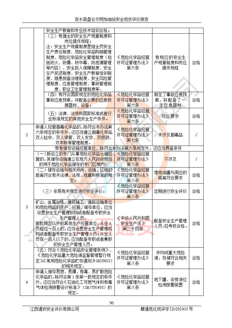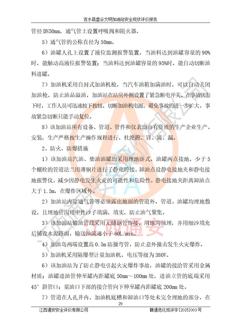其它 | 在對該項(xiàng)目危險、有害因素辨識分析的基礎(chǔ)上,運(yùn)用安全檢查表、預(yù)作業(yè)條件危險性分析法、危險度評價、重大事故后果分析結(jié)果等評價方法對該項(xiàng)目進(jìn)行了分析評價,評價結(jié)果如下: 1、該項(xiàng)目位于江西省吉安市吉水縣盤谷鎮(zhèn)文明村,符合當(dāng)?shù)匾?guī)劃,與周邊環(huán)境的距離符合有關(guān)標(biāo)準(zhǔn)、規(guī)范的要求。 2、總圖布置分區(qū)明確,布局合理,各建構(gòu)筑物的防火間距滿足規(guī)范要求。 3、該項(xiàng)目無**明令淘汰的工藝,設(shè)備、設(shè)施與工藝條件、內(nèi)部介質(zhì)相適應(yīng),特種設(shè)備及設(shè)施較齊全,按規(guī)定設(shè)置防雷、防靜電接地,爆炸危險環(huán)境加油機(jī)按要求采用防爆型,符合相關(guān)標(biāo)準(zhǔn)規(guī)范要求。 5、企業(yè)設(shè)置了安全生產(chǎn)管理機(jī)構(gòu),配備了專職安全生產(chǎn)管理人員,建立了安全生產(chǎn)責(zé)任制和安全生產(chǎn)管理制度,編制了崗位操作規(guī)程,編制了生產(chǎn)安全事故應(yīng)急預(yù)案,人員經(jīng)過相應(yīng)的培訓(xùn),企業(yè)的安全生產(chǎn)管理正常。 6、作業(yè)條件危險性評價結(jié)果:在選定的評價單元中,作業(yè)危險程度均為“一般危險,需要注意”,作業(yè)條件相對安全。 7、危險度評價結(jié)果:汽油儲罐的危險程度為中度危險。油罐采用雙層罐埋地設(shè)置,按要求設(shè)置了通氣管,并裝設(shè)了阻火器;設(shè)置了液位監(jiān)測報警系統(tǒng)和緊急切斷系統(tǒng),埋地加油管道設(shè)置雙層管道,可以滿足安全生產(chǎn)條件要求。 評價結(jié)論: 吉水縣盤谷文明加油站符合《汽車加油加氣加氫站技術(shù)標(biāo)準(zhǔn)》GB50156-2021等標(biāo)準(zhǔn)規(guī)范的要求,安全風(fēng)險可控,滿足危險化學(xué)品經(jīng)營的安全條件。 | ||||