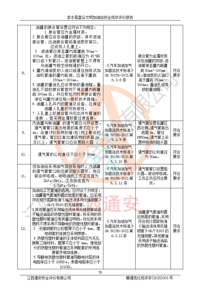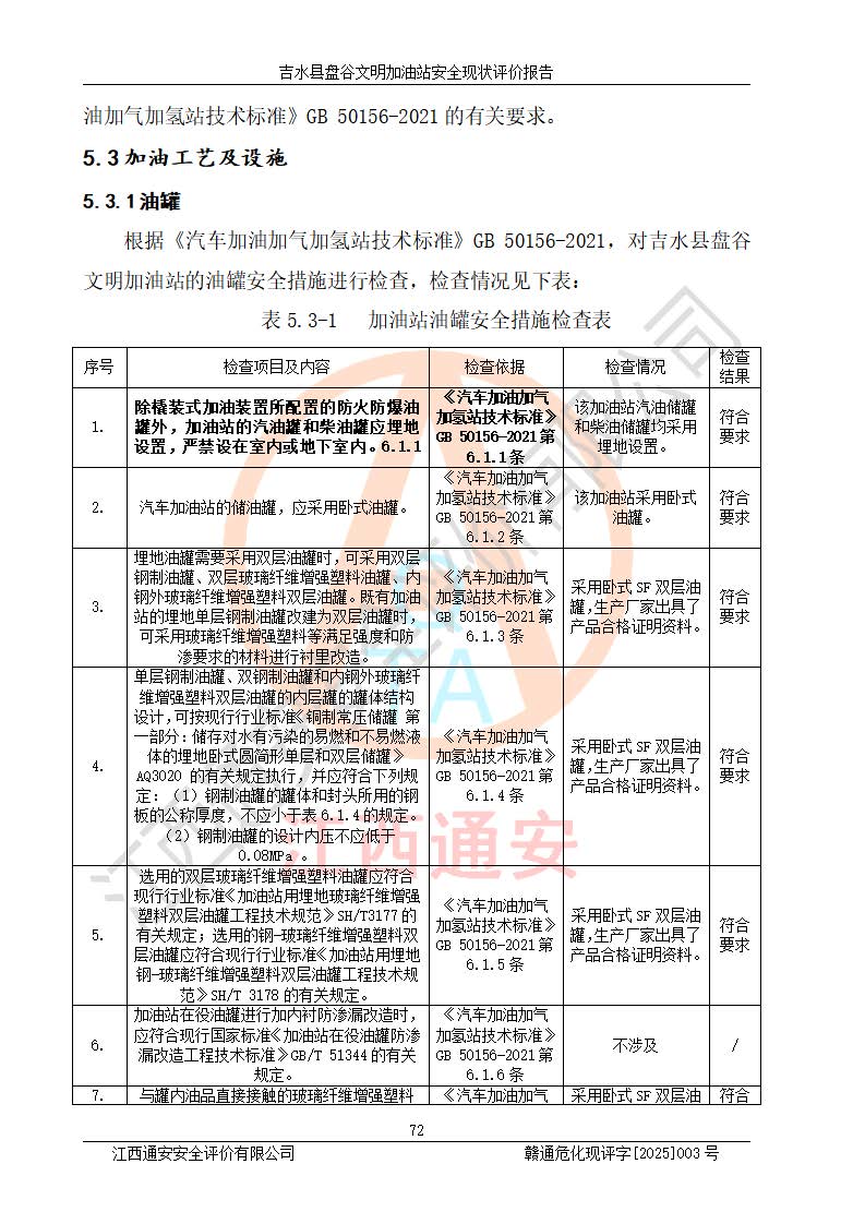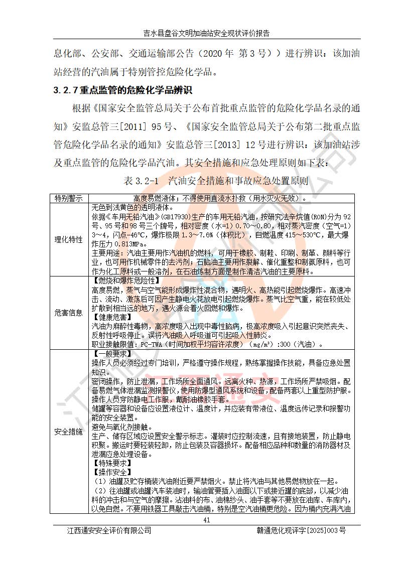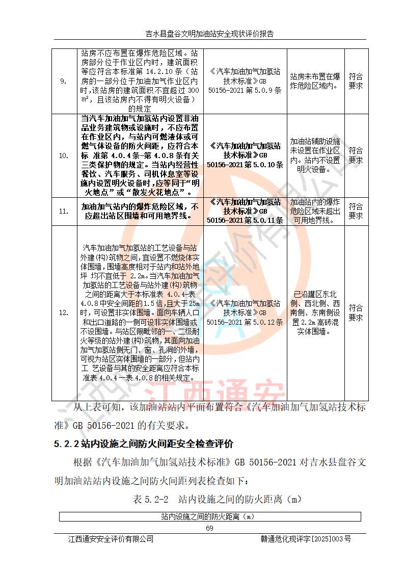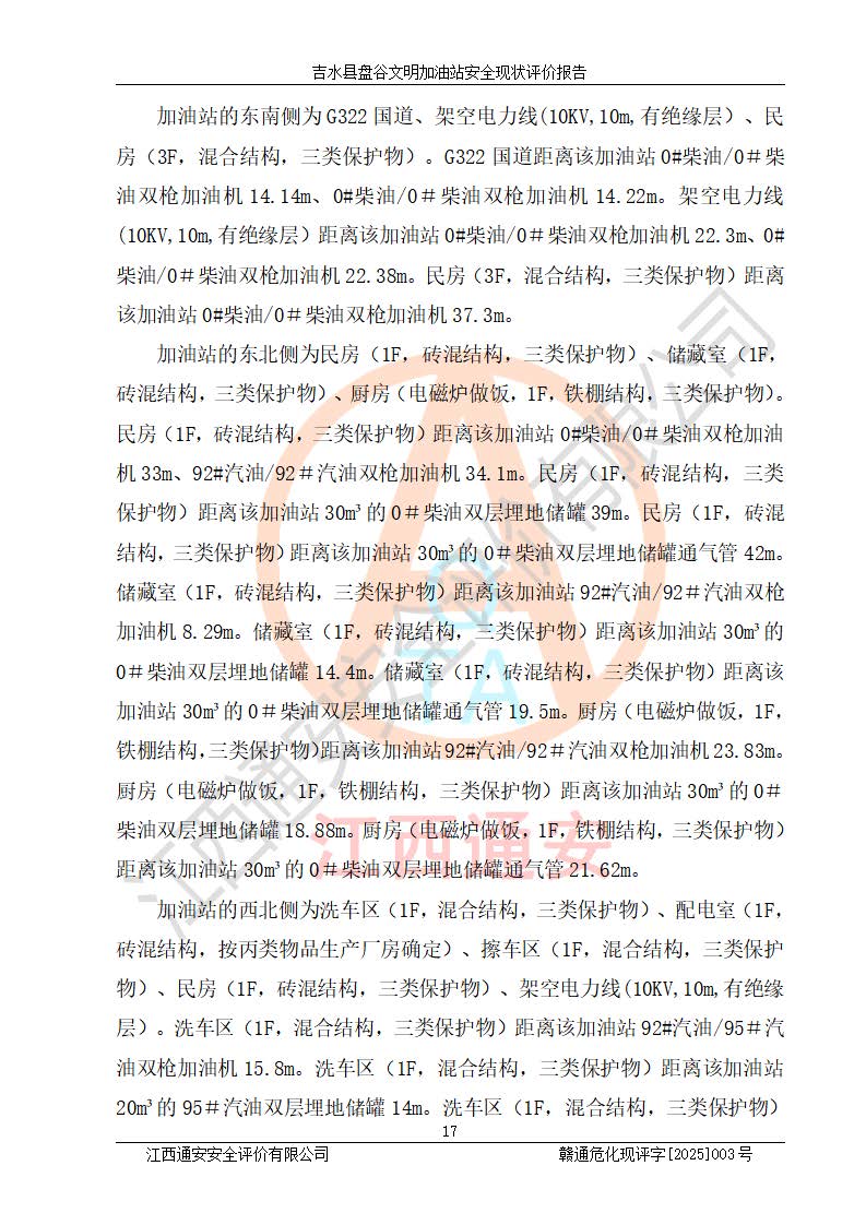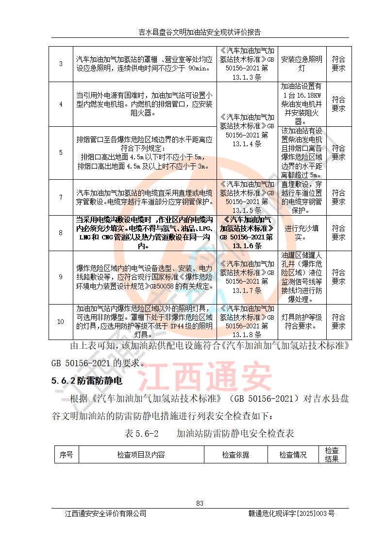 其它 | 在對該項(xiàng)目危險、有害因素辨識分析的基礎(chǔ)上,運(yùn)用安全檢查表、預(yù)作業(yè)條件危險性分析法、危險度評價、重大事故后果分析結(jié)果等評價方法對該項(xiàng)目進(jìn)行了分析評價,評價結(jié)果如下: 1、該項(xiàng)目位于江西省吉安市吉水縣盤谷鎮(zhèn)文明村,符合當(dāng)?shù)匾?guī)劃,與周邊環(huán)境的距離符合有關(guān)標(biāo)準(zhǔn)、規(guī)范的要求。 2、總圖布置分區(qū)明確,布局合理,各建構(gòu)筑物的防火間距滿足規(guī)范要求。 3、該項(xiàng)目無**明令淘汰的工藝,設(shè)備、設(shè)施與工藝條件、內(nèi)部介質(zhì)相適應(yīng),特種設(shè)備及設(shè)施較齊全,按規(guī)定設(shè)置防雷、防靜電接地,爆炸危險環(huán)境加油機(jī)按要求采用防爆型,符合相關(guān)標(biāo)準(zhǔn)規(guī)范要求。 5、企業(yè)設(shè)置了安全生產(chǎn)管理機(jī)構(gòu),配備了專職安全生產(chǎn)管理人員,建立了安全生產(chǎn)責(zé)任制和安全生產(chǎn)管理制度,編制了崗位操作規(guī)程,編制了生產(chǎn)安全事故應(yīng)急預(yù)案,人員經(jīng)過相應(yīng)的培訓(xùn),企業(yè)的安全生產(chǎn)管理正常。 6、作業(yè)條件危險性評價結(jié)果:在選定的評價單元中,作業(yè)危險程度均為“一般危險,需要注意”,作業(yè)條件相對安全。 7、危險度評價結(jié)果:汽油儲罐的危險程度為中度危險。油罐采用雙層罐埋地設(shè)置,按要求設(shè)置了通氣管,并裝設(shè)了阻火器;設(shè)置了液位監(jiān)測報警系統(tǒng)和緊急切斷系統(tǒng),埋地加油管道設(shè)置雙層管道,可以滿足安全生產(chǎn)條件要求。 評價結(jié)論: 吉水縣盤谷文明加油站符合《汽車加油加氣加氫站技術(shù)標(biāo)準(zhǔn)》GB50156-2021等標(biāo)準(zhǔn)規(guī)范的要求,安全風(fēng)險可控,滿足危險化學(xué)品經(jīng)營的安全條件。 | ||||