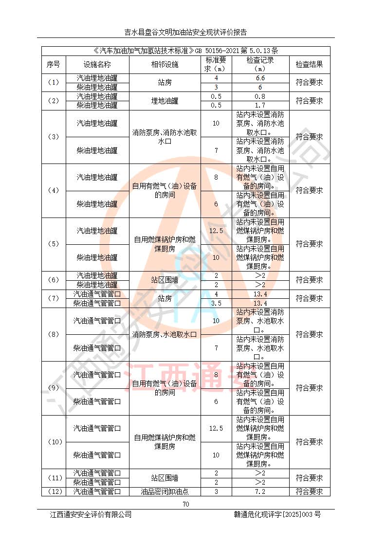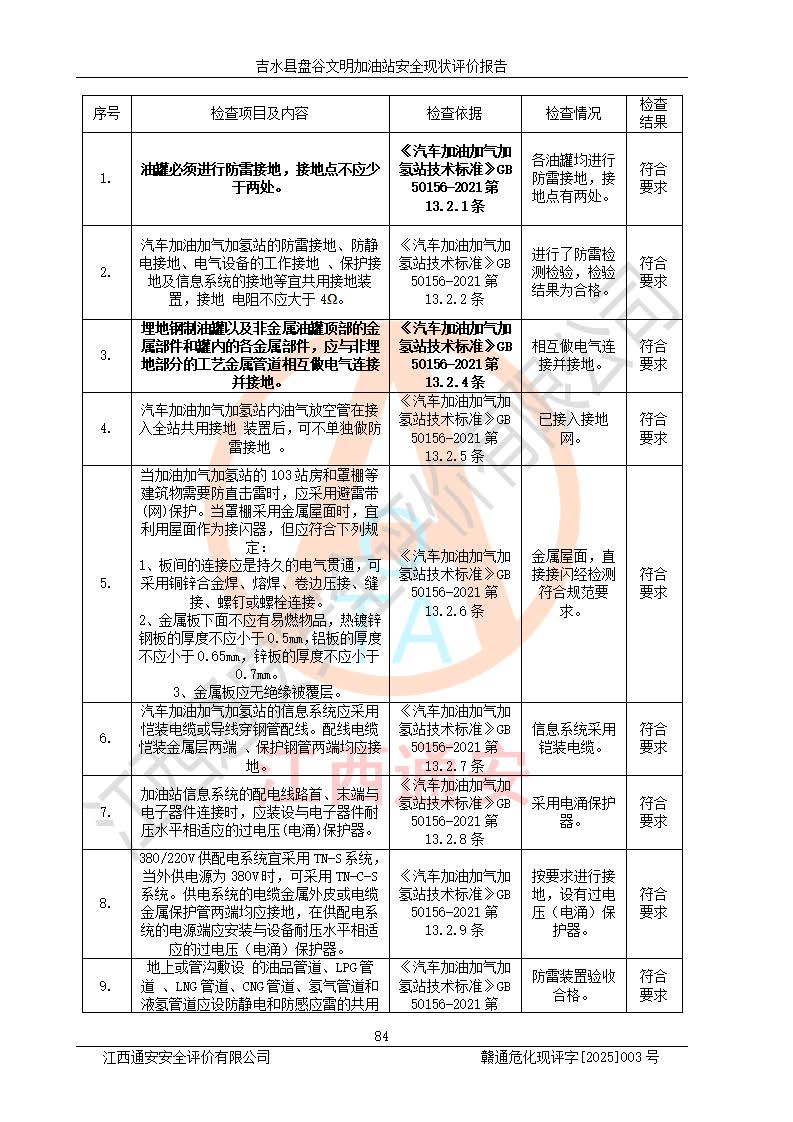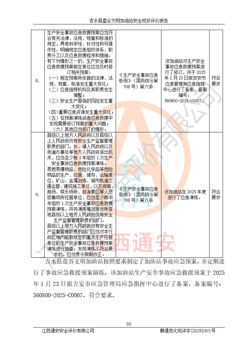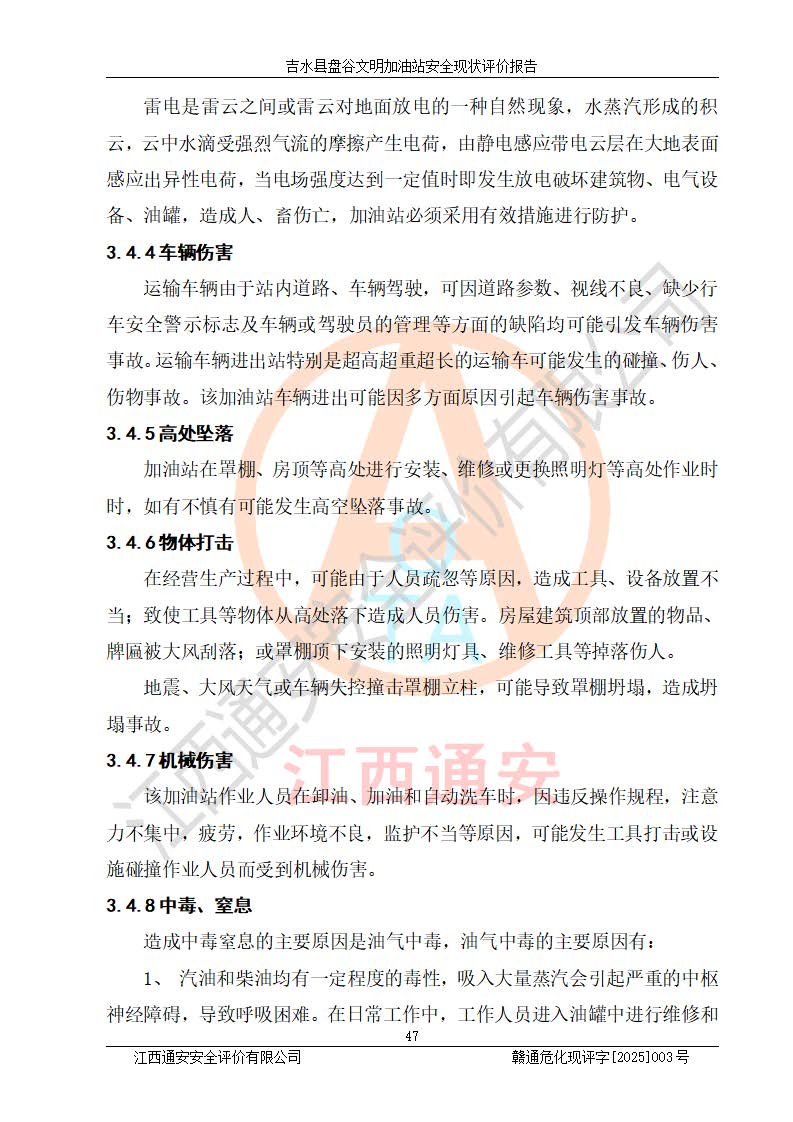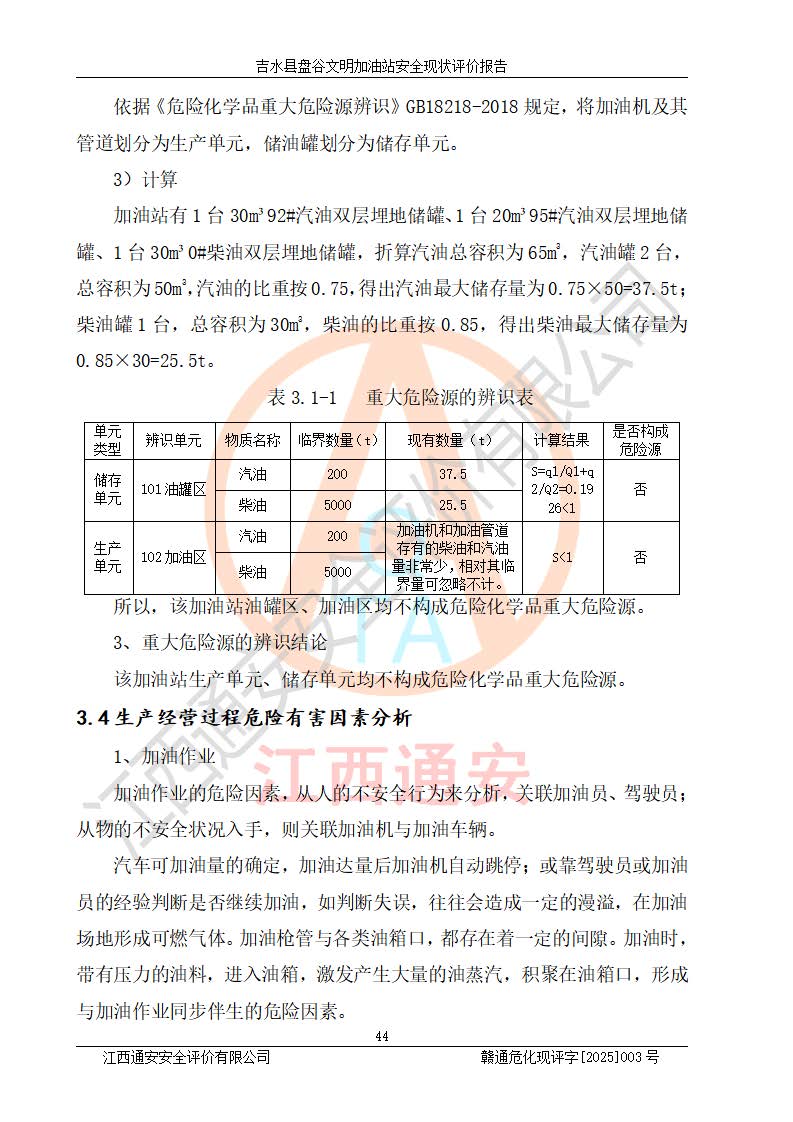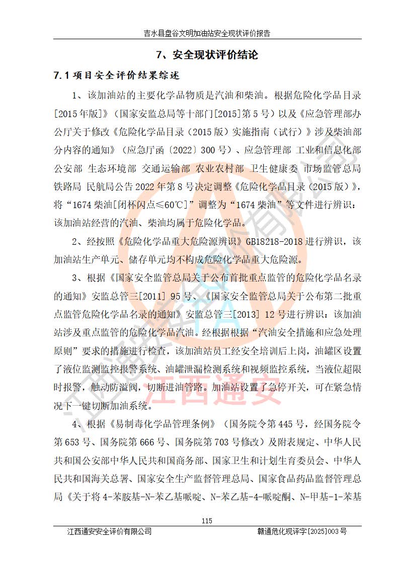 其它 | 在對該項(xiàng)目危險、有害因素辨識分析的基礎(chǔ)上,運(yùn)用安全檢查表、預(yù)作業(yè)條件危險性分析法、危險度評價、重大事故后果分析結(jié)果等評價方法對該項(xiàng)目進(jìn)行了分析評價,評價結(jié)果如下: 1、該項(xiàng)目位于江西省吉安市吉水縣盤谷鎮(zhèn)文明村,符合當(dāng)?shù)匾?guī)劃,與周邊環(huán)境的距離符合有關(guān)標(biāo)準(zhǔn)、規(guī)范的要求。 2、總圖布置分區(qū)明確,布局合理,各建構(gòu)筑物的防火間距滿足規(guī)范要求。 3、該項(xiàng)目無**明令淘汰的工藝,設(shè)備、設(shè)施與工藝條件、內(nèi)部介質(zhì)相適應(yīng),特種設(shè)備及設(shè)施較齊全,按規(guī)定設(shè)置防雷、防靜電接地,爆炸危險環(huán)境加油機(jī)按要求采用防爆型,符合相關(guān)標(biāo)準(zhǔn)規(guī)范要求。 5、企業(yè)設(shè)置了安全生產(chǎn)管理機(jī)構(gòu),配備了專職安全生產(chǎn)管理人員,建立了安全生產(chǎn)責(zé)任制和安全生產(chǎn)管理制度,編制了崗位操作規(guī)程,編制了生產(chǎn)安全事故應(yīng)急預(yù)案,人員經(jīng)過相應(yīng)的培訓(xùn),企業(yè)的安全生產(chǎn)管理正常。 6、作業(yè)條件危險性評價結(jié)果:在選定的評價單元中,作業(yè)危險程度均為“一般危險,需要注意”,作業(yè)條件相對安全。 7、危險度評價結(jié)果:汽油儲罐的危險程度為中度危險。油罐采用雙層罐埋地設(shè)置,按要求設(shè)置了通氣管,并裝設(shè)了阻火器;設(shè)置了液位監(jiān)測報警系統(tǒng)和緊急切斷系統(tǒng),埋地加油管道設(shè)置雙層管道,可以滿足安全生產(chǎn)條件要求。 評價結(jié)論: 吉水縣盤谷文明加油站符合《汽車加油加氣加氫站技術(shù)標(biāo)準(zhǔn)》GB50156-2021等標(biāo)準(zhǔn)規(guī)范的要求,安全風(fēng)險可控,滿足危險化學(xué)品經(jīng)營的安全條件。 | ||||