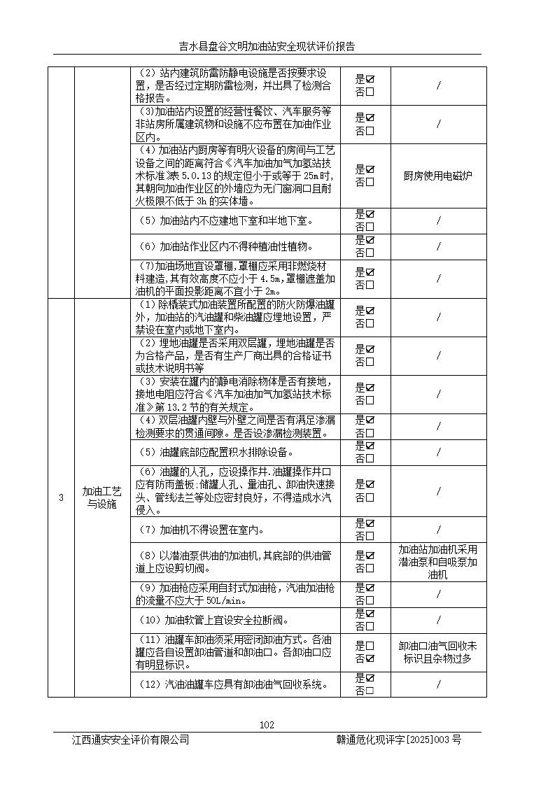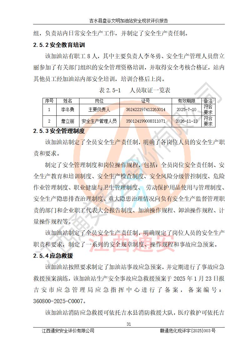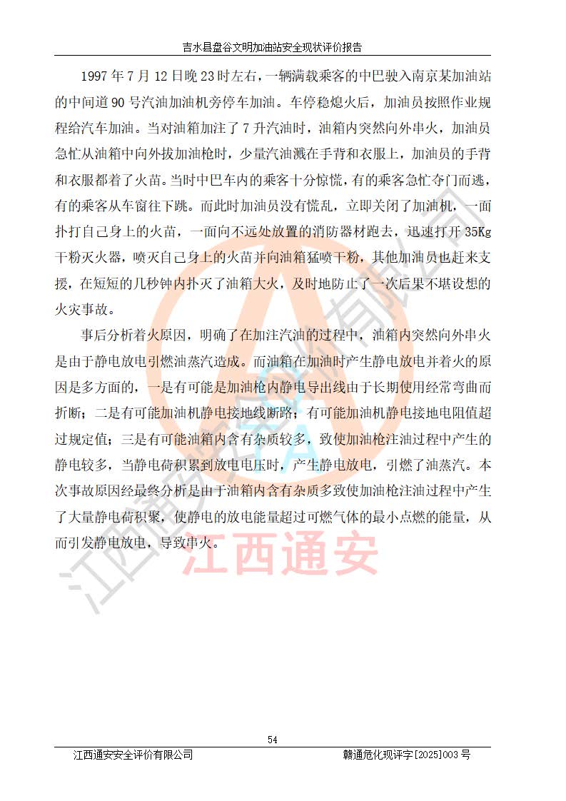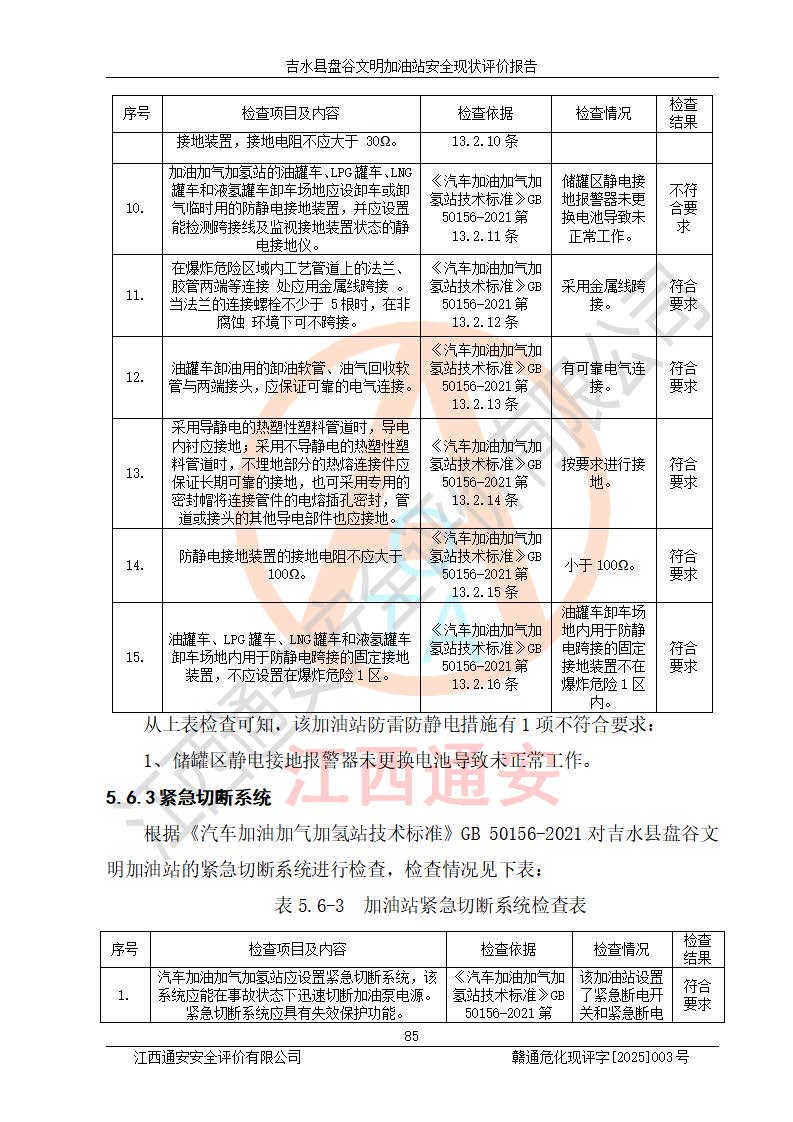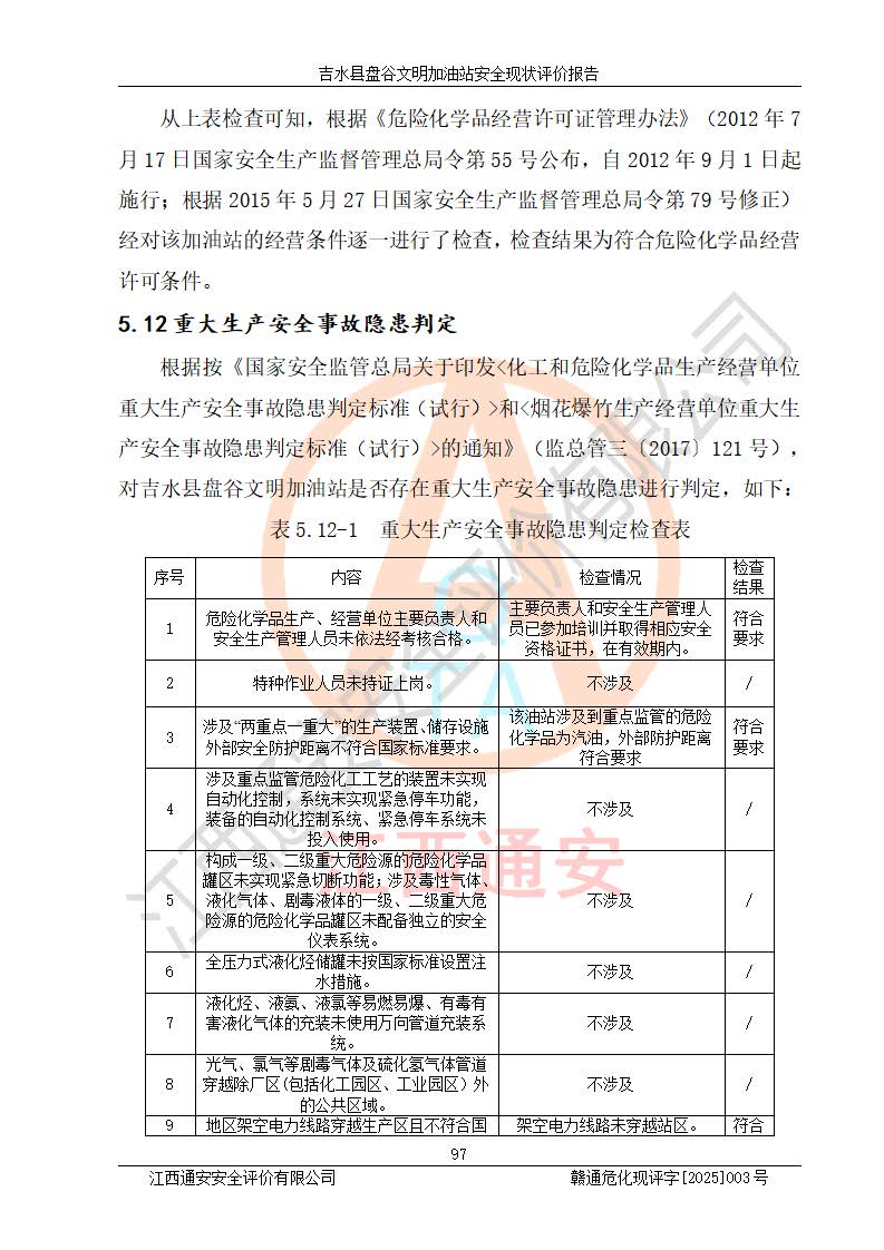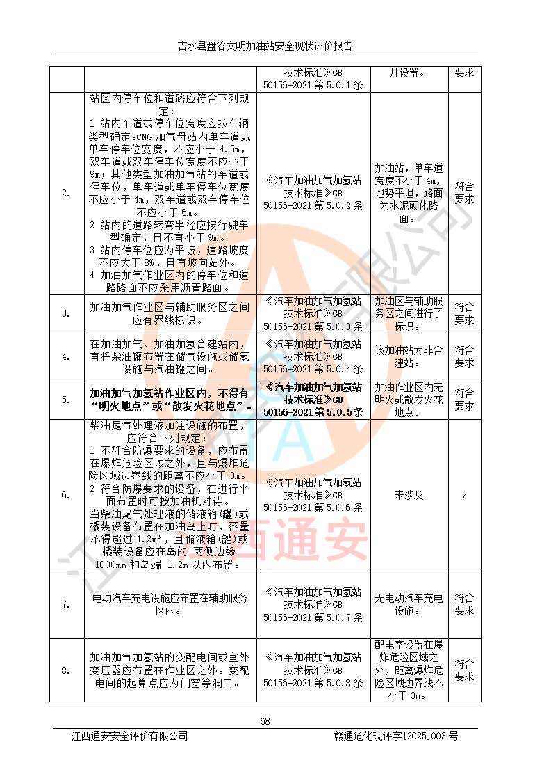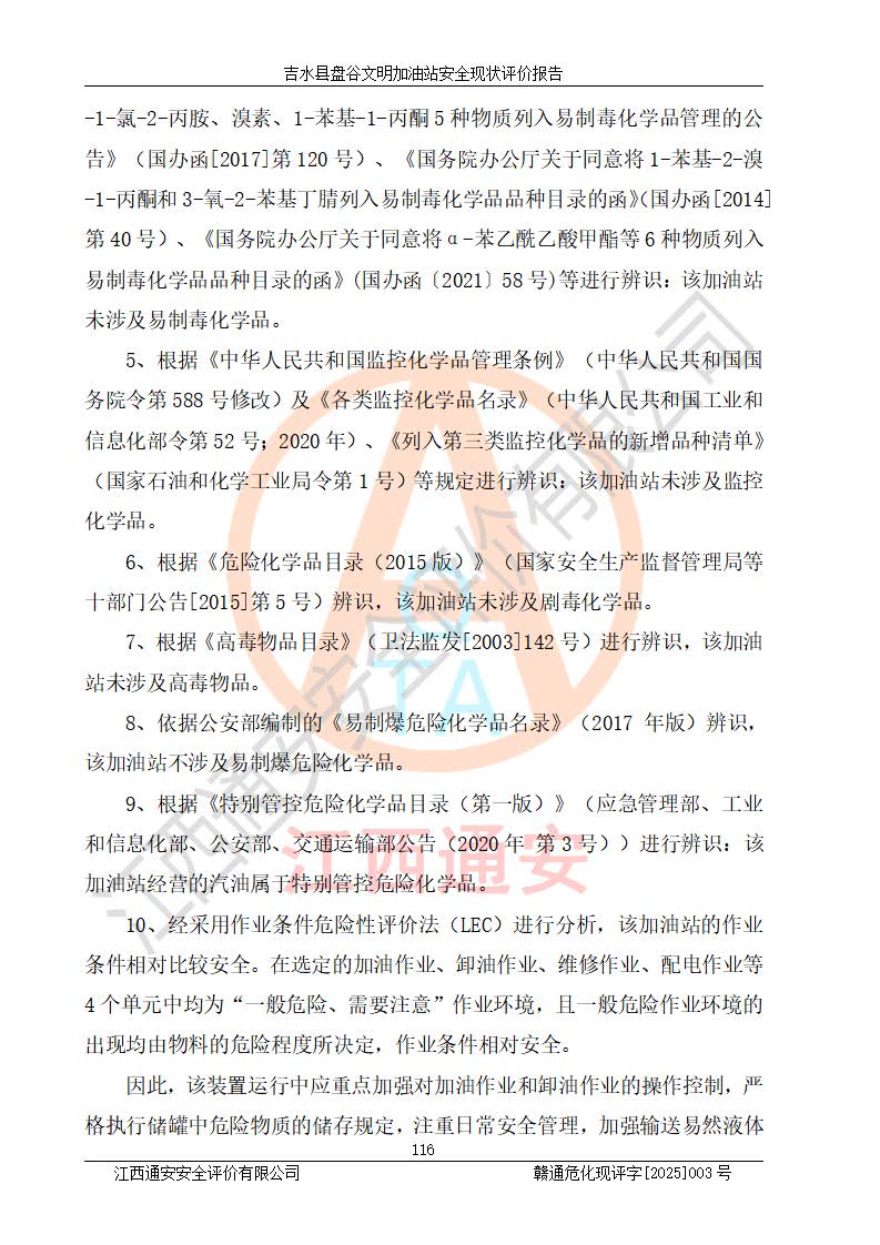 其它 | 在對該項(xiàng)目危險、有害因素辨識分析的基礎(chǔ)上,運(yùn)用安全檢查表、預(yù)作業(yè)條件危險性分析法、危險度評價、重大事故后果分析結(jié)果等評價方法對該項(xiàng)目進(jìn)行了分析評價,評價結(jié)果如下: 1、該項(xiàng)目位于江西省吉安市吉水縣盤谷鎮(zhèn)文明村,符合當(dāng)?shù)匾?guī)劃,與周邊環(huán)境的距離符合有關(guān)標(biāo)準(zhǔn)、規(guī)范的要求。 2、總圖布置分區(qū)明確,布局合理,各建構(gòu)筑物的防火間距滿足規(guī)范要求。 3、該項(xiàng)目無**明令淘汰的工藝,設(shè)備、設(shè)施與工藝條件、內(nèi)部介質(zhì)相適應(yīng),特種設(shè)備及設(shè)施較齊全,按規(guī)定設(shè)置防雷、防靜電接地,爆炸危險環(huán)境加油機(jī)按要求采用防爆型,符合相關(guān)標(biāo)準(zhǔn)規(guī)范要求。 5、企業(yè)設(shè)置了安全生產(chǎn)管理機(jī)構(gòu),配備了專職安全生產(chǎn)管理人員,建立了安全生產(chǎn)責(zé)任制和安全生產(chǎn)管理制度,編制了崗位操作規(guī)程,編制了生產(chǎn)安全事故應(yīng)急預(yù)案,人員經(jīng)過相應(yīng)的培訓(xùn),企業(yè)的安全生產(chǎn)管理正常。 6、作業(yè)條件危險性評價結(jié)果:在選定的評價單元中,作業(yè)危險程度均為“一般危險,需要注意”,作業(yè)條件相對安全。 7、危險度評價結(jié)果:汽油儲罐的危險程度為中度危險。油罐采用雙層罐埋地設(shè)置,按要求設(shè)置了通氣管,并裝設(shè)了阻火器;設(shè)置了液位監(jiān)測報警系統(tǒng)和緊急切斷系統(tǒng),埋地加油管道設(shè)置雙層管道,可以滿足安全生產(chǎn)條件要求。 評價結(jié)論: 吉水縣盤谷文明加油站符合《汽車加油加氣加氫站技術(shù)標(biāo)準(zhǔn)》GB50156-2021等標(biāo)準(zhǔn)規(guī)范的要求,安全風(fēng)險可控,滿足危險化學(xué)品經(jīng)營的安全條件。 | ||||