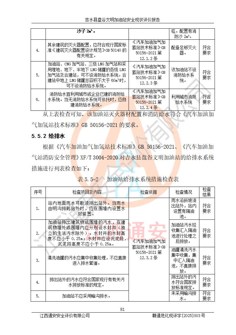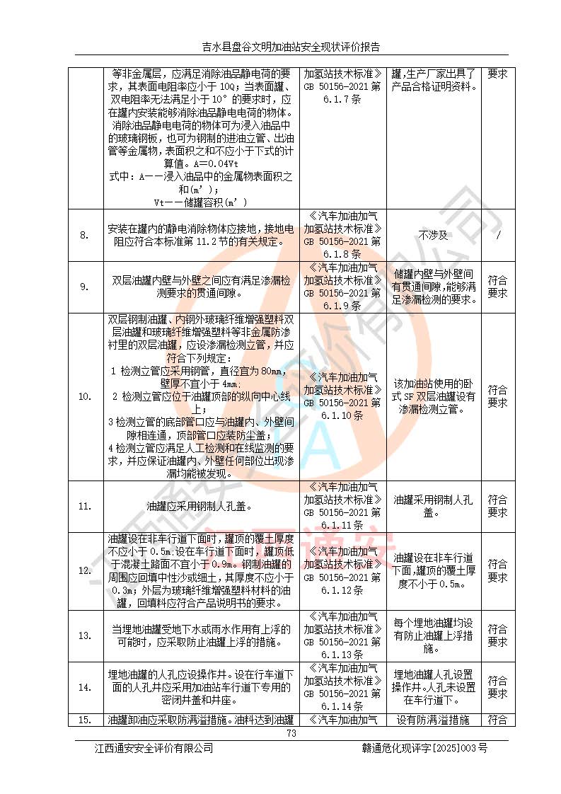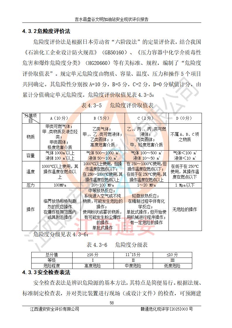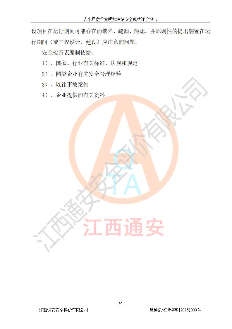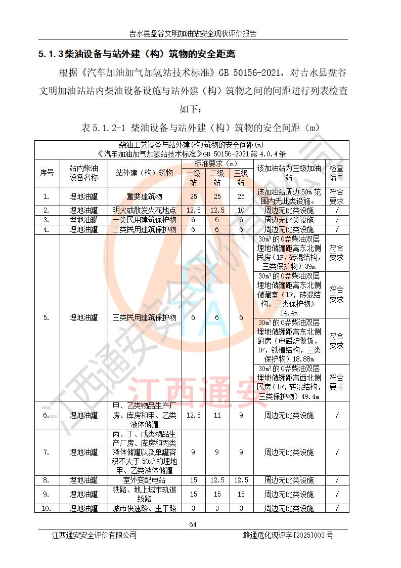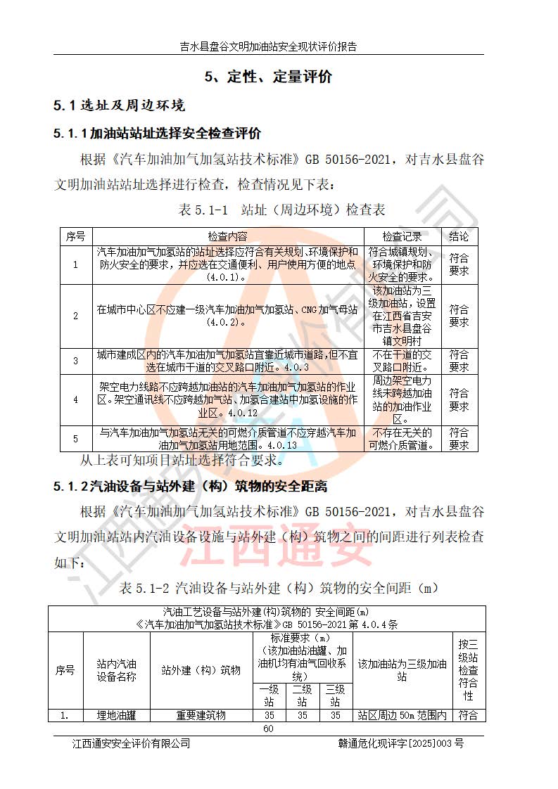 其它 | 在對該項(xiàng)目危險、有害因素辨識分析的基礎(chǔ)上,運(yùn)用安全檢查表、預(yù)作業(yè)條件危險性分析法、危險度評價、重大事故后果分析結(jié)果等評價方法對該項(xiàng)目進(jìn)行了分析評價,評價結(jié)果如下: 1、該項(xiàng)目位于江西省吉安市吉水縣盤谷鎮(zhèn)文明村,符合當(dāng)?shù)匾?guī)劃,與周邊環(huán)境的距離符合有關(guān)標(biāo)準(zhǔn)、規(guī)范的要求。 2、總圖布置分區(qū)明確,布局合理,各建構(gòu)筑物的防火間距滿足規(guī)范要求。 3、該項(xiàng)目無**明令淘汰的工藝,設(shè)備、設(shè)施與工藝條件、內(nèi)部介質(zhì)相適應(yīng),特種設(shè)備及設(shè)施較齊全,按規(guī)定設(shè)置防雷、防靜電接地,爆炸危險環(huán)境加油機(jī)按要求采用防爆型,符合相關(guān)標(biāo)準(zhǔn)規(guī)范要求。 5、企業(yè)設(shè)置了安全生產(chǎn)管理機(jī)構(gòu),配備了專職安全生產(chǎn)管理人員,建立了安全生產(chǎn)責(zé)任制和安全生產(chǎn)管理制度,編制了崗位操作規(guī)程,編制了生產(chǎn)安全事故應(yīng)急預(yù)案,人員經(jīng)過相應(yīng)的培訓(xùn),企業(yè)的安全生產(chǎn)管理正常。 6、作業(yè)條件危險性評價結(jié)果:在選定的評價單元中,作業(yè)危險程度均為“一般危險,需要注意”,作業(yè)條件相對安全。 7、危險度評價結(jié)果:汽油儲罐的危險程度為中度危險。油罐采用雙層罐埋地設(shè)置,按要求設(shè)置了通氣管,并裝設(shè)了阻火器;設(shè)置了液位監(jiān)測報警系統(tǒng)和緊急切斷系統(tǒng),埋地加油管道設(shè)置雙層管道,可以滿足安全生產(chǎn)條件要求。 評價結(jié)論: 吉水縣盤谷文明加油站符合《汽車加油加氣加氫站技術(shù)標(biāo)準(zhǔn)》GB50156-2021等標(biāo)準(zhǔn)規(guī)范的要求,安全風(fēng)險可控,滿足危險化學(xué)品經(jīng)營的安全條件。 | ||||