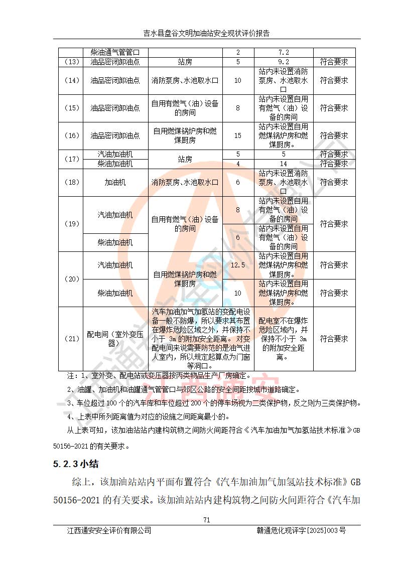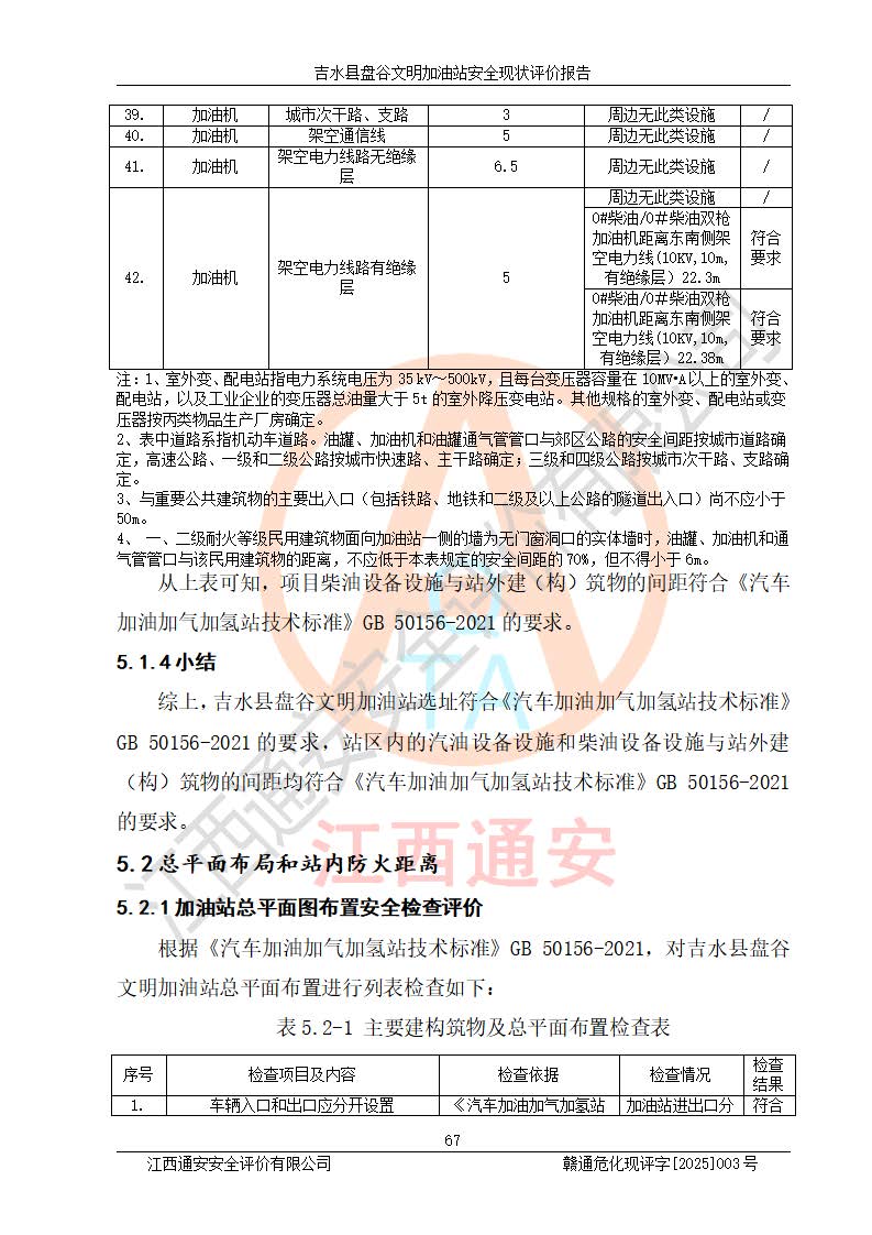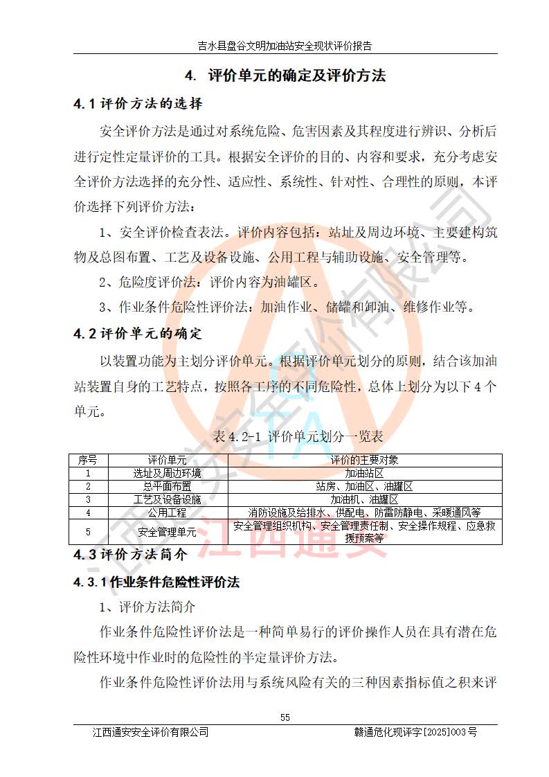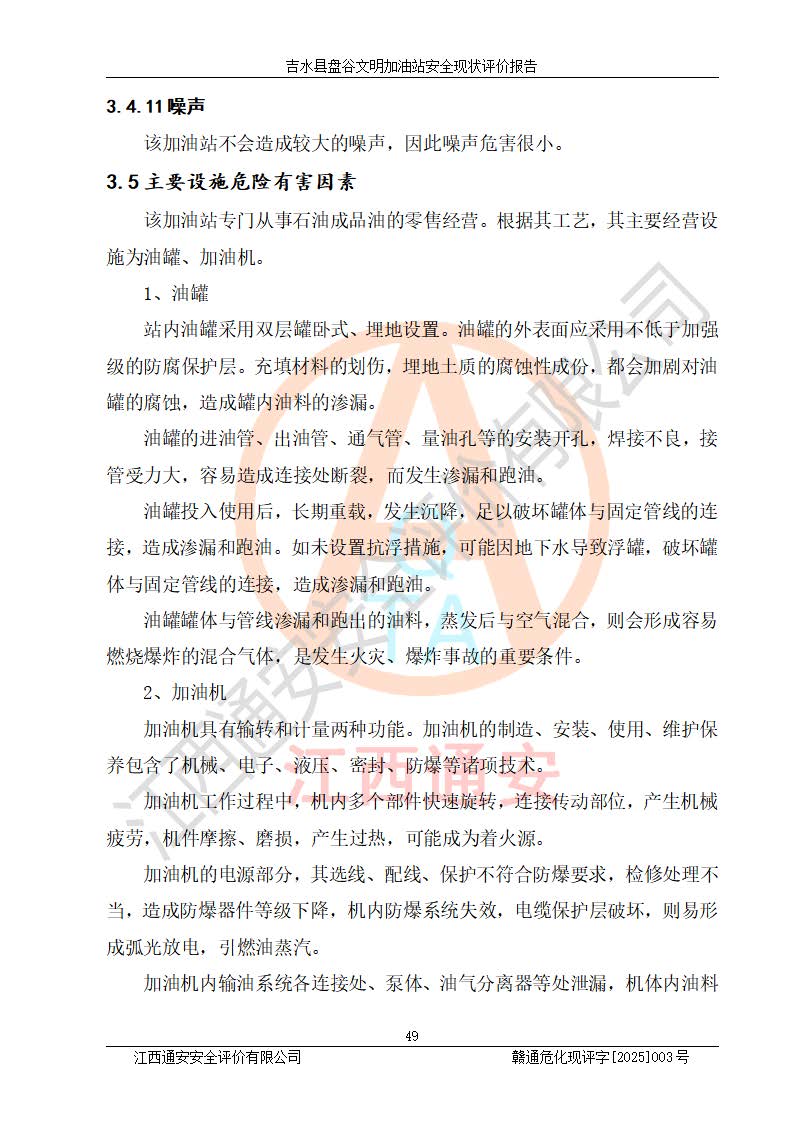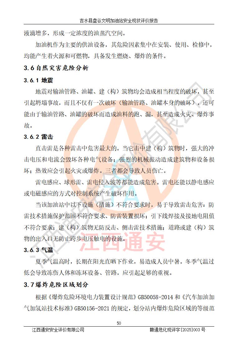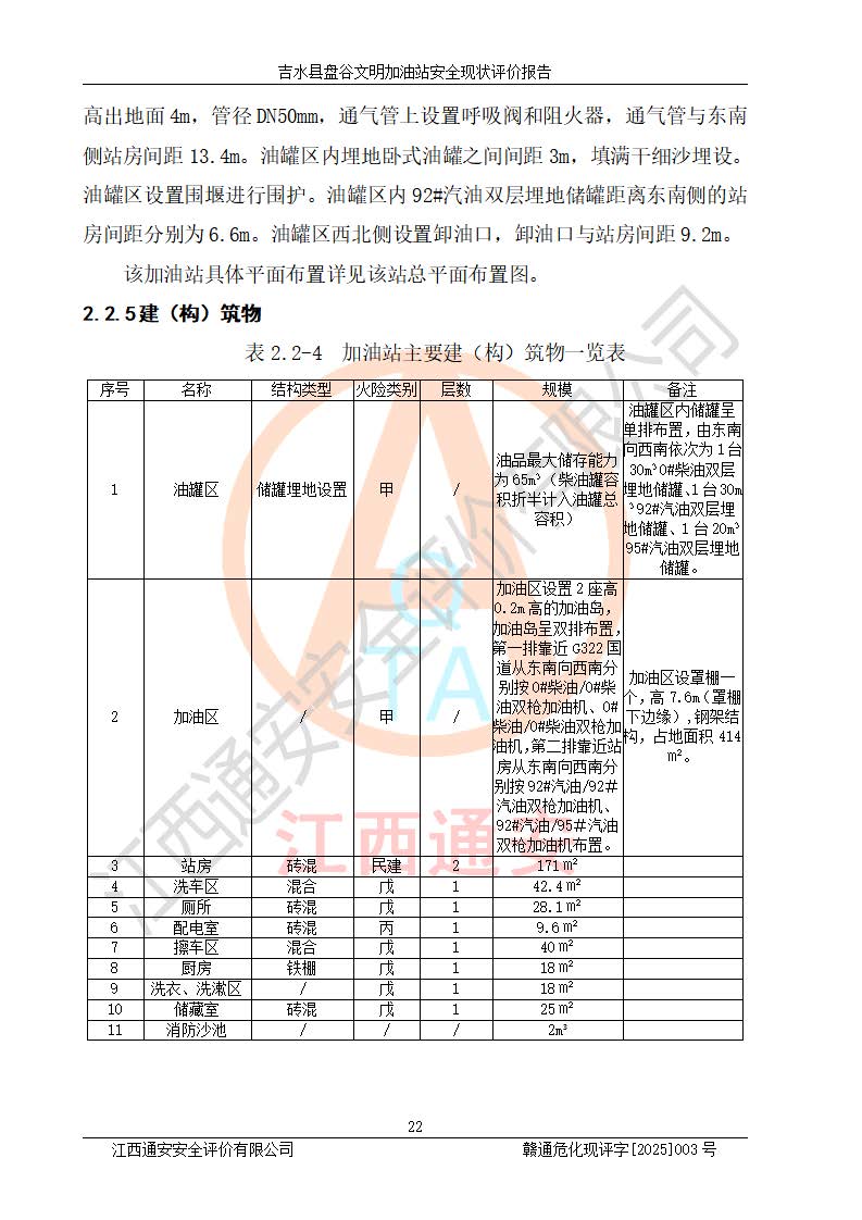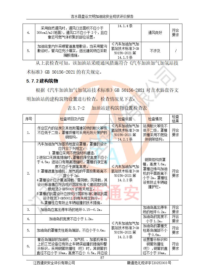其它 | 在對該項(xiàng)目危險、有害因素辨識分析的基礎(chǔ)上,運(yùn)用安全檢查表、預(yù)作業(yè)條件危險性分析法、危險度評價、重大事故后果分析結(jié)果等評價方法對該項(xiàng)目進(jìn)行了分析評價,評價結(jié)果如下: 1、該項(xiàng)目位于江西省吉安市吉水縣盤谷鎮(zhèn)文明村,符合當(dāng)?shù)匾?guī)劃,與周邊環(huán)境的距離符合有關(guān)標(biāo)準(zhǔn)、規(guī)范的要求。 2、總圖布置分區(qū)明確,布局合理,各建構(gòu)筑物的防火間距滿足規(guī)范要求。 3、該項(xiàng)目無**明令淘汰的工藝,設(shè)備、設(shè)施與工藝條件、內(nèi)部介質(zhì)相適應(yīng),特種設(shè)備及設(shè)施較齊全,按規(guī)定設(shè)置防雷、防靜電接地,爆炸危險環(huán)境加油機(jī)按要求采用防爆型,符合相關(guān)標(biāo)準(zhǔn)規(guī)范要求。 5、企業(yè)設(shè)置了安全生產(chǎn)管理機(jī)構(gòu),配備了專職安全生產(chǎn)管理人員,建立了安全生產(chǎn)責(zé)任制和安全生產(chǎn)管理制度,編制了崗位操作規(guī)程,編制了生產(chǎn)安全事故應(yīng)急預(yù)案,人員經(jīng)過相應(yīng)的培訓(xùn),企業(yè)的安全生產(chǎn)管理正常。 6、作業(yè)條件危險性評價結(jié)果:在選定的評價單元中,作業(yè)危險程度均為“一般危險,需要注意”,作業(yè)條件相對安全。 7、危險度評價結(jié)果:汽油儲罐的危險程度為中度危險。油罐采用雙層罐埋地設(shè)置,按要求設(shè)置了通氣管,并裝設(shè)了阻火器;設(shè)置了液位監(jiān)測報警系統(tǒng)和緊急切斷系統(tǒng),埋地加油管道設(shè)置雙層管道,可以滿足安全生產(chǎn)條件要求。 評價結(jié)論: 吉水縣盤谷文明加油站符合《汽車加油加氣加氫站技術(shù)標(biāo)準(zhǔn)》GB50156-2021等標(biāo)準(zhǔn)規(guī)范的要求,安全風(fēng)險可控,滿足危險化學(xué)品經(jīng)營的安全條件。 | ||||