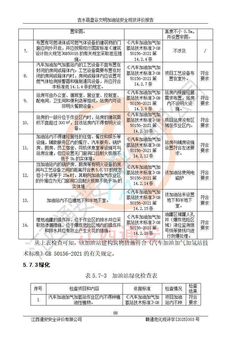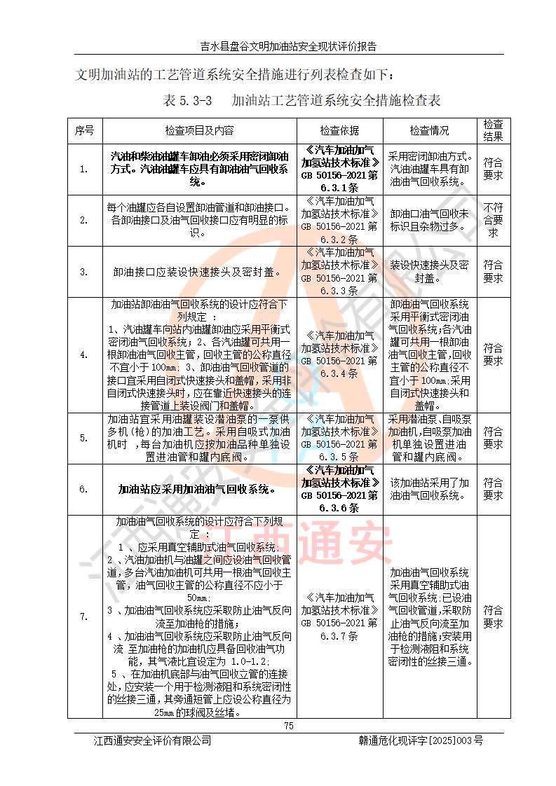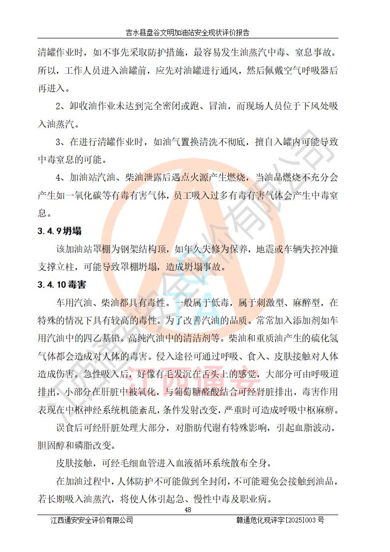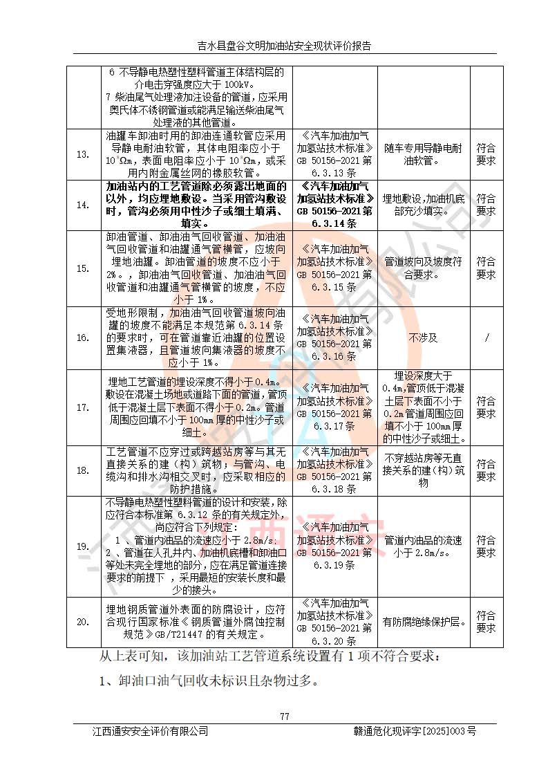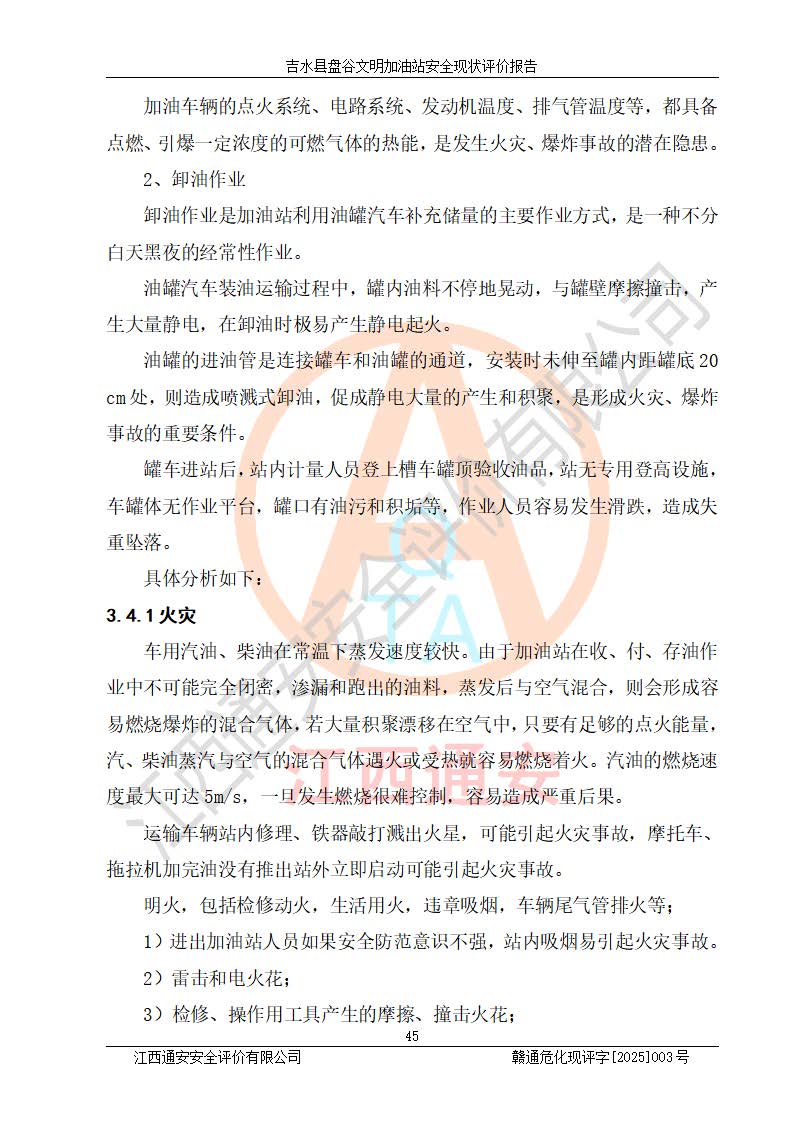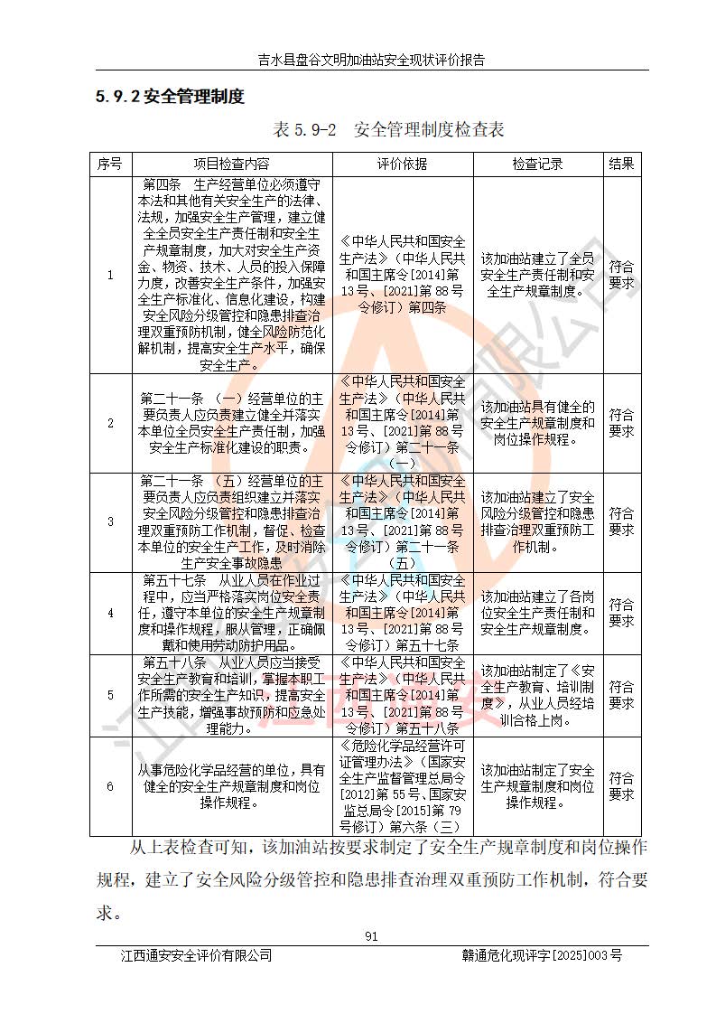 其它 | 在對該項(xiàng)目危險、有害因素辨識分析的基礎(chǔ)上,運(yùn)用安全檢查表、預(yù)作業(yè)條件危險性分析法、危險度評價、重大事故后果分析結(jié)果等評價方法對該項(xiàng)目進(jìn)行了分析評價,評價結(jié)果如下: 1、該項(xiàng)目位于江西省吉安市吉水縣盤谷鎮(zhèn)文明村,符合當(dāng)?shù)匾?guī)劃,與周邊環(huán)境的距離符合有關(guān)標(biāo)準(zhǔn)、規(guī)范的要求。 2、總圖布置分區(qū)明確,布局合理,各建構(gòu)筑物的防火間距滿足規(guī)范要求。 3、該項(xiàng)目無**明令淘汰的工藝,設(shè)備、設(shè)施與工藝條件、內(nèi)部介質(zhì)相適應(yīng),特種設(shè)備及設(shè)施較齊全,按規(guī)定設(shè)置防雷、防靜電接地,爆炸危險環(huán)境加油機(jī)按要求采用防爆型,符合相關(guān)標(biāo)準(zhǔn)規(guī)范要求。 5、企業(yè)設(shè)置了安全生產(chǎn)管理機(jī)構(gòu),配備了專職安全生產(chǎn)管理人員,建立了安全生產(chǎn)責(zé)任制和安全生產(chǎn)管理制度,編制了崗位操作規(guī)程,編制了生產(chǎn)安全事故應(yīng)急預(yù)案,人員經(jīng)過相應(yīng)的培訓(xùn),企業(yè)的安全生產(chǎn)管理正常。 6、作業(yè)條件危險性評價結(jié)果:在選定的評價單元中,作業(yè)危險程度均為“一般危險,需要注意”,作業(yè)條件相對安全。 7、危險度評價結(jié)果:汽油儲罐的危險程度為中度危險。油罐采用雙層罐埋地設(shè)置,按要求設(shè)置了通氣管,并裝設(shè)了阻火器;設(shè)置了液位監(jiān)測報警系統(tǒng)和緊急切斷系統(tǒng),埋地加油管道設(shè)置雙層管道,可以滿足安全生產(chǎn)條件要求。 評價結(jié)論: 吉水縣盤谷文明加油站符合《汽車加油加氣加氫站技術(shù)標(biāo)準(zhǔn)》GB50156-2021等標(biāo)準(zhǔn)規(guī)范的要求,安全風(fēng)險可控,滿足危險化學(xué)品經(jīng)營的安全條件。 | ||||