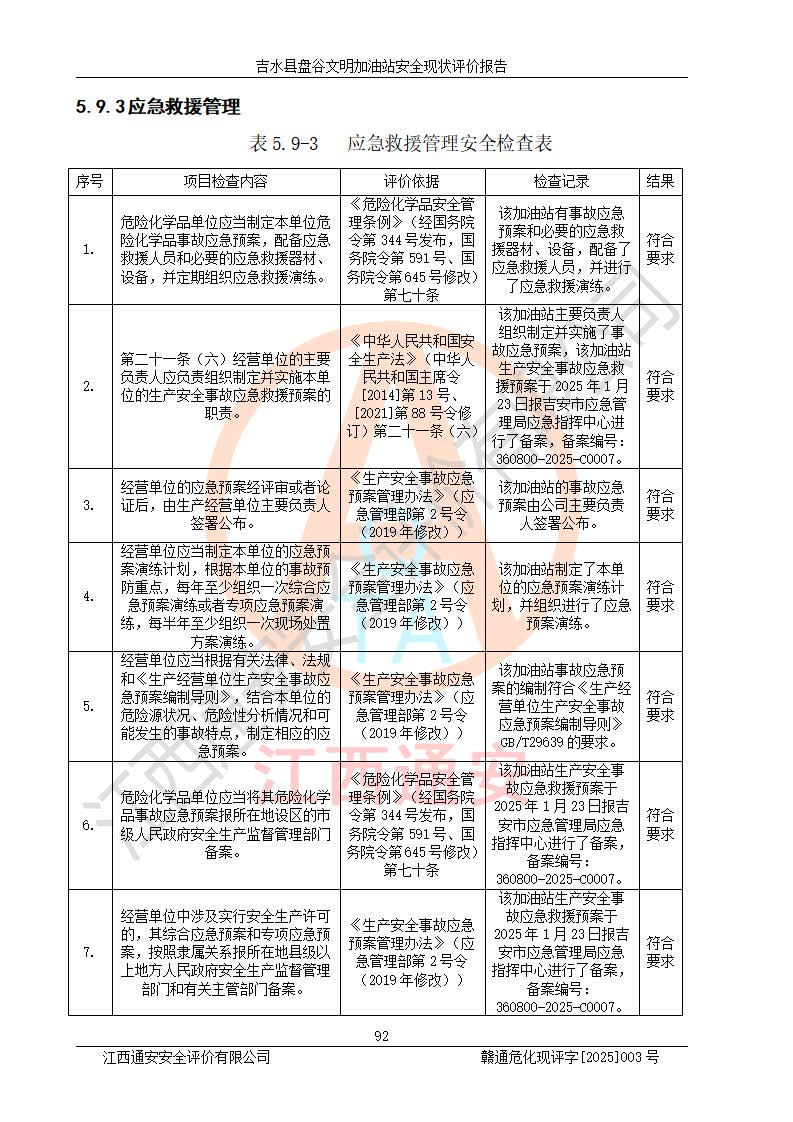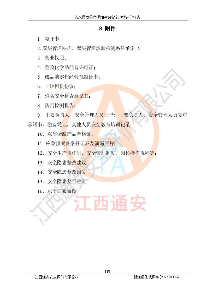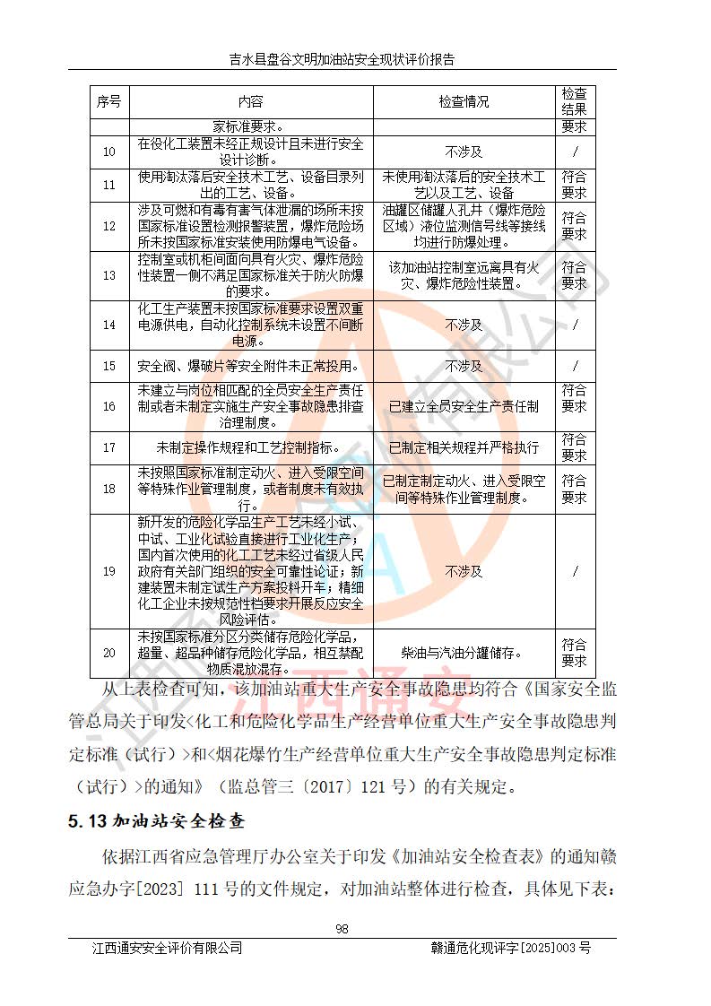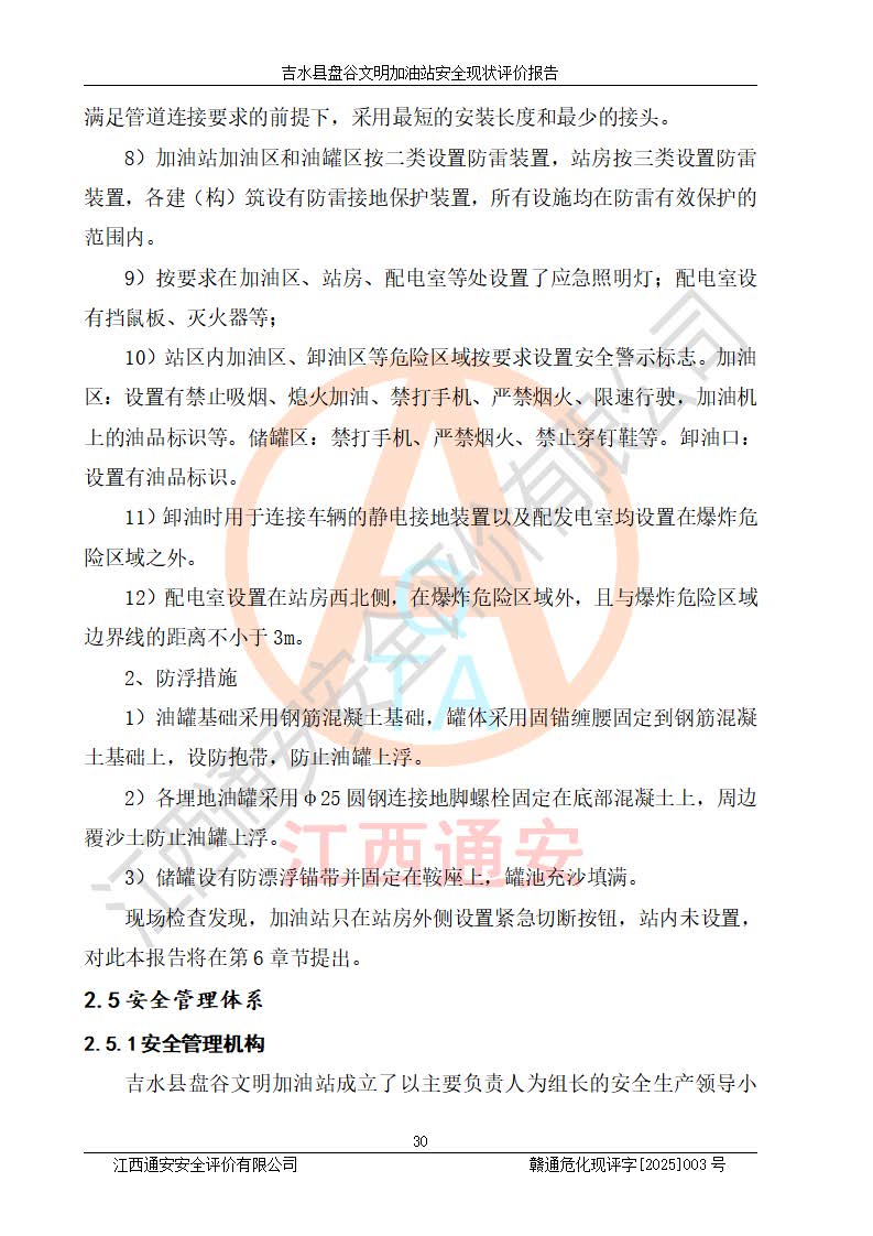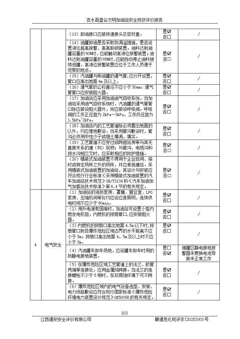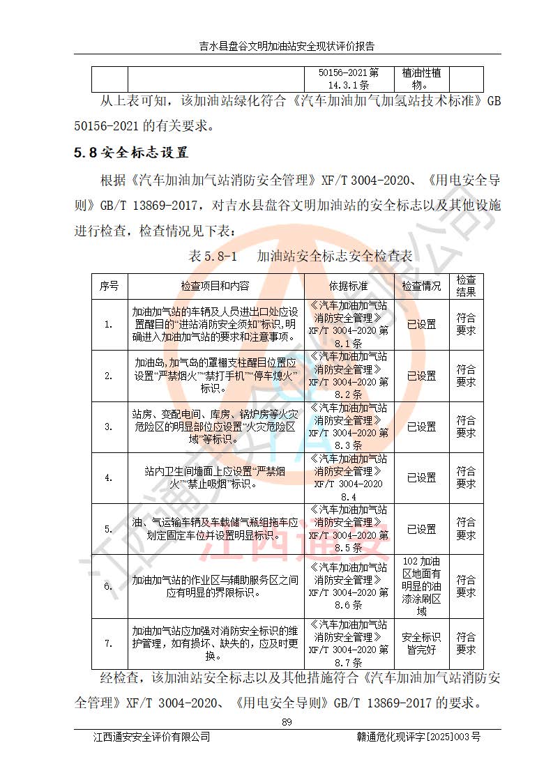 其它 | 在對該項(xiàng)目危險、有害因素辨識分析的基礎(chǔ)上,運(yùn)用安全檢查表、預(yù)作業(yè)條件危險性分析法、危險度評價、重大事故后果分析結(jié)果等評價方法對該項(xiàng)目進(jìn)行了分析評價,評價結(jié)果如下: 1、該項(xiàng)目位于江西省吉安市吉水縣盤谷鎮(zhèn)文明村,符合當(dāng)?shù)匾?guī)劃,與周邊環(huán)境的距離符合有關(guān)標(biāo)準(zhǔn)、規(guī)范的要求。 2、總圖布置分區(qū)明確,布局合理,各建構(gòu)筑物的防火間距滿足規(guī)范要求。 3、該項(xiàng)目無**明令淘汰的工藝,設(shè)備、設(shè)施與工藝條件、內(nèi)部介質(zhì)相適應(yīng),特種設(shè)備及設(shè)施較齊全,按規(guī)定設(shè)置防雷、防靜電接地,爆炸危險環(huán)境加油機(jī)按要求采用防爆型,符合相關(guān)標(biāo)準(zhǔn)規(guī)范要求。 5、企業(yè)設(shè)置了安全生產(chǎn)管理機(jī)構(gòu),配備了專職安全生產(chǎn)管理人員,建立了安全生產(chǎn)責(zé)任制和安全生產(chǎn)管理制度,編制了崗位操作規(guī)程,編制了生產(chǎn)安全事故應(yīng)急預(yù)案,人員經(jīng)過相應(yīng)的培訓(xùn),企業(yè)的安全生產(chǎn)管理正常。 6、作業(yè)條件危險性評價結(jié)果:在選定的評價單元中,作業(yè)危險程度均為“一般危險,需要注意”,作業(yè)條件相對安全。 7、危險度評價結(jié)果:汽油儲罐的危險程度為中度危險。油罐采用雙層罐埋地設(shè)置,按要求設(shè)置了通氣管,并裝設(shè)了阻火器;設(shè)置了液位監(jiān)測報警系統(tǒng)和緊急切斷系統(tǒng),埋地加油管道設(shè)置雙層管道,可以滿足安全生產(chǎn)條件要求。 評價結(jié)論: 吉水縣盤谷文明加油站符合《汽車加油加氣加氫站技術(shù)標(biāo)準(zhǔn)》GB50156-2021等標(biāo)準(zhǔn)規(guī)范的要求,安全風(fēng)險可控,滿足危險化學(xué)品經(jīng)營的安全條件。 | ||||