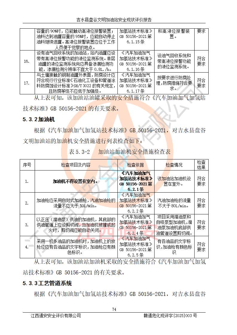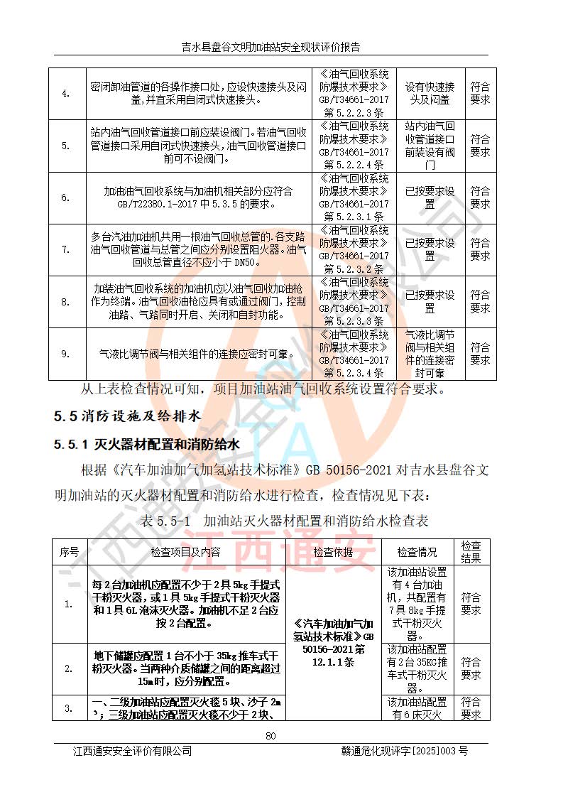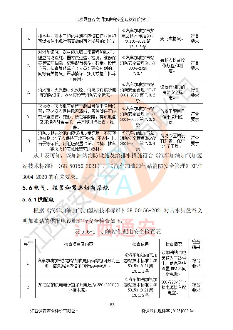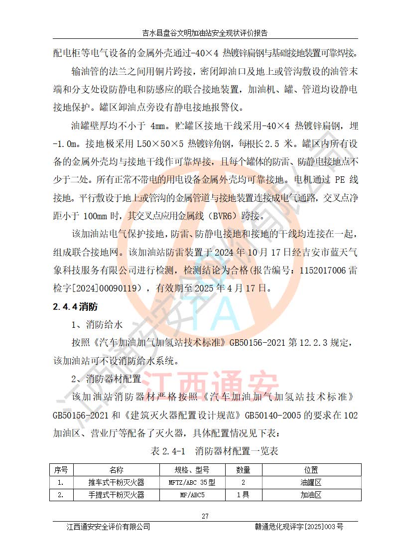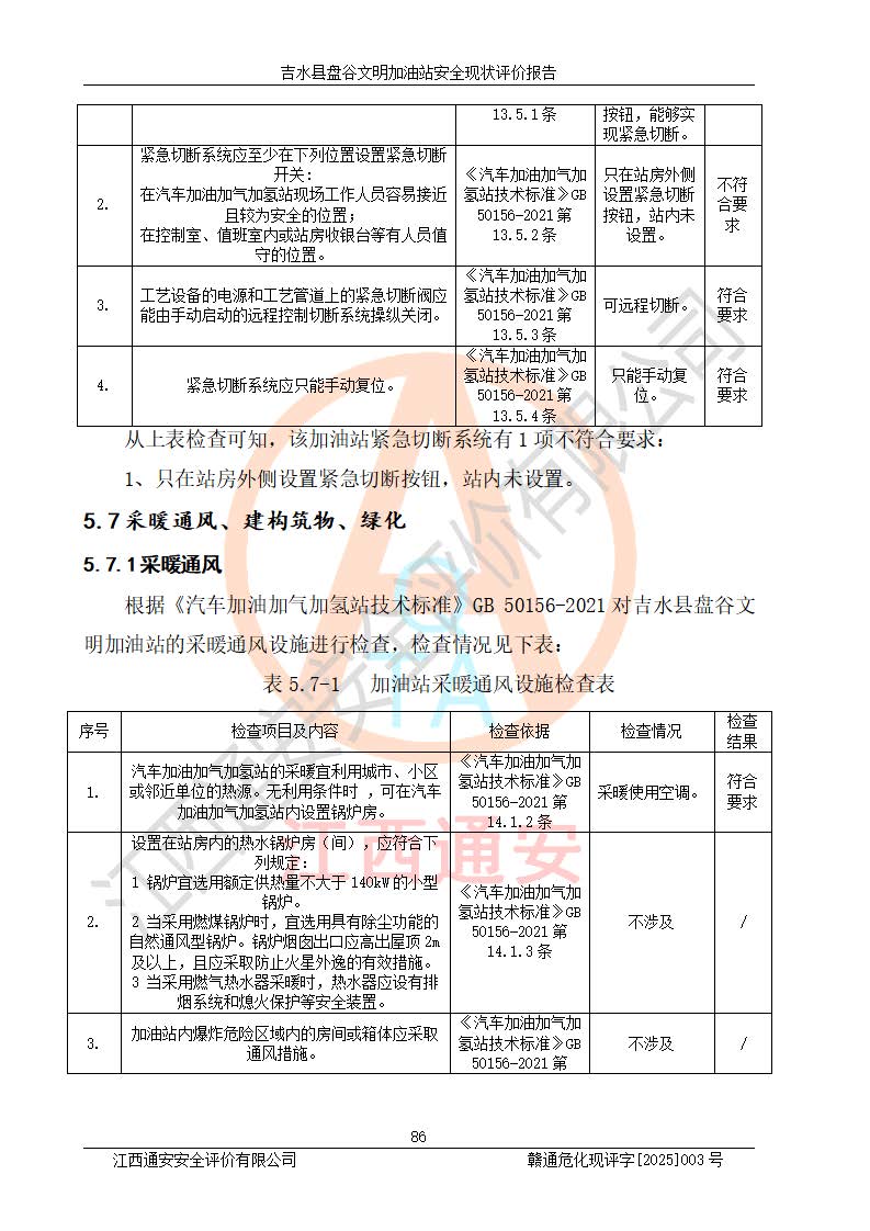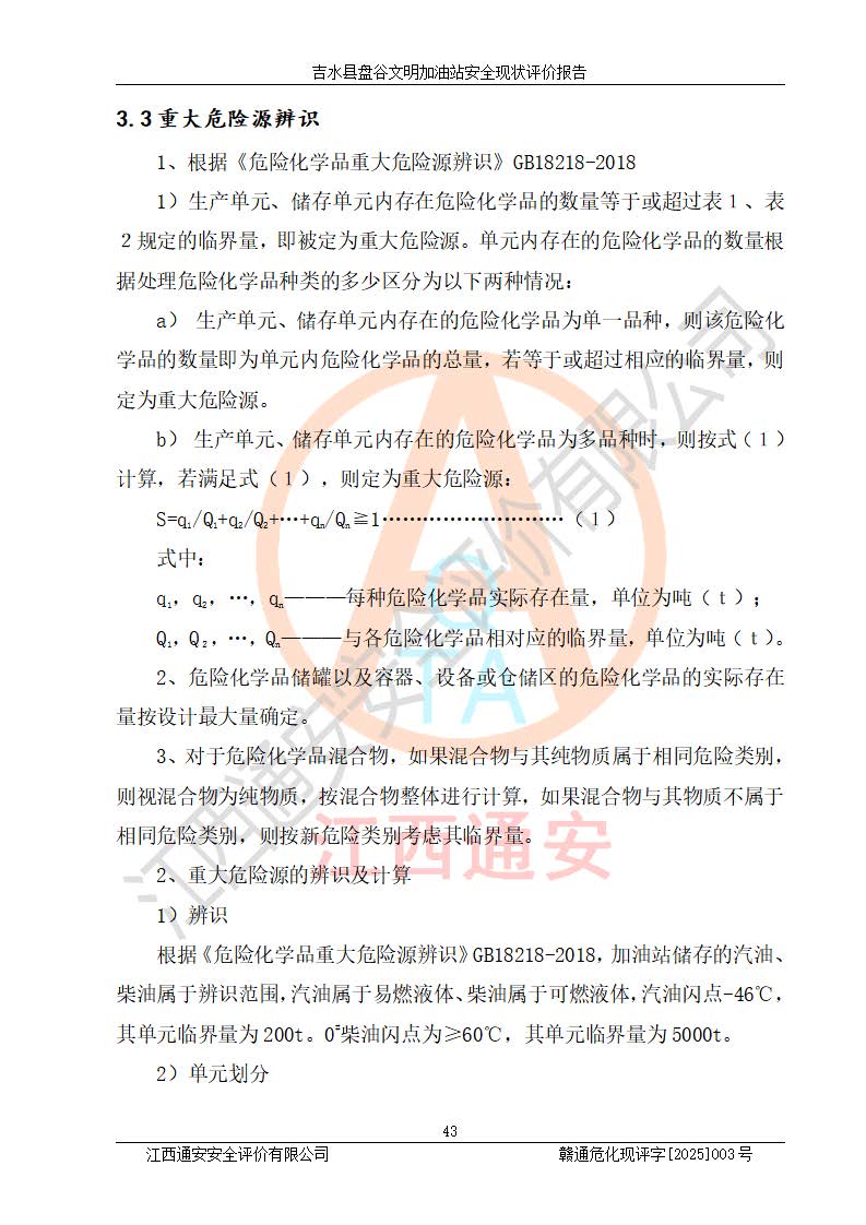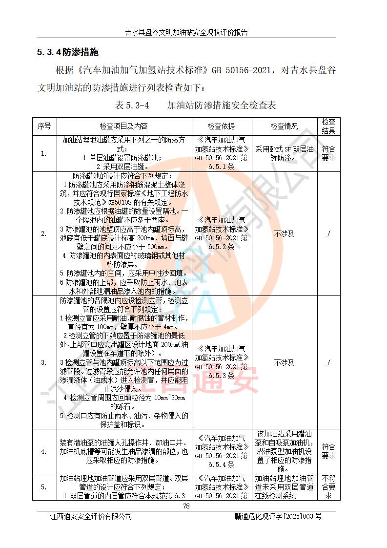 其它 | 在對該項(xiàng)目危險、有害因素辨識分析的基礎(chǔ)上,運(yùn)用安全檢查表、預(yù)作業(yè)條件危險性分析法、危險度評價、重大事故后果分析結(jié)果等評價方法對該項(xiàng)目進(jìn)行了分析評價,評價結(jié)果如下: 1、該項(xiàng)目位于江西省吉安市吉水縣盤谷鎮(zhèn)文明村,符合當(dāng)?shù)匾?guī)劃,與周邊環(huán)境的距離符合有關(guān)標(biāo)準(zhǔn)、規(guī)范的要求。 2、總圖布置分區(qū)明確,布局合理,各建構(gòu)筑物的防火間距滿足規(guī)范要求。 3、該項(xiàng)目無**明令淘汰的工藝,設(shè)備、設(shè)施與工藝條件、內(nèi)部介質(zhì)相適應(yīng),特種設(shè)備及設(shè)施較齊全,按規(guī)定設(shè)置防雷、防靜電接地,爆炸危險環(huán)境加油機(jī)按要求采用防爆型,符合相關(guān)標(biāo)準(zhǔn)規(guī)范要求。 5、企業(yè)設(shè)置了安全生產(chǎn)管理機(jī)構(gòu),配備了專職安全生產(chǎn)管理人員,建立了安全生產(chǎn)責(zé)任制和安全生產(chǎn)管理制度,編制了崗位操作規(guī)程,編制了生產(chǎn)安全事故應(yīng)急預(yù)案,人員經(jīng)過相應(yīng)的培訓(xùn),企業(yè)的安全生產(chǎn)管理正常。 6、作業(yè)條件危險性評價結(jié)果:在選定的評價單元中,作業(yè)危險程度均為“一般危險,需要注意”,作業(yè)條件相對安全。 7、危險度評價結(jié)果:汽油儲罐的危險程度為中度危險。油罐采用雙層罐埋地設(shè)置,按要求設(shè)置了通氣管,并裝設(shè)了阻火器;設(shè)置了液位監(jiān)測報警系統(tǒng)和緊急切斷系統(tǒng),埋地加油管道設(shè)置雙層管道,可以滿足安全生產(chǎn)條件要求。 評價結(jié)論: 吉水縣盤谷文明加油站符合《汽車加油加氣加氫站技術(shù)標(biāo)準(zhǔn)》GB50156-2021等標(biāo)準(zhǔn)規(guī)范的要求,安全風(fēng)險可控,滿足危險化學(xué)品經(jīng)營的安全條件。 | ||||