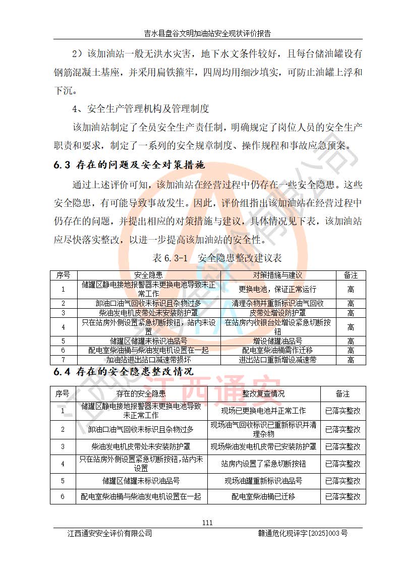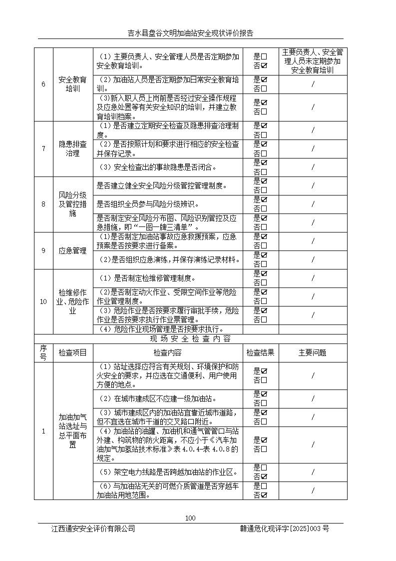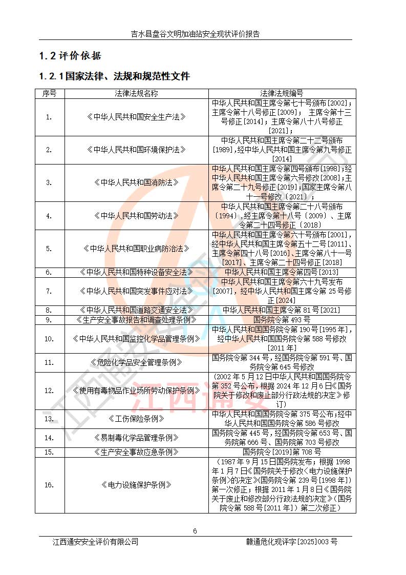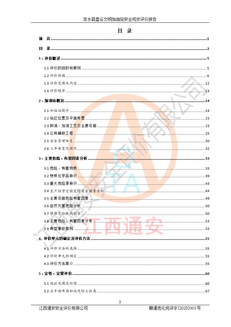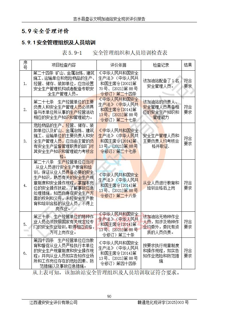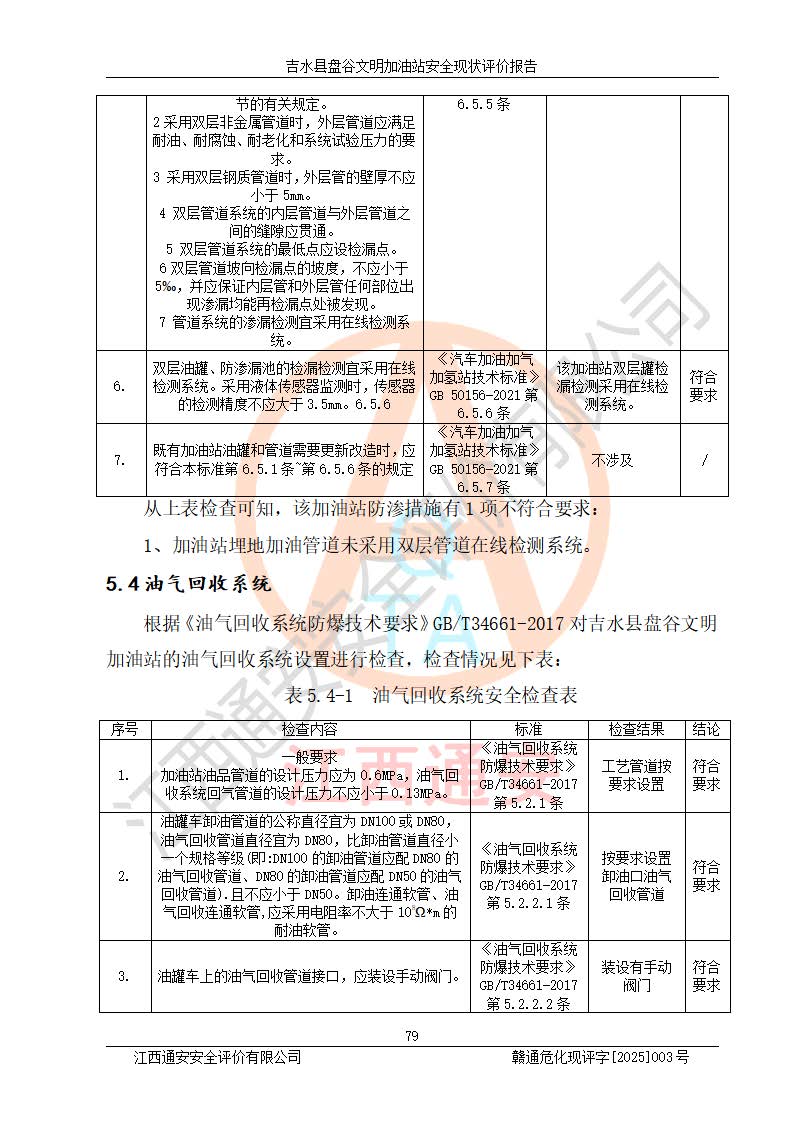 其它 | 在對該項(xiàng)目危險、有害因素辨識分析的基礎(chǔ)上,運(yùn)用安全檢查表、預(yù)作業(yè)條件危險性分析法、危險度評價、重大事故后果分析結(jié)果等評價方法對該項(xiàng)目進(jìn)行了分析評價,評價結(jié)果如下: 1、該項(xiàng)目位于江西省吉安市吉水縣盤谷鎮(zhèn)文明村,符合當(dāng)?shù)匾?guī)劃,與周邊環(huán)境的距離符合有關(guān)標(biāo)準(zhǔn)、規(guī)范的要求。 2、總圖布置分區(qū)明確,布局合理,各建構(gòu)筑物的防火間距滿足規(guī)范要求。 3、該項(xiàng)目無**明令淘汰的工藝,設(shè)備、設(shè)施與工藝條件、內(nèi)部介質(zhì)相適應(yīng),特種設(shè)備及設(shè)施較齊全,按規(guī)定設(shè)置防雷、防靜電接地,爆炸危險環(huán)境加油機(jī)按要求采用防爆型,符合相關(guān)標(biāo)準(zhǔn)規(guī)范要求。 5、企業(yè)設(shè)置了安全生產(chǎn)管理機(jī)構(gòu),配備了專職安全生產(chǎn)管理人員,建立了安全生產(chǎn)責(zé)任制和安全生產(chǎn)管理制度,編制了崗位操作規(guī)程,編制了生產(chǎn)安全事故應(yīng)急預(yù)案,人員經(jīng)過相應(yīng)的培訓(xùn),企業(yè)的安全生產(chǎn)管理正常。 6、作業(yè)條件危險性評價結(jié)果:在選定的評價單元中,作業(yè)危險程度均為“一般危險,需要注意”,作業(yè)條件相對安全。 7、危險度評價結(jié)果:汽油儲罐的危險程度為中度危險。油罐采用雙層罐埋地設(shè)置,按要求設(shè)置了通氣管,并裝設(shè)了阻火器;設(shè)置了液位監(jiān)測報警系統(tǒng)和緊急切斷系統(tǒng),埋地加油管道設(shè)置雙層管道,可以滿足安全生產(chǎn)條件要求。 評價結(jié)論: 吉水縣盤谷文明加油站符合《汽車加油加氣加氫站技術(shù)標(biāo)準(zhǔn)》GB50156-2021等標(biāo)準(zhǔn)規(guī)范的要求,安全風(fēng)險可控,滿足危險化學(xué)品經(jīng)營的安全條件。 | ||||
