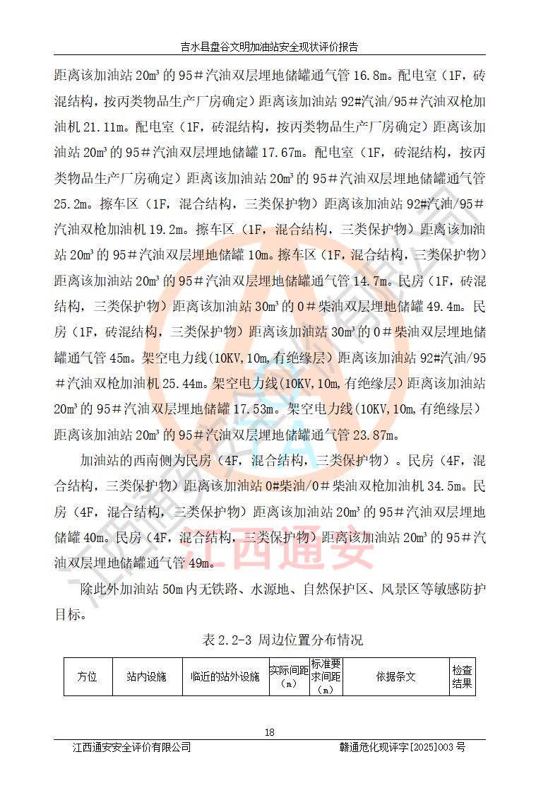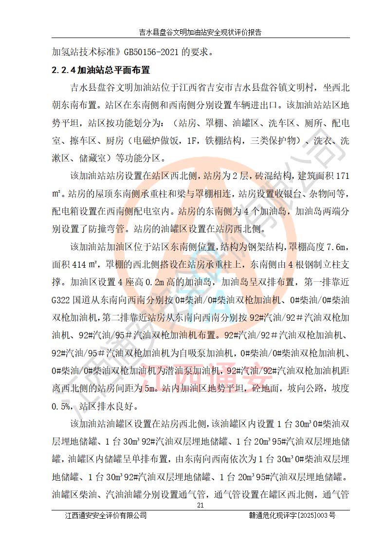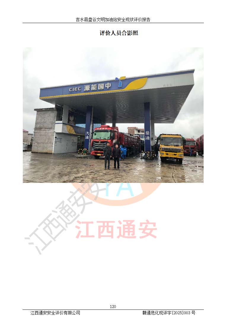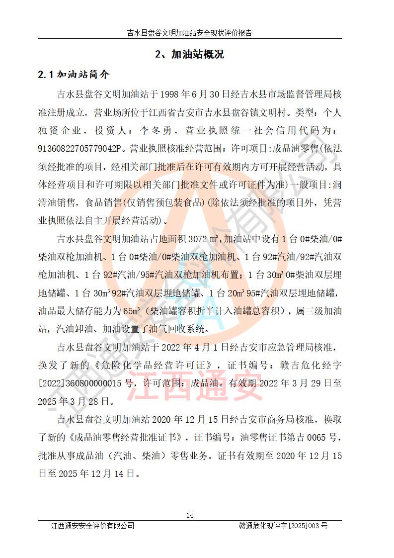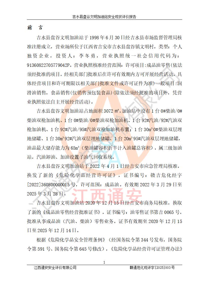 項(xiàng)目簡介 | 吉水縣盤谷文明加油站于1998年6月30日經(jīng)吉水縣市場監(jiān)督管理局核準(zhǔn)注冊成立,營業(yè)場所位于江西省吉安市吉水縣盤谷鎮(zhèn)文明村。類型:個人獨(dú)資企業(yè),投資人:李冬勇,營業(yè)執(zhí)照統(tǒng)一社會信用代碼為:91360822705779042P。營業(yè)執(zhí)照核準(zhǔn)經(jīng)營范圍:許可項(xiàng)目:成品油零售(依法須經(jīng)批準(zhǔn)的項(xiàng)目,經(jīng)相關(guān)部門批準(zhǔn)后在許可**期內(nèi)方可開展經(jīng)營活動,具體經(jīng)營項(xiàng)目和許可期限以相關(guān)部門批準(zhǔn)文件或許可證件為準(zhǔn))一般項(xiàng)目:潤滑油銷售,食品銷售(僅銷售預(yù)包裝食品)(除依法須經(jīng)批準(zhǔn)的項(xiàng)目外,憑營業(yè)執(zhí)照依法自主開展經(jīng)營活動)。 吉水縣盤谷文明加油站占地面積3072㎡,加油站中設(shè)有1臺0#柴油/0#柴油雙槍加油機(jī)、1臺0#柴油/0#柴油雙槍加油機(jī)、1臺92#汽油/92#汽油雙槍加油機(jī)、1臺92#汽油/95#汽油雙槍加油機(jī)布置;1臺30m30#柴油雙層埋地儲罐、1臺30m392#汽油雙層埋地儲罐、1臺20m395#汽油雙層埋地儲罐,油品*大儲存能力為65m3(柴油罐容積折半計(jì)入油罐總?cè)莘e),屬三級加油站,汽油卸油、加油設(shè)置了油氣回收系統(tǒng)。 吉水縣盤谷文明加油站于2022年4月1日經(jīng)吉安市應(yīng)急管理局核準(zhǔn),換發(fā)了新的《危險化學(xué)品經(jīng)營許可證》,證書編號:贛吉?;?/span>經(jīng)字[2022]360800000015號,許可范圍:成品油。**期2022年3月29日至2025年3月28日。 吉水縣盤谷文明加油站2020年12月15日經(jīng)吉安市商務(wù)局核準(zhǔn),換取了新的《成品油零售經(jīng)營批準(zhǔn)證書》,證書編號:油零售證書第吉0065號,批準(zhǔn)從事成品油(汽油、柴油)零售業(yè)務(wù)。證書**期至2020年12月15日至2025年12月14日。 | ||||