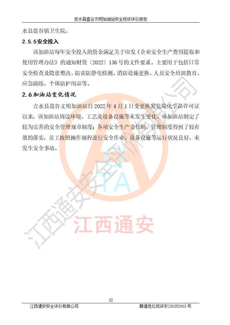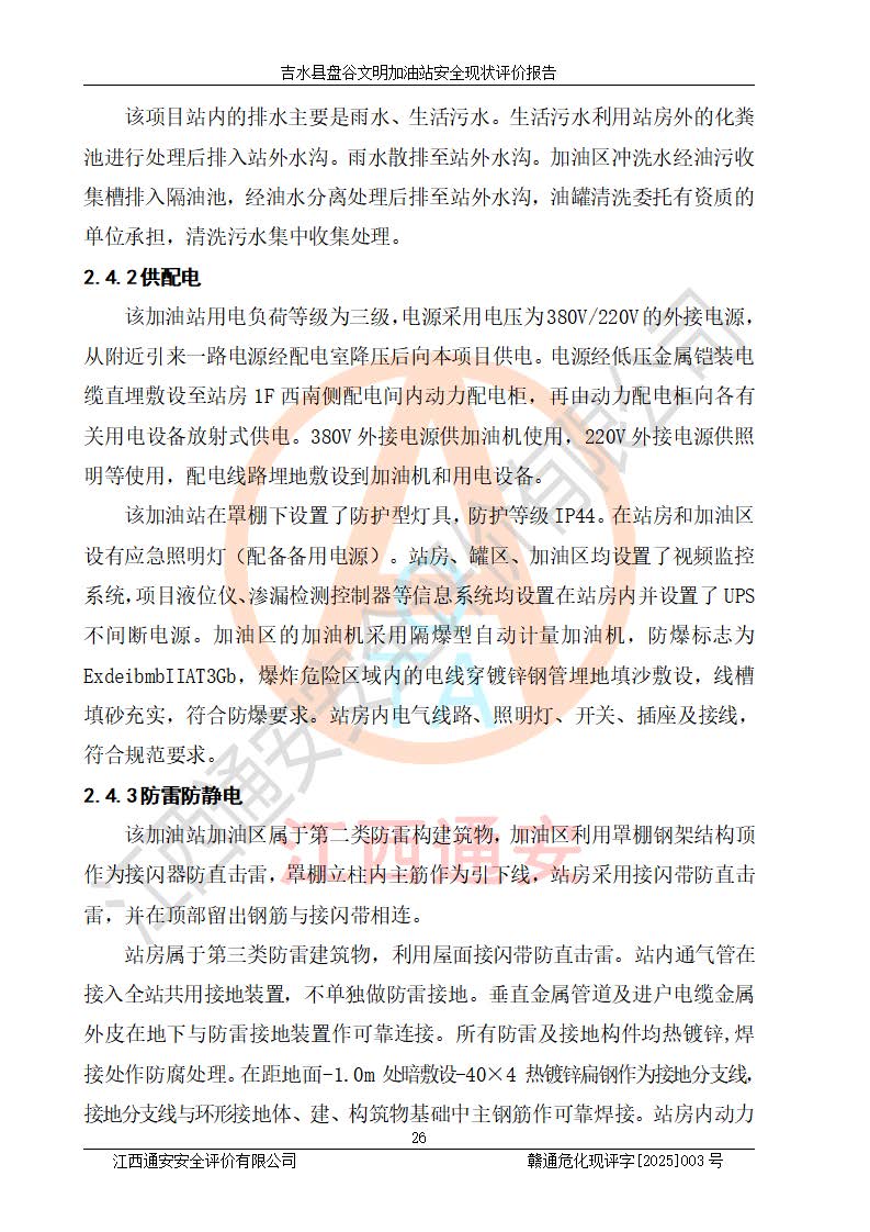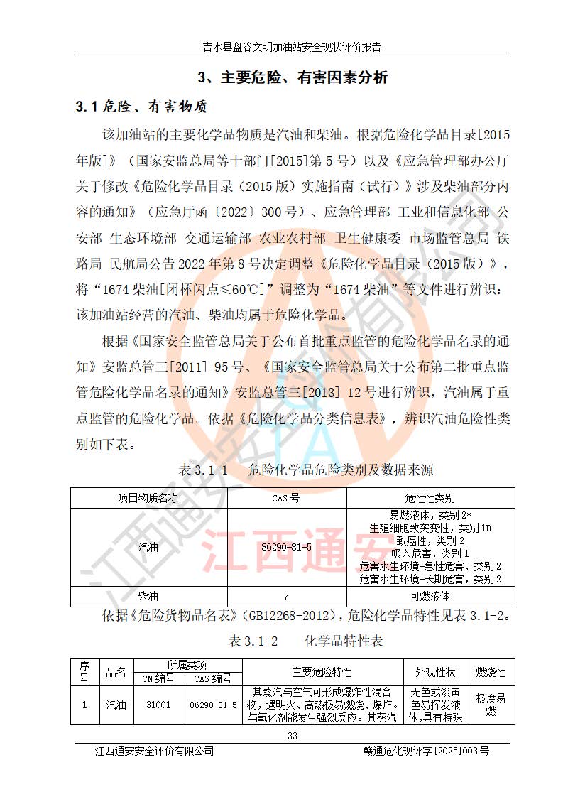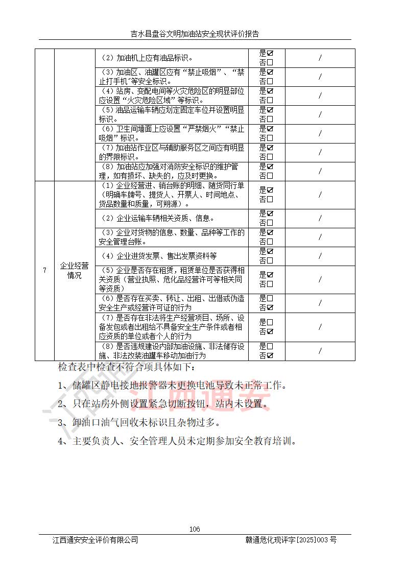 項(xiàng)目簡介 | 吉水縣盤谷文明加油站于1998年6月30日經(jīng)吉水縣市場監(jiān)督管理局核準(zhǔn)注冊成立,營業(yè)場所位于江西省吉安市吉水縣盤谷鎮(zhèn)文明村。類型:個人獨(dú)資企業(yè),投資人:李冬勇,營業(yè)執(zhí)照統(tǒng)一社會信用代碼為:91360822705779042P。營業(yè)執(zhí)照核準(zhǔn)經(jīng)營范圍:許可項(xiàng)目:成品油零售(依法須經(jīng)批準(zhǔn)的項(xiàng)目,經(jīng)相關(guān)部門批準(zhǔn)后在許可**期內(nèi)方可開展經(jīng)營活動,具體經(jīng)營項(xiàng)目和許可期限以相關(guān)部門批準(zhǔn)文件或許可證件為準(zhǔn))一般項(xiàng)目:潤滑油銷售,食品銷售(僅銷售預(yù)包裝食品)(除依法須經(jīng)批準(zhǔn)的項(xiàng)目外,憑營業(yè)執(zhí)照依法自主開展經(jīng)營活動)。 吉水縣盤谷文明加油站占地面積3072㎡,加油站中設(shè)有1臺0#柴油/0#柴油雙槍加油機(jī)、1臺0#柴油/0#柴油雙槍加油機(jī)、1臺92#汽油/92#汽油雙槍加油機(jī)、1臺92#汽油/95#汽油雙槍加油機(jī)布置;1臺30m30#柴油雙層埋地儲罐、1臺30m392#汽油雙層埋地儲罐、1臺20m395#汽油雙層埋地儲罐,油品*大儲存能力為65m3(柴油罐容積折半計(jì)入油罐總?cè)莘e),屬三級加油站,汽油卸油、加油設(shè)置了油氣回收系統(tǒng)。 吉水縣盤谷文明加油站于2022年4月1日經(jīng)吉安市應(yīng)急管理局核準(zhǔn),換發(fā)了新的《危險化學(xué)品經(jīng)營許可證》,證書編號:贛吉?;?/span>經(jīng)字[2022]360800000015號,許可范圍:成品油。**期2022年3月29日至2025年3月28日。 吉水縣盤谷文明加油站2020年12月15日經(jīng)吉安市商務(wù)局核準(zhǔn),換取了新的《成品油零售經(jīng)營批準(zhǔn)證書》,證書編號:油零售證書第吉0065號,批準(zhǔn)從事成品油(汽油、柴油)零售業(yè)務(wù)。證書**期至2020年12月15日至2025年12月14日。 | ||||