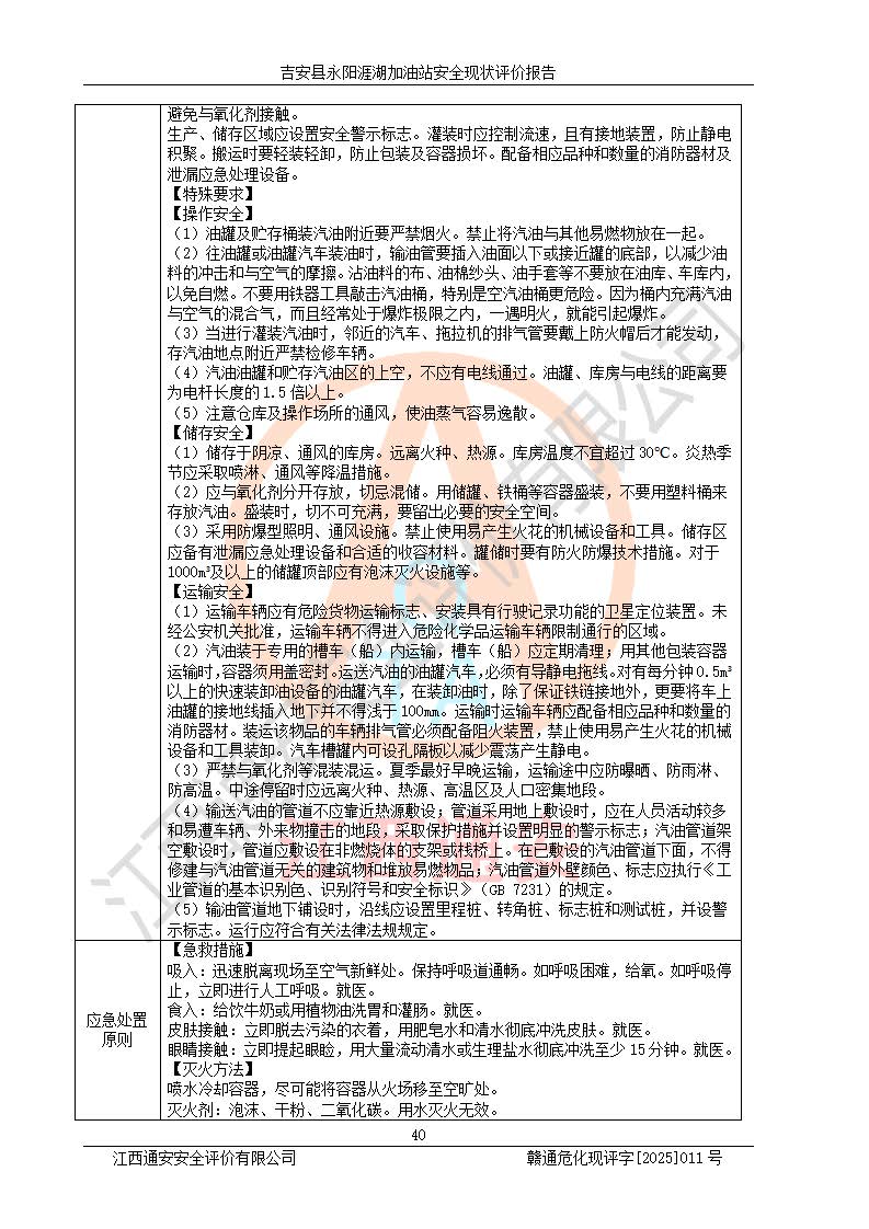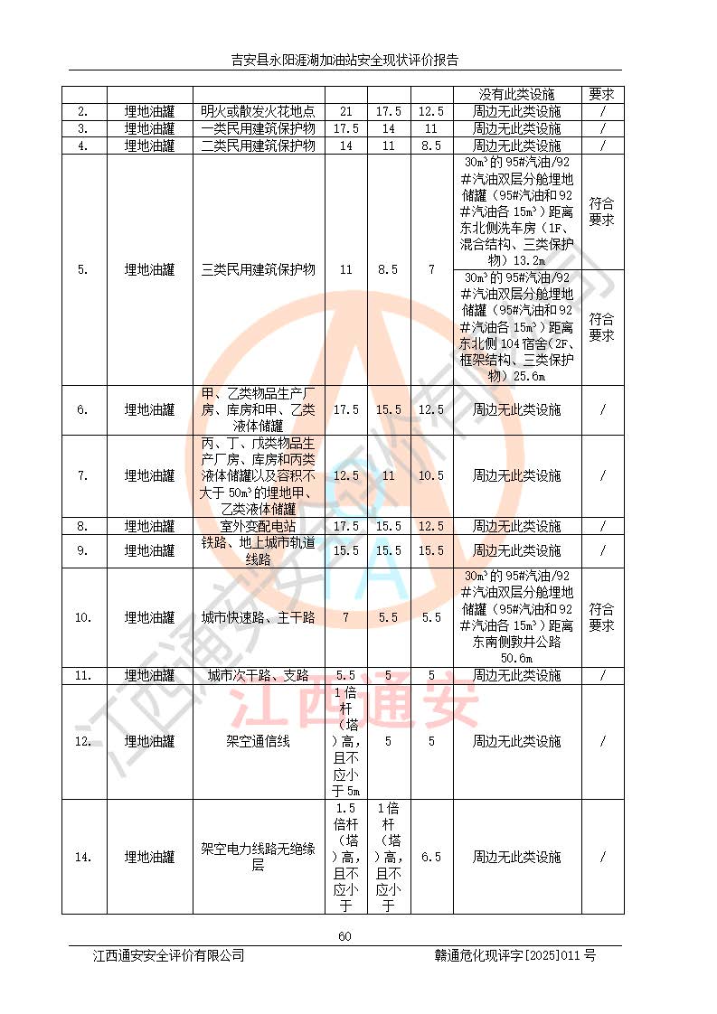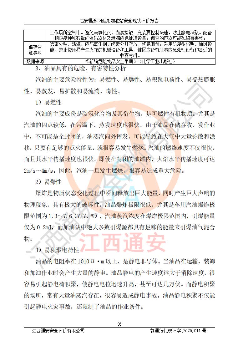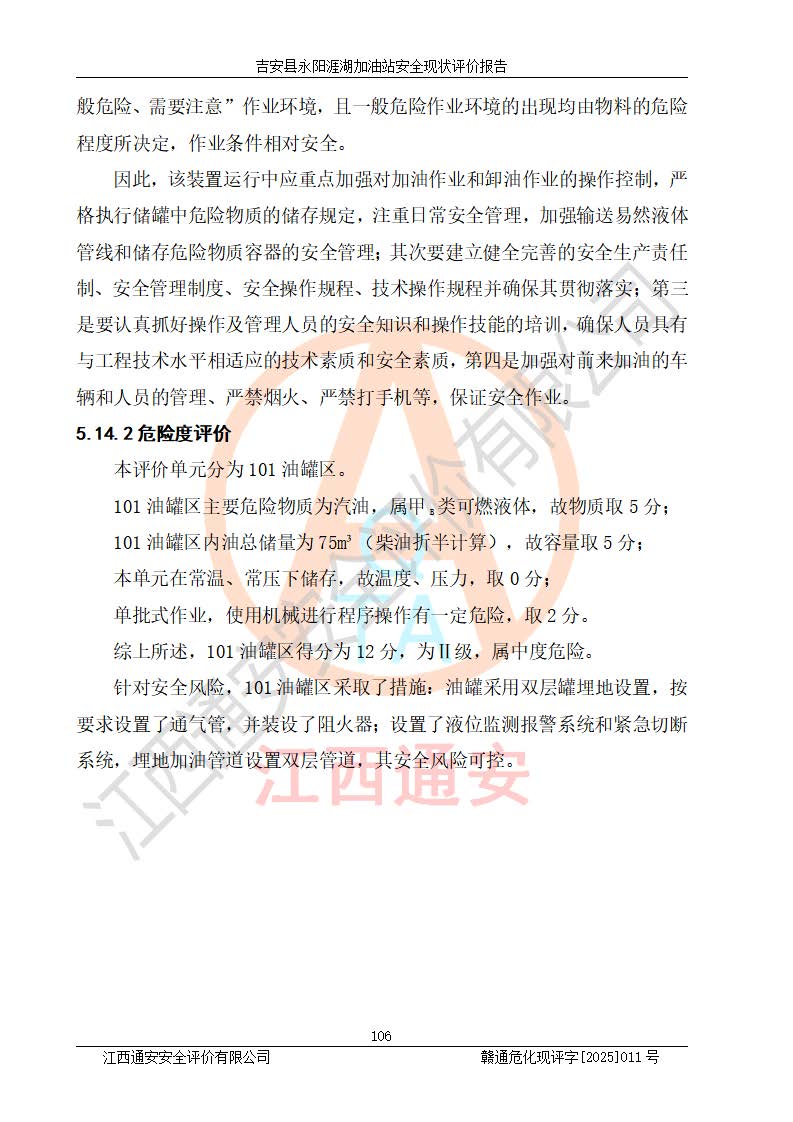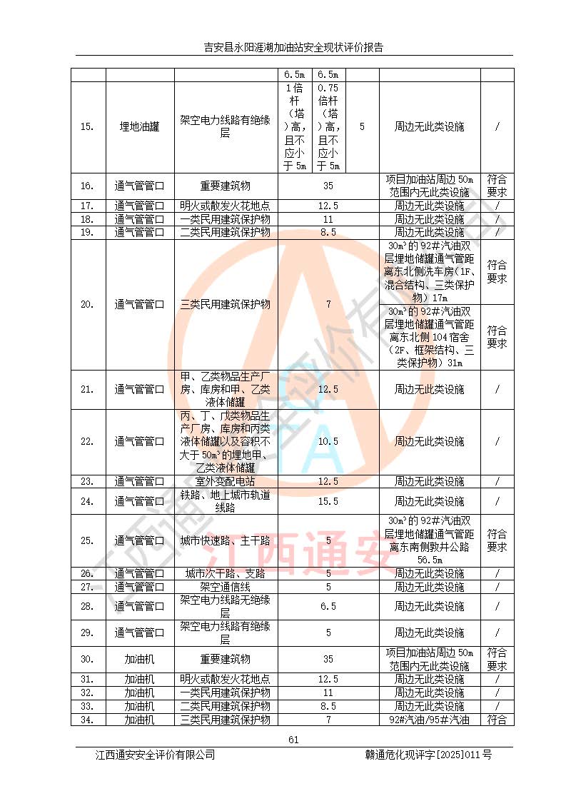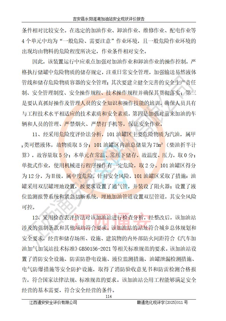 其它 | 在對該項目危險、有害因素辨識分析的基礎(chǔ)上,運用安全檢查表、預(yù)作業(yè)條件危險性分析法、危險度評價、重大事故后果分析結(jié)果等評價方法對該項目進行了分析評價,評價結(jié)果如下: 1、該項目位于江西省吉安市吉安縣永陽鎮(zhèn)涯湖村,符合當?shù)匾?guī)劃,與周邊環(huán)境的距離符合有關(guān)標準、規(guī)范的要求。 2、總圖布置分區(qū)明確,布局合理,各建構(gòu)筑物的防火間距滿足規(guī)范要求。 3、該項目無**明令淘汰的工藝,設(shè)備、設(shè)施與工藝條件、內(nèi)部介質(zhì)相適應(yīng),特種設(shè)備及設(shè)施較齊全,按規(guī)定設(shè)置防雷、防靜電接地,爆炸危險環(huán)境加油機按要求采用防爆型,符合相關(guān)標準規(guī)范要求。 5、企業(yè)設(shè)置了安全生產(chǎn)管理機構(gòu),配備了專職安全生產(chǎn)管理人員,建立了安全生產(chǎn)責任制和安全生產(chǎn)管理制度,編制了崗位操作規(guī)程,編制了生產(chǎn)安全事故應(yīng)急預(yù)案,人員經(jīng)過相應(yīng)的培訓(xùn),企業(yè)的安全生產(chǎn)管理正常。 6、作業(yè)條件危險性評價結(jié)果:在選定的評價單元中,作業(yè)危險程度均為“一般危險,需要注意”,作業(yè)條件相對安全。 7、危險度評價結(jié)果:汽油儲罐的危險程度為中度危險。油罐采用雙層罐埋地設(shè)置,按要求設(shè)置了通氣管,并裝設(shè)了阻火器;設(shè)置了液位監(jiān)測報警系統(tǒng)和緊急切斷系統(tǒng),埋地加油管道設(shè)置雙層管道,可以滿足安全生產(chǎn)條件要求。 評價結(jié)論: 吉安縣永陽涯湖加油站符合《汽車加油加氣加氫站技術(shù)標準》GB50156-2021等標準規(guī)范的要求,安全風險可控,滿足危險化學(xué)品經(jīng)營的安全條件。 | ||||