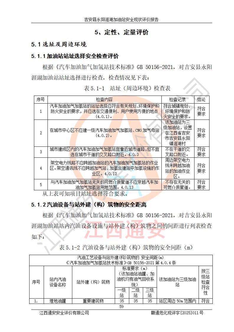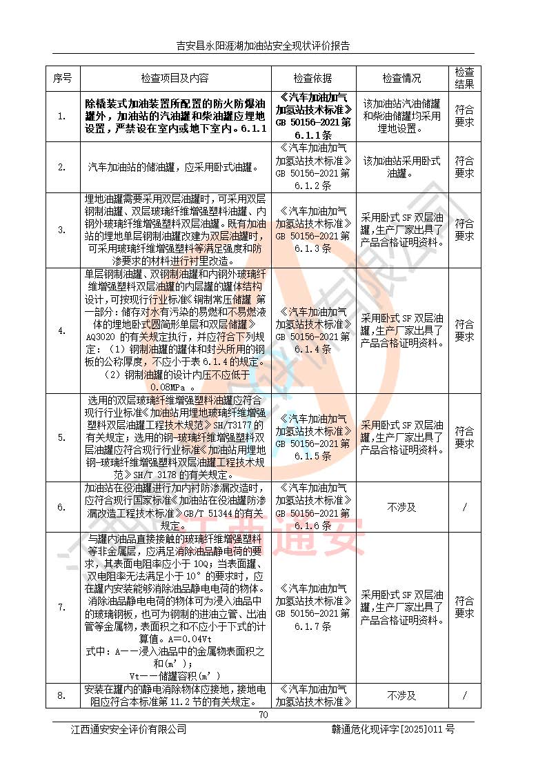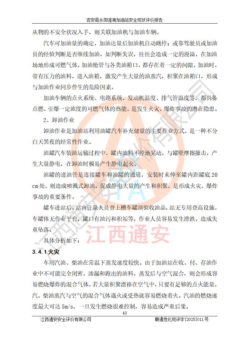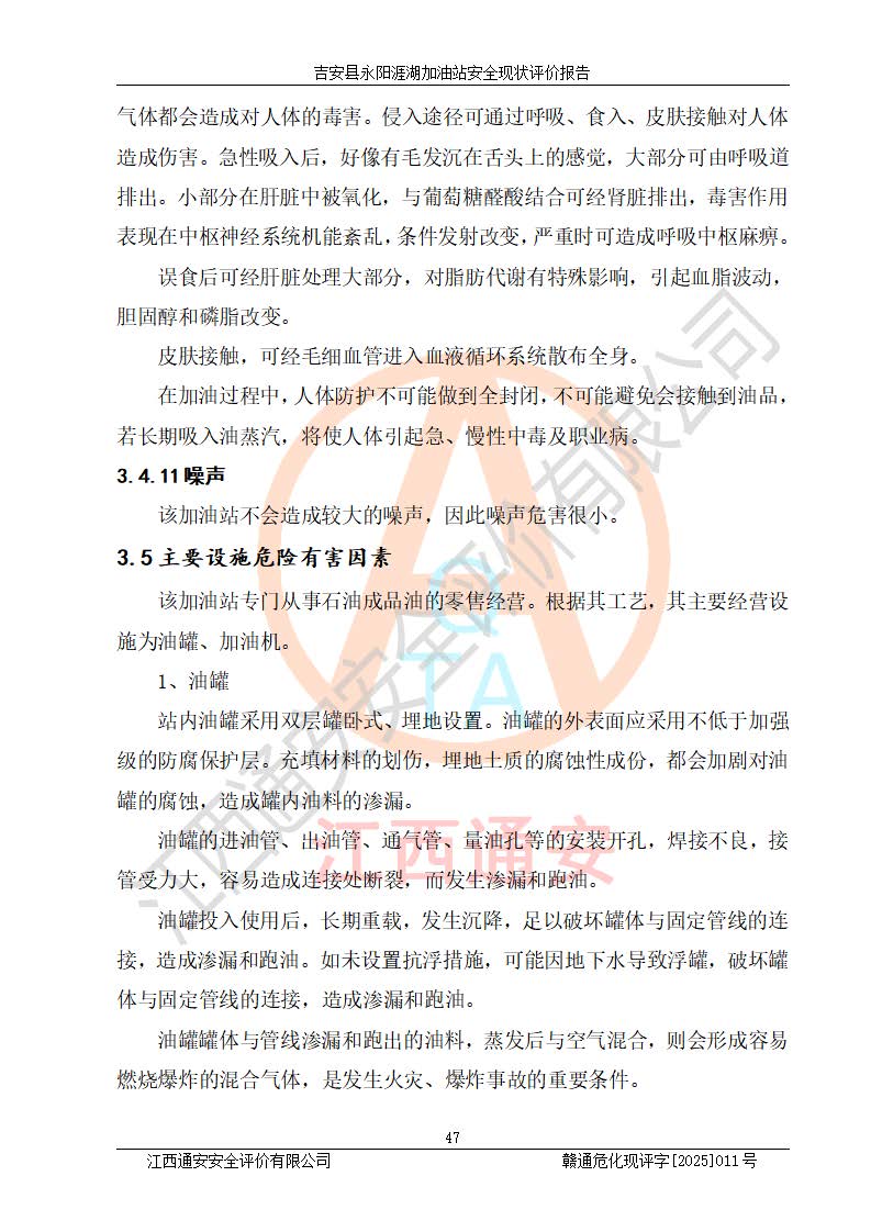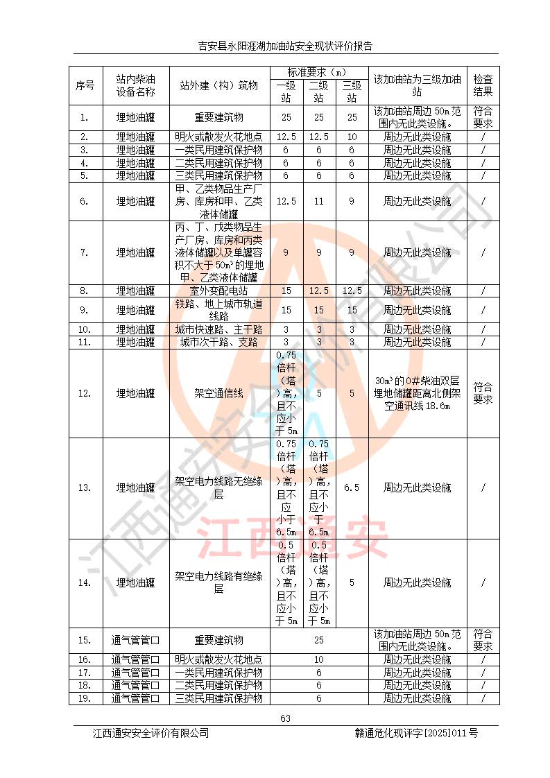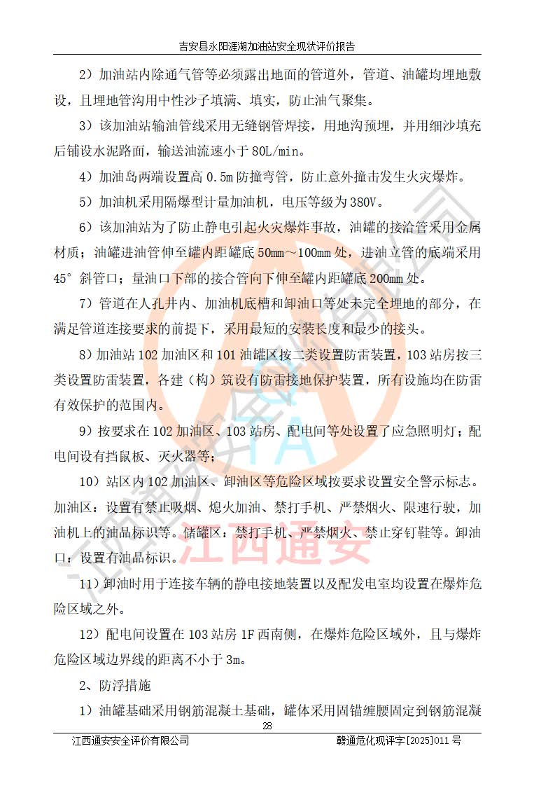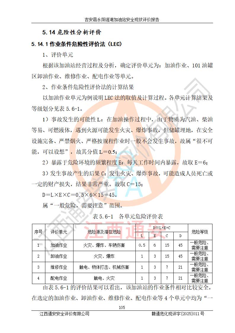 其它 | 在對該項目危險、有害因素辨識分析的基礎(chǔ)上,運用安全檢查表、預(yù)作業(yè)條件危險性分析法、危險度評價、重大事故后果分析結(jié)果等評價方法對該項目進行了分析評價,評價結(jié)果如下: 1、該項目位于江西省吉安市吉安縣永陽鎮(zhèn)涯湖村,符合當?shù)匾?guī)劃,與周邊環(huán)境的距離符合有關(guān)標準、規(guī)范的要求。 2、總圖布置分區(qū)明確,布局合理,各建構(gòu)筑物的防火間距滿足規(guī)范要求。 3、該項目無**明令淘汰的工藝,設(shè)備、設(shè)施與工藝條件、內(nèi)部介質(zhì)相適應(yīng),特種設(shè)備及設(shè)施較齊全,按規(guī)定設(shè)置防雷、防靜電接地,爆炸危險環(huán)境加油機按要求采用防爆型,符合相關(guān)標準規(guī)范要求。 5、企業(yè)設(shè)置了安全生產(chǎn)管理機構(gòu),配備了專職安全生產(chǎn)管理人員,建立了安全生產(chǎn)責任制和安全生產(chǎn)管理制度,編制了崗位操作規(guī)程,編制了生產(chǎn)安全事故應(yīng)急預(yù)案,人員經(jīng)過相應(yīng)的培訓(xùn),企業(yè)的安全生產(chǎn)管理正常。 6、作業(yè)條件危險性評價結(jié)果:在選定的評價單元中,作業(yè)危險程度均為“一般危險,需要注意”,作業(yè)條件相對安全。 7、危險度評價結(jié)果:汽油儲罐的危險程度為中度危險。油罐采用雙層罐埋地設(shè)置,按要求設(shè)置了通氣管,并裝設(shè)了阻火器;設(shè)置了液位監(jiān)測報警系統(tǒng)和緊急切斷系統(tǒng),埋地加油管道設(shè)置雙層管道,可以滿足安全生產(chǎn)條件要求。 評價結(jié)論: 吉安縣永陽涯湖加油站符合《汽車加油加氣加氫站技術(shù)標準》GB50156-2021等標準規(guī)范的要求,安全風險可控,滿足危險化學(xué)品經(jīng)營的安全條件。 | ||||