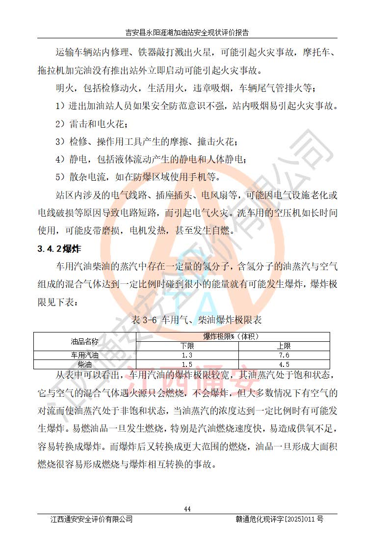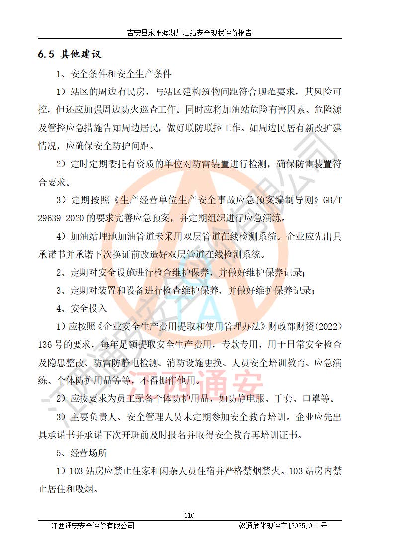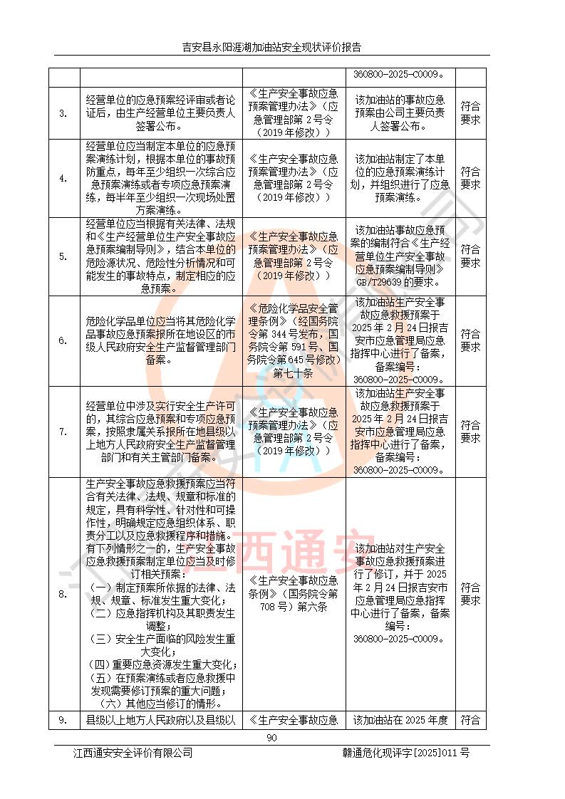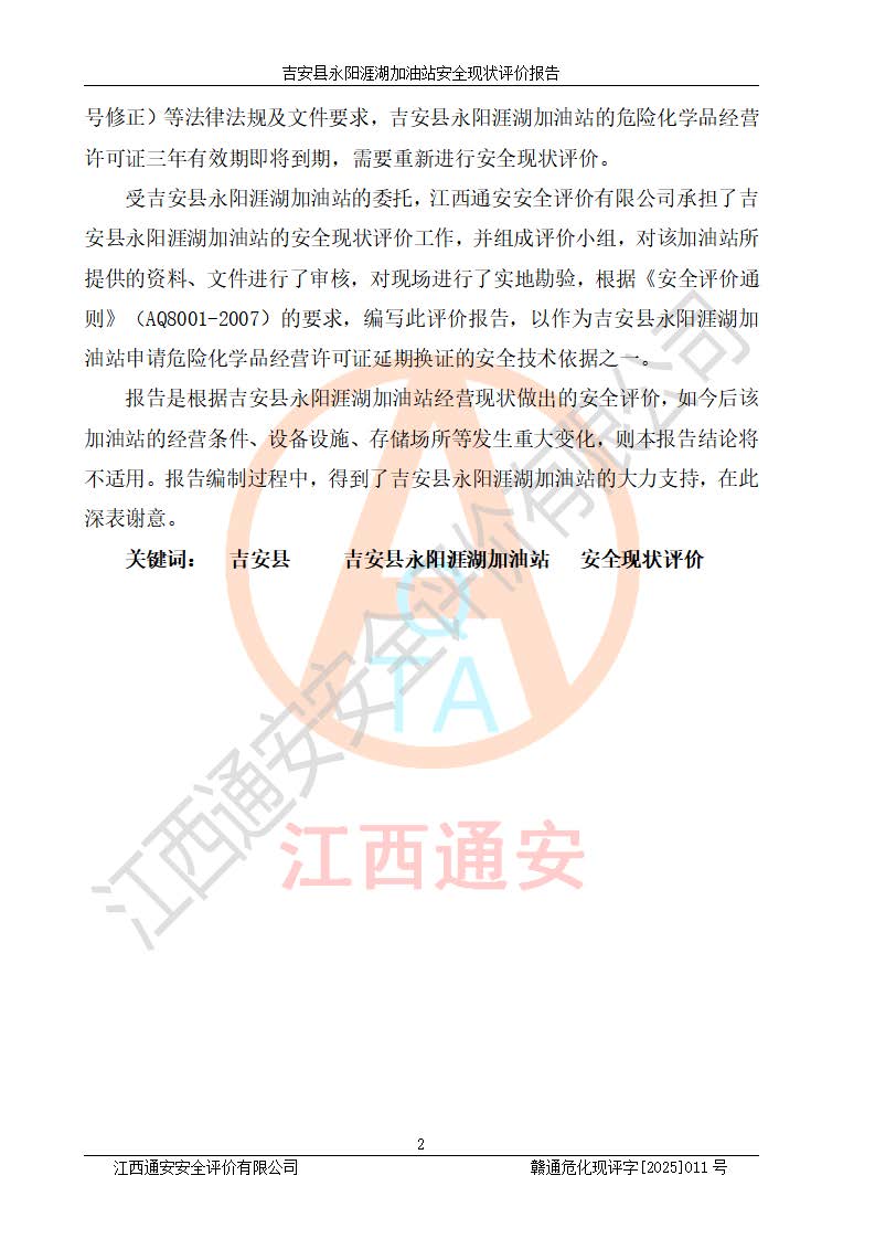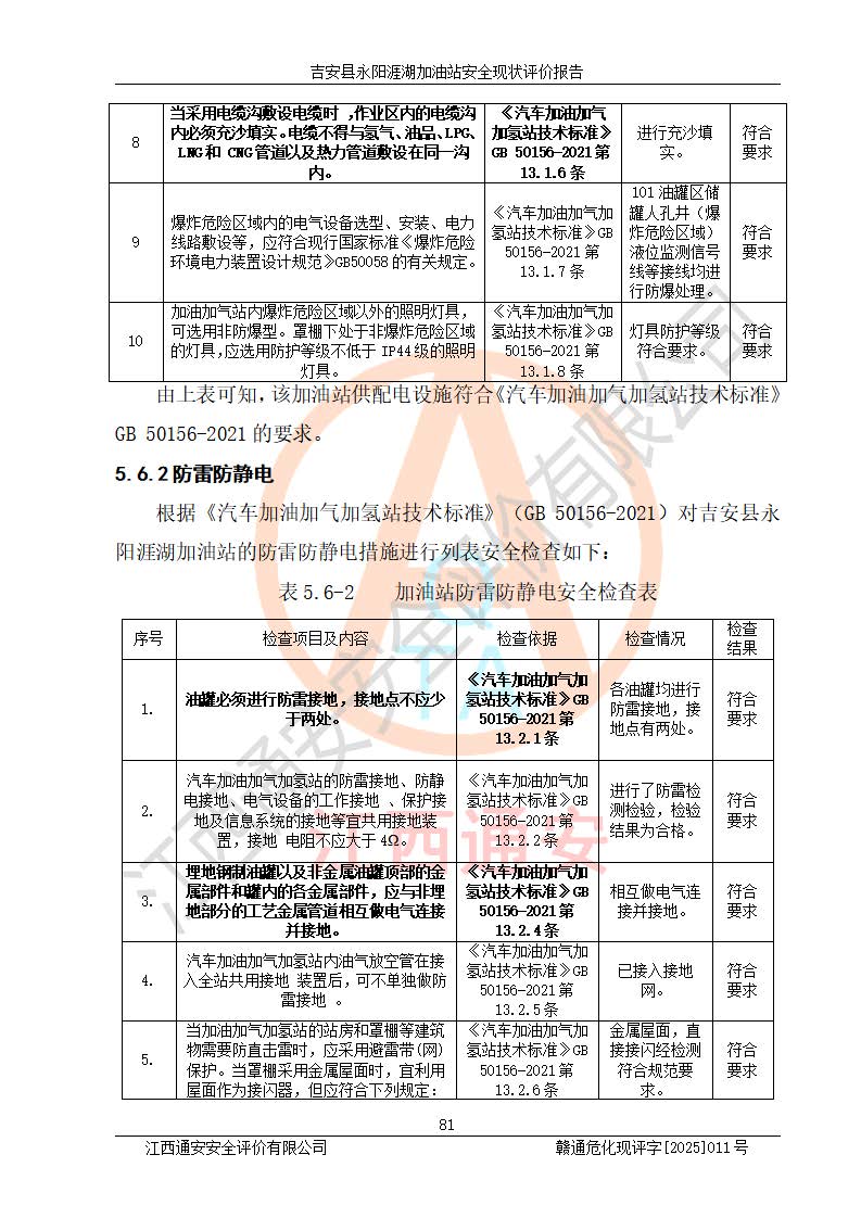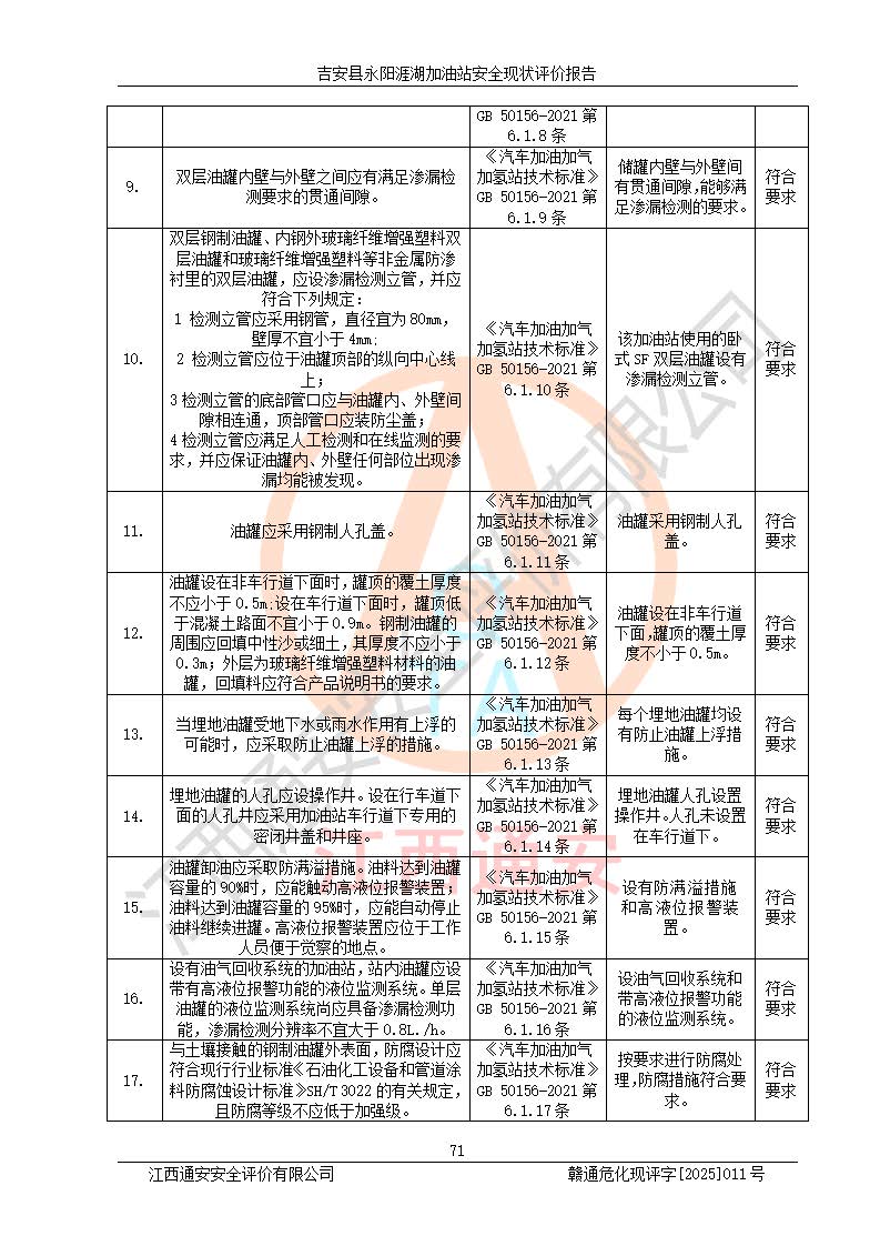 其它 | 在對該項目危險、有害因素辨識分析的基礎(chǔ)上,運用安全檢查表、預(yù)作業(yè)條件危險性分析法、危險度評價、重大事故后果分析結(jié)果等評價方法對該項目進行了分析評價,評價結(jié)果如下: 1、該項目位于江西省吉安市吉安縣永陽鎮(zhèn)涯湖村,符合當?shù)匾?guī)劃,與周邊環(huán)境的距離符合有關(guān)標準、規(guī)范的要求。 2、總圖布置分區(qū)明確,布局合理,各建構(gòu)筑物的防火間距滿足規(guī)范要求。 3、該項目無**明令淘汰的工藝,設(shè)備、設(shè)施與工藝條件、內(nèi)部介質(zhì)相適應(yīng),特種設(shè)備及設(shè)施較齊全,按規(guī)定設(shè)置防雷、防靜電接地,爆炸危險環(huán)境加油機按要求采用防爆型,符合相關(guān)標準規(guī)范要求。 5、企業(yè)設(shè)置了安全生產(chǎn)管理機構(gòu),配備了專職安全生產(chǎn)管理人員,建立了安全生產(chǎn)責任制和安全生產(chǎn)管理制度,編制了崗位操作規(guī)程,編制了生產(chǎn)安全事故應(yīng)急預(yù)案,人員經(jīng)過相應(yīng)的培訓(xùn),企業(yè)的安全生產(chǎn)管理正常。 6、作業(yè)條件危險性評價結(jié)果:在選定的評價單元中,作業(yè)危險程度均為“一般危險,需要注意”,作業(yè)條件相對安全。 7、危險度評價結(jié)果:汽油儲罐的危險程度為中度危險。油罐采用雙層罐埋地設(shè)置,按要求設(shè)置了通氣管,并裝設(shè)了阻火器;設(shè)置了液位監(jiān)測報警系統(tǒng)和緊急切斷系統(tǒng),埋地加油管道設(shè)置雙層管道,可以滿足安全生產(chǎn)條件要求。 評價結(jié)論: 吉安縣永陽涯湖加油站符合《汽車加油加氣加氫站技術(shù)標準》GB50156-2021等標準規(guī)范的要求,安全風險可控,滿足危險化學(xué)品經(jīng)營的安全條件。 | ||||