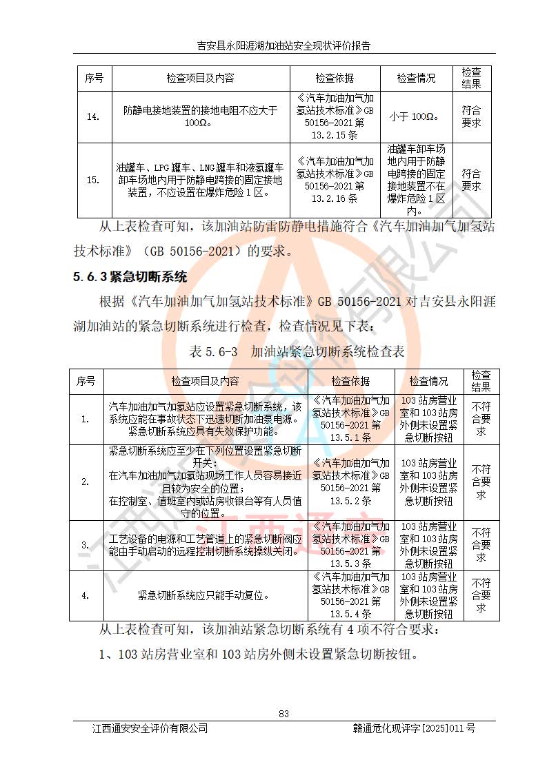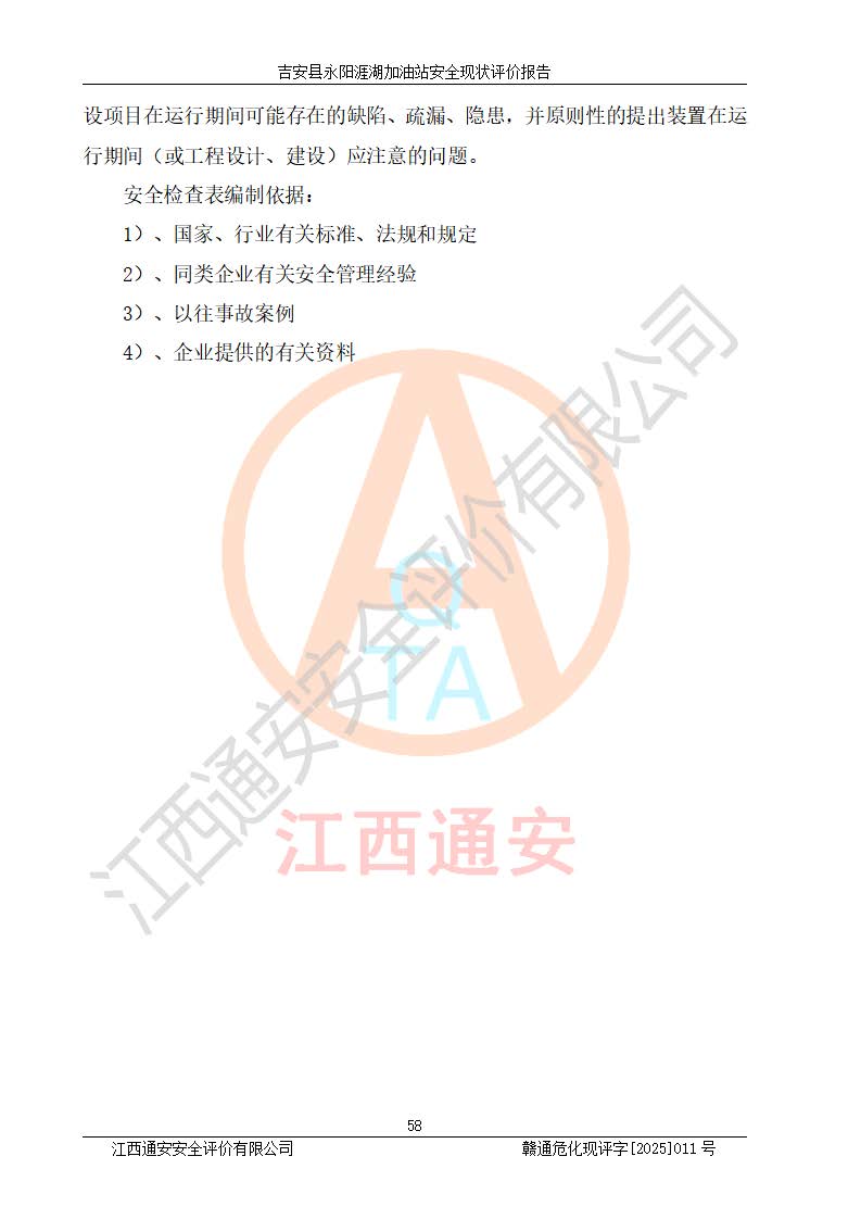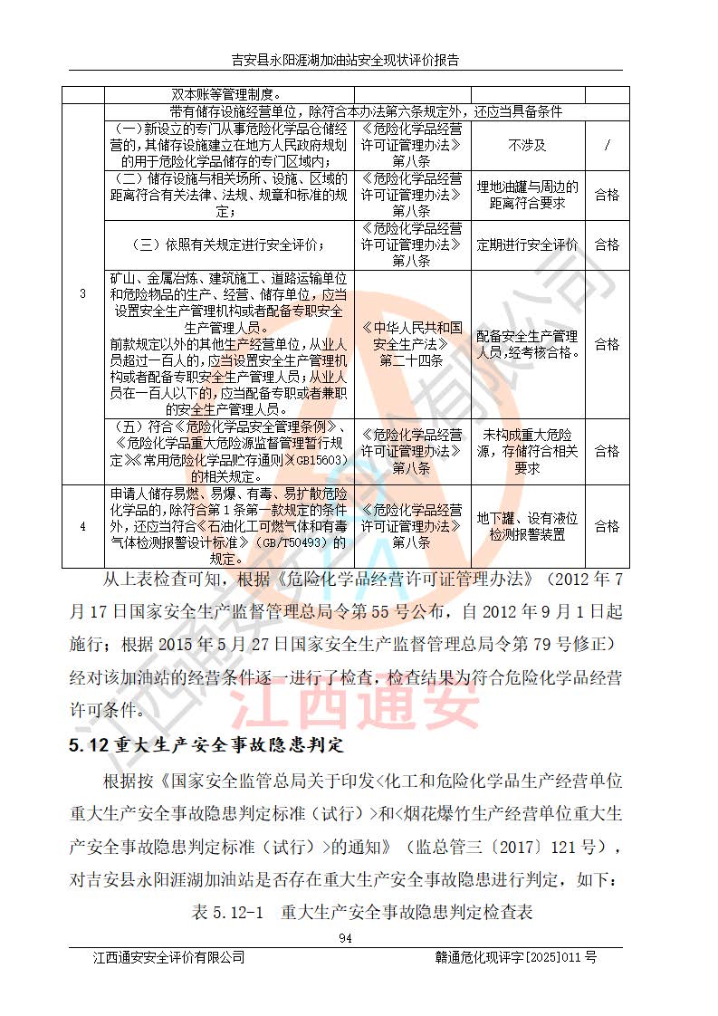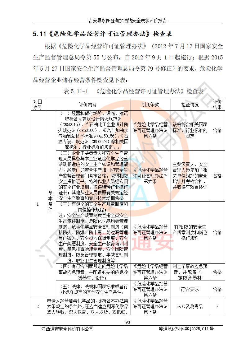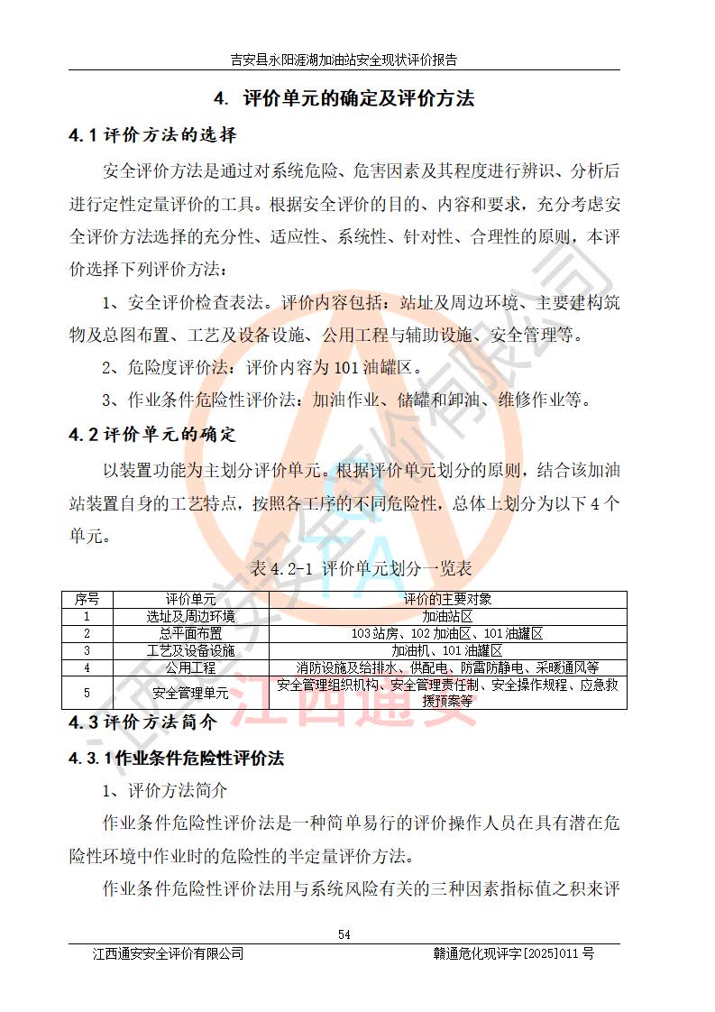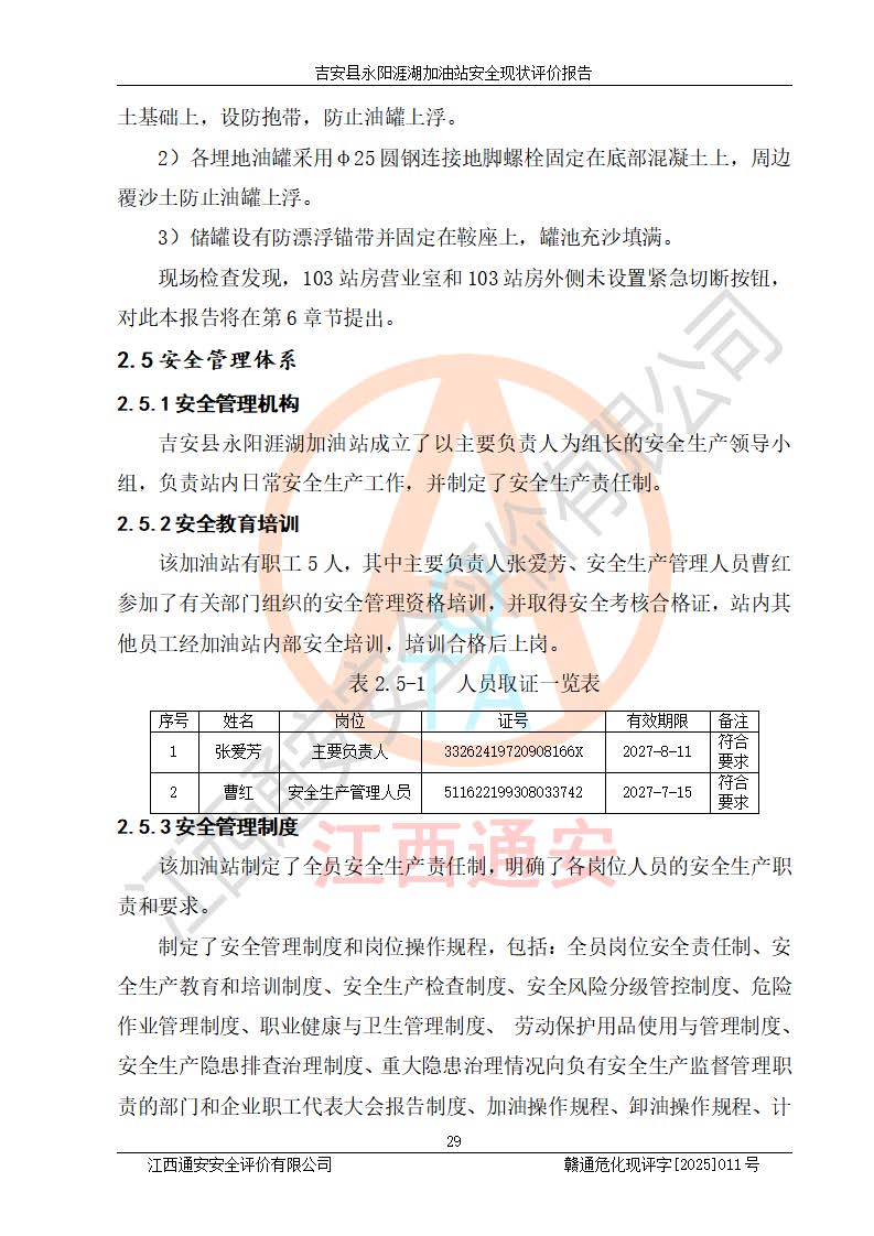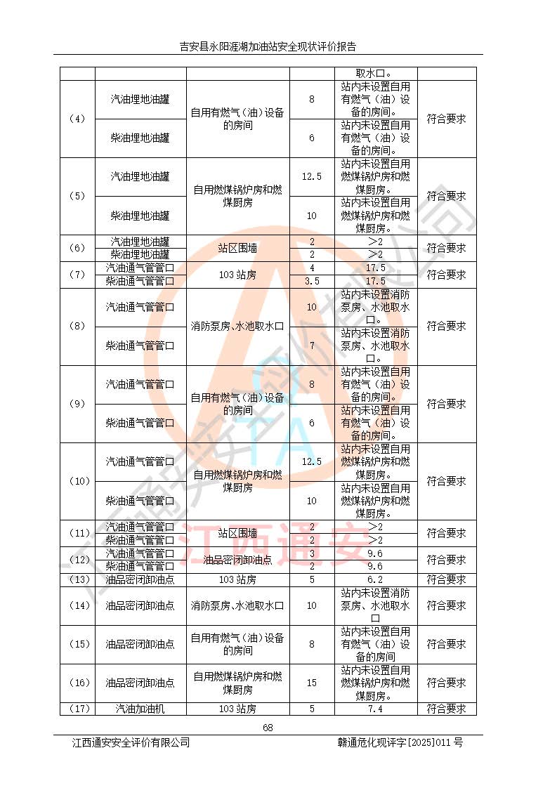 其它 | 在對該項目危險、有害因素辨識分析的基礎(chǔ)上,運用安全檢查表、預(yù)作業(yè)條件危險性分析法、危險度評價、重大事故后果分析結(jié)果等評價方法對該項目進行了分析評價,評價結(jié)果如下: 1、該項目位于江西省吉安市吉安縣永陽鎮(zhèn)涯湖村,符合當?shù)匾?guī)劃,與周邊環(huán)境的距離符合有關(guān)標準、規(guī)范的要求。 2、總圖布置分區(qū)明確,布局合理,各建構(gòu)筑物的防火間距滿足規(guī)范要求。 3、該項目無**明令淘汰的工藝,設(shè)備、設(shè)施與工藝條件、內(nèi)部介質(zhì)相適應(yīng),特種設(shè)備及設(shè)施較齊全,按規(guī)定設(shè)置防雷、防靜電接地,爆炸危險環(huán)境加油機按要求采用防爆型,符合相關(guān)標準規(guī)范要求。 5、企業(yè)設(shè)置了安全生產(chǎn)管理機構(gòu),配備了專職安全生產(chǎn)管理人員,建立了安全生產(chǎn)責任制和安全生產(chǎn)管理制度,編制了崗位操作規(guī)程,編制了生產(chǎn)安全事故應(yīng)急預(yù)案,人員經(jīng)過相應(yīng)的培訓(xùn),企業(yè)的安全生產(chǎn)管理正常。 6、作業(yè)條件危險性評價結(jié)果:在選定的評價單元中,作業(yè)危險程度均為“一般危險,需要注意”,作業(yè)條件相對安全。 7、危險度評價結(jié)果:汽油儲罐的危險程度為中度危險。油罐采用雙層罐埋地設(shè)置,按要求設(shè)置了通氣管,并裝設(shè)了阻火器;設(shè)置了液位監(jiān)測報警系統(tǒng)和緊急切斷系統(tǒng),埋地加油管道設(shè)置雙層管道,可以滿足安全生產(chǎn)條件要求。 評價結(jié)論: 吉安縣永陽涯湖加油站符合《汽車加油加氣加氫站技術(shù)標準》GB50156-2021等標準規(guī)范的要求,安全風險可控,滿足危險化學(xué)品經(jīng)營的安全條件。 | ||||