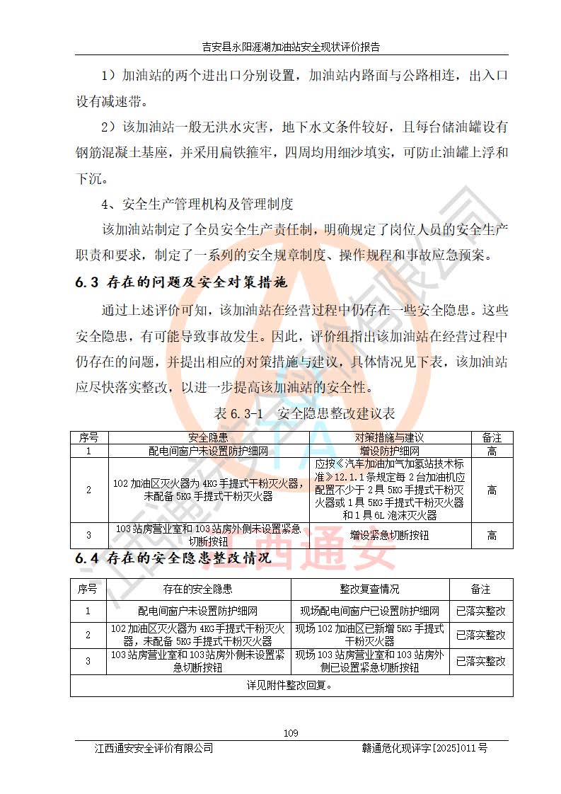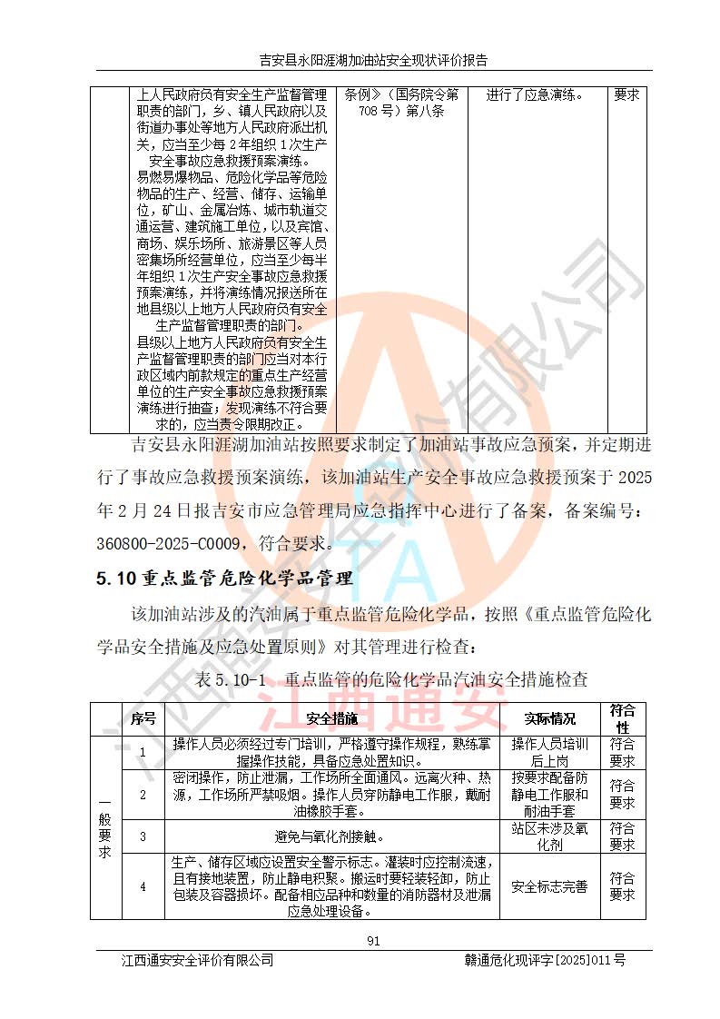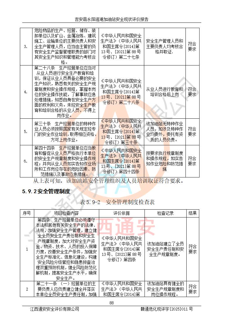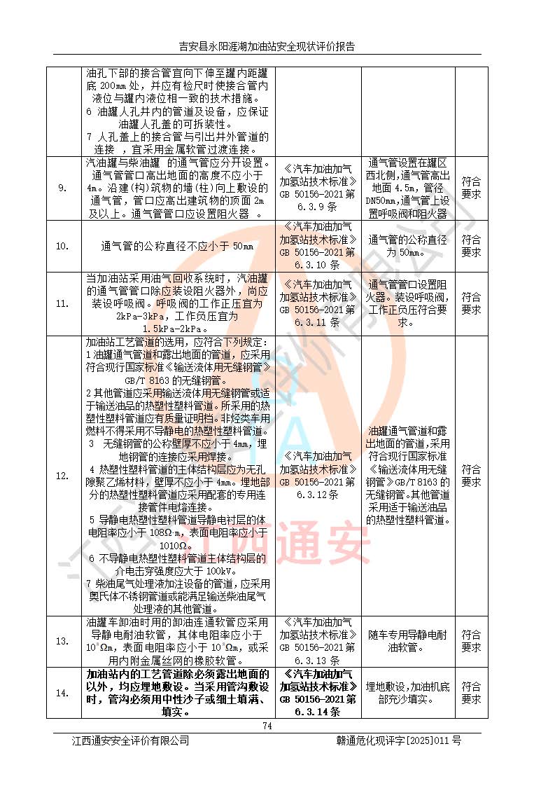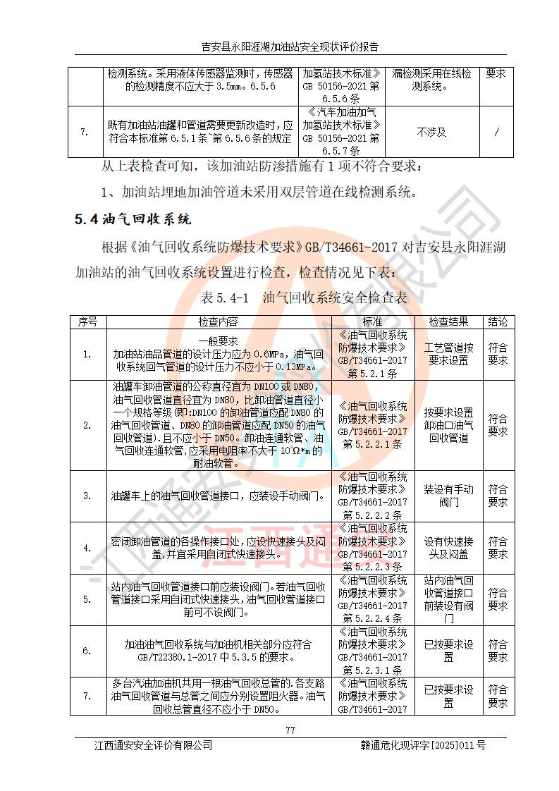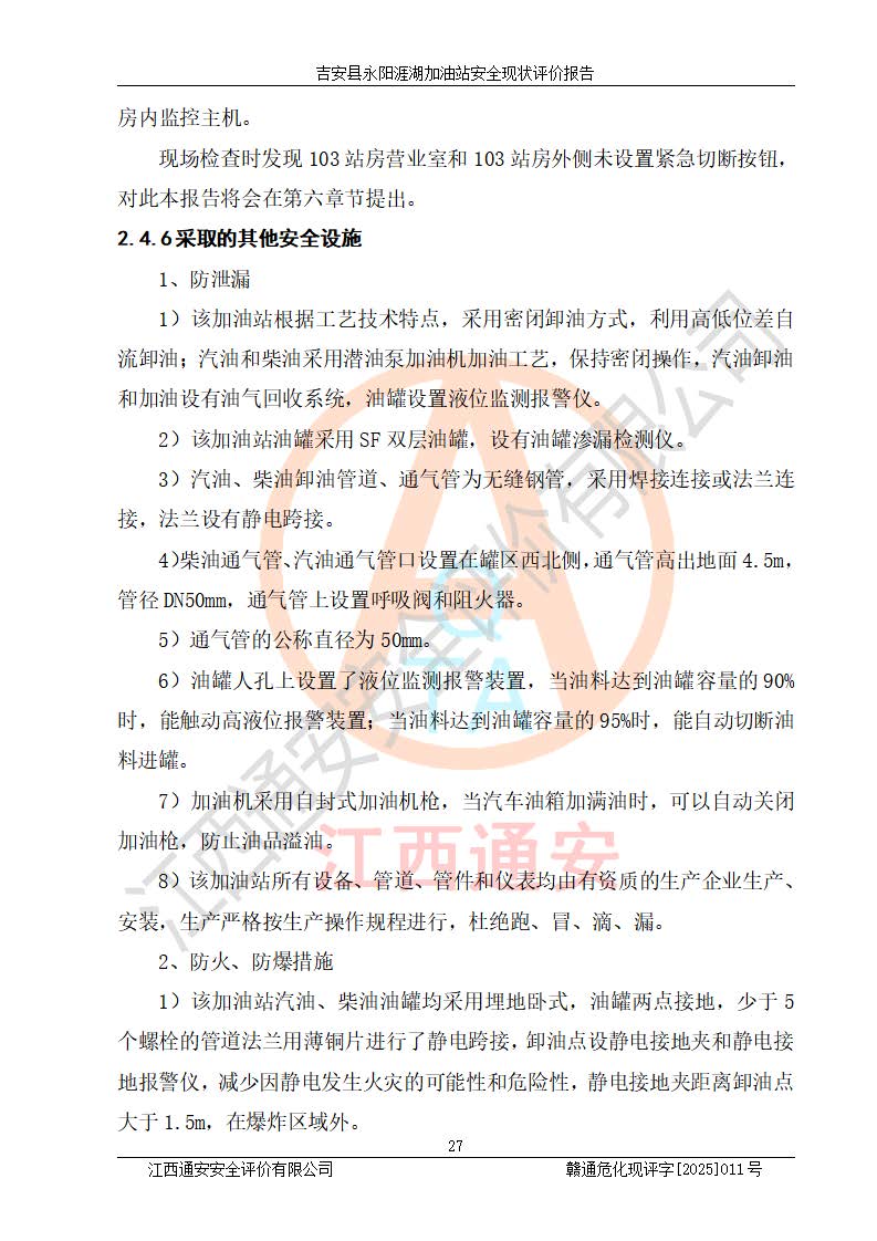 其它 | 在對該項目危險、有害因素辨識分析的基礎(chǔ)上,運用安全檢查表、預(yù)作業(yè)條件危險性分析法、危險度評價、重大事故后果分析結(jié)果等評價方法對該項目進行了分析評價,評價結(jié)果如下: 1、該項目位于江西省吉安市吉安縣永陽鎮(zhèn)涯湖村,符合當?shù)匾?guī)劃,與周邊環(huán)境的距離符合有關(guān)標準、規(guī)范的要求。 2、總圖布置分區(qū)明確,布局合理,各建構(gòu)筑物的防火間距滿足規(guī)范要求。 3、該項目無**明令淘汰的工藝,設(shè)備、設(shè)施與工藝條件、內(nèi)部介質(zhì)相適應(yīng),特種設(shè)備及設(shè)施較齊全,按規(guī)定設(shè)置防雷、防靜電接地,爆炸危險環(huán)境加油機按要求采用防爆型,符合相關(guān)標準規(guī)范要求。 5、企業(yè)設(shè)置了安全生產(chǎn)管理機構(gòu),配備了專職安全生產(chǎn)管理人員,建立了安全生產(chǎn)責任制和安全生產(chǎn)管理制度,編制了崗位操作規(guī)程,編制了生產(chǎn)安全事故應(yīng)急預(yù)案,人員經(jīng)過相應(yīng)的培訓(xùn),企業(yè)的安全生產(chǎn)管理正常。 6、作業(yè)條件危險性評價結(jié)果:在選定的評價單元中,作業(yè)危險程度均為“一般危險,需要注意”,作業(yè)條件相對安全。 7、危險度評價結(jié)果:汽油儲罐的危險程度為中度危險。油罐采用雙層罐埋地設(shè)置,按要求設(shè)置了通氣管,并裝設(shè)了阻火器;設(shè)置了液位監(jiān)測報警系統(tǒng)和緊急切斷系統(tǒng),埋地加油管道設(shè)置雙層管道,可以滿足安全生產(chǎn)條件要求。 評價結(jié)論: 吉安縣永陽涯湖加油站符合《汽車加油加氣加氫站技術(shù)標準》GB50156-2021等標準規(guī)范的要求,安全風險可控,滿足危險化學(xué)品經(jīng)營的安全條件。 | ||||