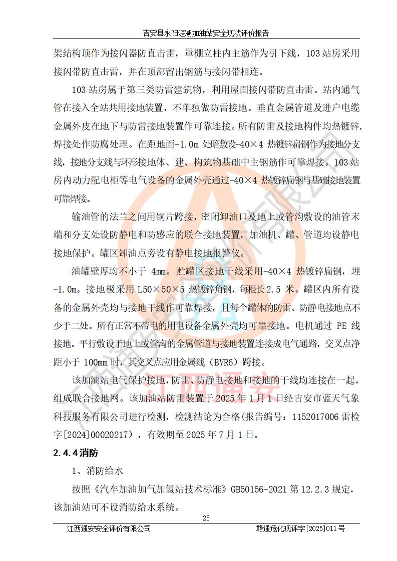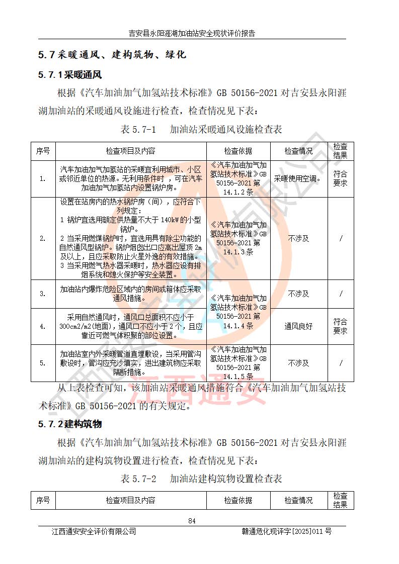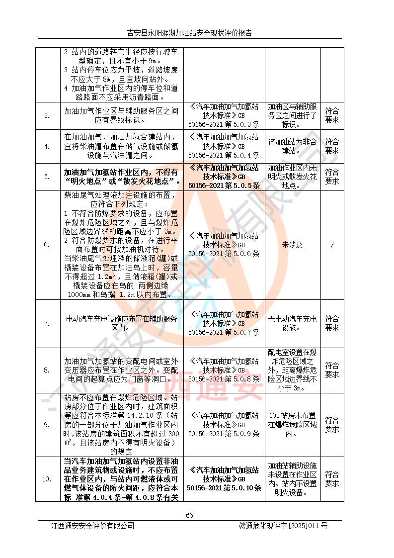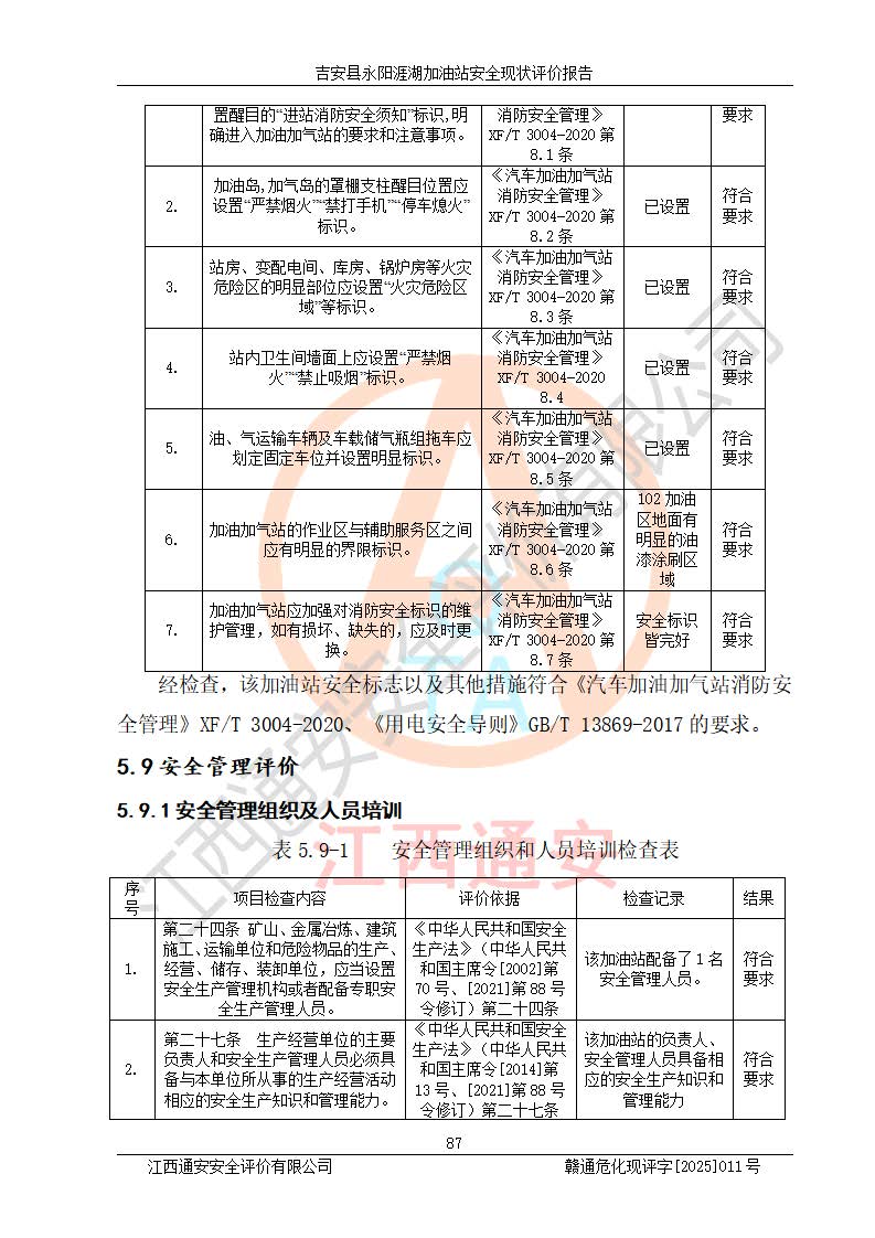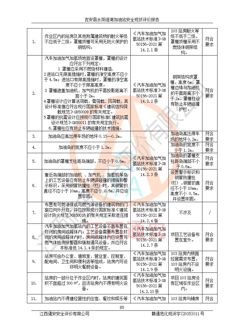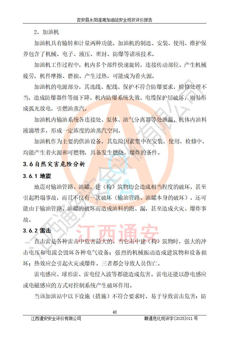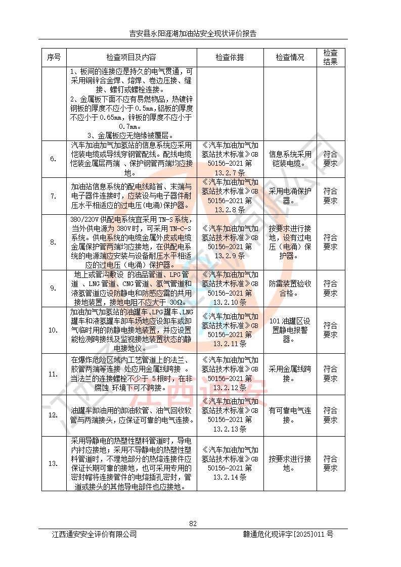 其它 | 在對該項目危險、有害因素辨識分析的基礎(chǔ)上,運用安全檢查表、預(yù)作業(yè)條件危險性分析法、危險度評價、重大事故后果分析結(jié)果等評價方法對該項目進行了分析評價,評價結(jié)果如下: 1、該項目位于江西省吉安市吉安縣永陽鎮(zhèn)涯湖村,符合當?shù)匾?guī)劃,與周邊環(huán)境的距離符合有關(guān)標準、規(guī)范的要求。 2、總圖布置分區(qū)明確,布局合理,各建構(gòu)筑物的防火間距滿足規(guī)范要求。 3、該項目無**明令淘汰的工藝,設(shè)備、設(shè)施與工藝條件、內(nèi)部介質(zhì)相適應(yīng),特種設(shè)備及設(shè)施較齊全,按規(guī)定設(shè)置防雷、防靜電接地,爆炸危險環(huán)境加油機按要求采用防爆型,符合相關(guān)標準規(guī)范要求。 5、企業(yè)設(shè)置了安全生產(chǎn)管理機構(gòu),配備了專職安全生產(chǎn)管理人員,建立了安全生產(chǎn)責任制和安全生產(chǎn)管理制度,編制了崗位操作規(guī)程,編制了生產(chǎn)安全事故應(yīng)急預(yù)案,人員經(jīng)過相應(yīng)的培訓(xùn),企業(yè)的安全生產(chǎn)管理正常。 6、作業(yè)條件危險性評價結(jié)果:在選定的評價單元中,作業(yè)危險程度均為“一般危險,需要注意”,作業(yè)條件相對安全。 7、危險度評價結(jié)果:汽油儲罐的危險程度為中度危險。油罐采用雙層罐埋地設(shè)置,按要求設(shè)置了通氣管,并裝設(shè)了阻火器;設(shè)置了液位監(jiān)測報警系統(tǒng)和緊急切斷系統(tǒng),埋地加油管道設(shè)置雙層管道,可以滿足安全生產(chǎn)條件要求。 評價結(jié)論: 吉安縣永陽涯湖加油站符合《汽車加油加氣加氫站技術(shù)標準》GB50156-2021等標準規(guī)范的要求,安全風險可控,滿足危險化學(xué)品經(jīng)營的安全條件。 | ||||
