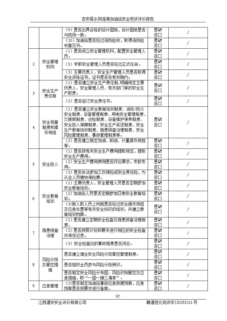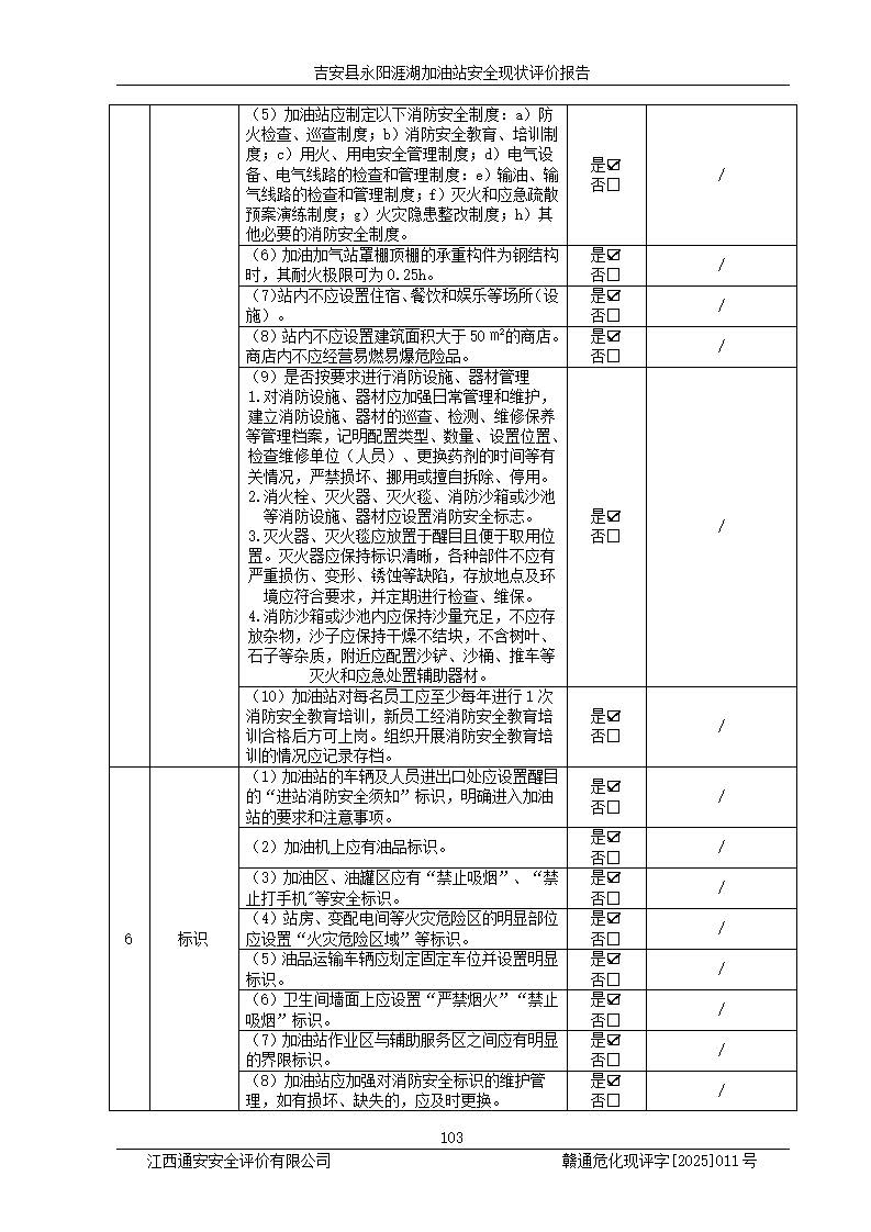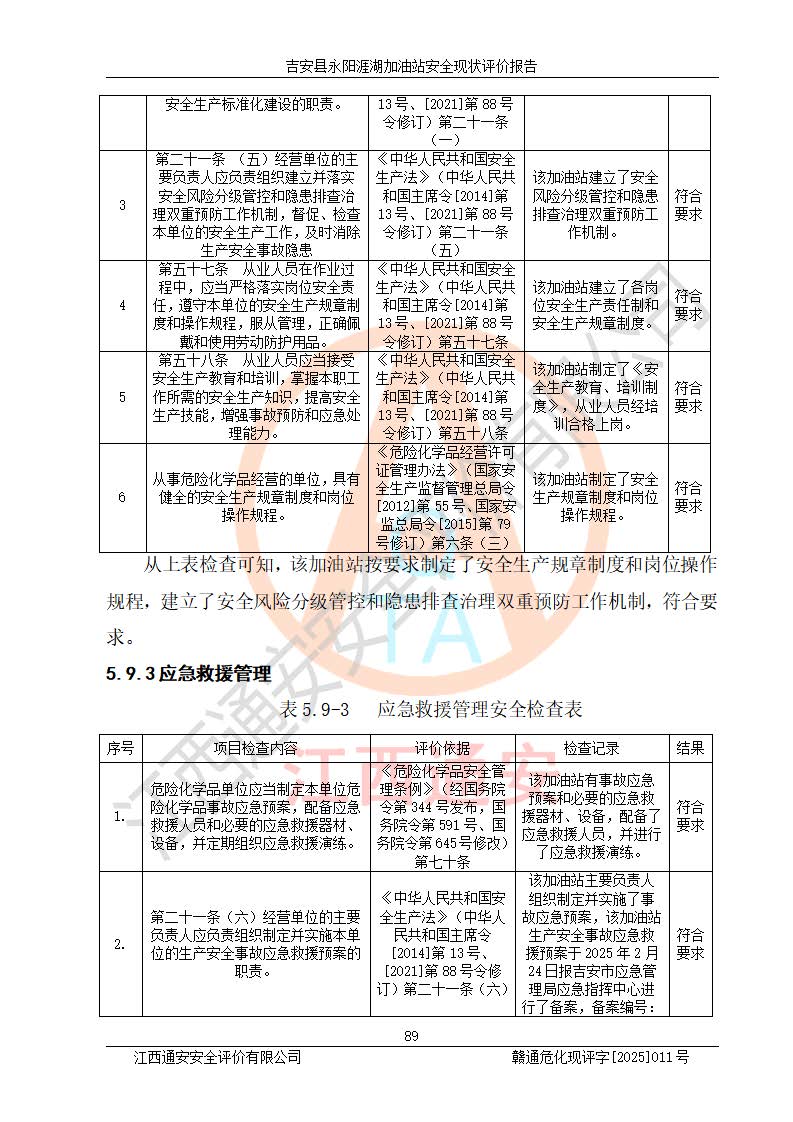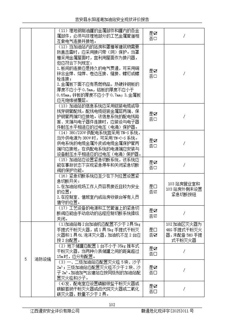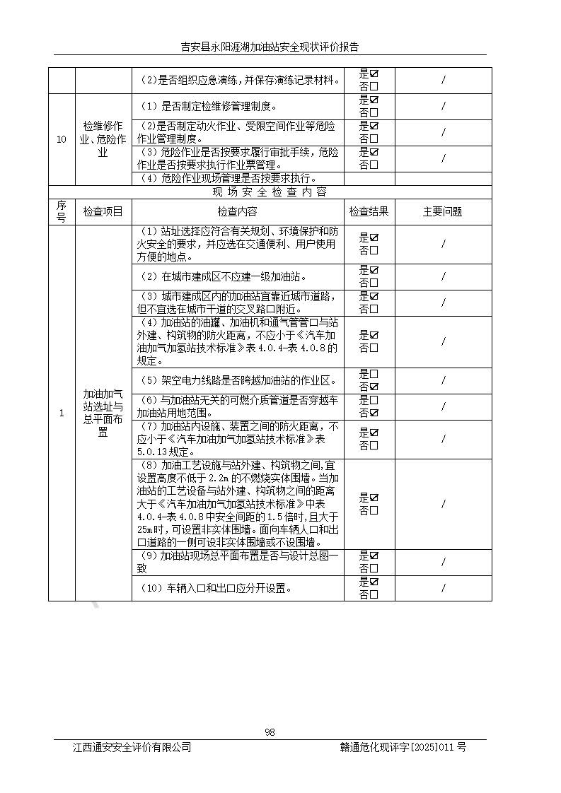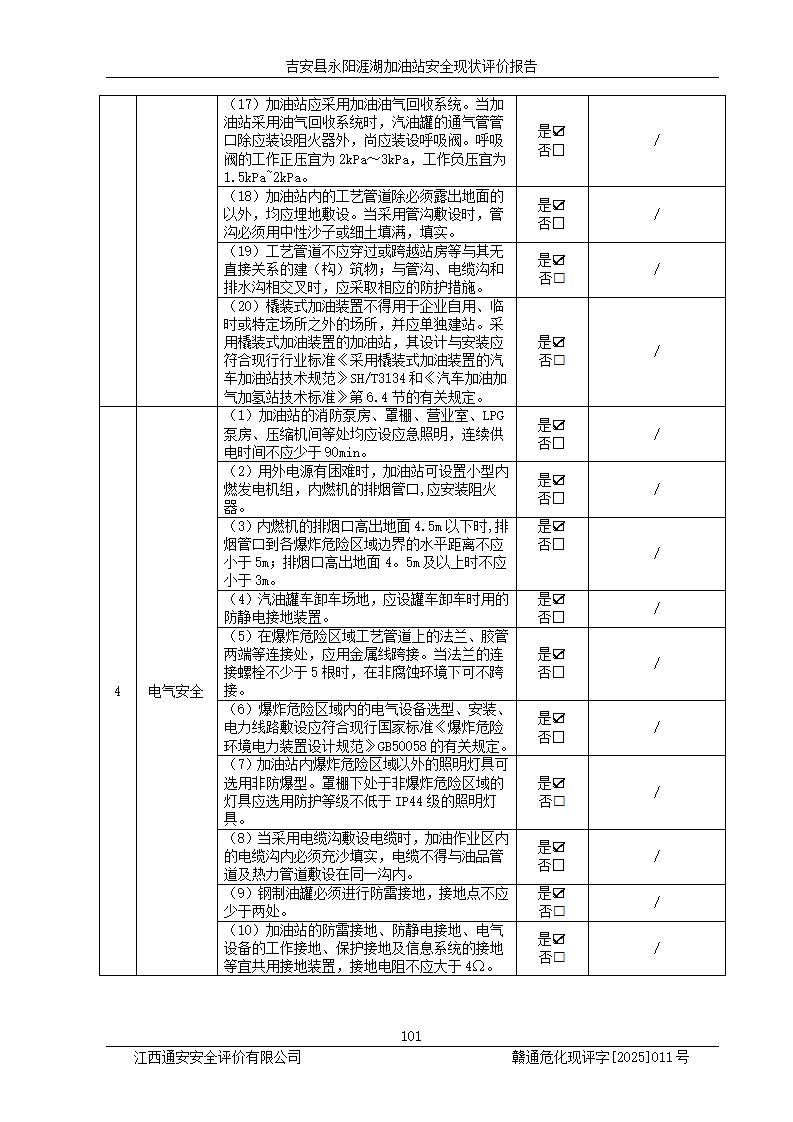 其它 | 在對該項目危險、有害因素辨識分析的基礎(chǔ)上,運用安全檢查表、預(yù)作業(yè)條件危險性分析法、危險度評價、重大事故后果分析結(jié)果等評價方法對該項目進行了分析評價,評價結(jié)果如下: 1、該項目位于江西省吉安市吉安縣永陽鎮(zhèn)涯湖村,符合當?shù)匾?guī)劃,與周邊環(huán)境的距離符合有關(guān)標準、規(guī)范的要求。 2、總圖布置分區(qū)明確,布局合理,各建構(gòu)筑物的防火間距滿足規(guī)范要求。 3、該項目無**明令淘汰的工藝,設(shè)備、設(shè)施與工藝條件、內(nèi)部介質(zhì)相適應(yīng),特種設(shè)備及設(shè)施較齊全,按規(guī)定設(shè)置防雷、防靜電接地,爆炸危險環(huán)境加油機按要求采用防爆型,符合相關(guān)標準規(guī)范要求。 5、企業(yè)設(shè)置了安全生產(chǎn)管理機構(gòu),配備了專職安全生產(chǎn)管理人員,建立了安全生產(chǎn)責任制和安全生產(chǎn)管理制度,編制了崗位操作規(guī)程,編制了生產(chǎn)安全事故應(yīng)急預(yù)案,人員經(jīng)過相應(yīng)的培訓(xùn),企業(yè)的安全生產(chǎn)管理正常。 6、作業(yè)條件危險性評價結(jié)果:在選定的評價單元中,作業(yè)危險程度均為“一般危險,需要注意”,作業(yè)條件相對安全。 7、危險度評價結(jié)果:汽油儲罐的危險程度為中度危險。油罐采用雙層罐埋地設(shè)置,按要求設(shè)置了通氣管,并裝設(shè)了阻火器;設(shè)置了液位監(jiān)測報警系統(tǒng)和緊急切斷系統(tǒng),埋地加油管道設(shè)置雙層管道,可以滿足安全生產(chǎn)條件要求。 評價結(jié)論: 吉安縣永陽涯湖加油站符合《汽車加油加氣加氫站技術(shù)標準》GB50156-2021等標準規(guī)范的要求,安全風險可控,滿足危險化學(xué)品經(jīng)營的安全條件。 | ||||