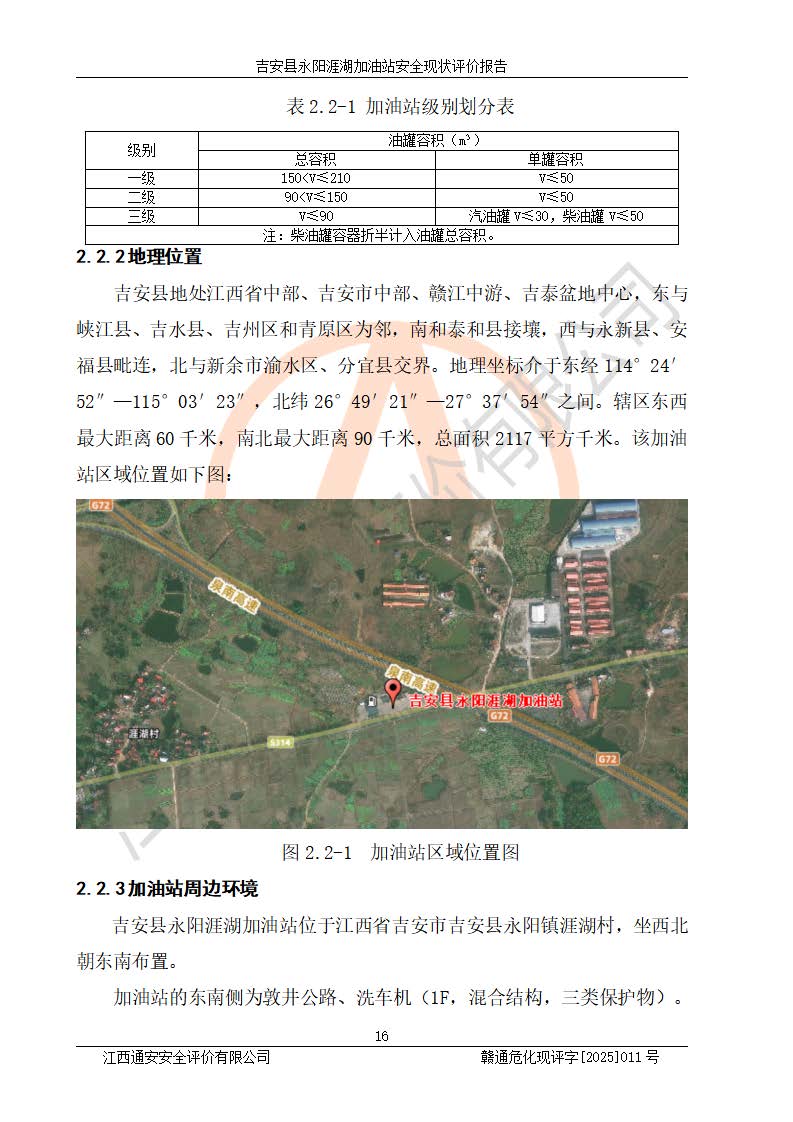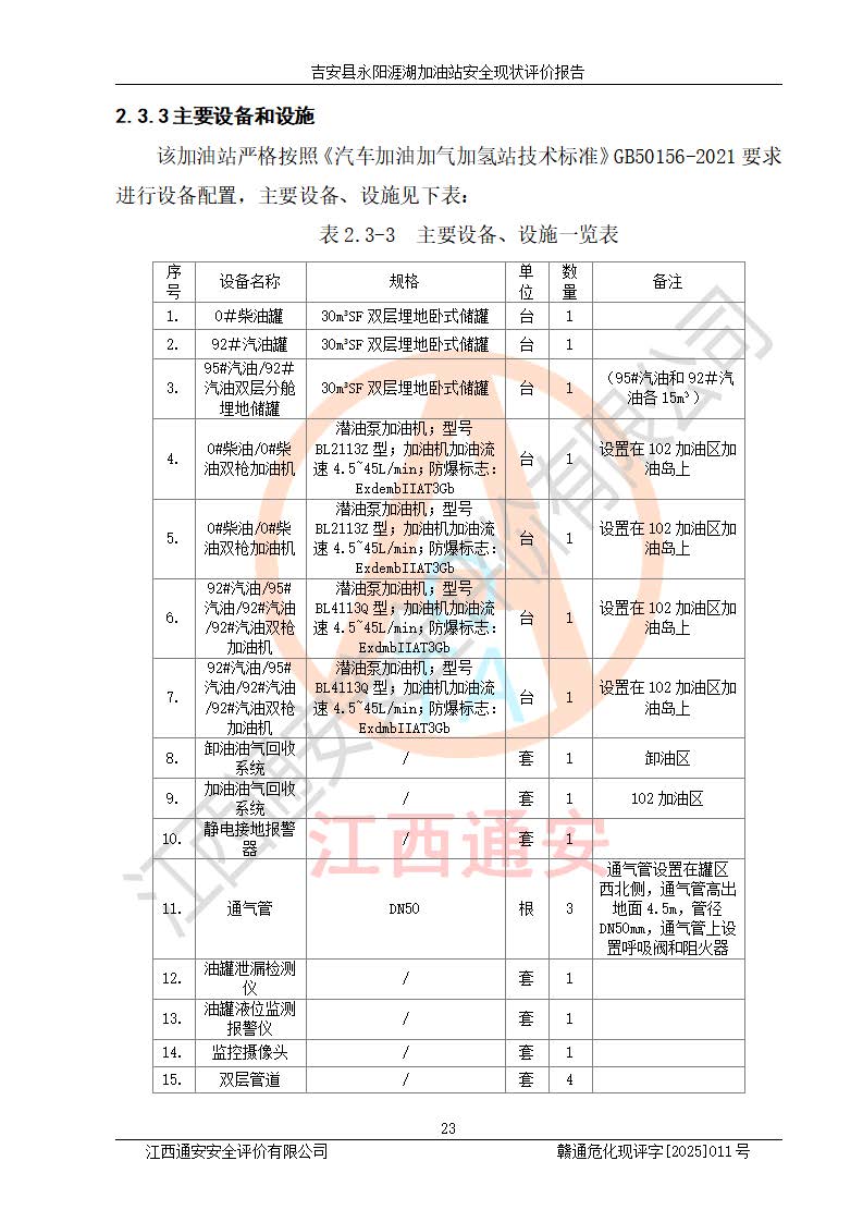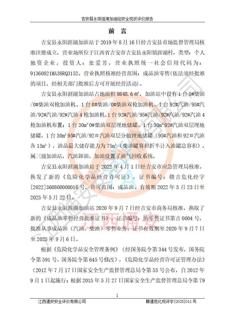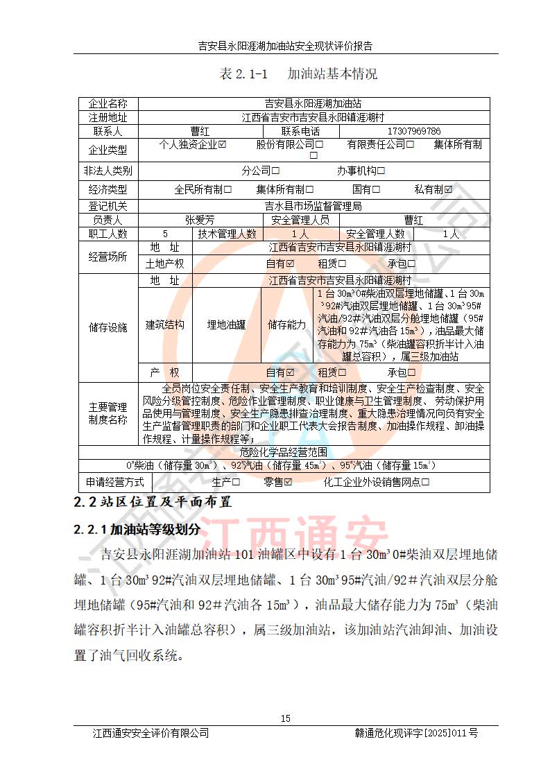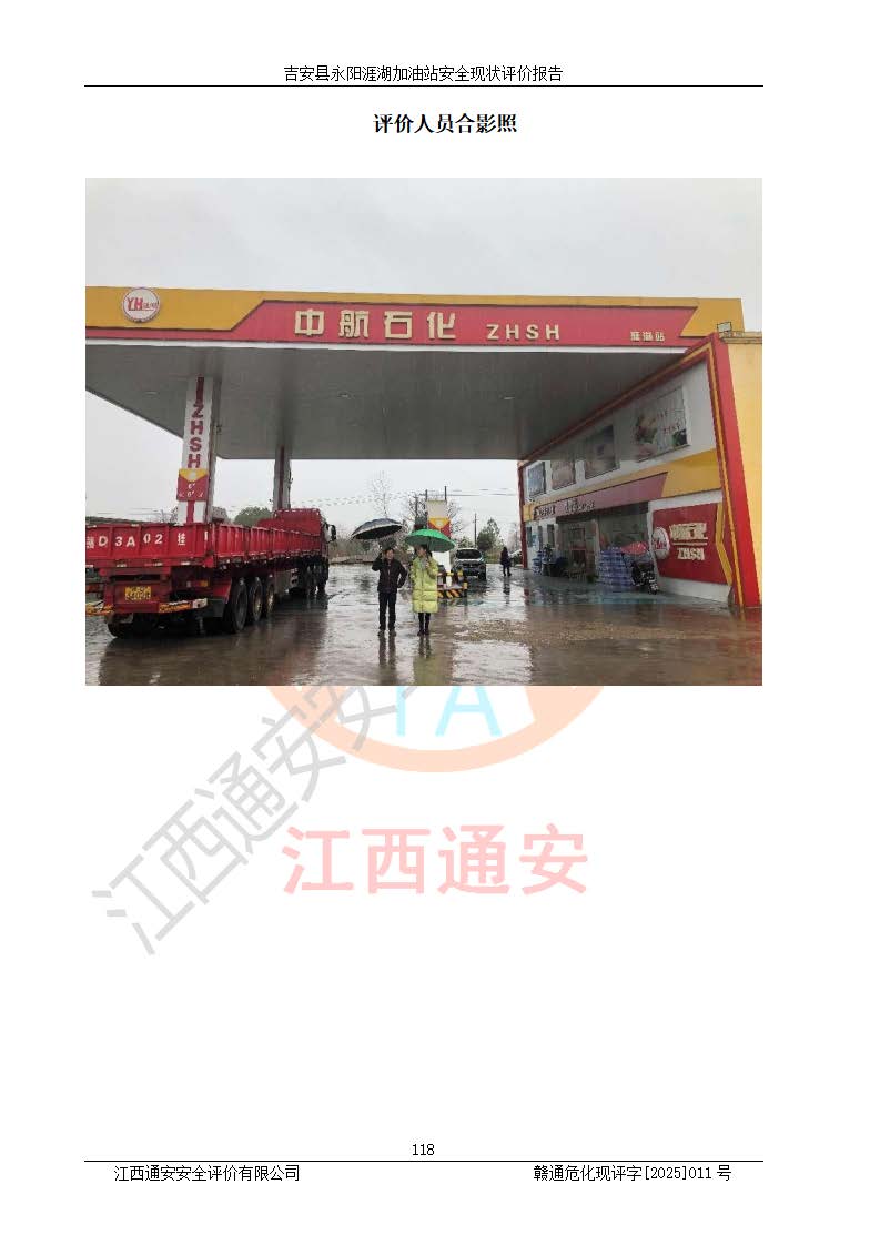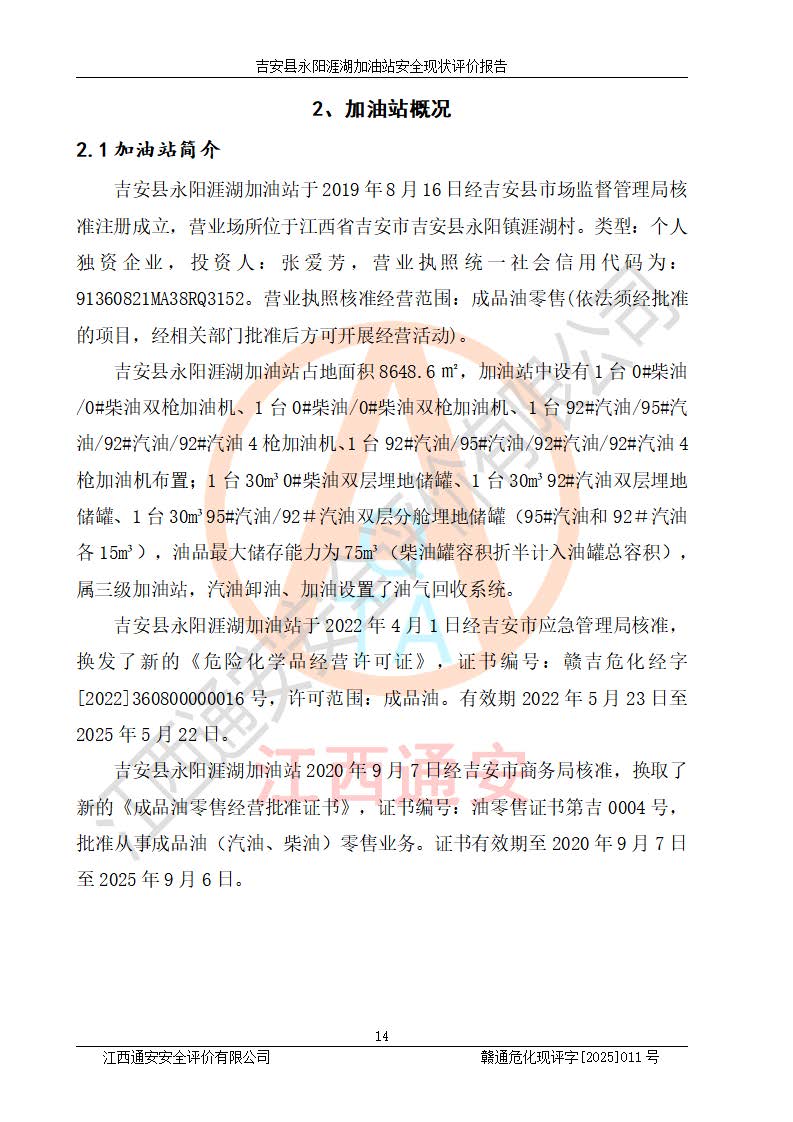 項目簡介 | 吉安縣永陽涯湖加油站于2019年8月16日經(jīng)吉安縣市場監(jiān)督管理局核準注冊成立,營業(yè)場所位于江西省吉安市吉安縣永陽鎮(zhèn)涯湖村。類型:個人獨資企業(yè),投資人:張愛芳,營業(yè)執(zhí)照統(tǒng)一社會信用代碼為:91360821MA38RQ3152。營業(yè)執(zhí)照核準經(jīng)營范圍:成品油零售(依法須經(jīng)批準的項目,經(jīng)相關(guān)部門批準后方可開展經(jīng)營活動)。 吉安縣永陽涯湖加油站占地面積8648.6㎡,加油站中設(shè)有1臺0#柴油/0#柴油雙槍加油機、1臺0#柴油/0#柴油雙槍加油機、1臺92#汽油/95#汽油/92#汽油/92#汽油4槍加油機、1臺92#汽油/95#汽油/92#汽油/92#汽油4槍加油機布置;1臺30m30#柴油雙層埋地儲罐、1臺30m392#汽油雙層埋地儲罐、1臺30m395#汽油/92#汽油雙層分艙埋地儲罐(95#汽油和92#汽油各15m3),油品*大儲存能力為75m3(柴油罐容積折半計入油罐總?cè)莘e),屬三級加油站,汽油卸油、加油設(shè)置了油氣回收系統(tǒng)。 吉安縣永陽涯湖加油站于2022年4月1日經(jīng)吉安市應(yīng)急管理局核準,換發(fā)了新的《危險化學(xué)品經(jīng)營許可證》,證書編號:贛吉?;?/span>經(jīng)字[2022]360800000016號,許可范圍:成品油。**期2022年5月23日至2025年5月22日。 吉安縣永陽涯湖加油站2020年9月7日經(jīng)吉安市商務(wù)局核準,換取了新的《成品油零售經(jīng)營批準證書》,證書編號:油零售證書第吉0004號,批準從事成品油(汽油、柴油)零售業(yè)務(wù)。證書**期至2020年9月7日至2025年9月6日。 | ||||