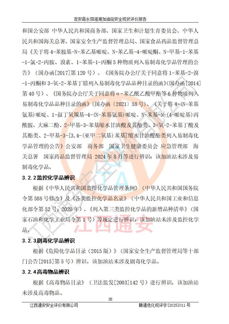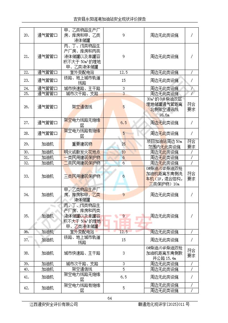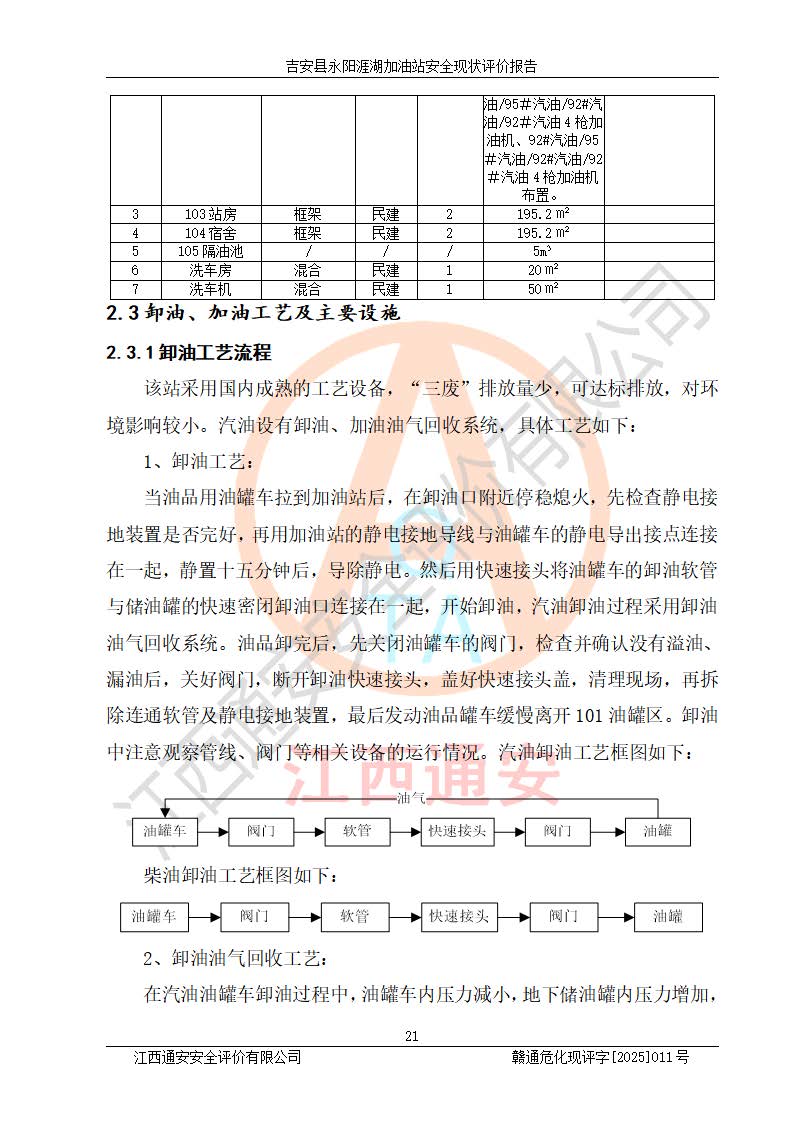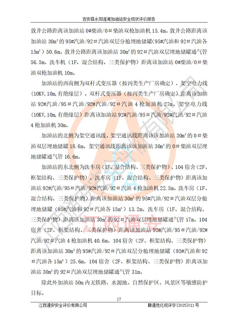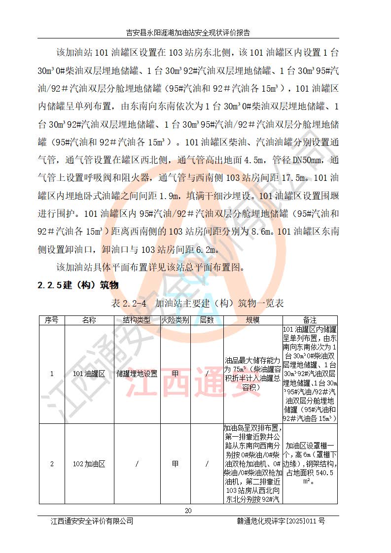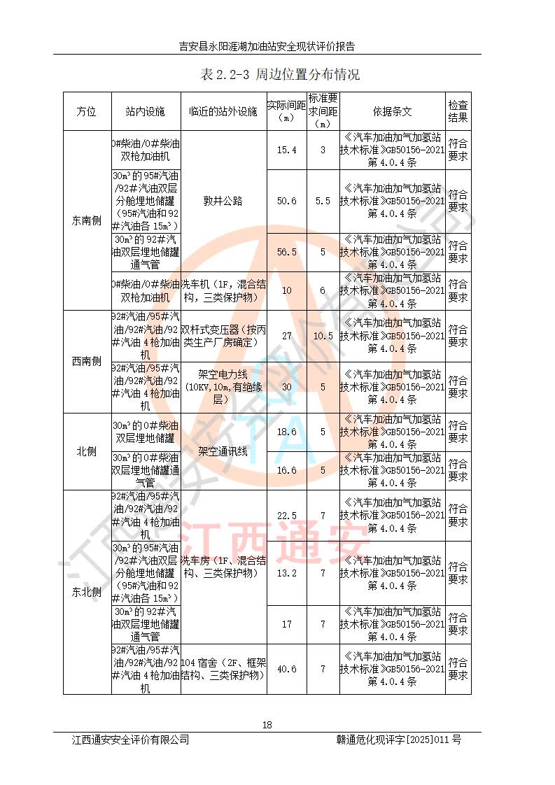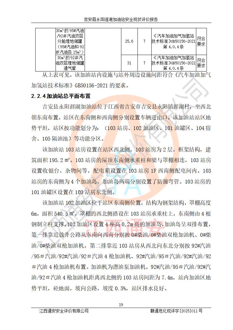 項目簡介 | 吉安縣永陽涯湖加油站于2019年8月16日經(jīng)吉安縣市場監(jiān)督管理局核準注冊成立,營業(yè)場所位于江西省吉安市吉安縣永陽鎮(zhèn)涯湖村。類型:個人獨資企業(yè),投資人:張愛芳,營業(yè)執(zhí)照統(tǒng)一社會信用代碼為:91360821MA38RQ3152。營業(yè)執(zhí)照核準經(jīng)營范圍:成品油零售(依法須經(jīng)批準的項目,經(jīng)相關(guān)部門批準后方可開展經(jīng)營活動)。 吉安縣永陽涯湖加油站占地面積8648.6㎡,加油站中設(shè)有1臺0#柴油/0#柴油雙槍加油機、1臺0#柴油/0#柴油雙槍加油機、1臺92#汽油/95#汽油/92#汽油/92#汽油4槍加油機、1臺92#汽油/95#汽油/92#汽油/92#汽油4槍加油機布置;1臺30m30#柴油雙層埋地儲罐、1臺30m392#汽油雙層埋地儲罐、1臺30m395#汽油/92#汽油雙層分艙埋地儲罐(95#汽油和92#汽油各15m3),油品*大儲存能力為75m3(柴油罐容積折半計入油罐總?cè)莘e),屬三級加油站,汽油卸油、加油設(shè)置了油氣回收系統(tǒng)。 吉安縣永陽涯湖加油站于2022年4月1日經(jīng)吉安市應(yīng)急管理局核準,換發(fā)了新的《危險化學(xué)品經(jīng)營許可證》,證書編號:贛吉?;?/span>經(jīng)字[2022]360800000016號,許可范圍:成品油。**期2022年5月23日至2025年5月22日。 吉安縣永陽涯湖加油站2020年9月7日經(jīng)吉安市商務(wù)局核準,換取了新的《成品油零售經(jīng)營批準證書》,證書編號:油零售證書第吉0004號,批準從事成品油(汽油、柴油)零售業(yè)務(wù)。證書**期至2020年9月7日至2025年9月6日。 | ||||